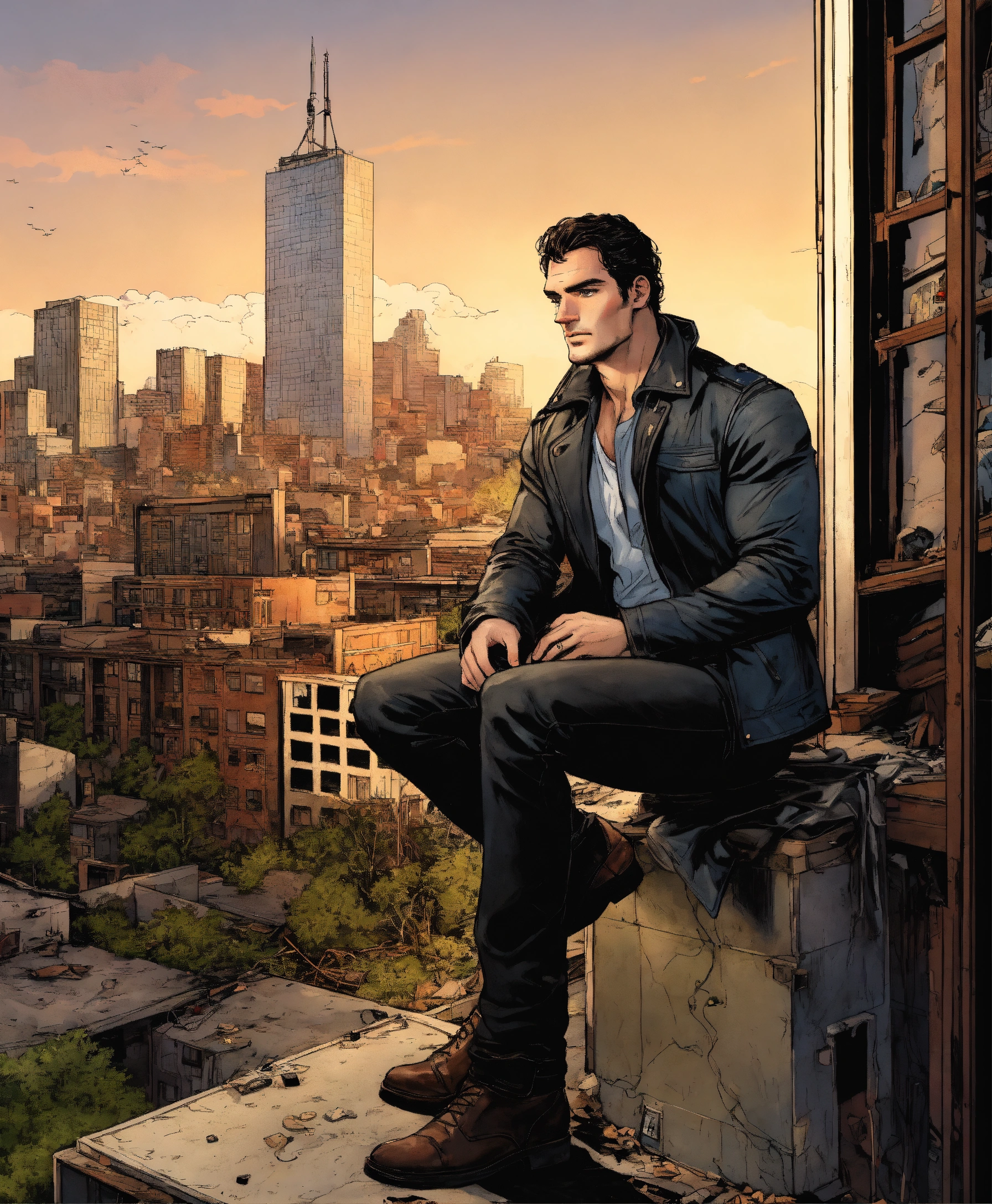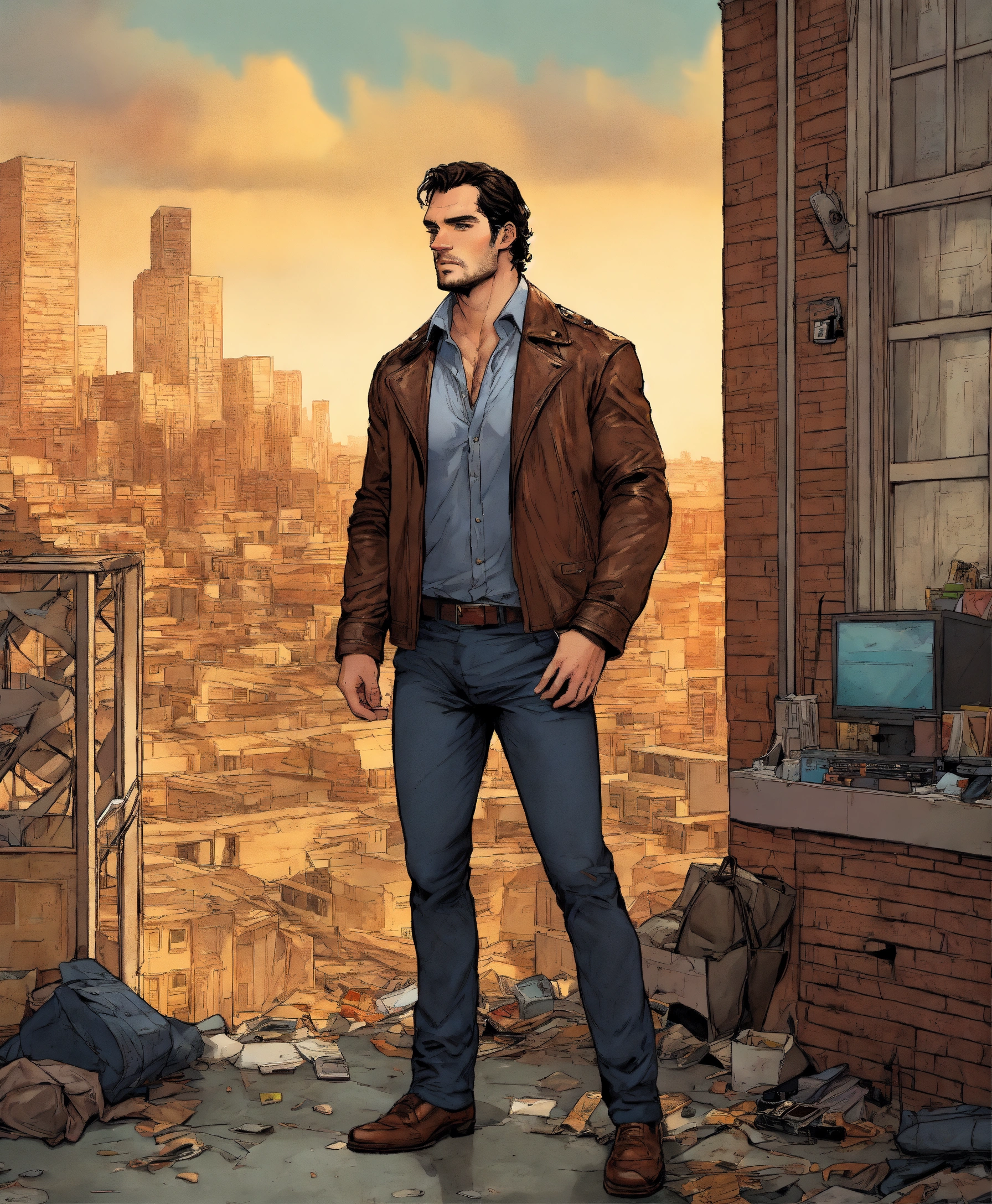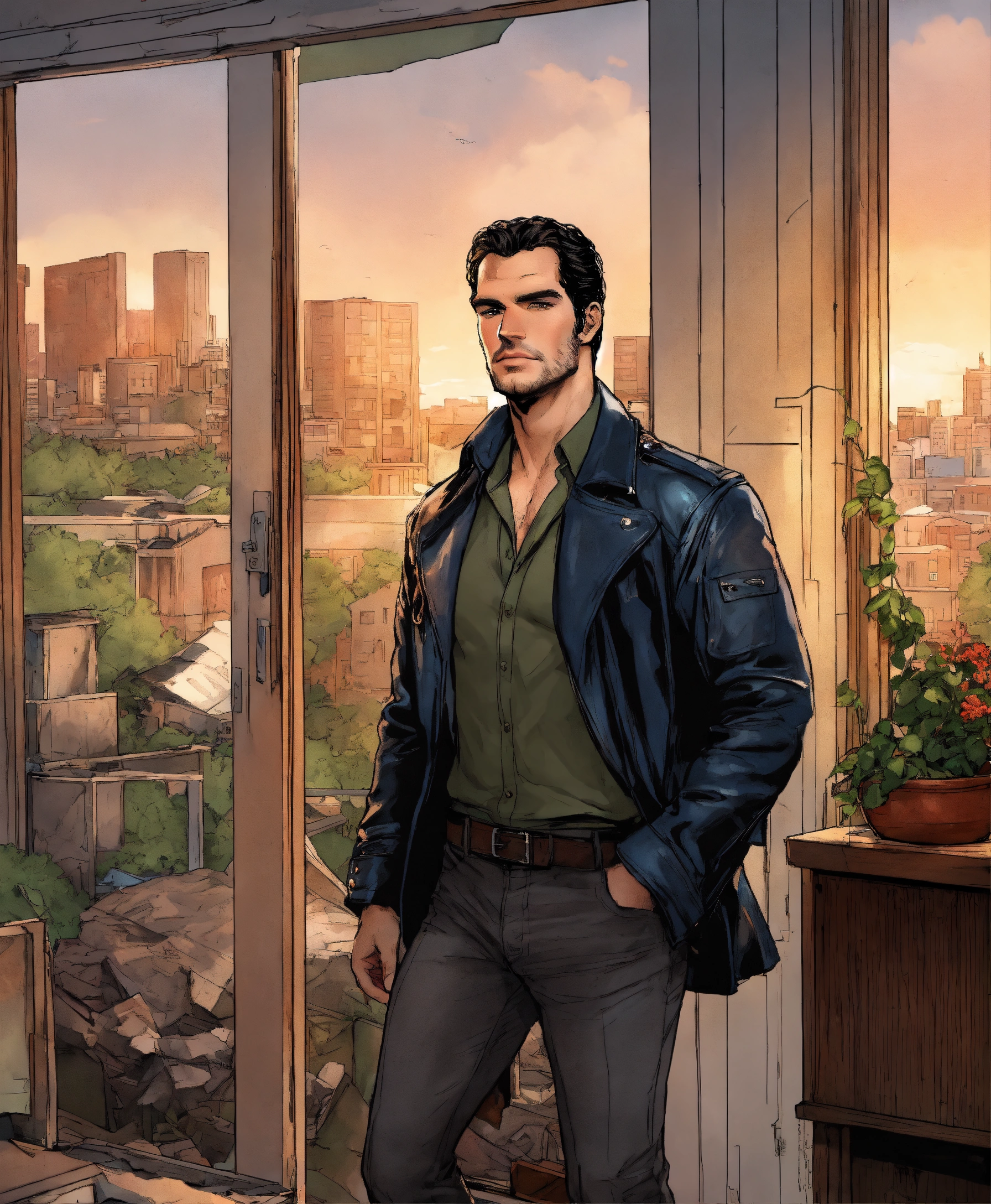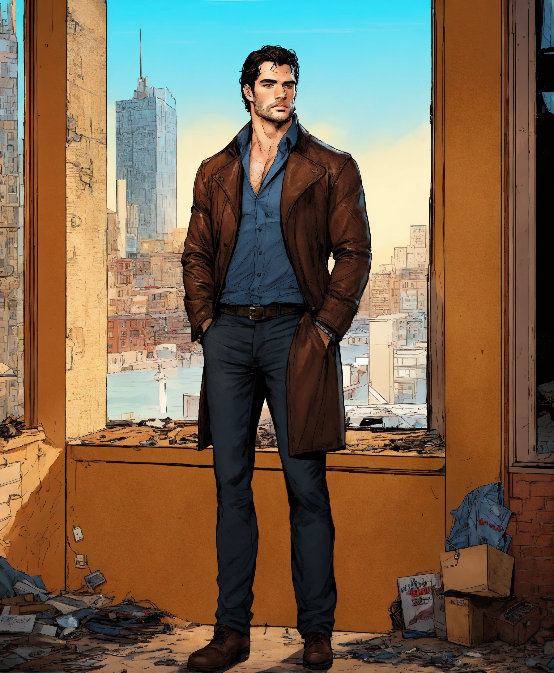 U.s comic type illustration, inside a derelict apartment, like todd mcfarlane, a 35-year-old male, henry cavill head, private detective, brown hair. handsome man, 1, 85 meters tall, elegant pants and shirt and leather jacket, intricate, elegant, highly detailed, portland u.s city background