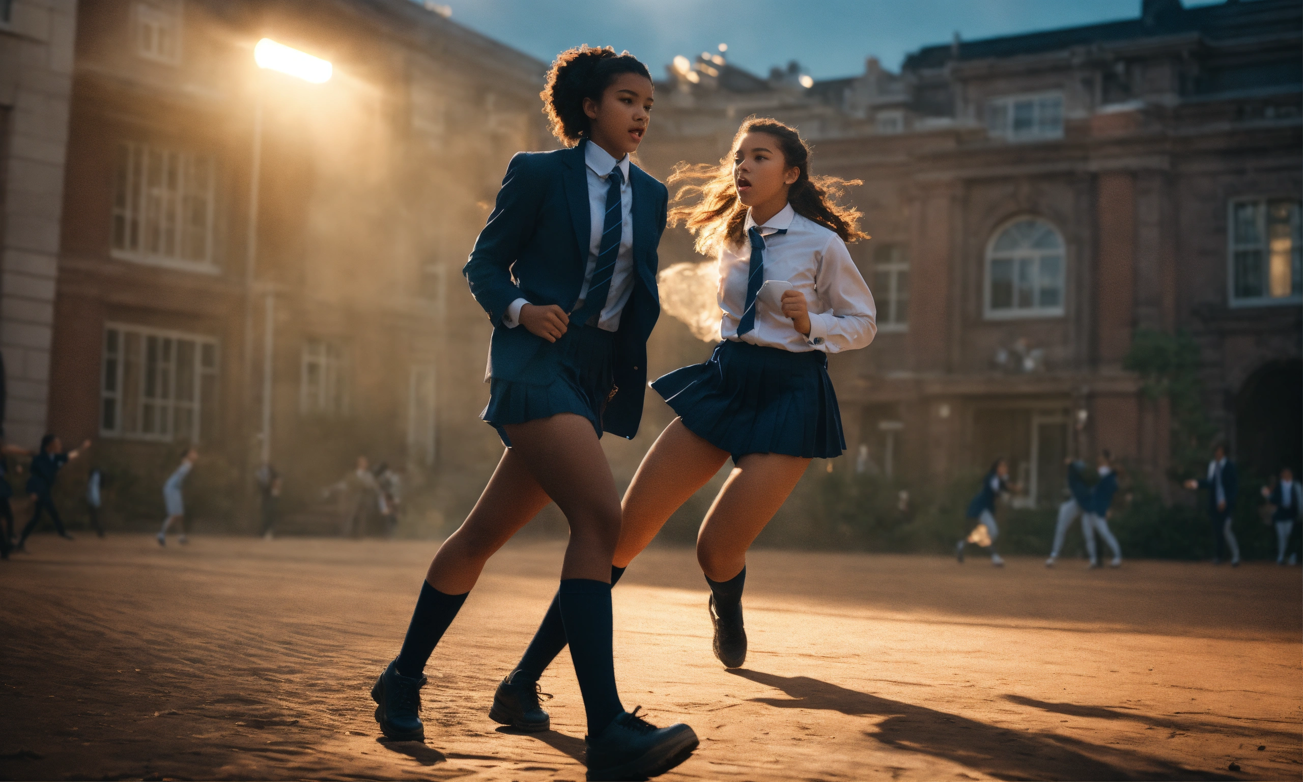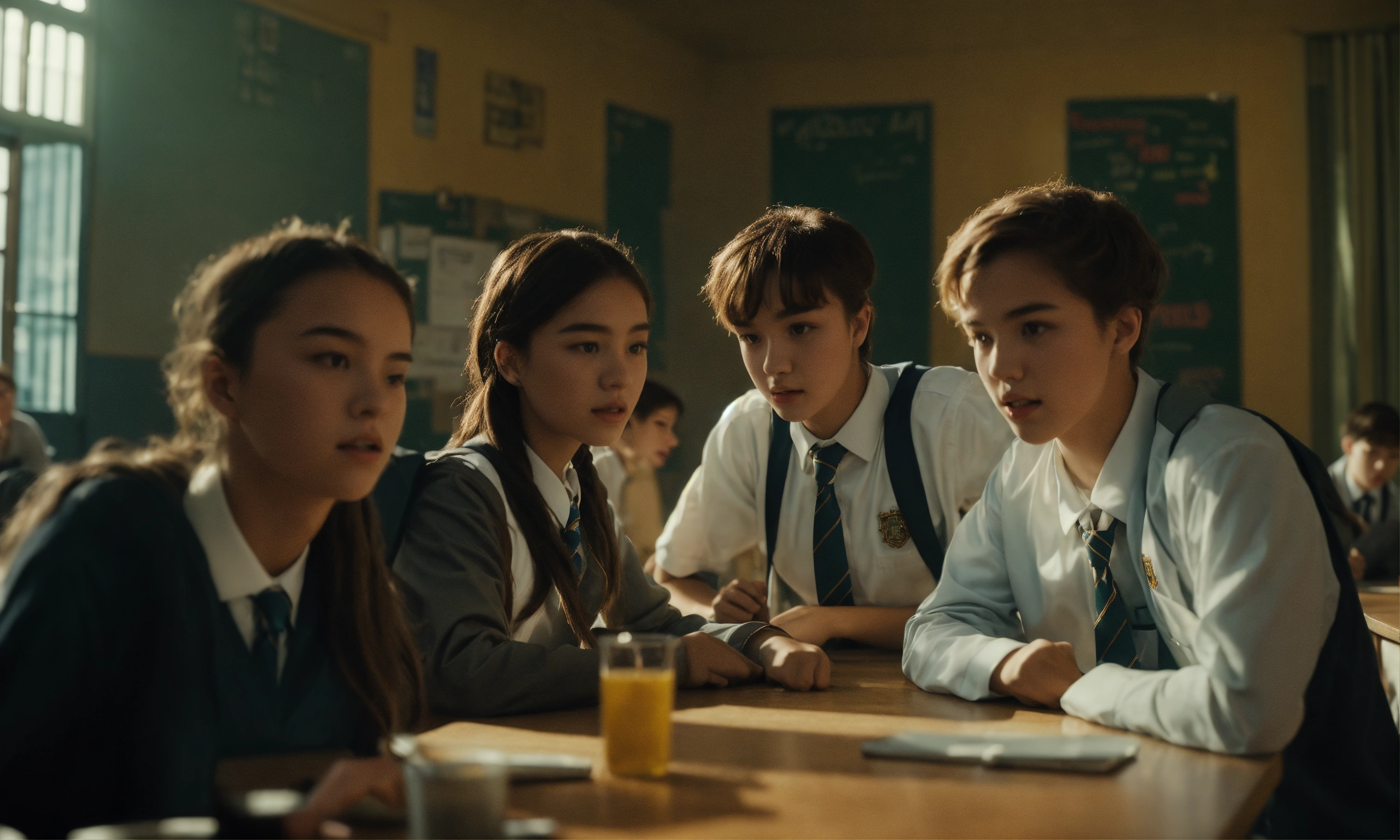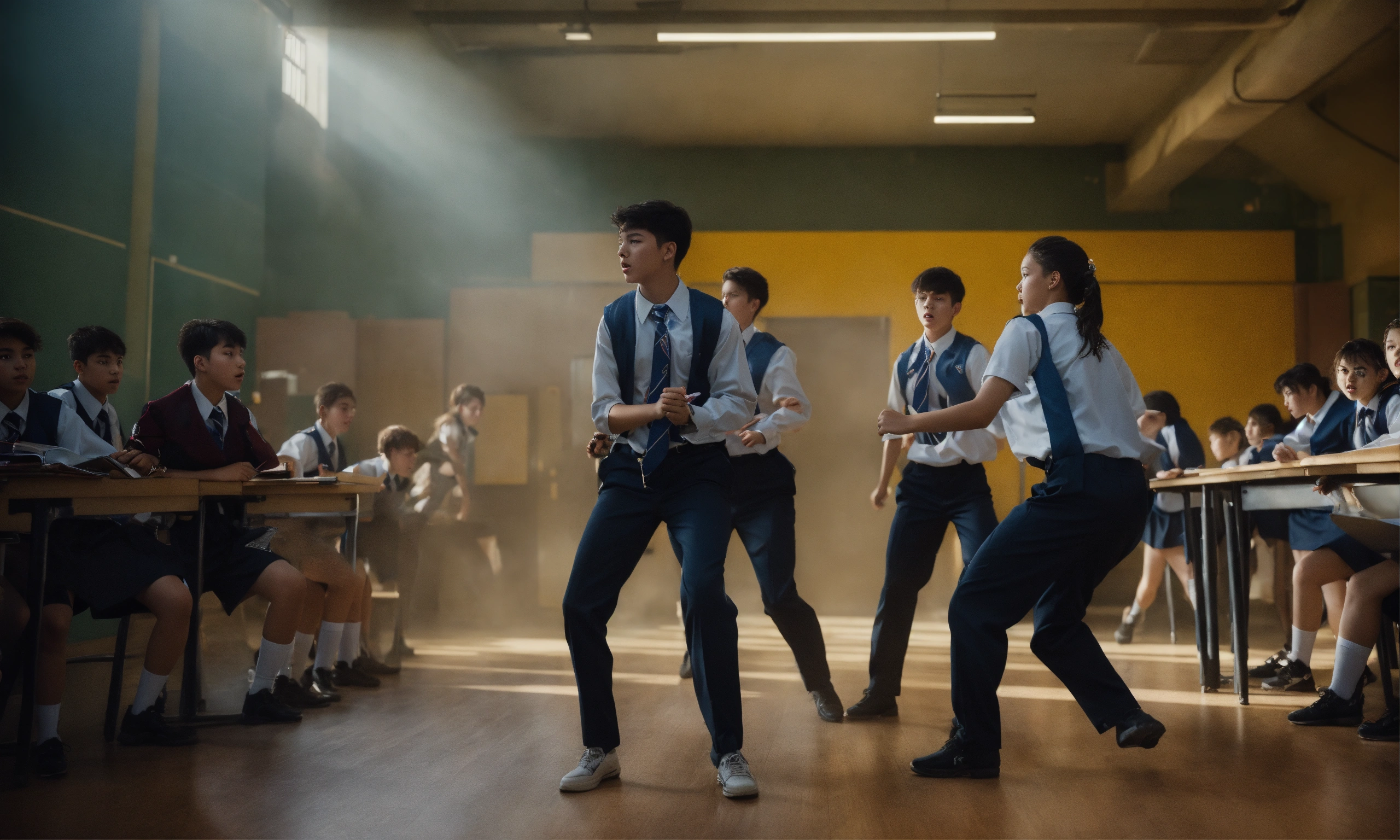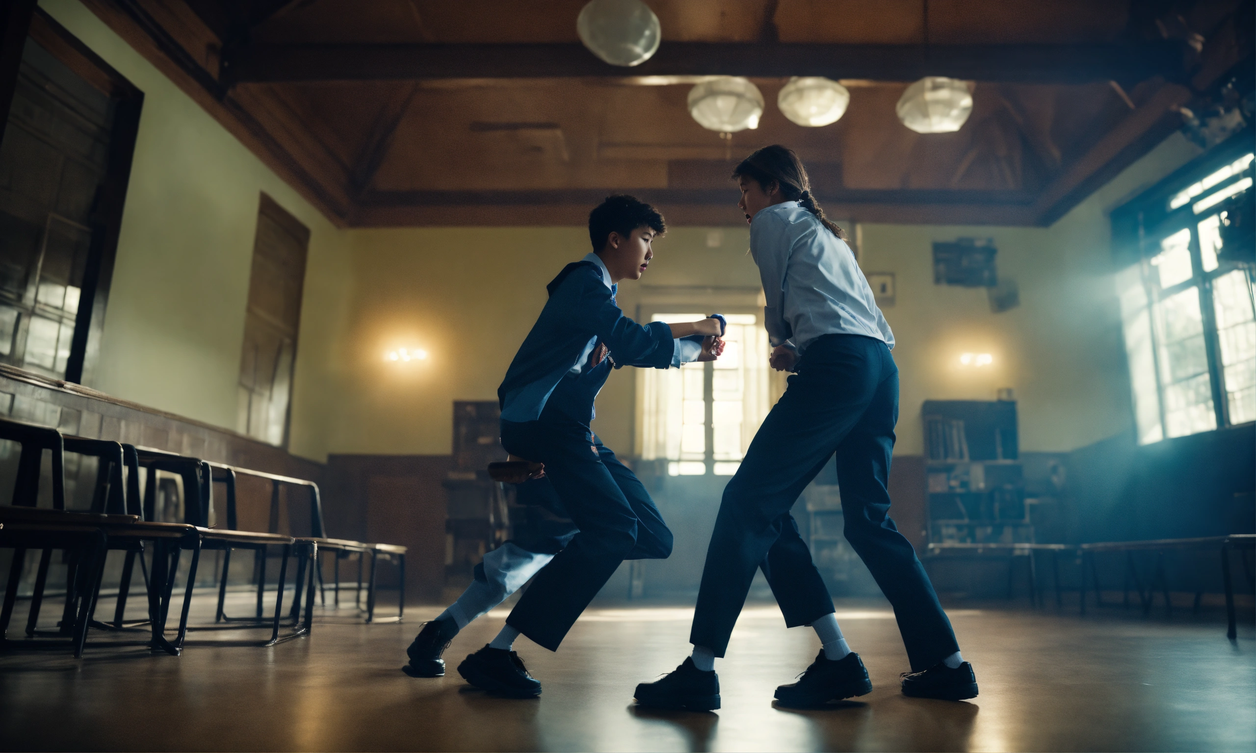 Two high school students in school uniforms engaged in a fight and their 10 friends are trying to hold them back, mood lighting, wide front shot, 8k, luxcorerender, earthly colour, cinematic photography, real humans, real images, matte finish, shot on arri anamorphic, extreme wide shot, smooth, sharp focus, ornate, highly dynamic, particulate, hyperreal, wide shot
