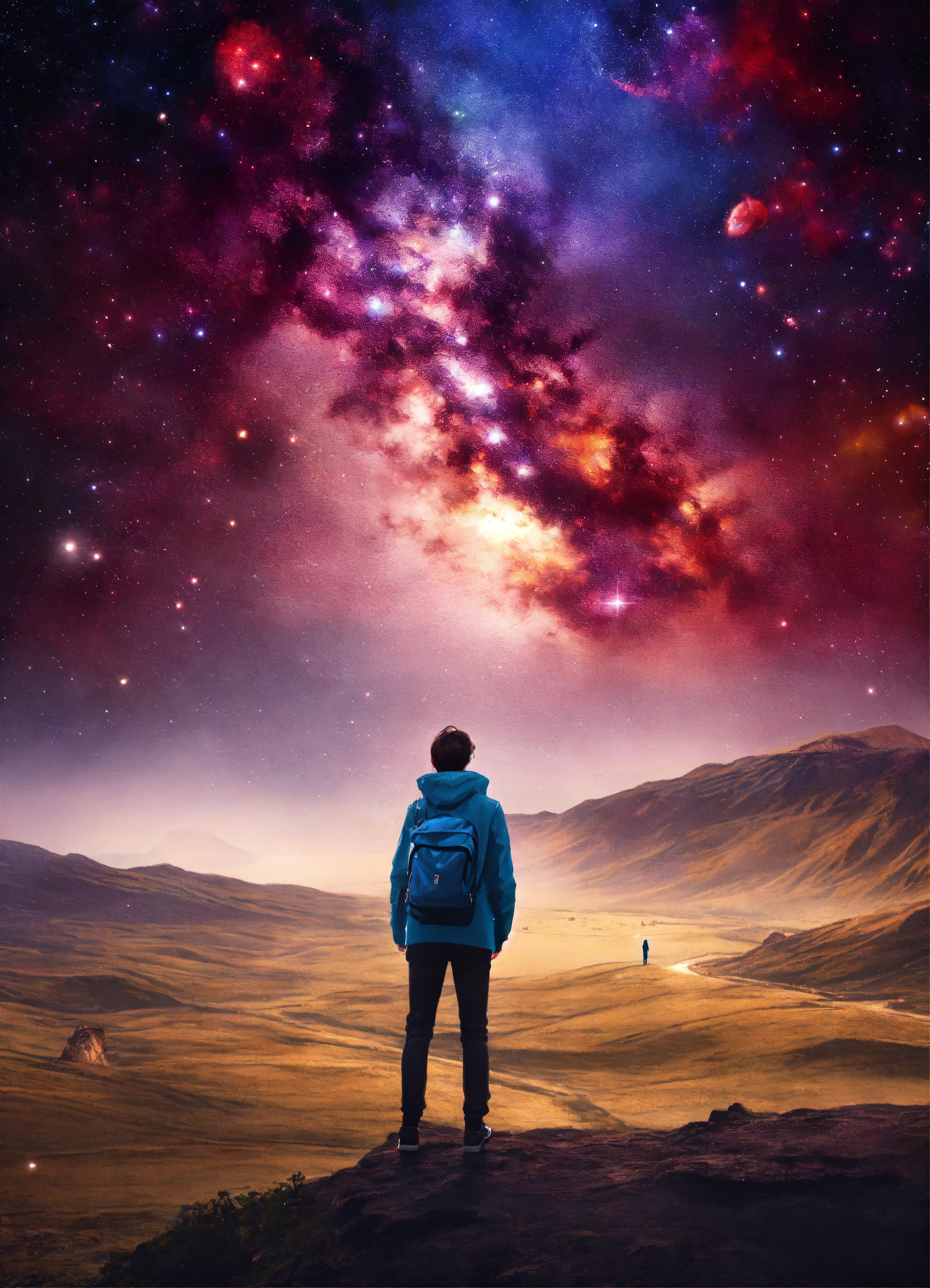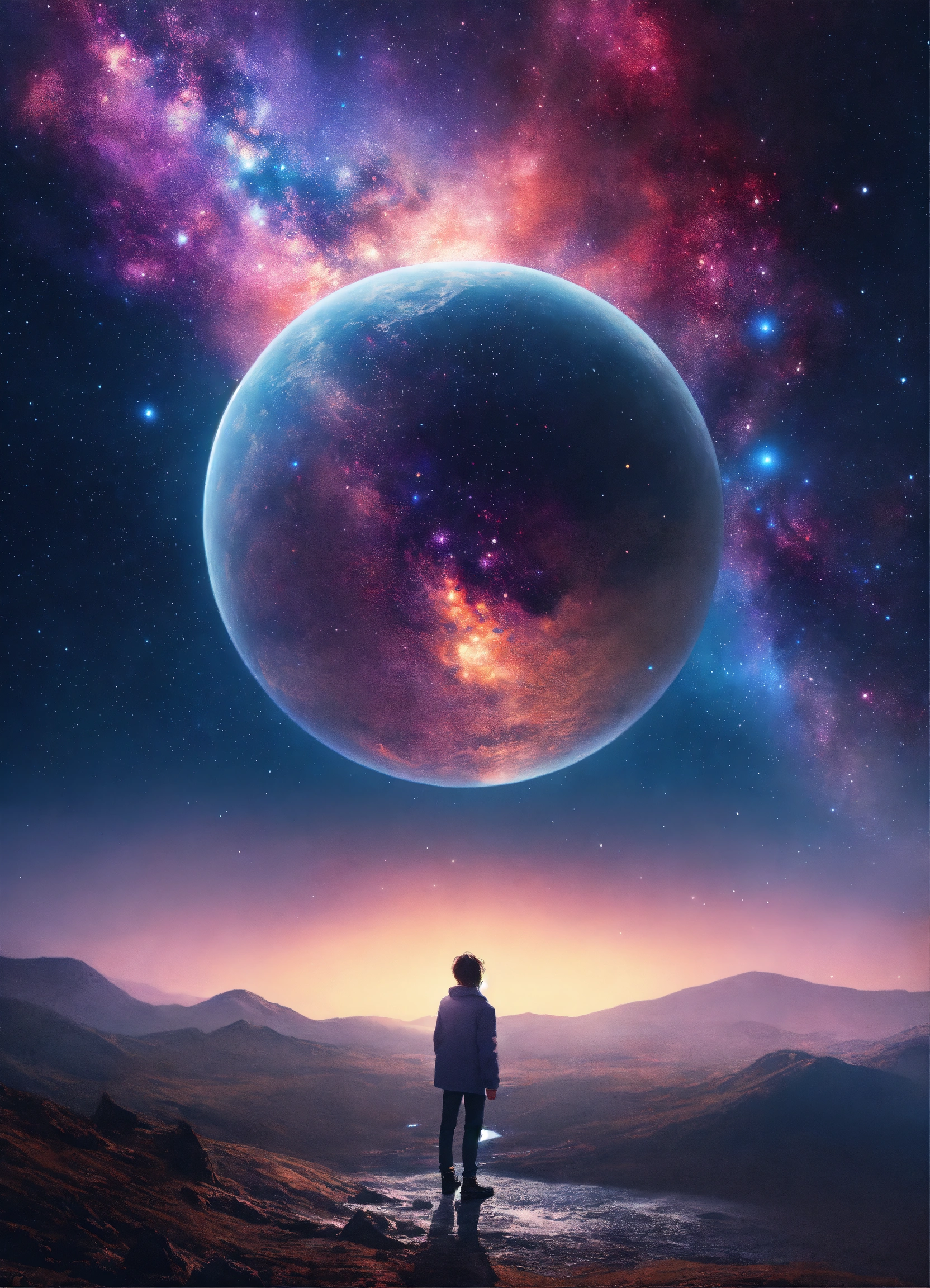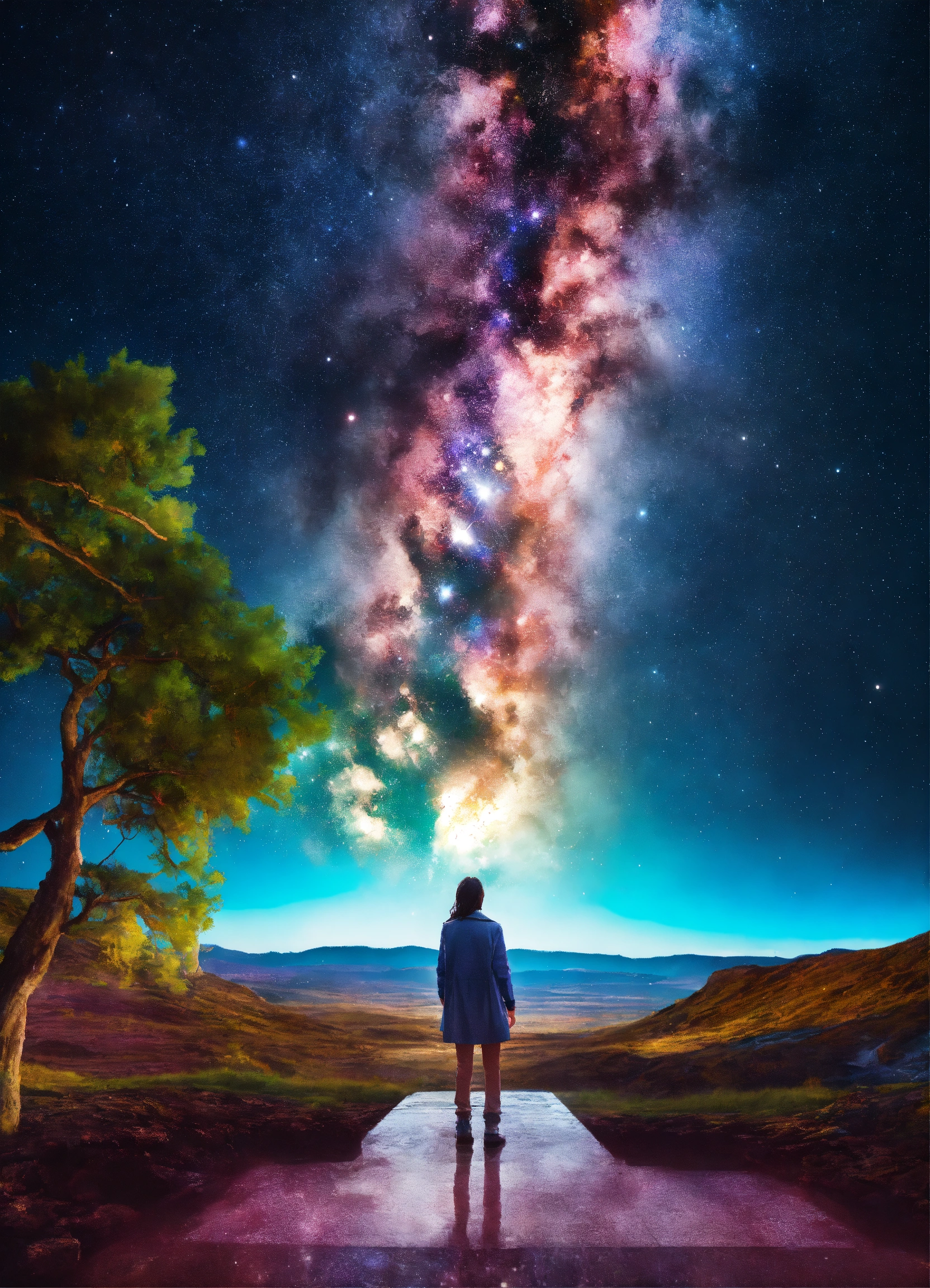 Galaxy dream world with a person standing looking into the distance