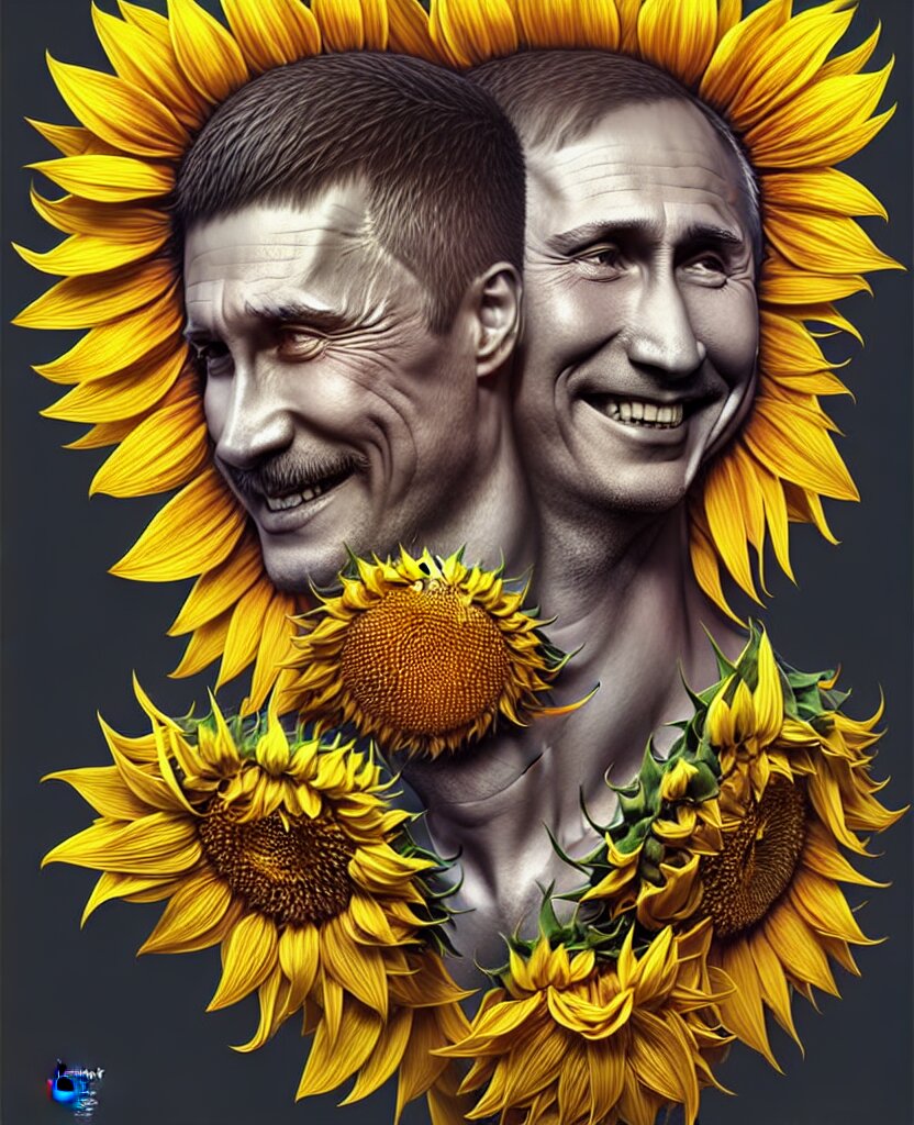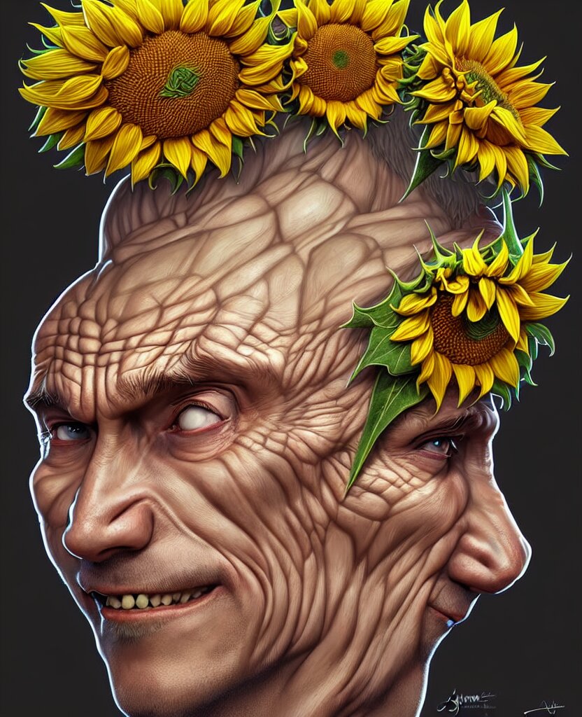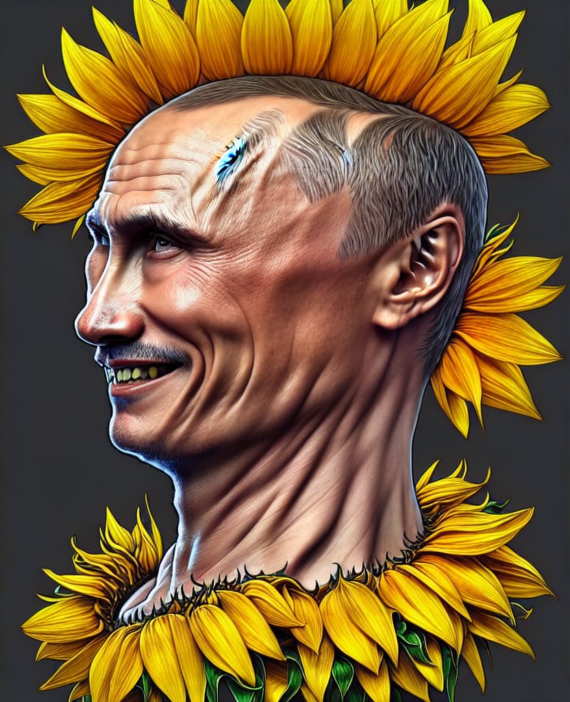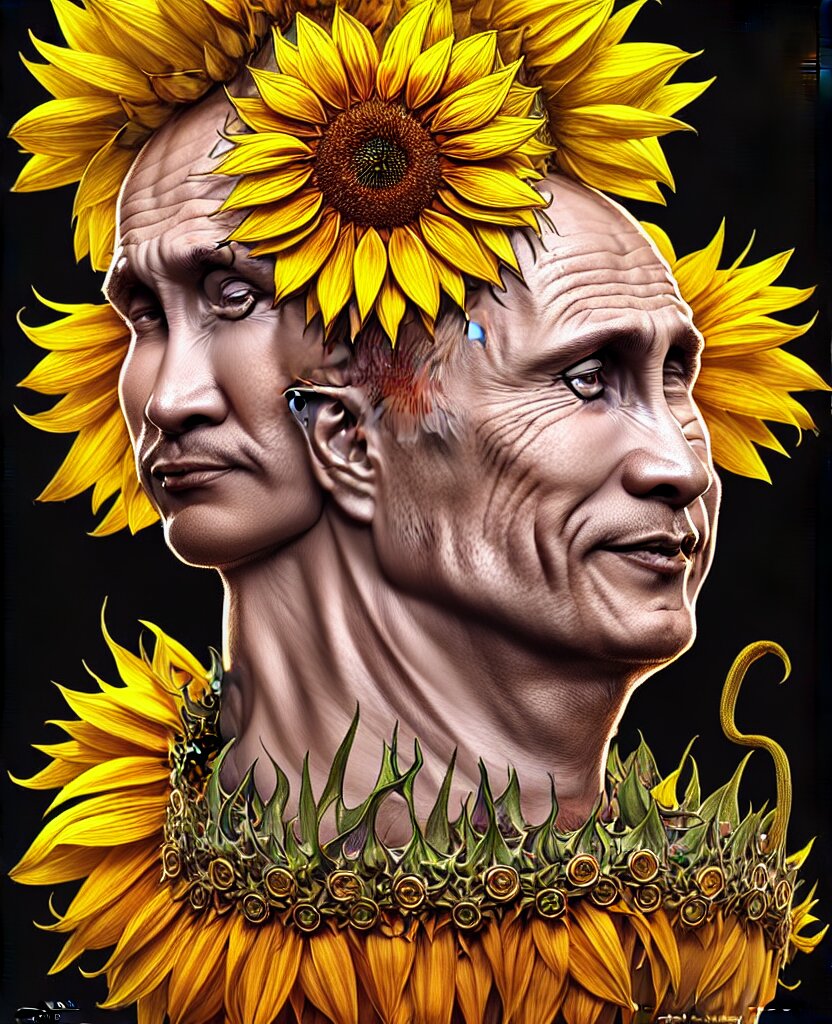 Digital art, centered full body of putin smiling king, sunflower crown, intricate, veins, by james jean and by artgerm, by ross tran ultradetailed, charachter design, concept art, trending on artstation
