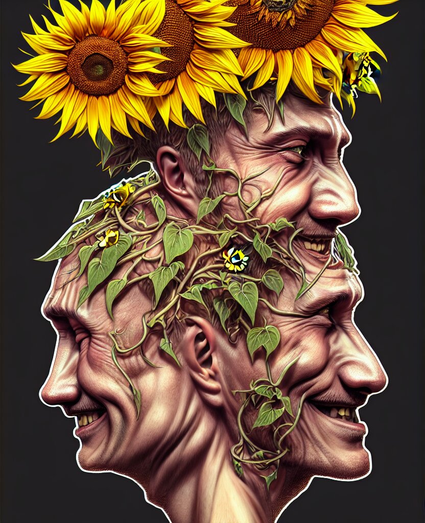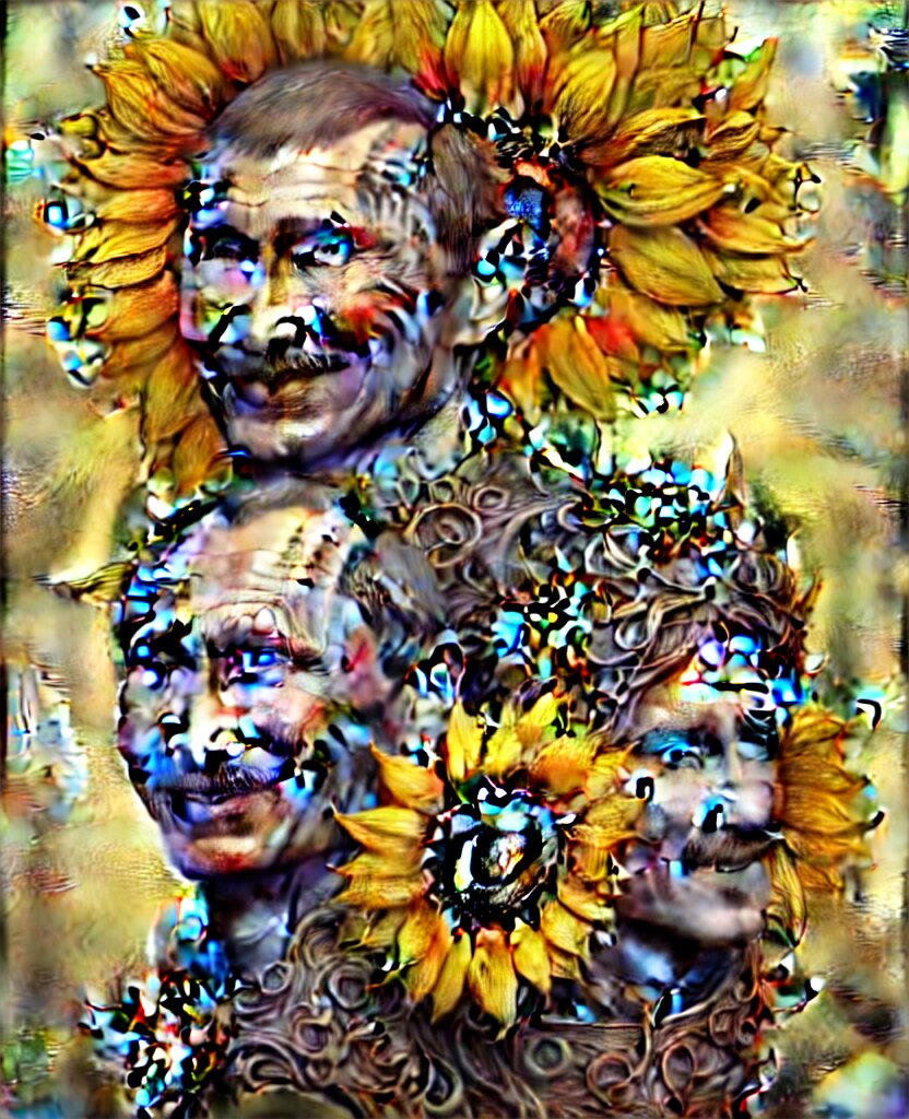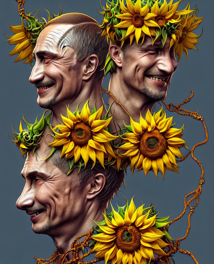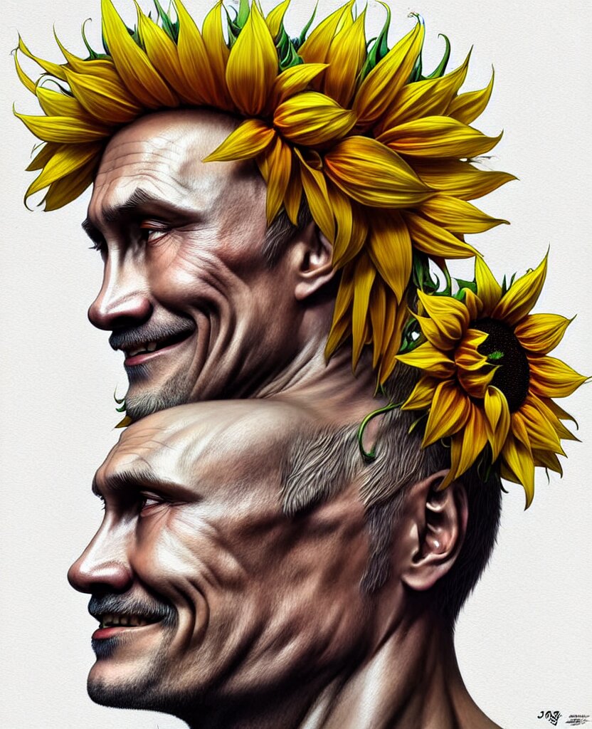 Digital art, centered full body of putin smiling king, sunflower crown, intricate, veins, by james jean and by artgerm, by ross tran ultradetailed, charachter design, concept art, trending on artstation