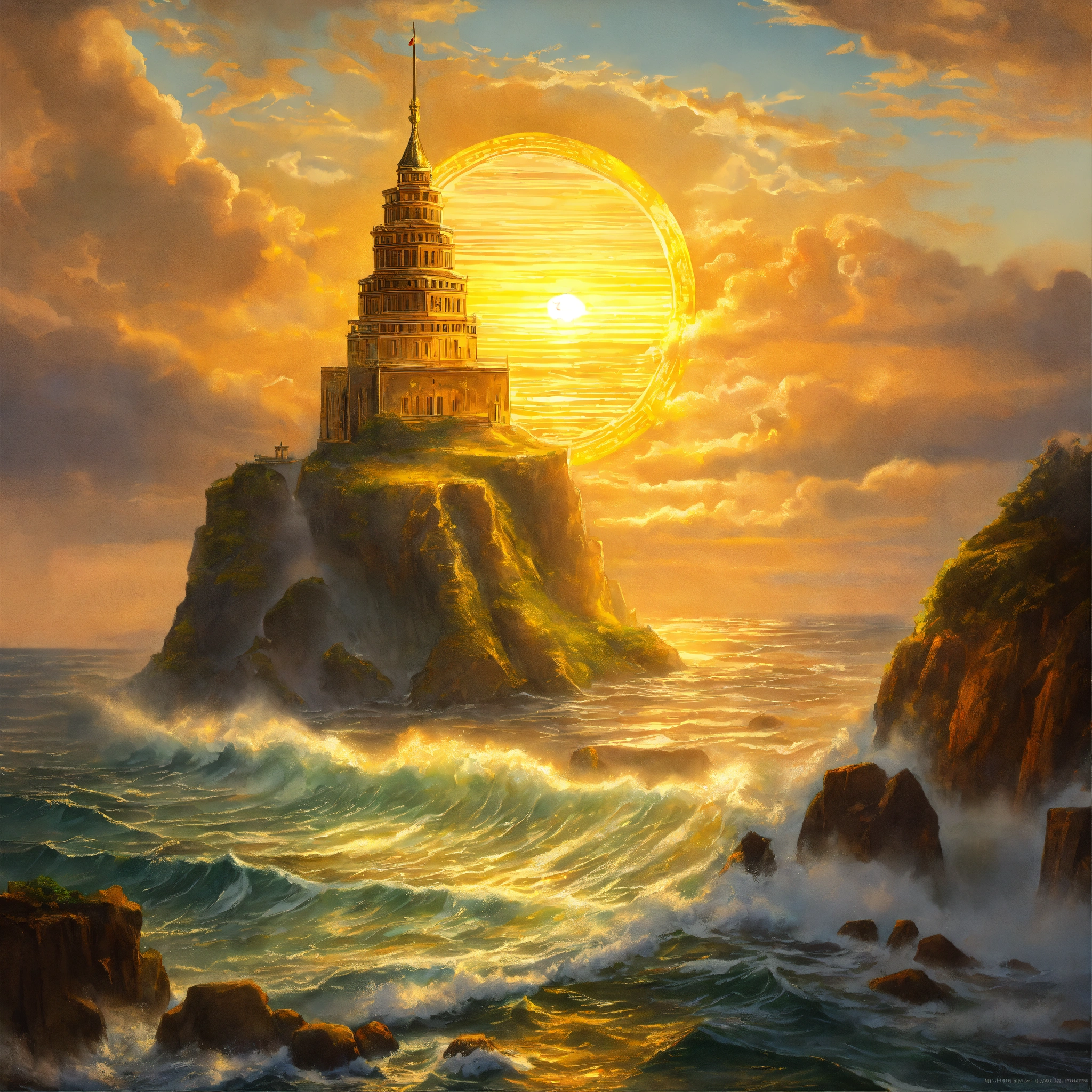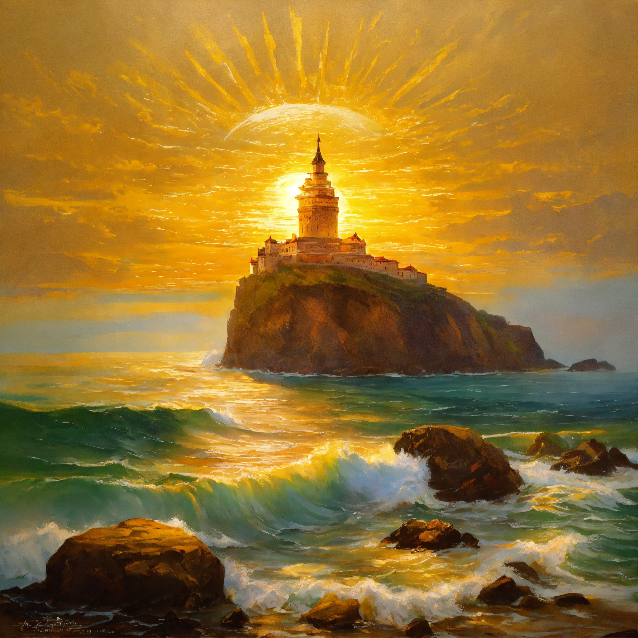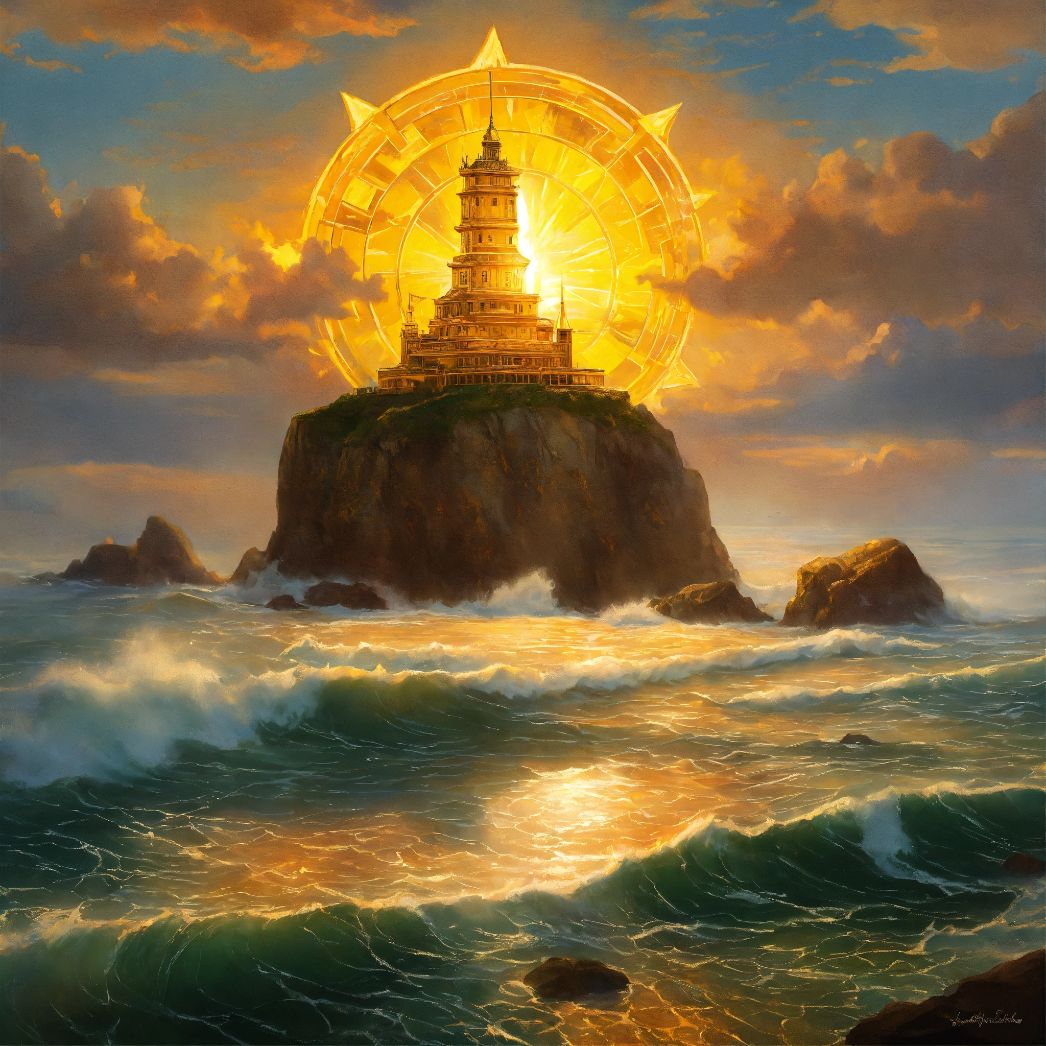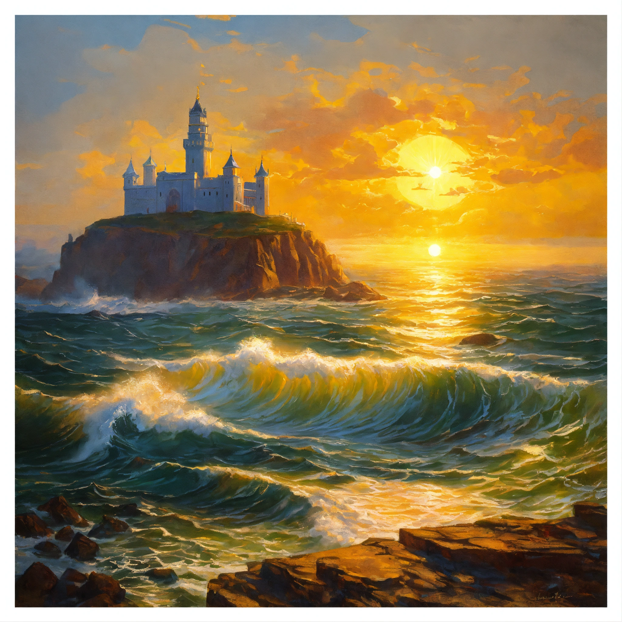 Golden towerpalace in front of the shining sun on a rock in the sea, surrounded by waves logo painting