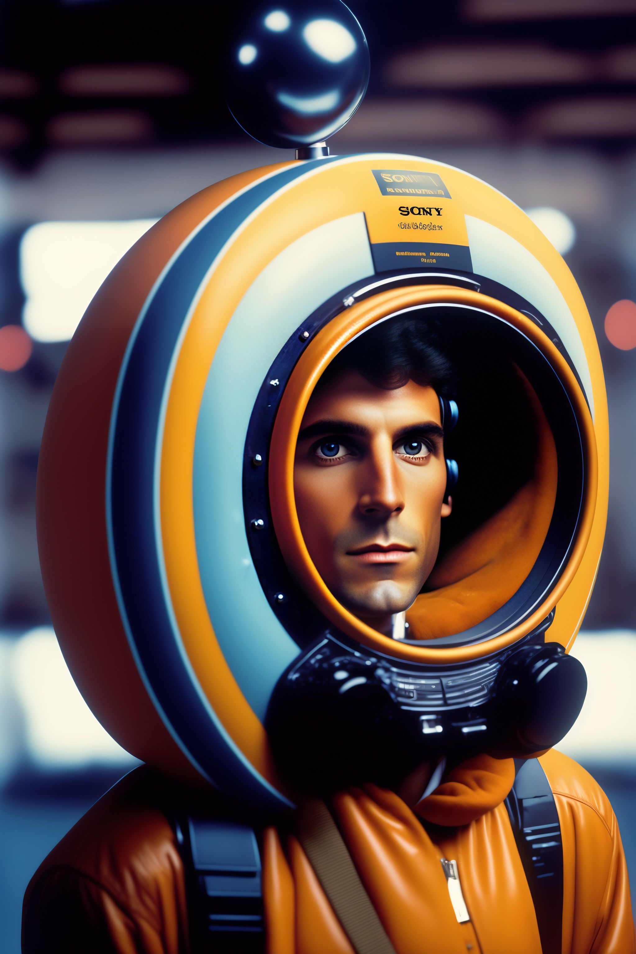 1980s product catalog photograph for a wearable time-travel machine, sony x cern special edition collection, wormholes and portals, inspired by donnie darko, human model