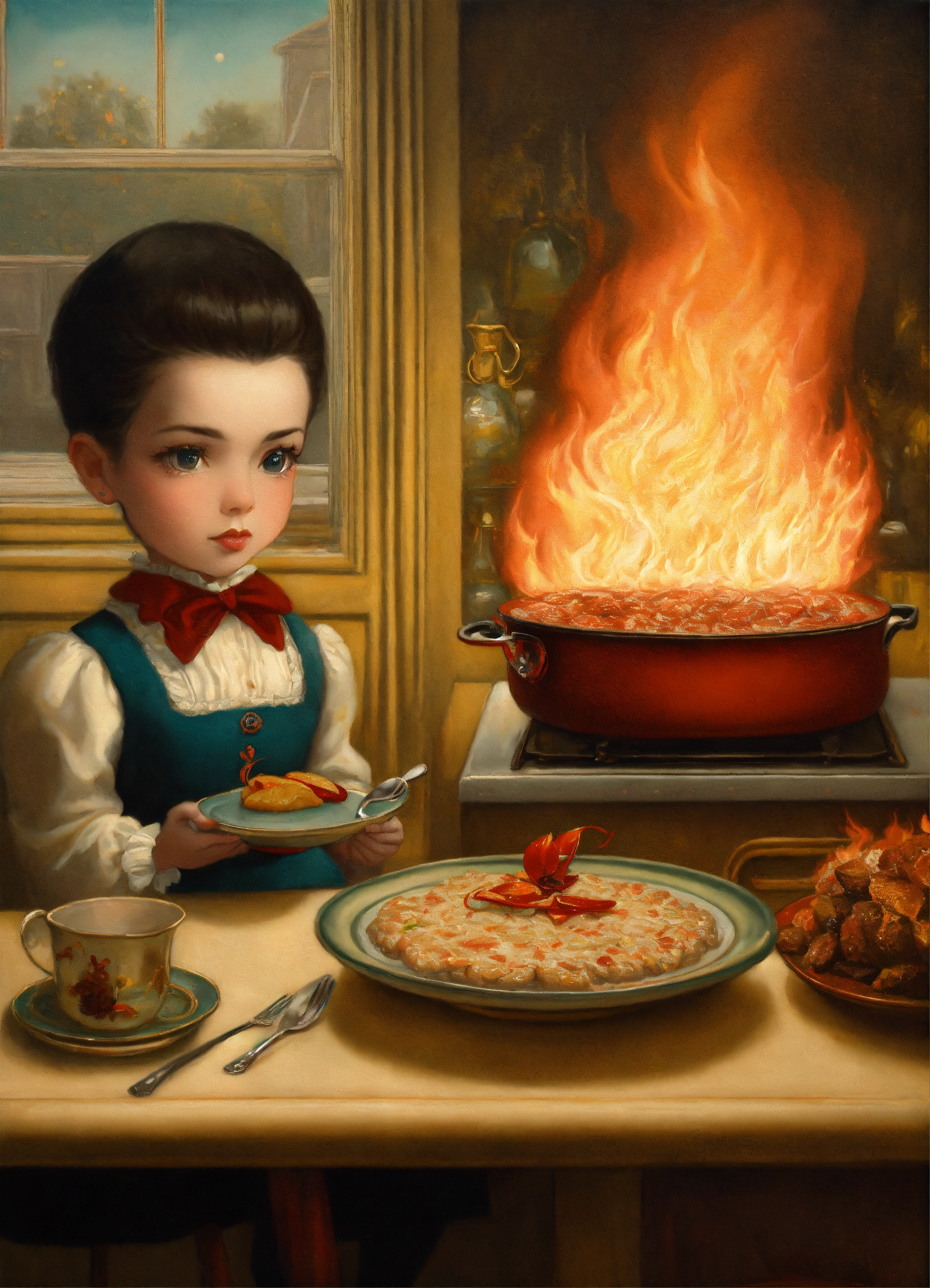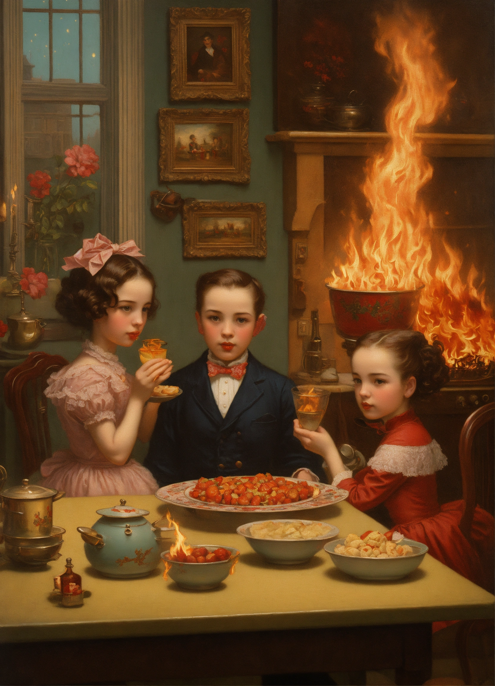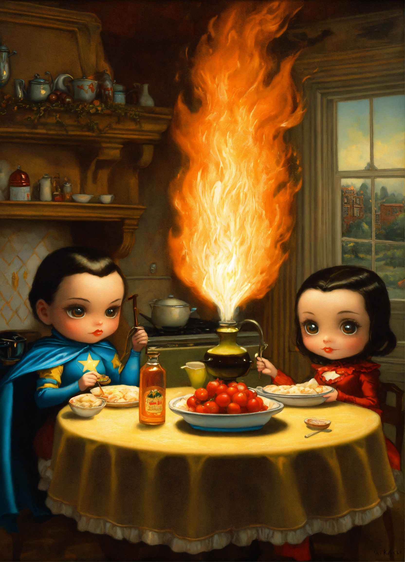 Superhero in a vintage kitchen enjoying their meal, table on fire, victorian era oil painting by mark ryden