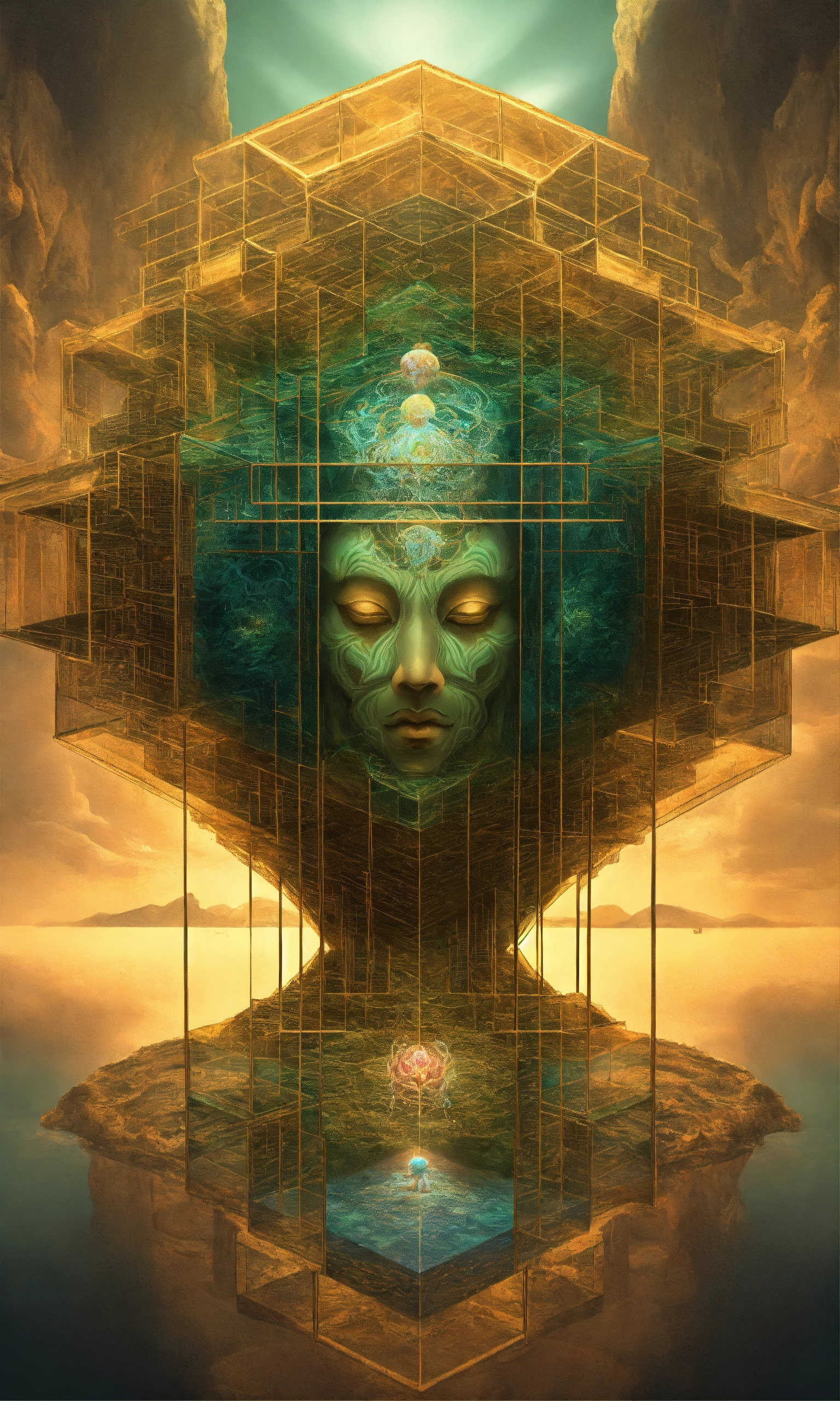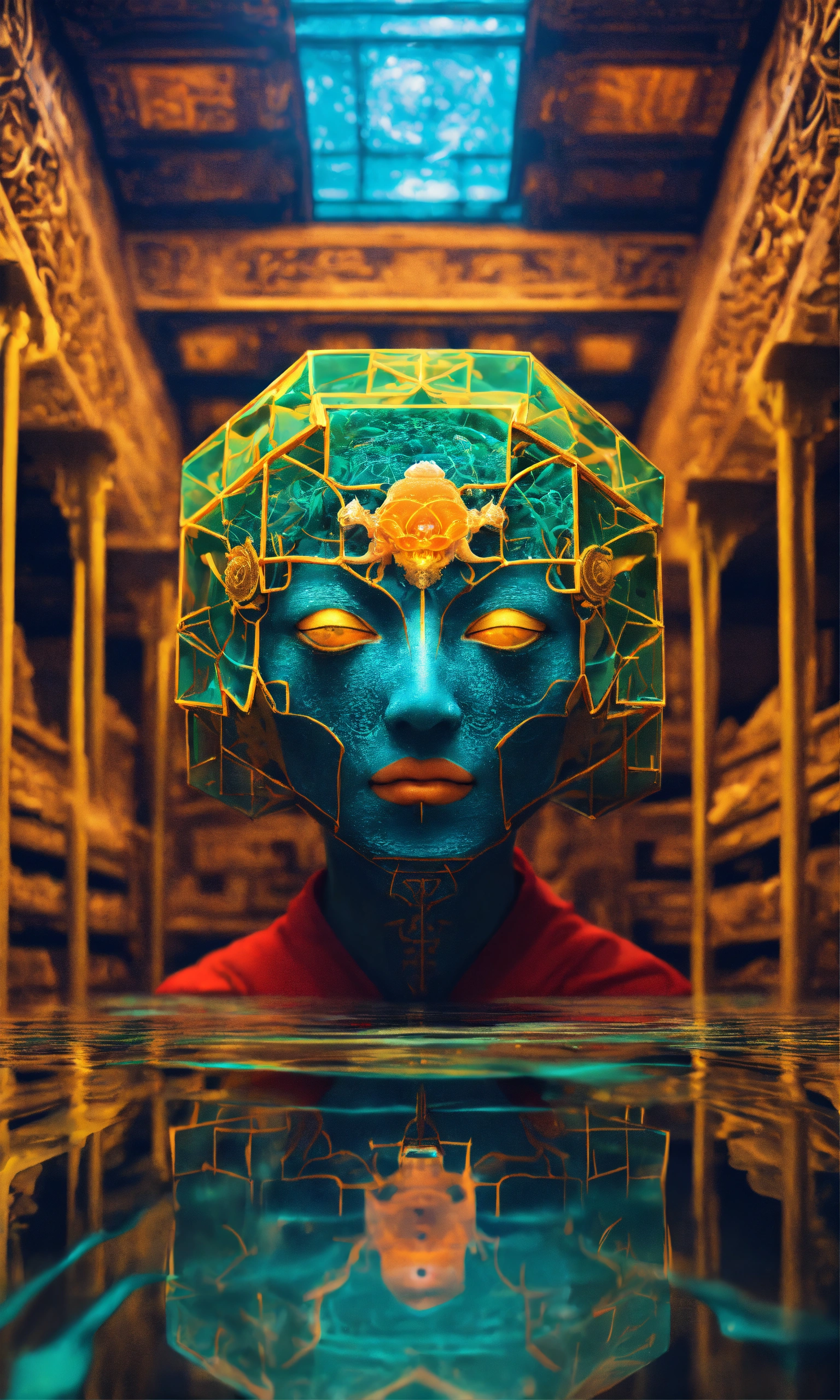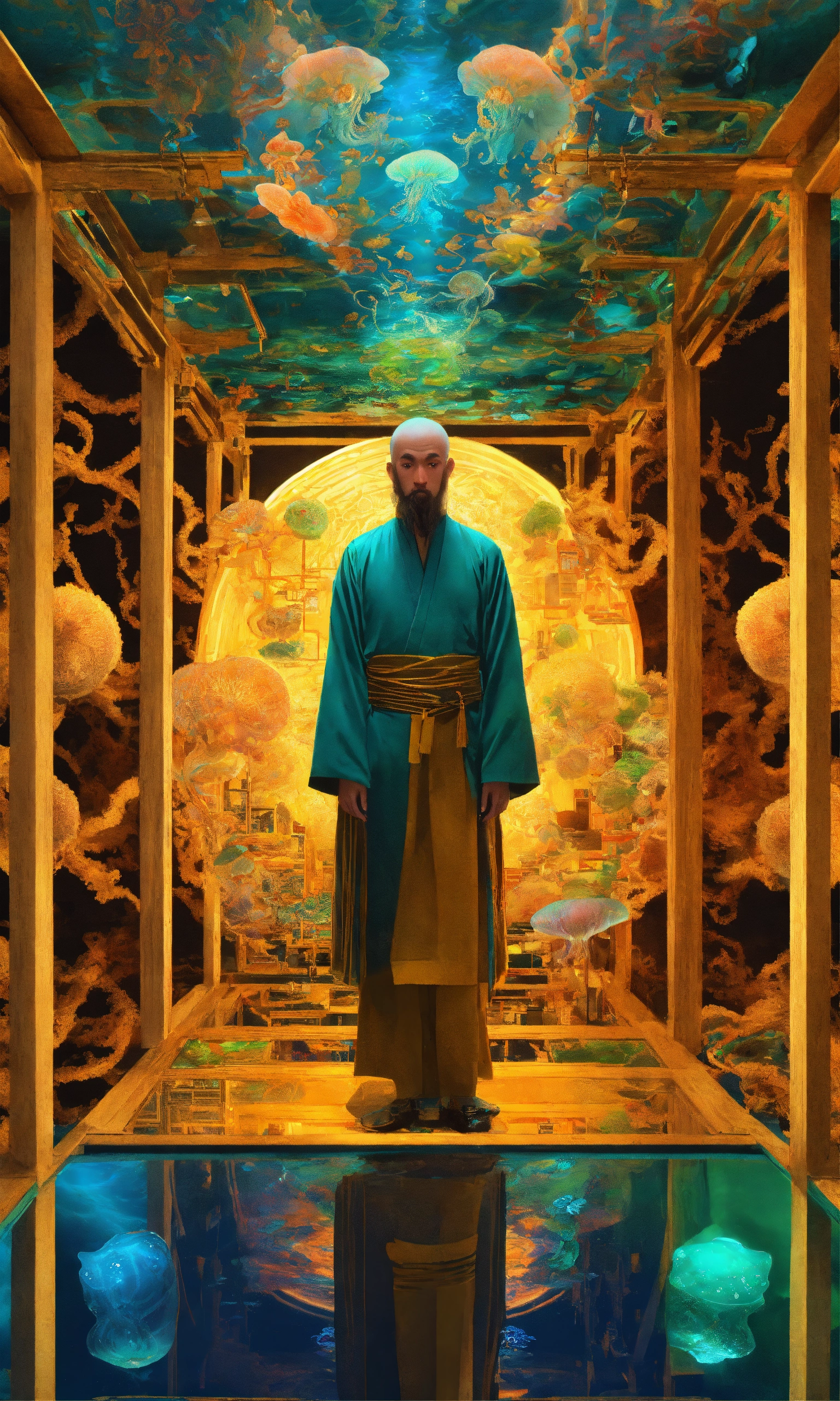 Taoist monk tesseract body fractal three point perspective hypercube mirror zen face brain mayan mantis jellyfish face underwater