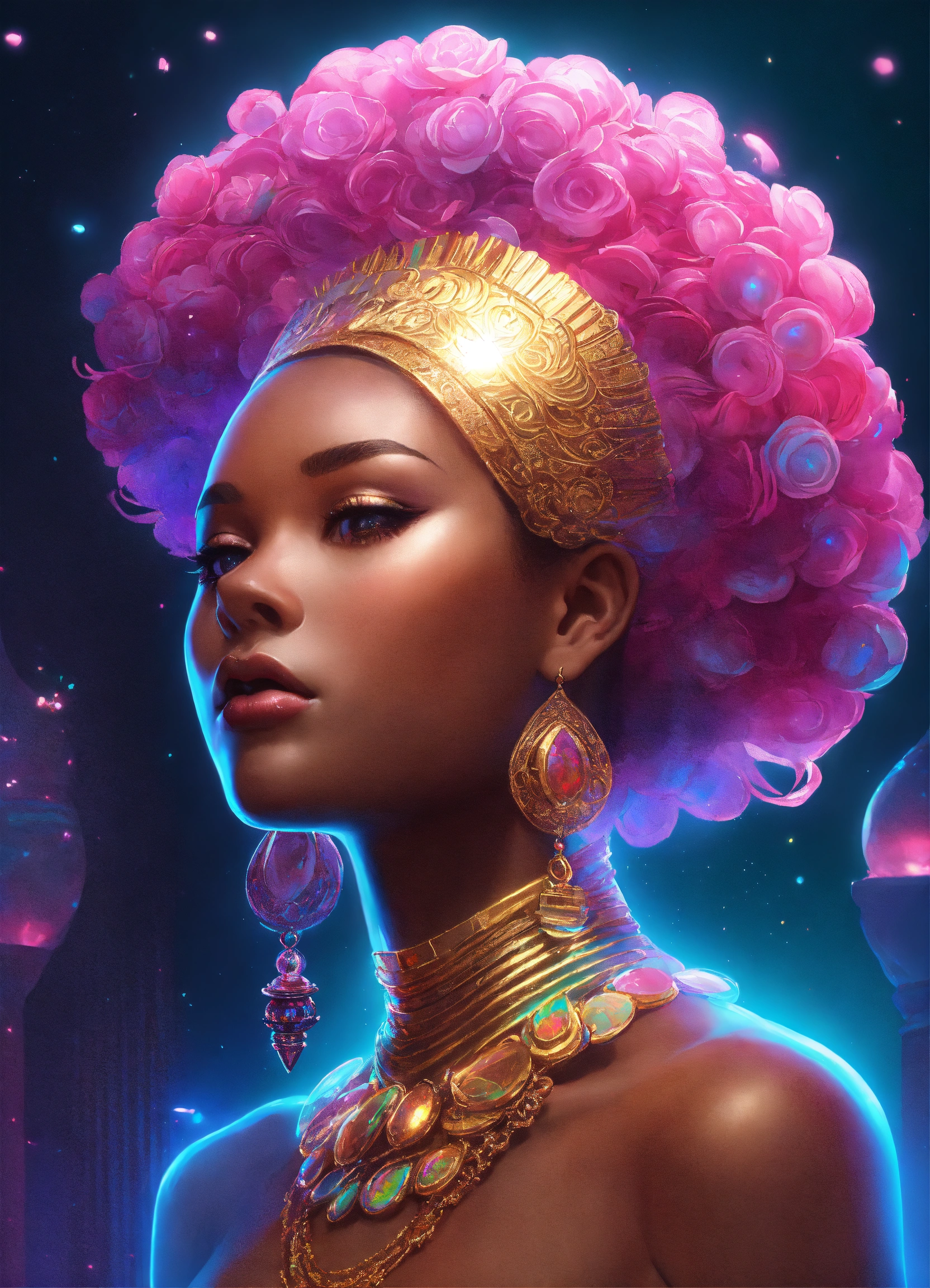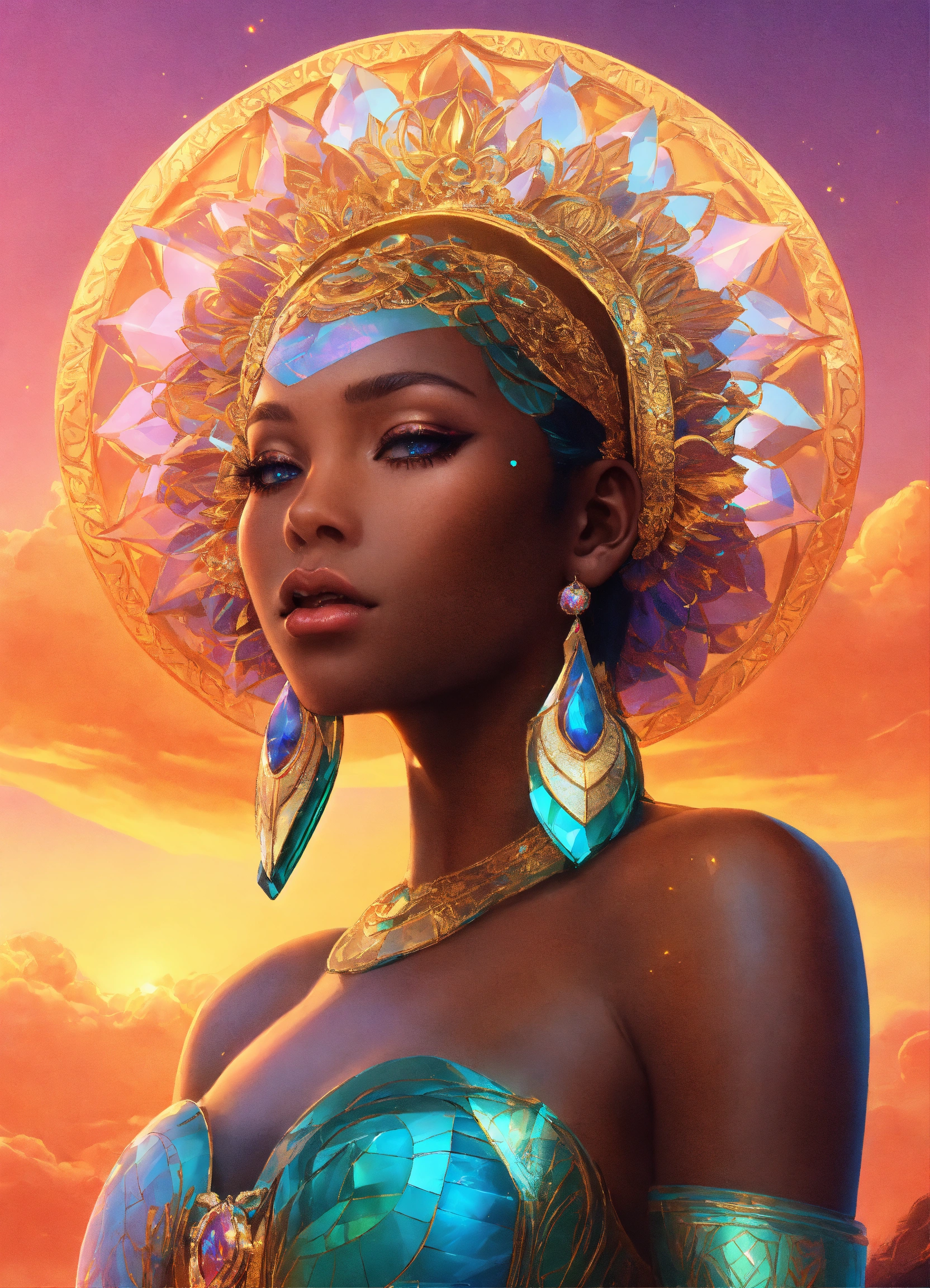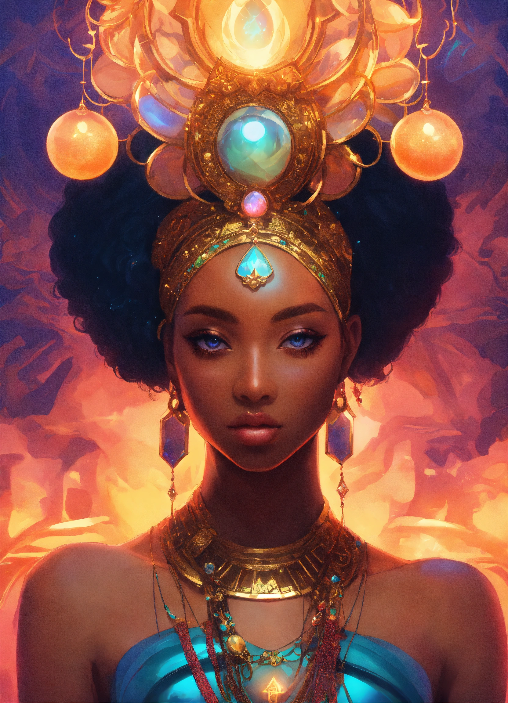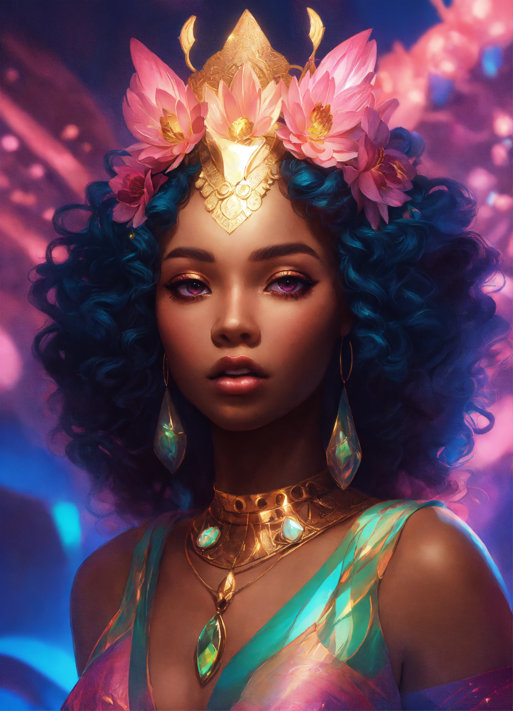 Pretty, afrocentric, wavy hair, royalty, cute, pretty, adorable, majestic, majestic, divine beauty, fantasy, pop surrealism, masterpiece, cinematic, zbrush, inspired by beeple, beauty, opalescent, opal, decadent jewells, transcendant. vaporwave aesthetic, smooth, sharp focus, art by artgerm, radiant luminosity, lotus, sureal beauty, creative headress, dreamy, cleopatra, bliss, divine, creative, facinating, captivating, energy, luminous light.