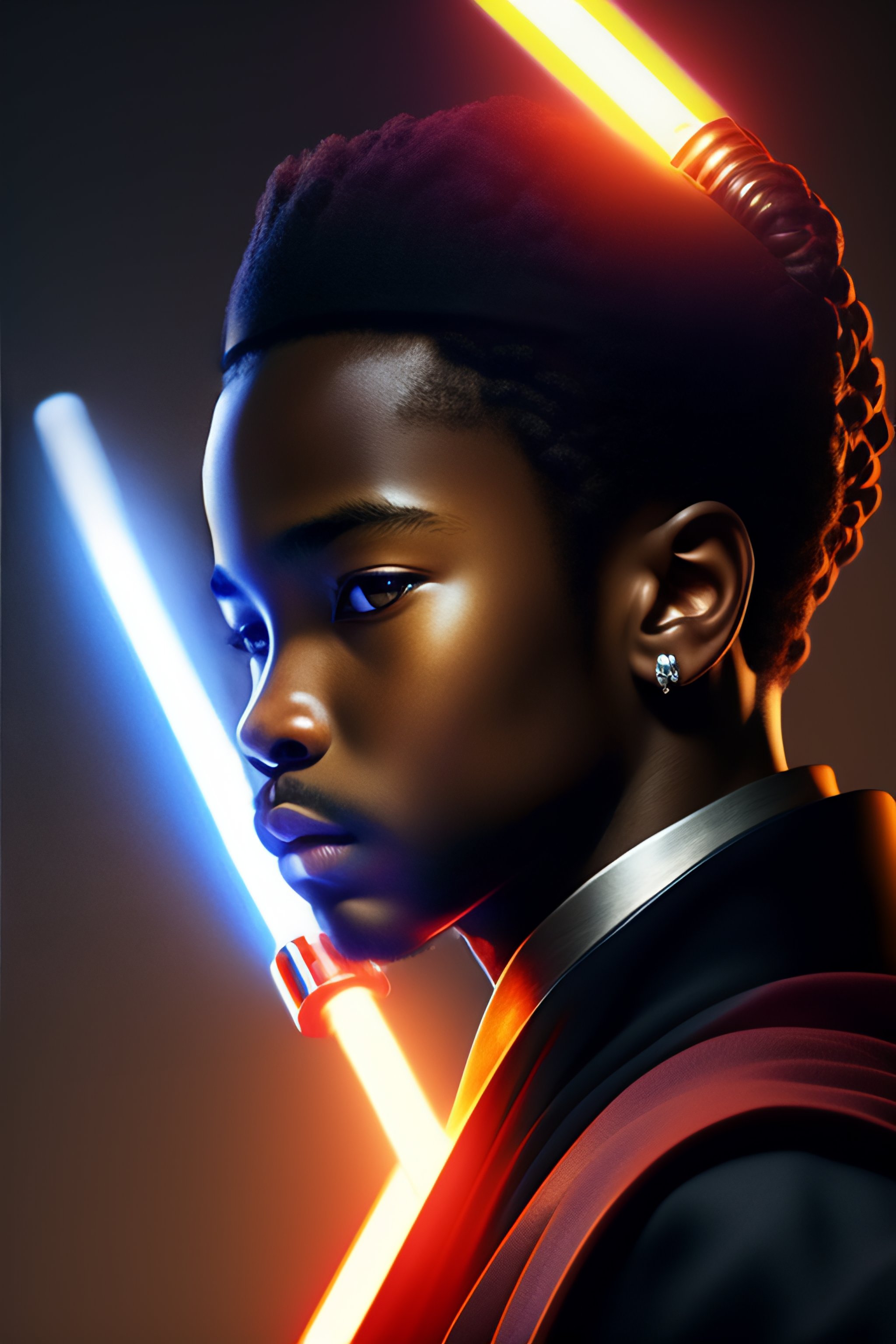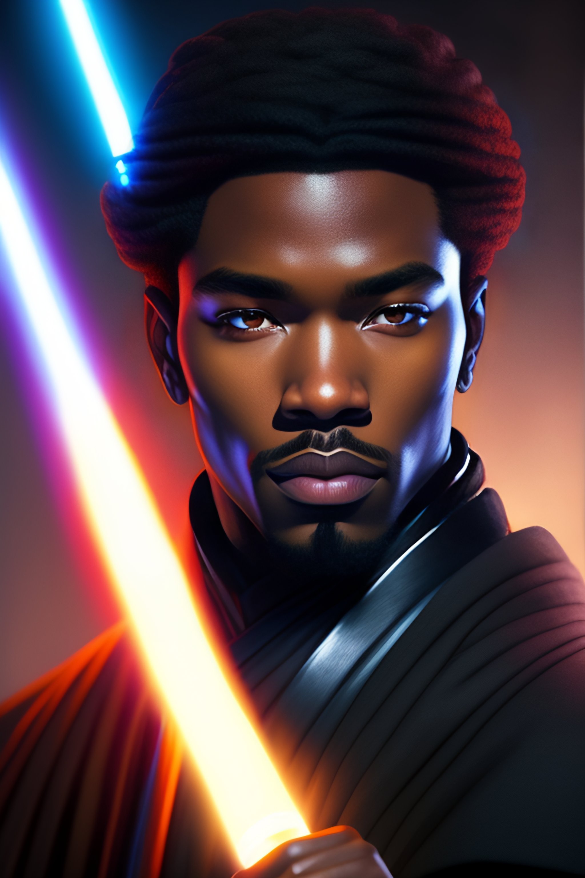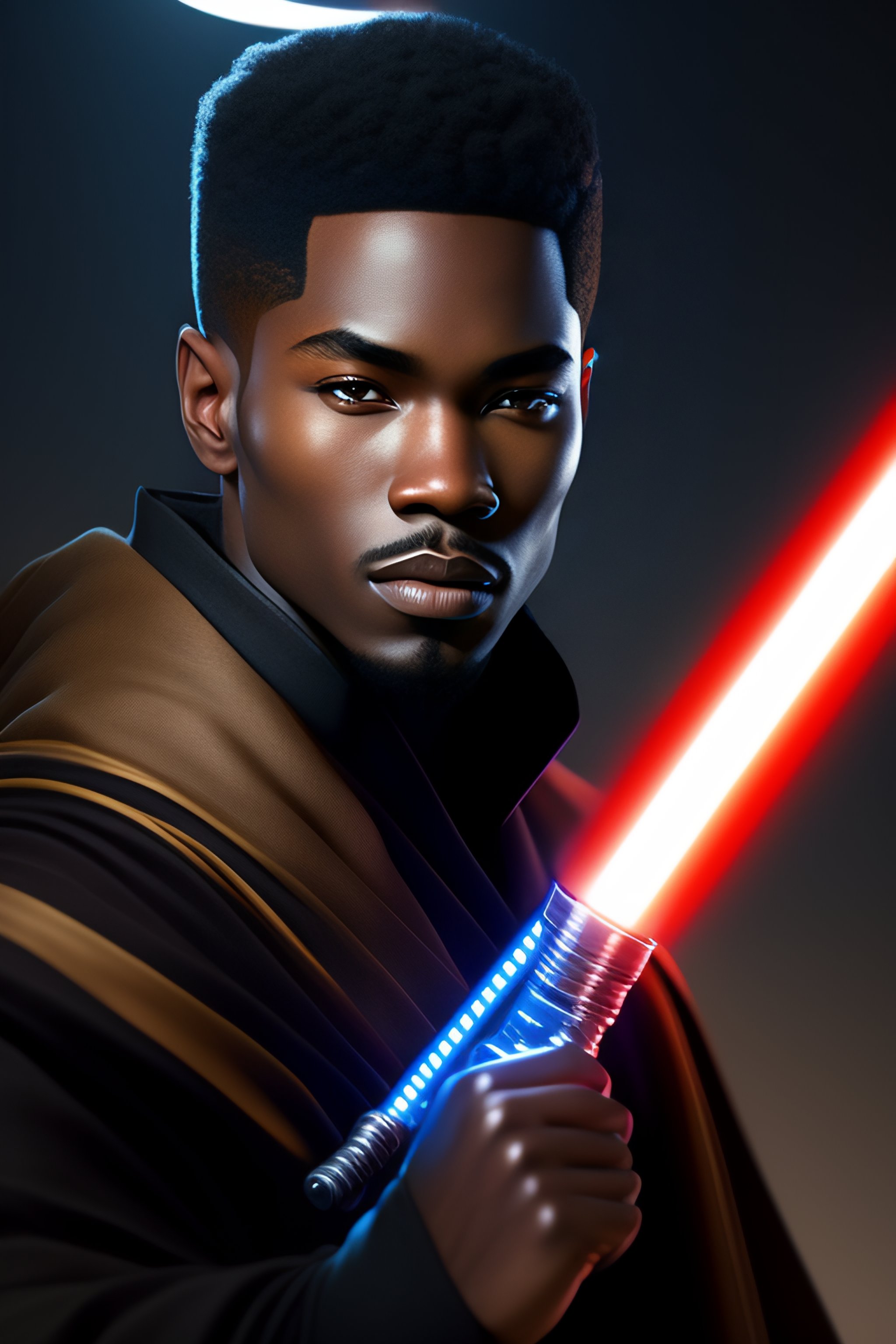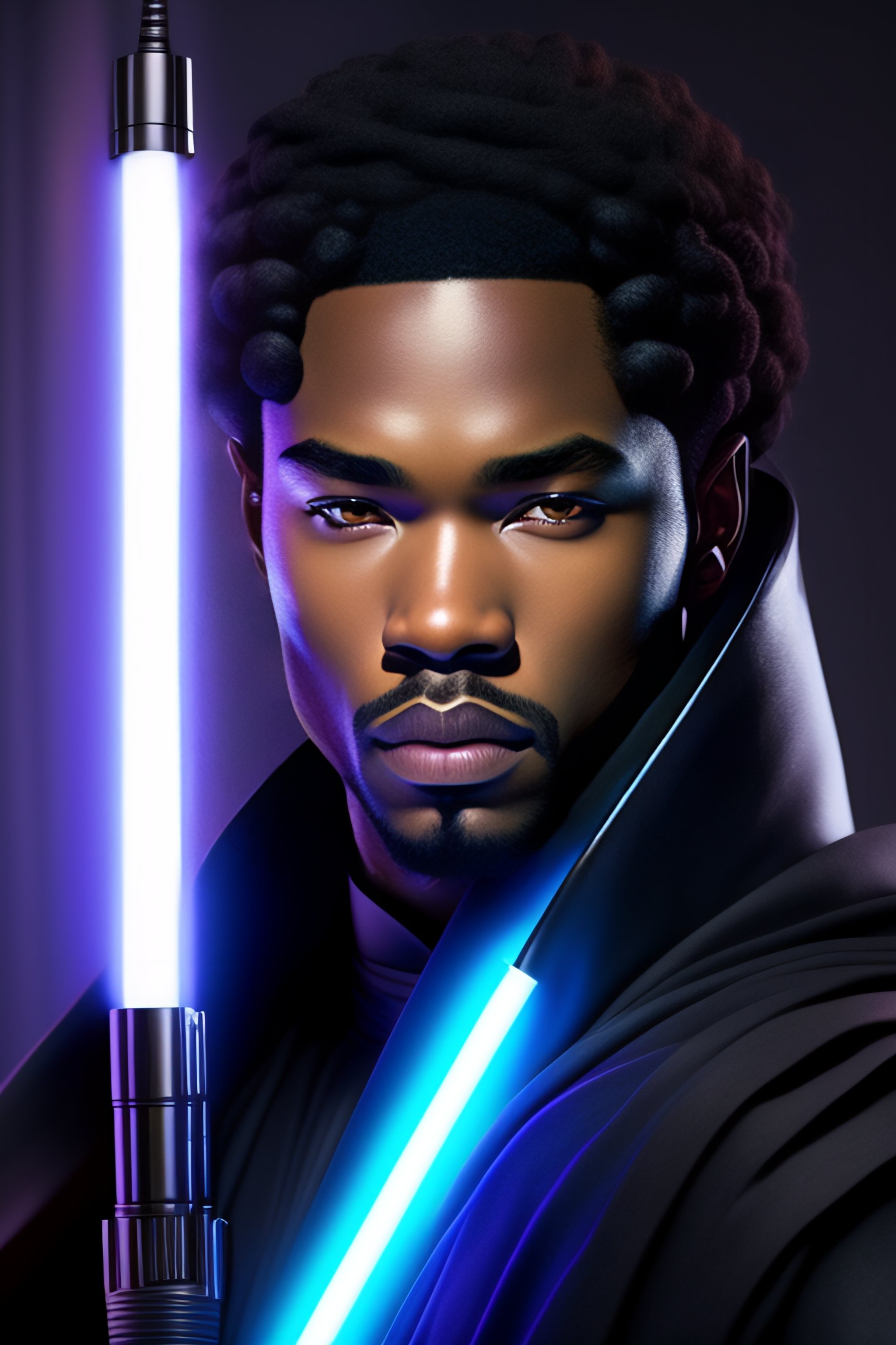 Professional portrait of young black jedi man with waves holding a lightsaber, star wars, by artgerm and moebius, beautiful, hyperrealism, highly detailed, 8k, intricate, closeup, dynamic dramatic dark moody lighting, shadows, artstation, concept art, octane render, 8k