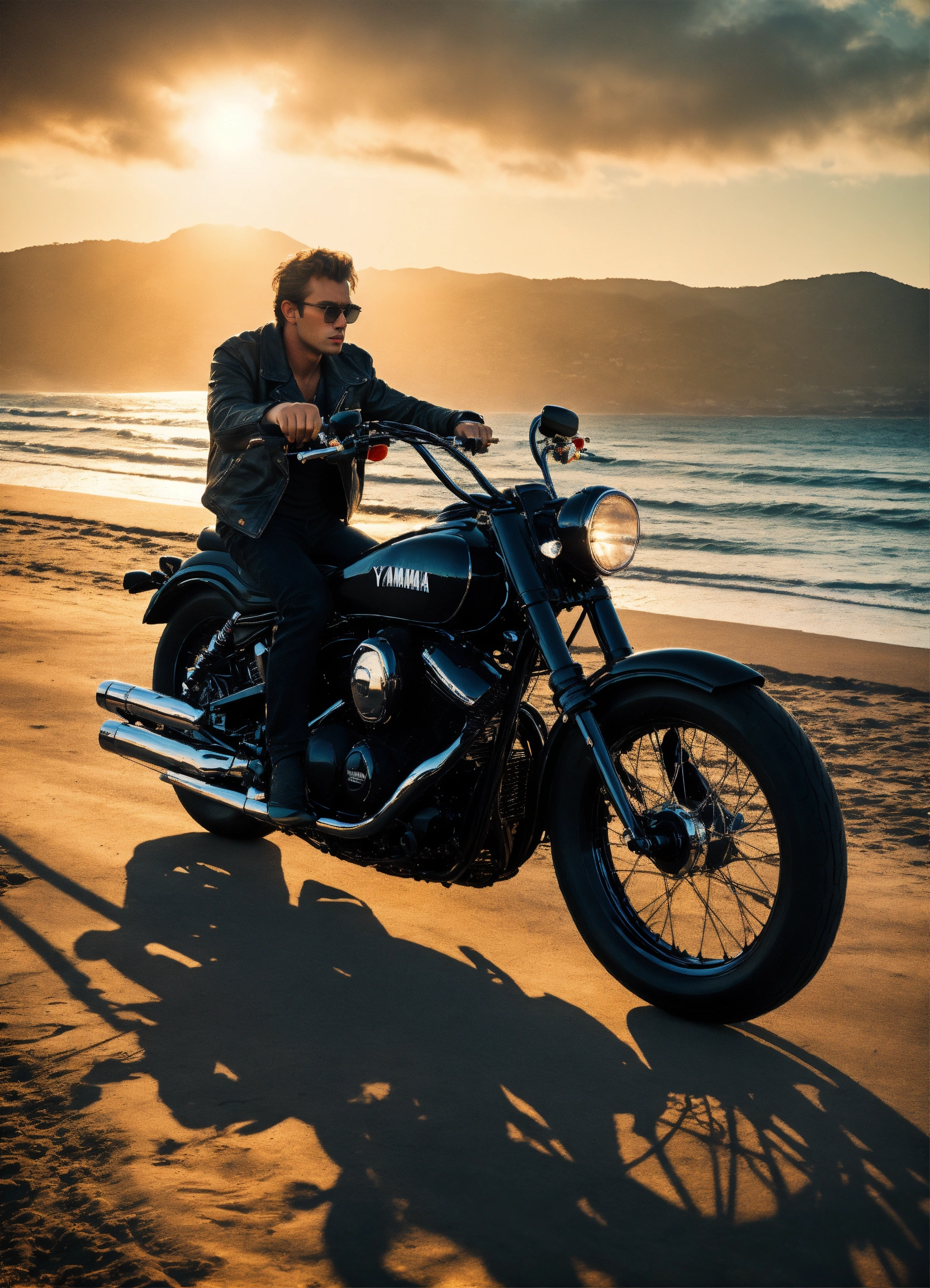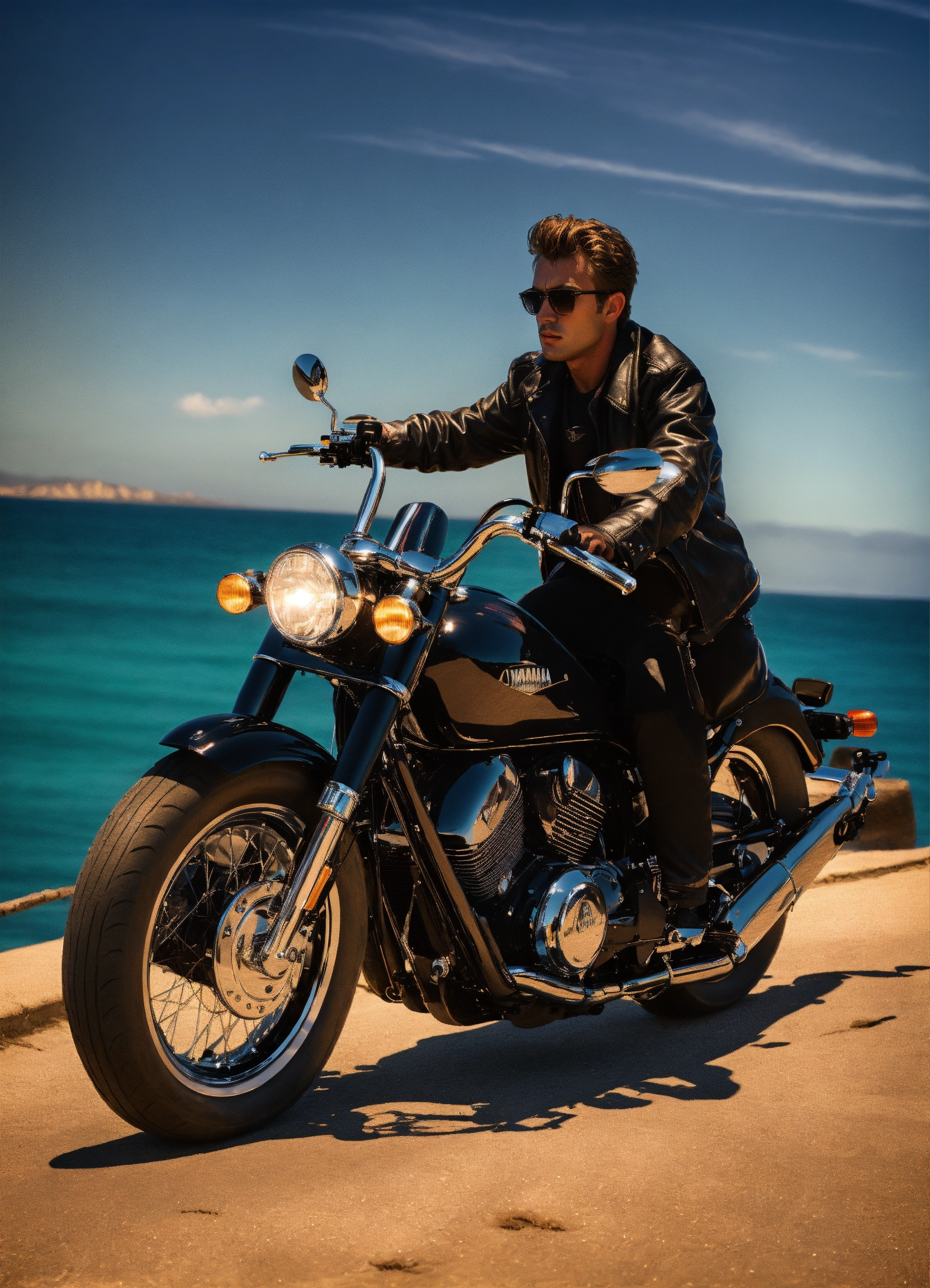 Black yamaha cruiser with an james dean on it cruising down the coast, 8k masterpiece, perfect lighting, stunning details, shadow play, detailed hues