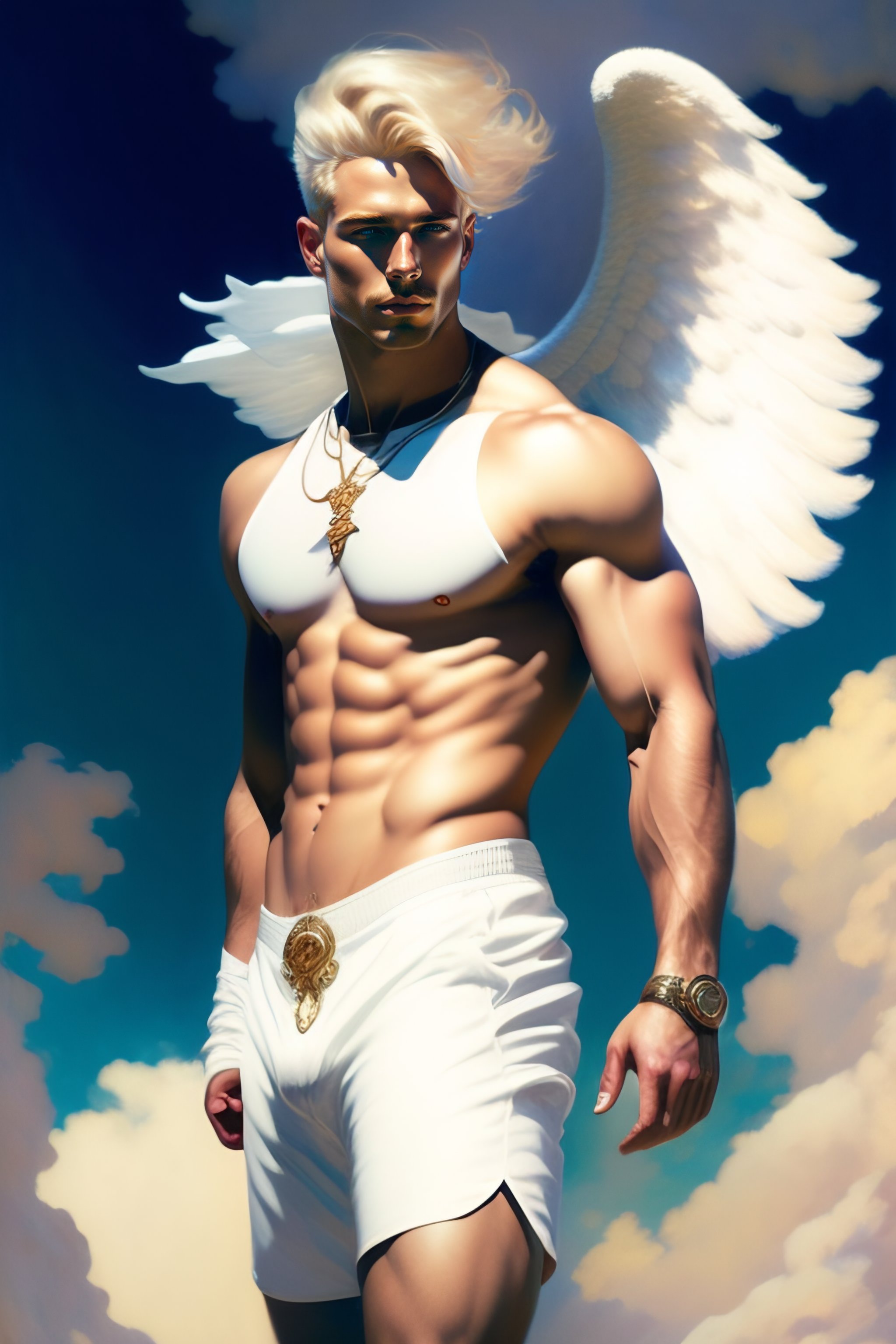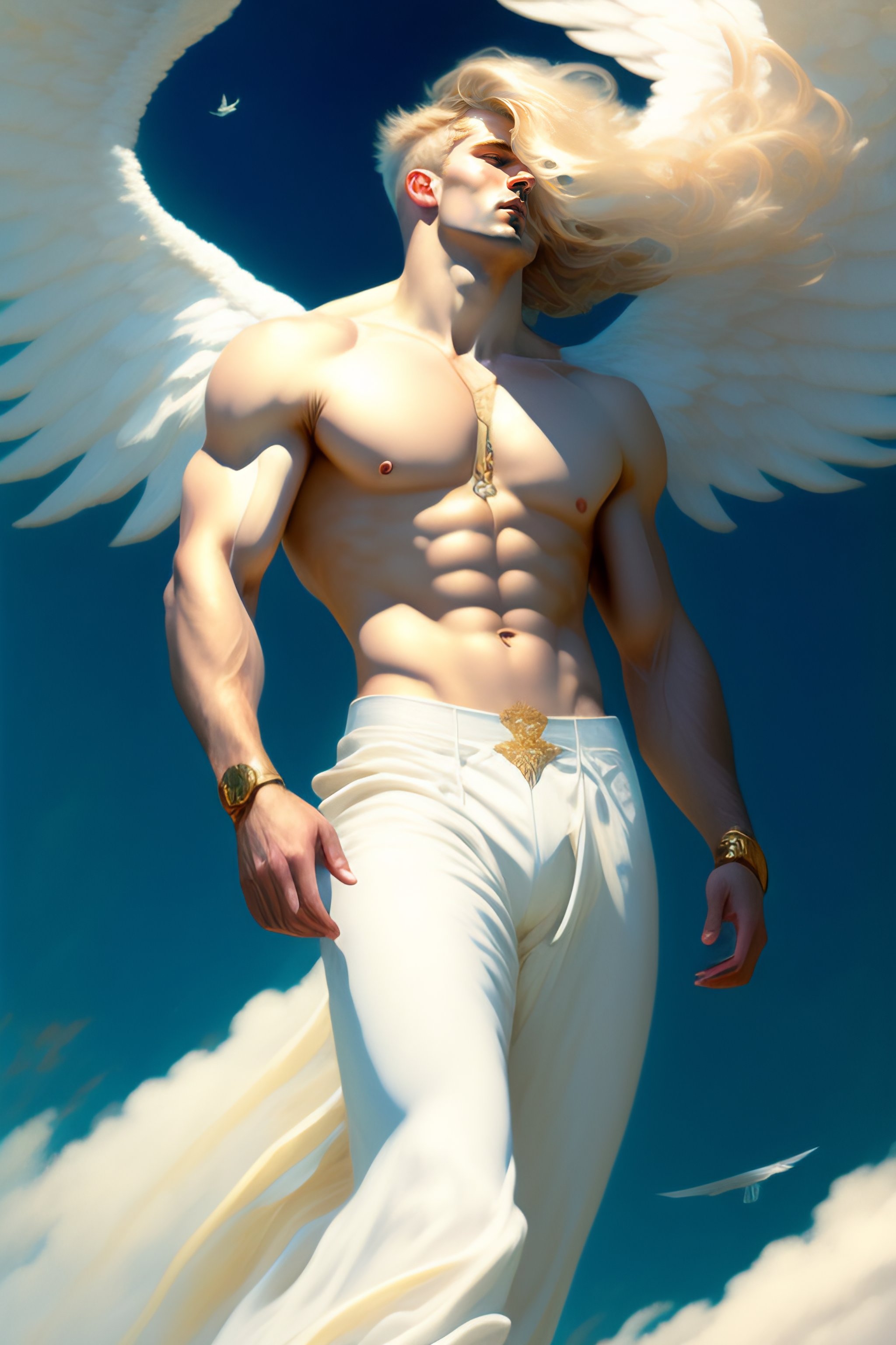 A male angel flying and dancing among the clouds, blond hair, in the center of the images, hyper realistic, ultra realistic, intricate, dynamic, white pants, detailed torso, 8k, art by krenz cushart and artem demura and alphonse mucha