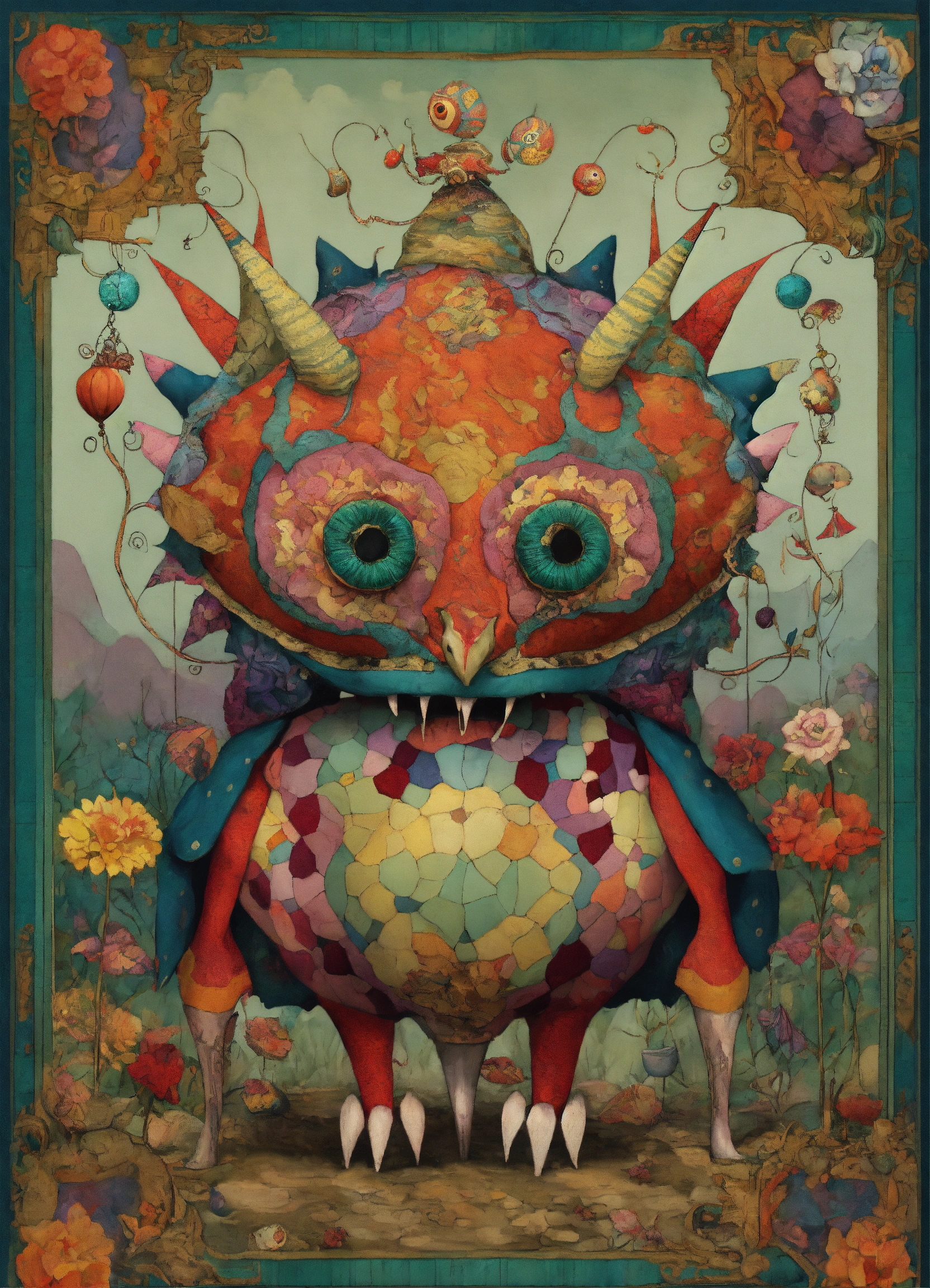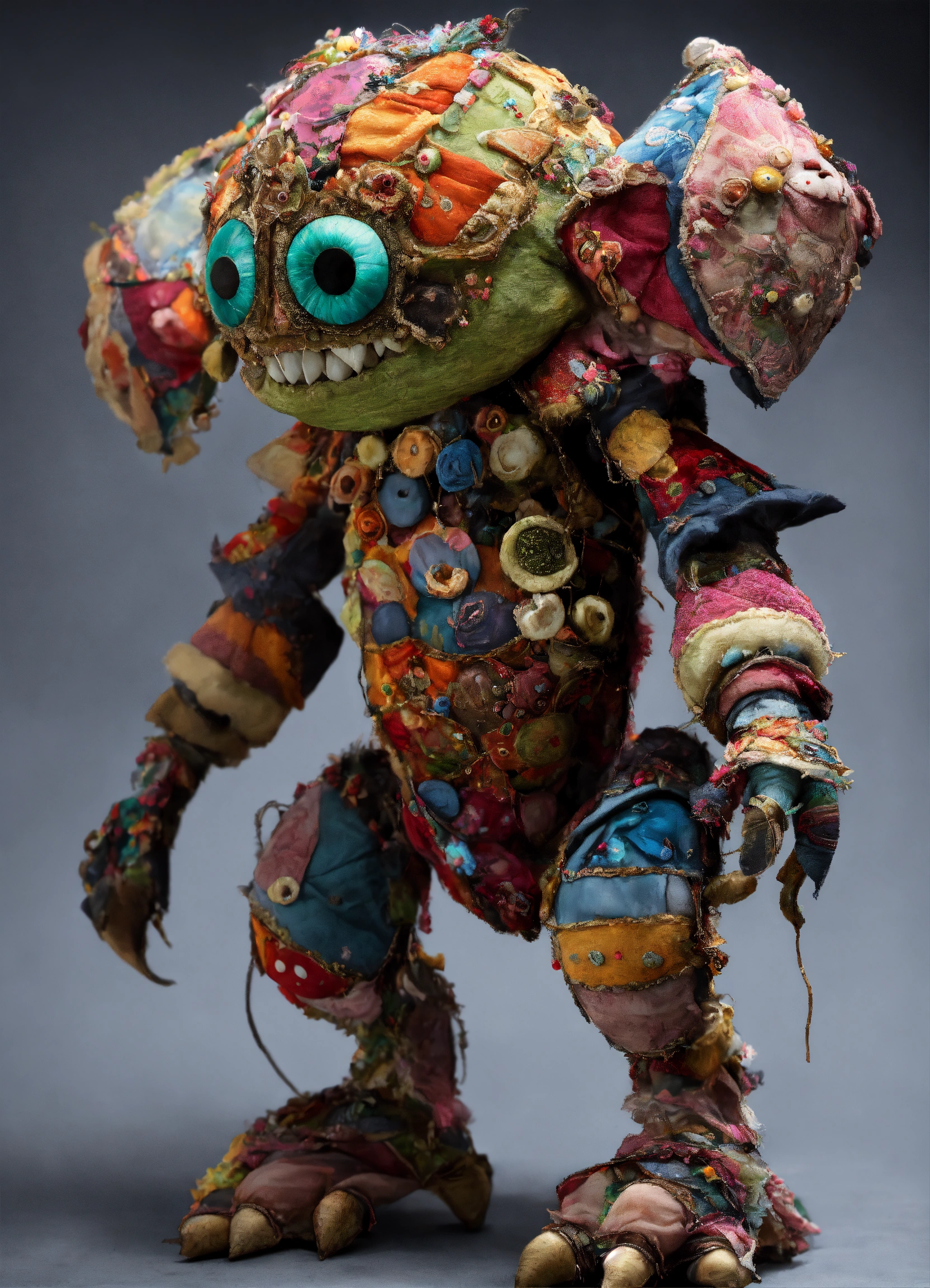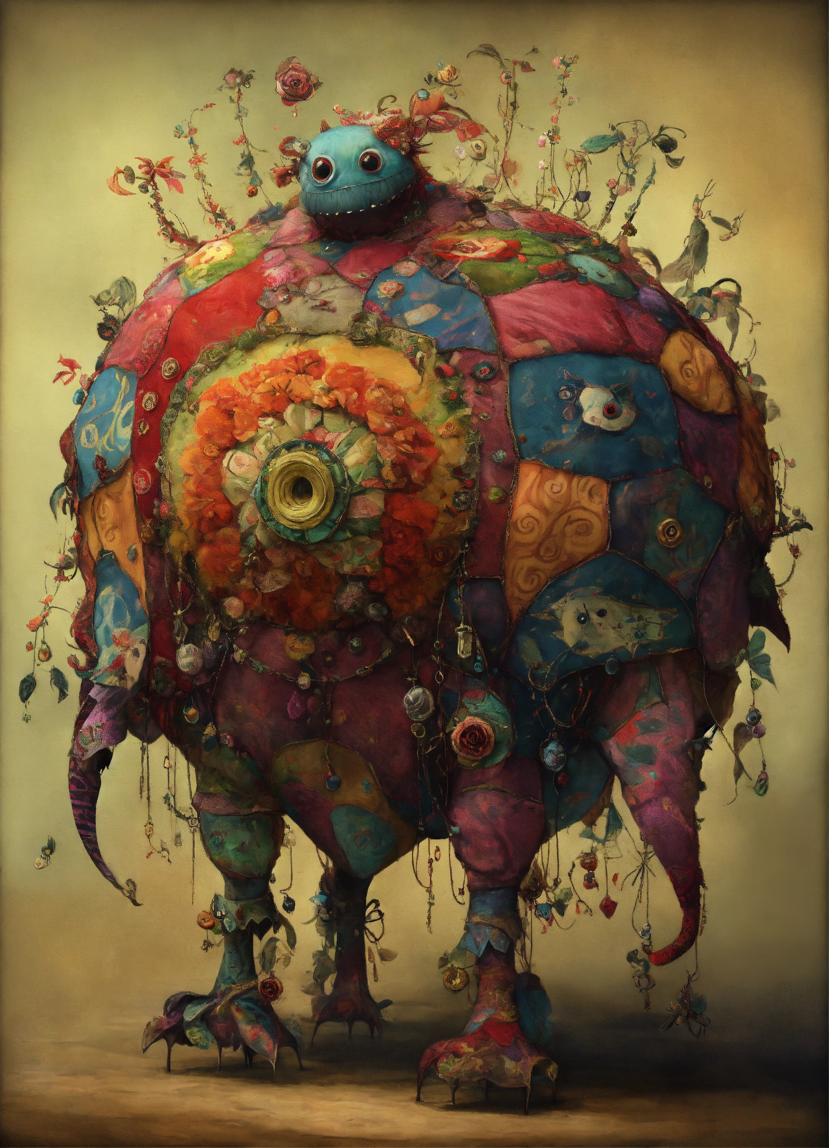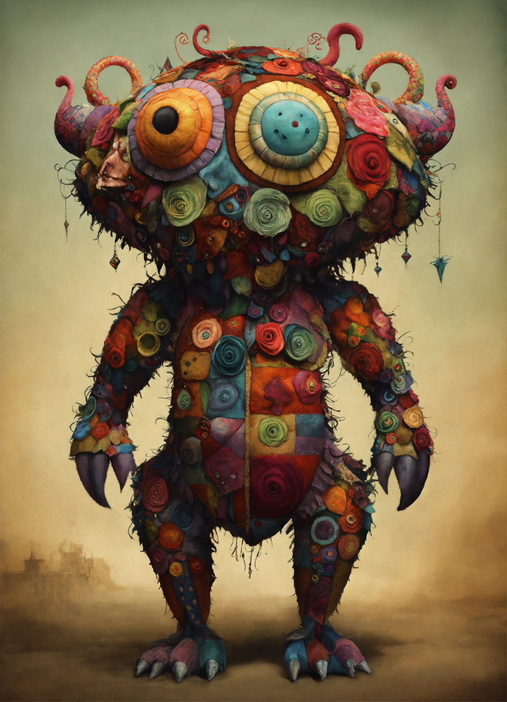 A grotesquely beautiful monster with a tim burton-esque design, its body composed of a patchwork of mismatched fabrics and colors.