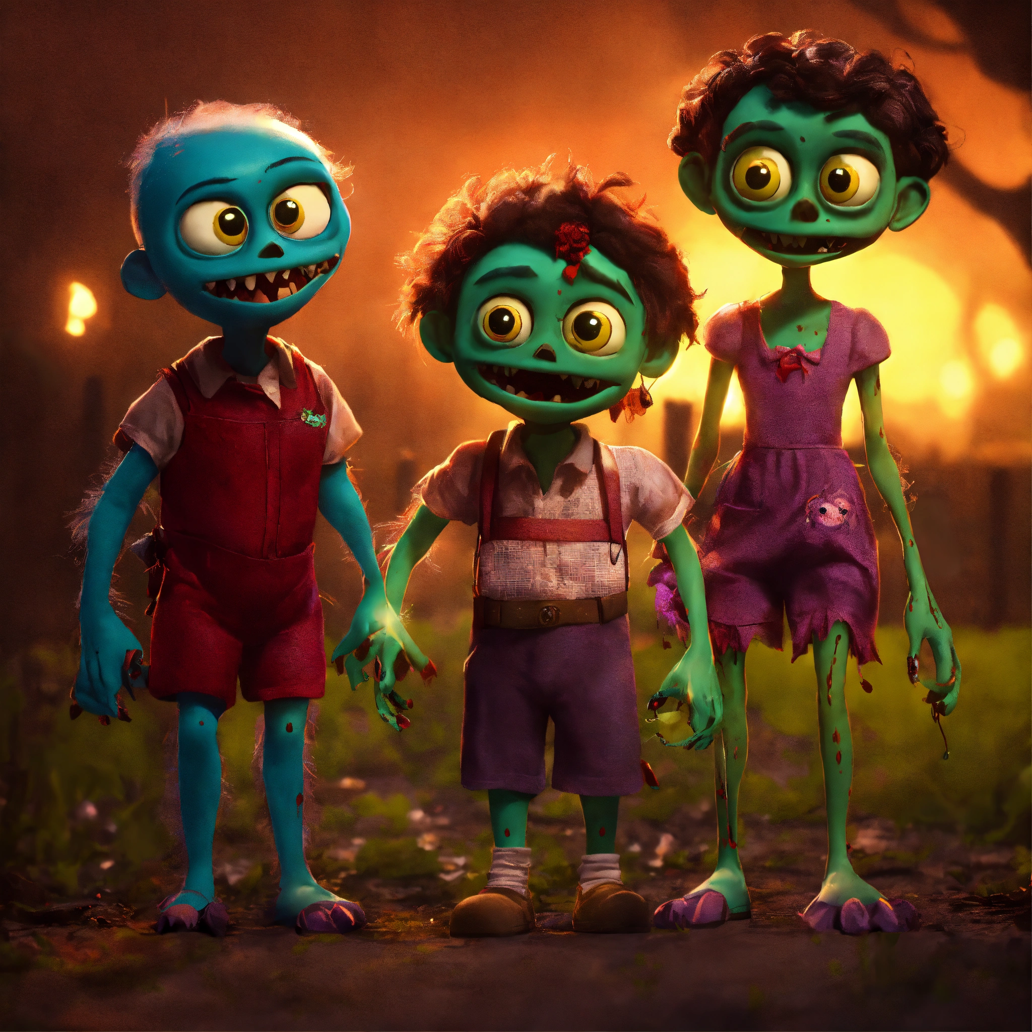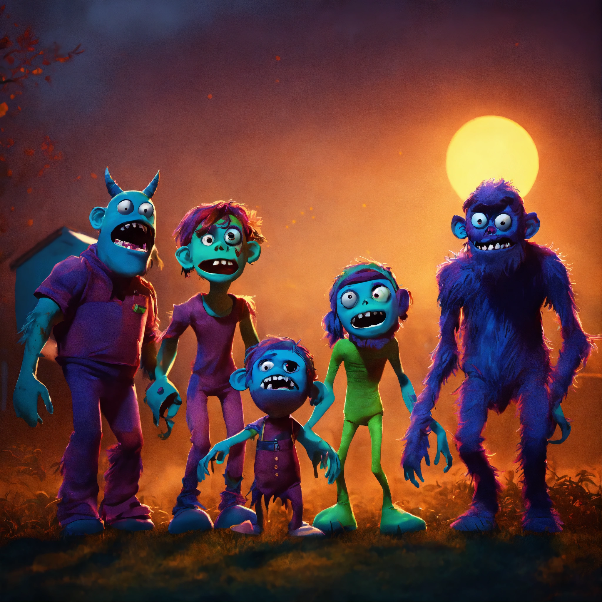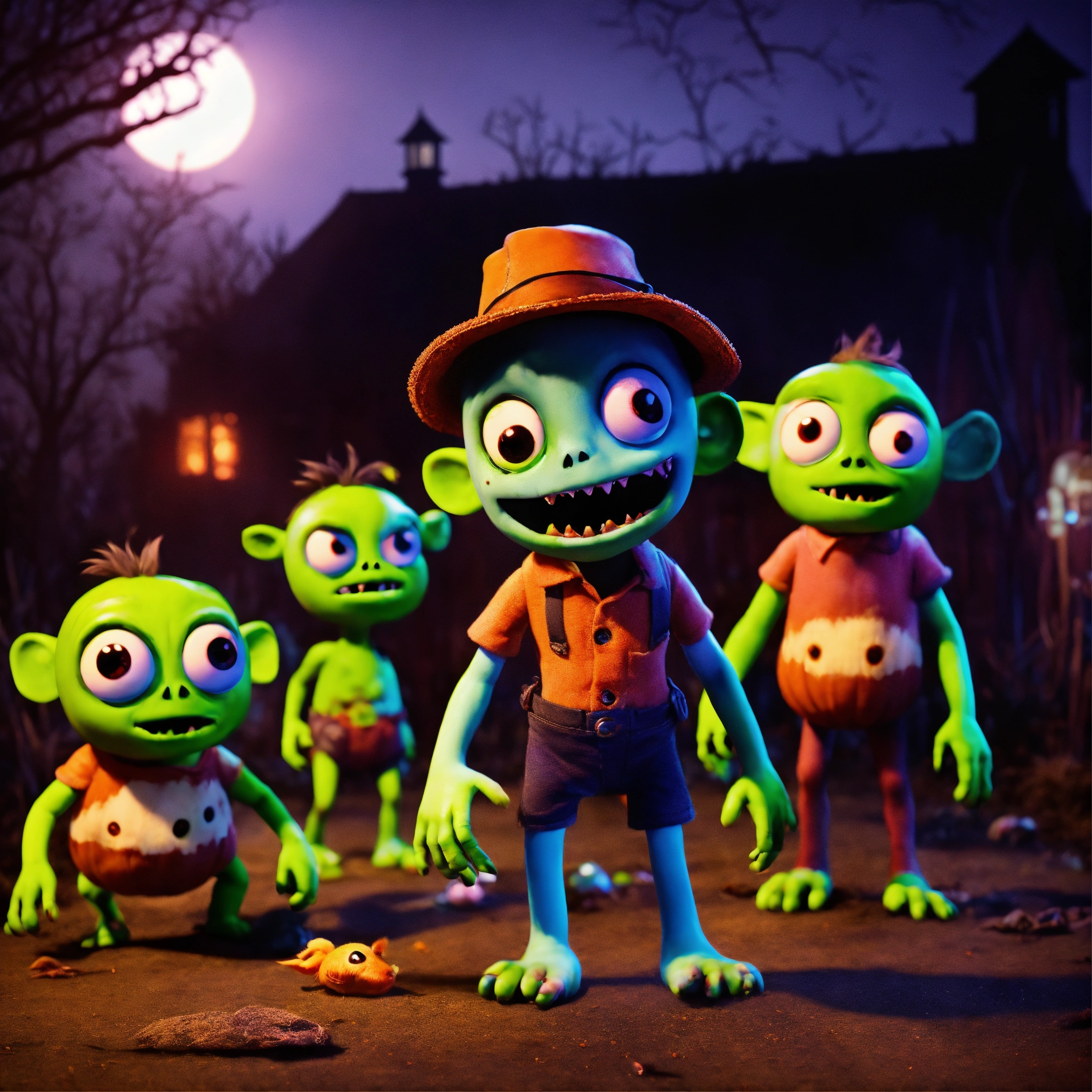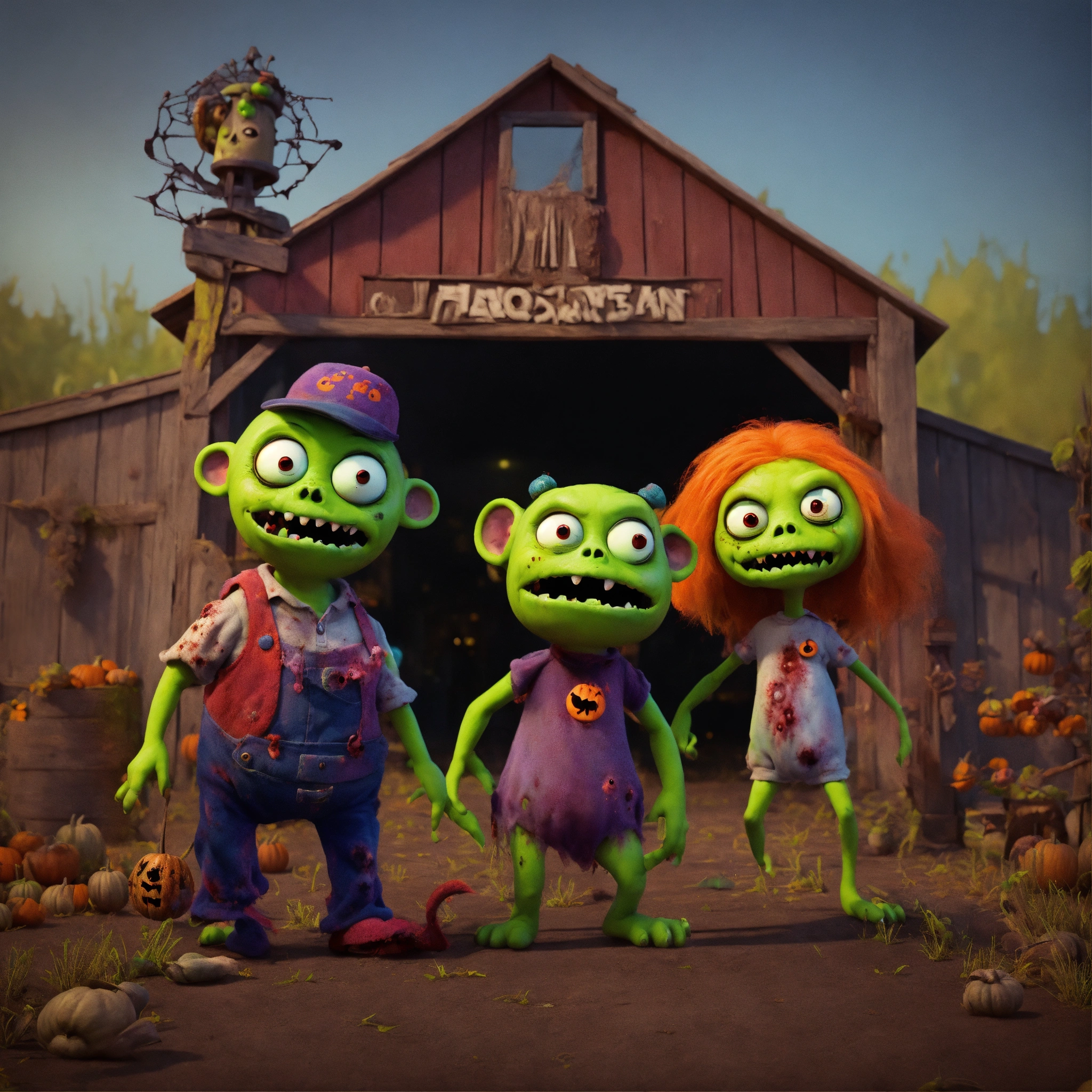 Group of cute friendly pixar-style monstersas zombies for halloween on a haunted farm, dark colors, animated feature film quality but with soft diffusion.