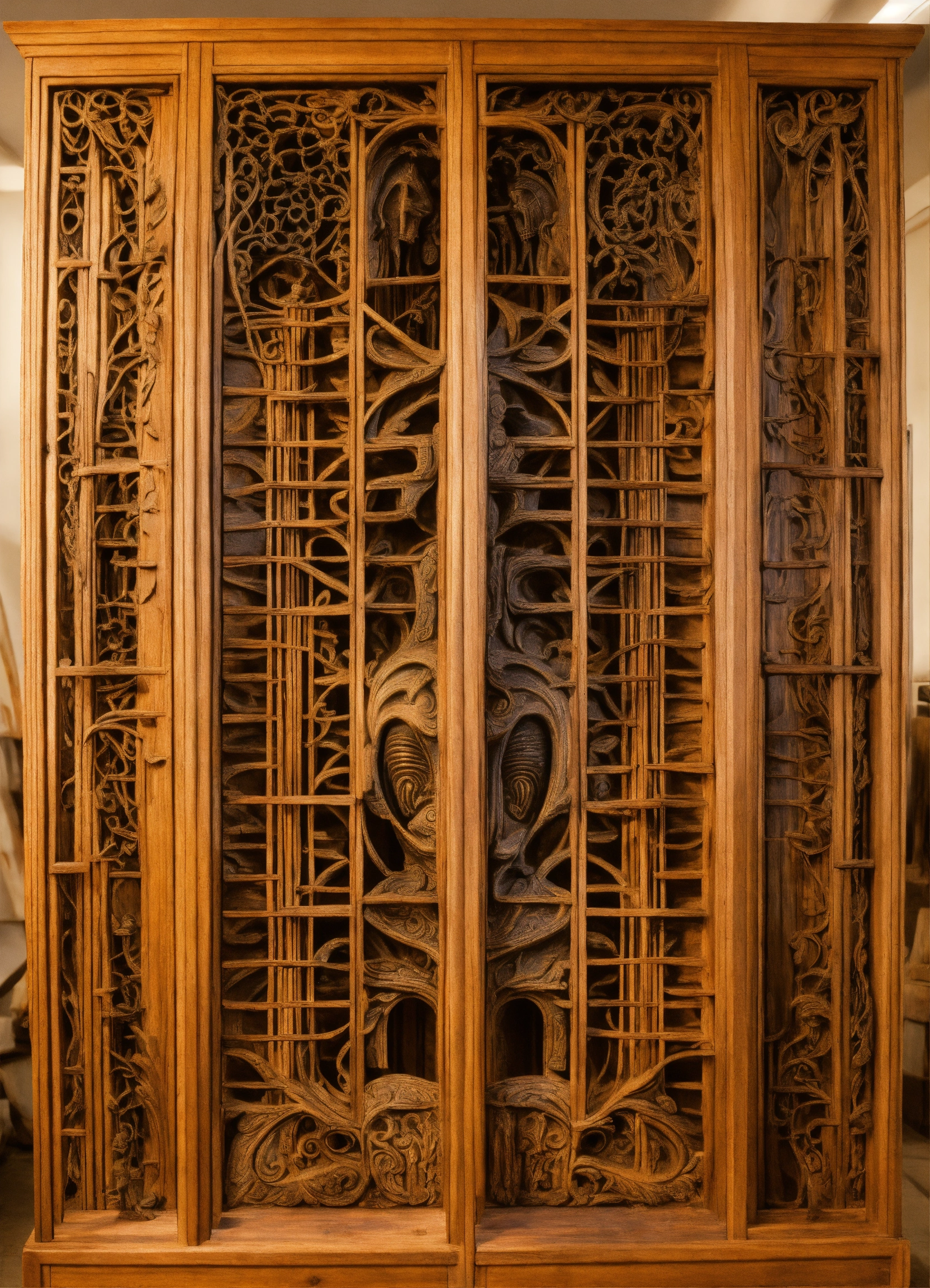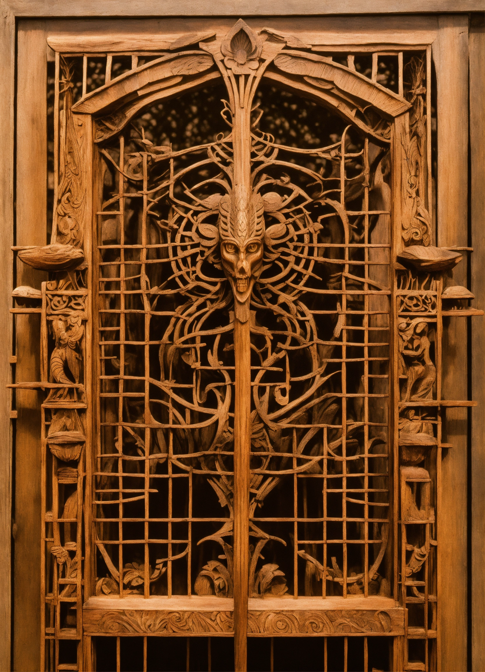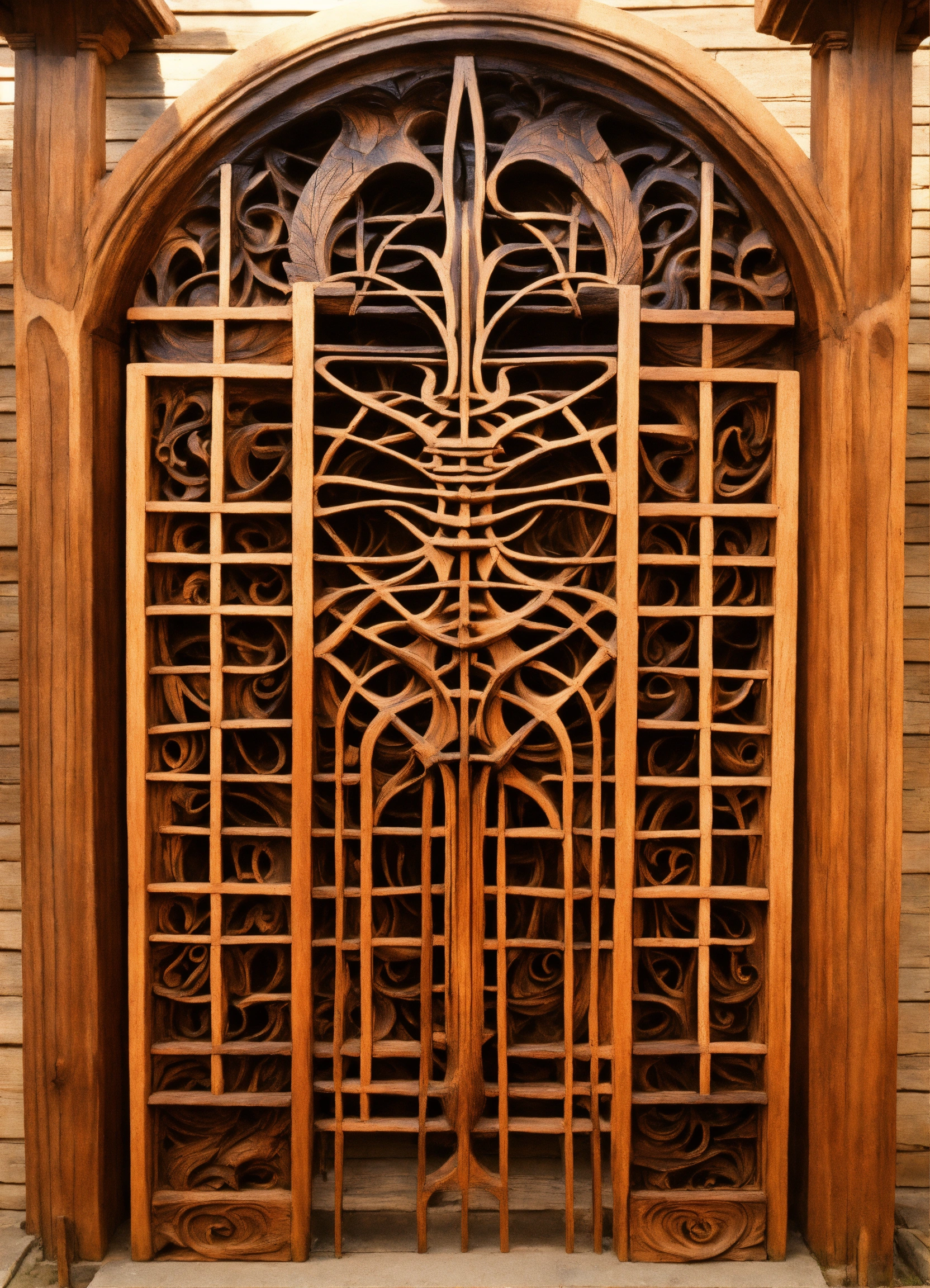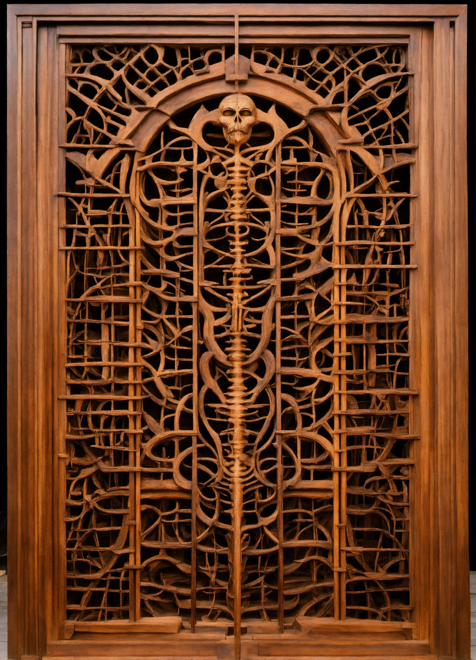 Ancient inspired wooden garden trellis style of alex grey/giger