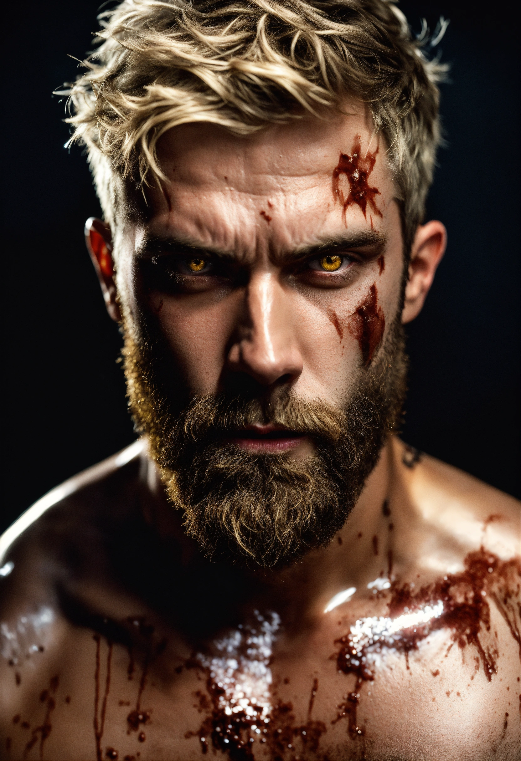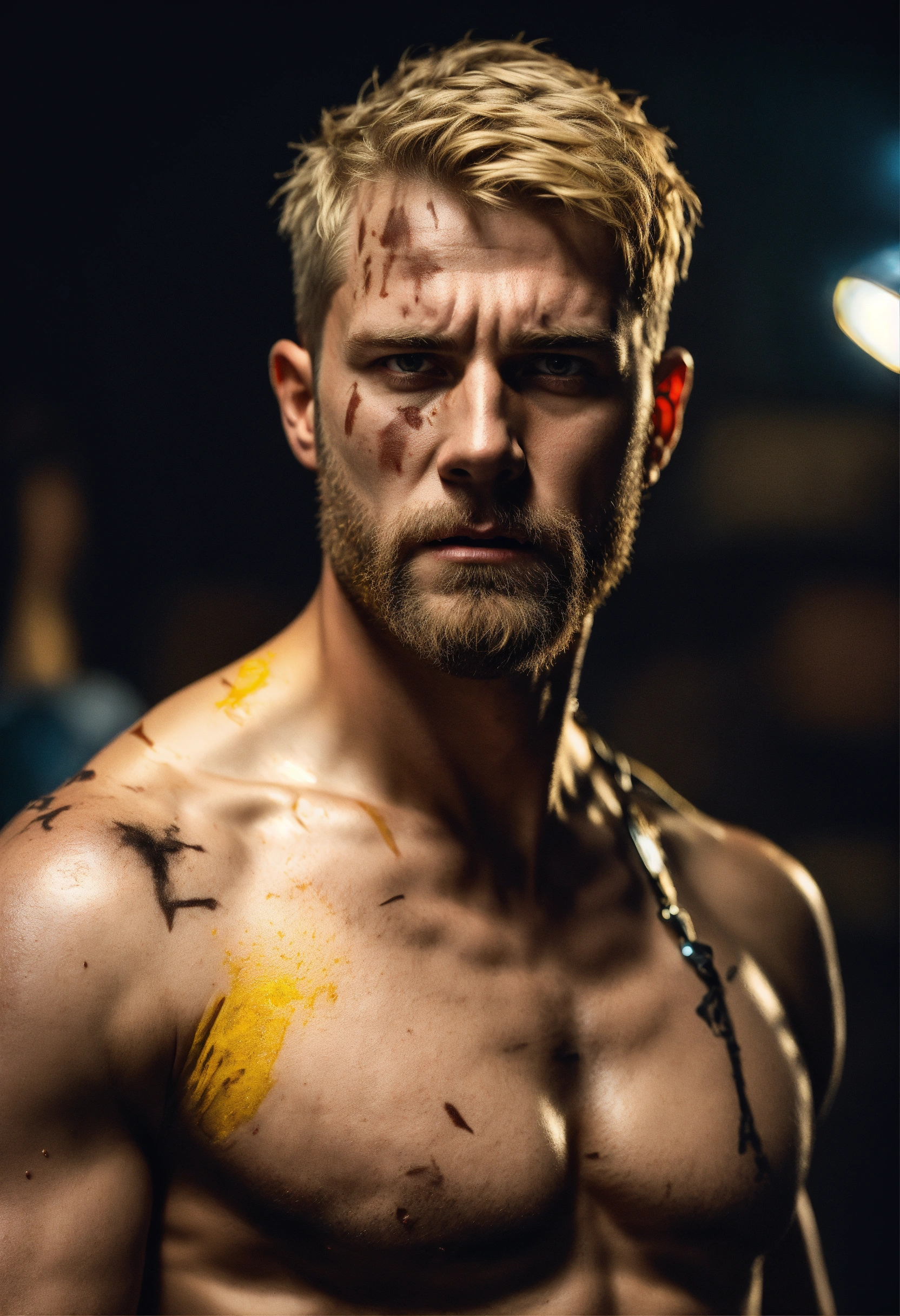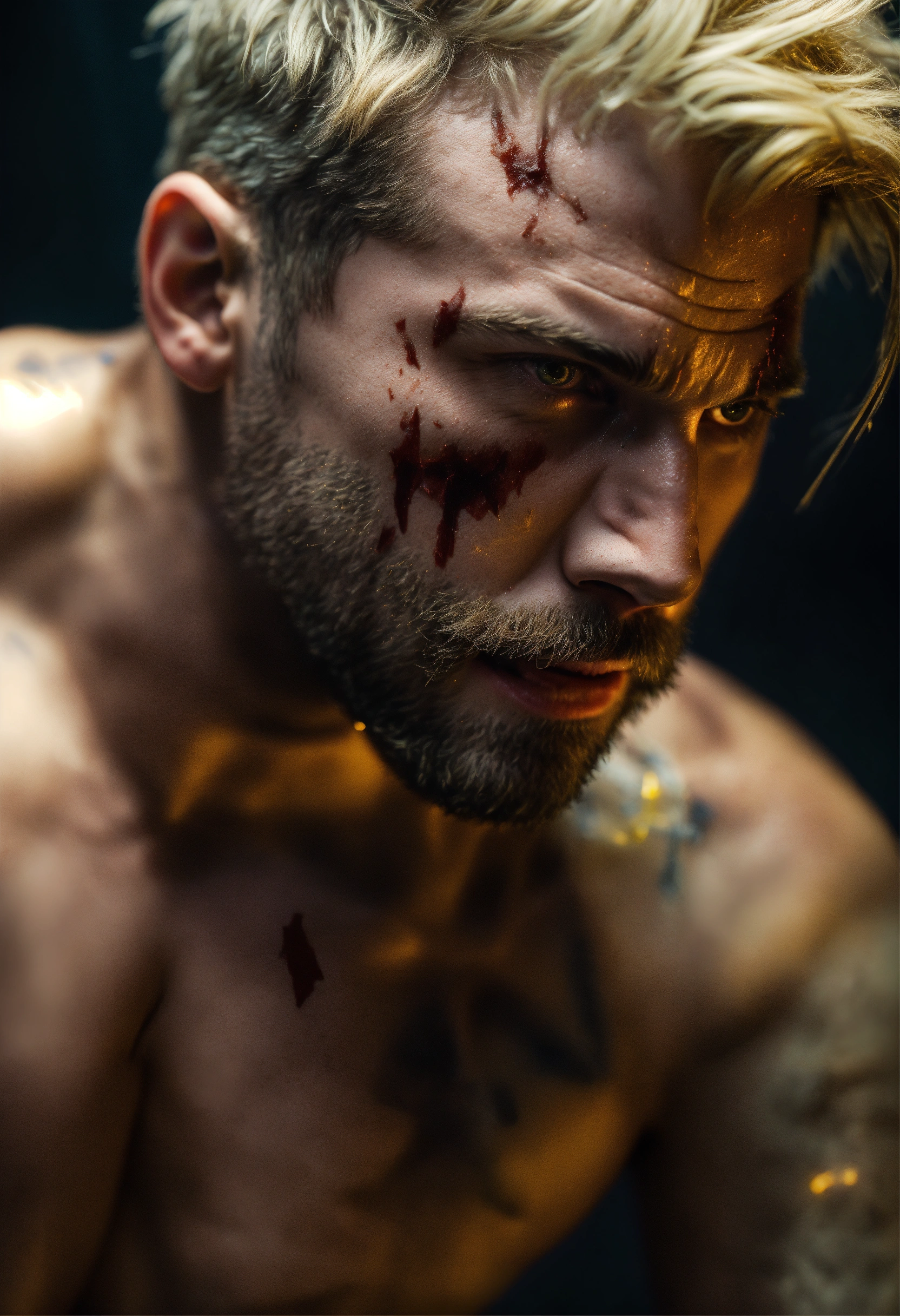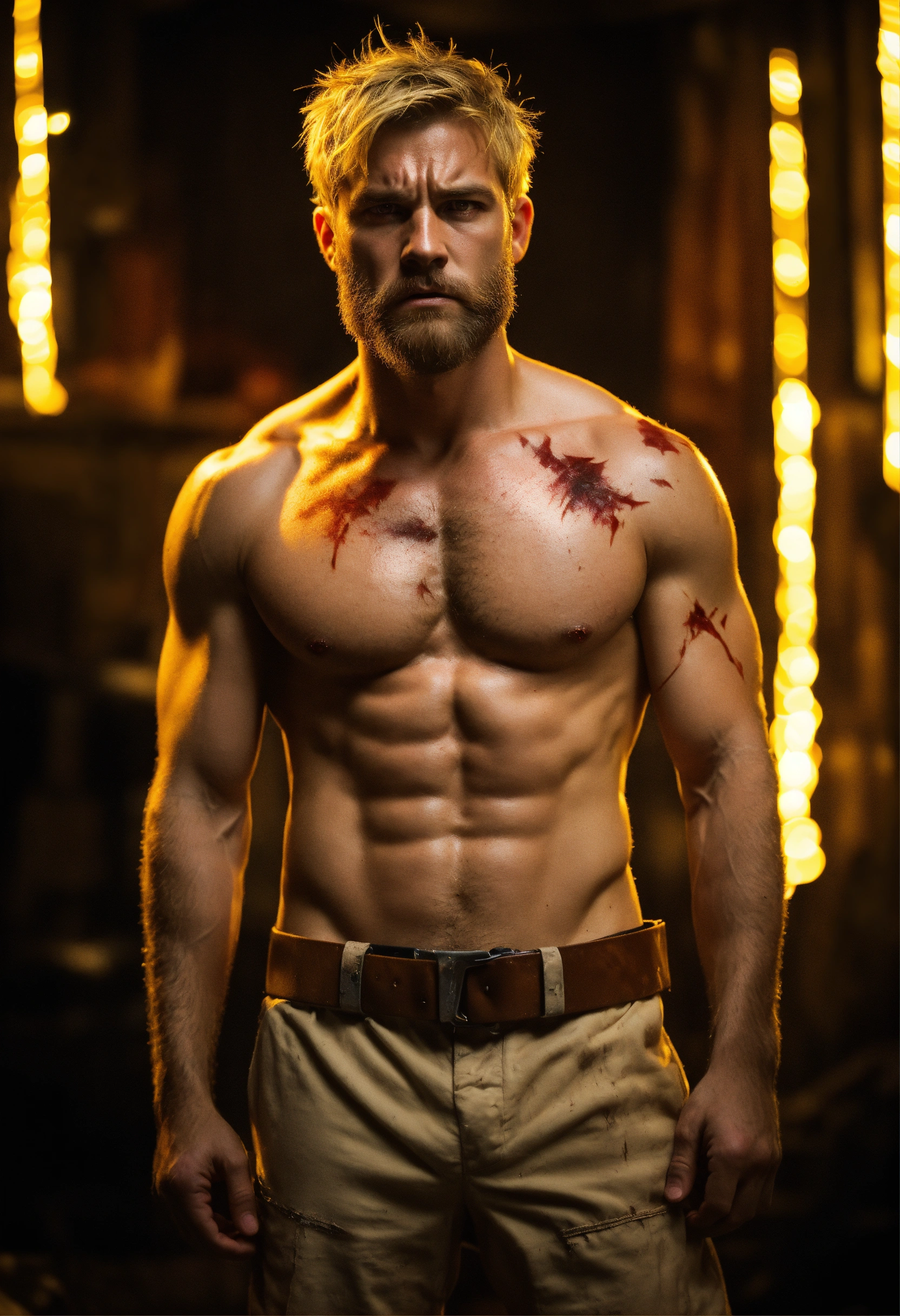 A highly detailed half body photo of a white 35-year-old man, blonde messy short hair, brown-yellow eyes, a little beard, with a lot of battle scars, shirtless, angry expression, strong body, with a dark background with leds, dramatic illumination, hyperdetailed, hyperrealistic, 8 k.