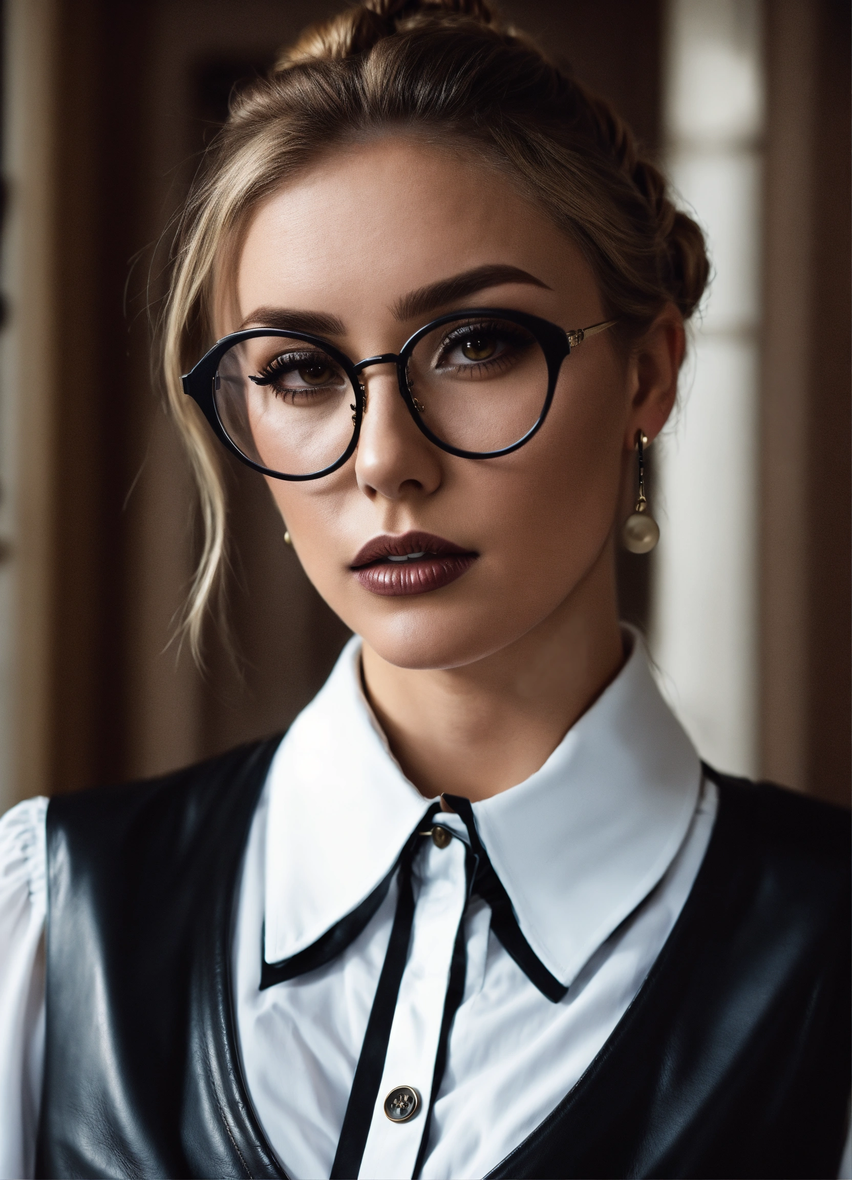 Stunning strict arrogant looking french seductress woman fashion model, blonde hair bun, glasses, strict governess black leather corset dress vest and big buttons, black leather pencil skirt, white office shirt with big closed shirt collar and long puff sleeves, eyeliner makeup, leather boots, mansion room