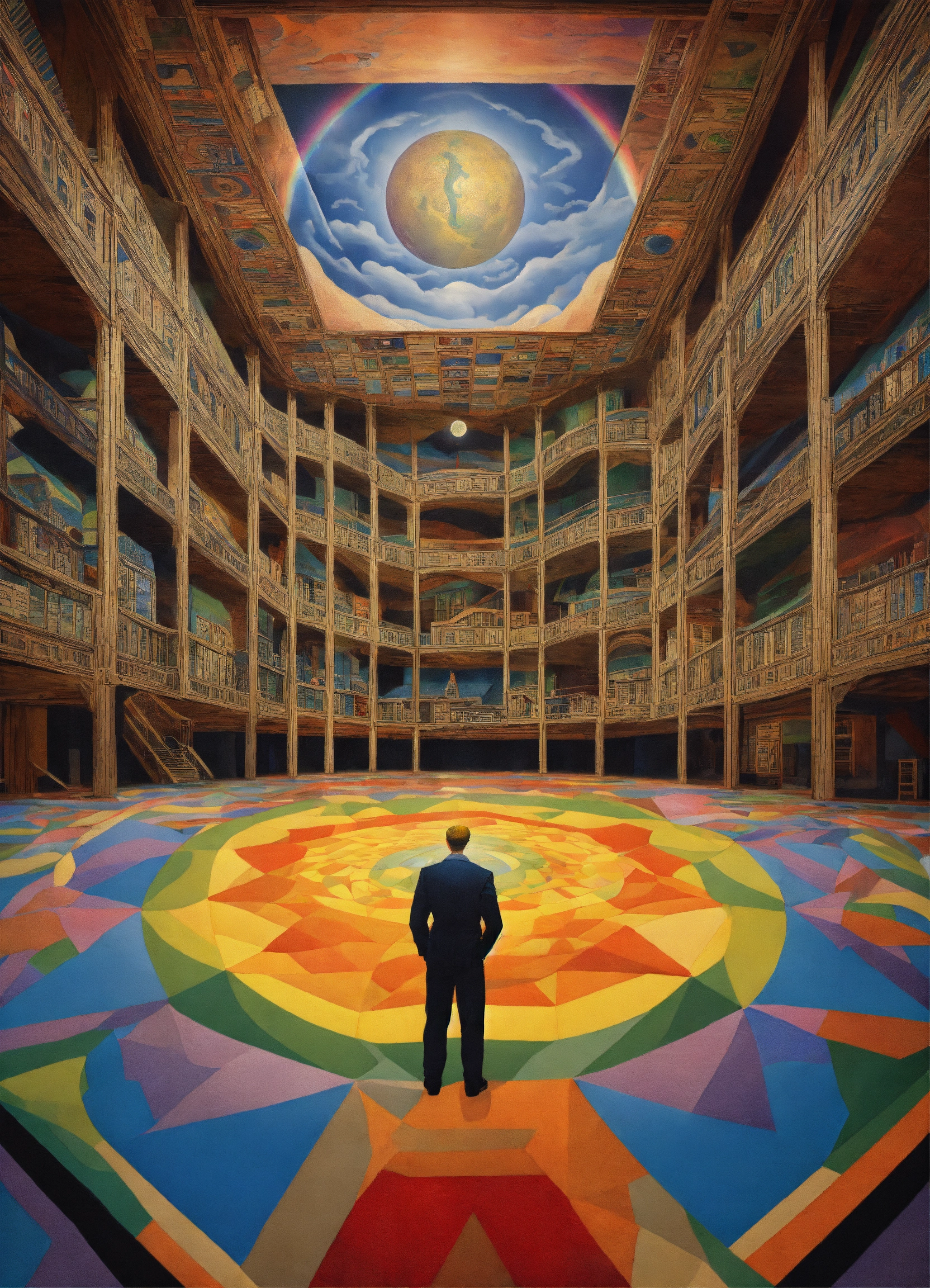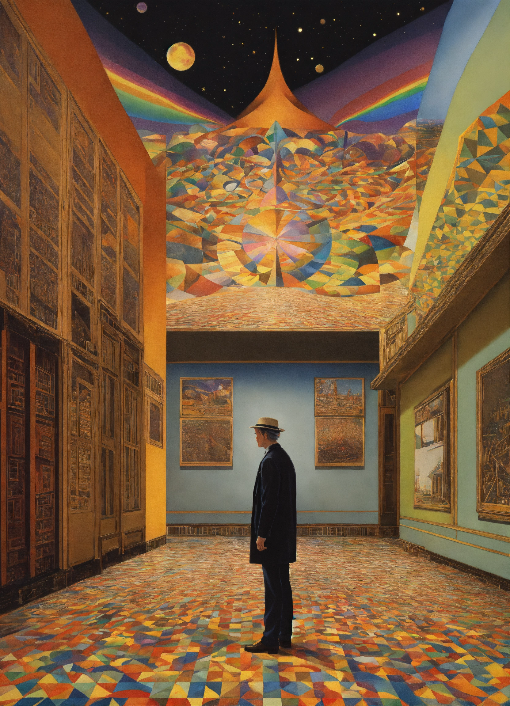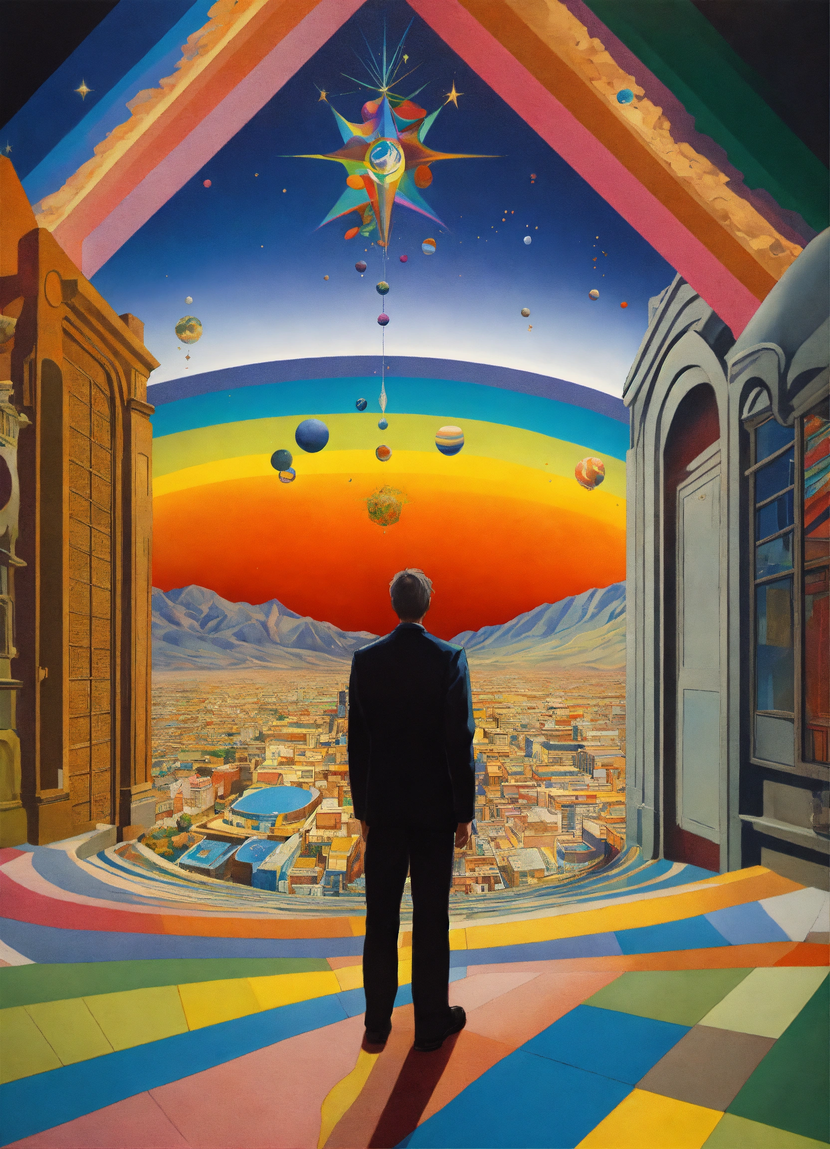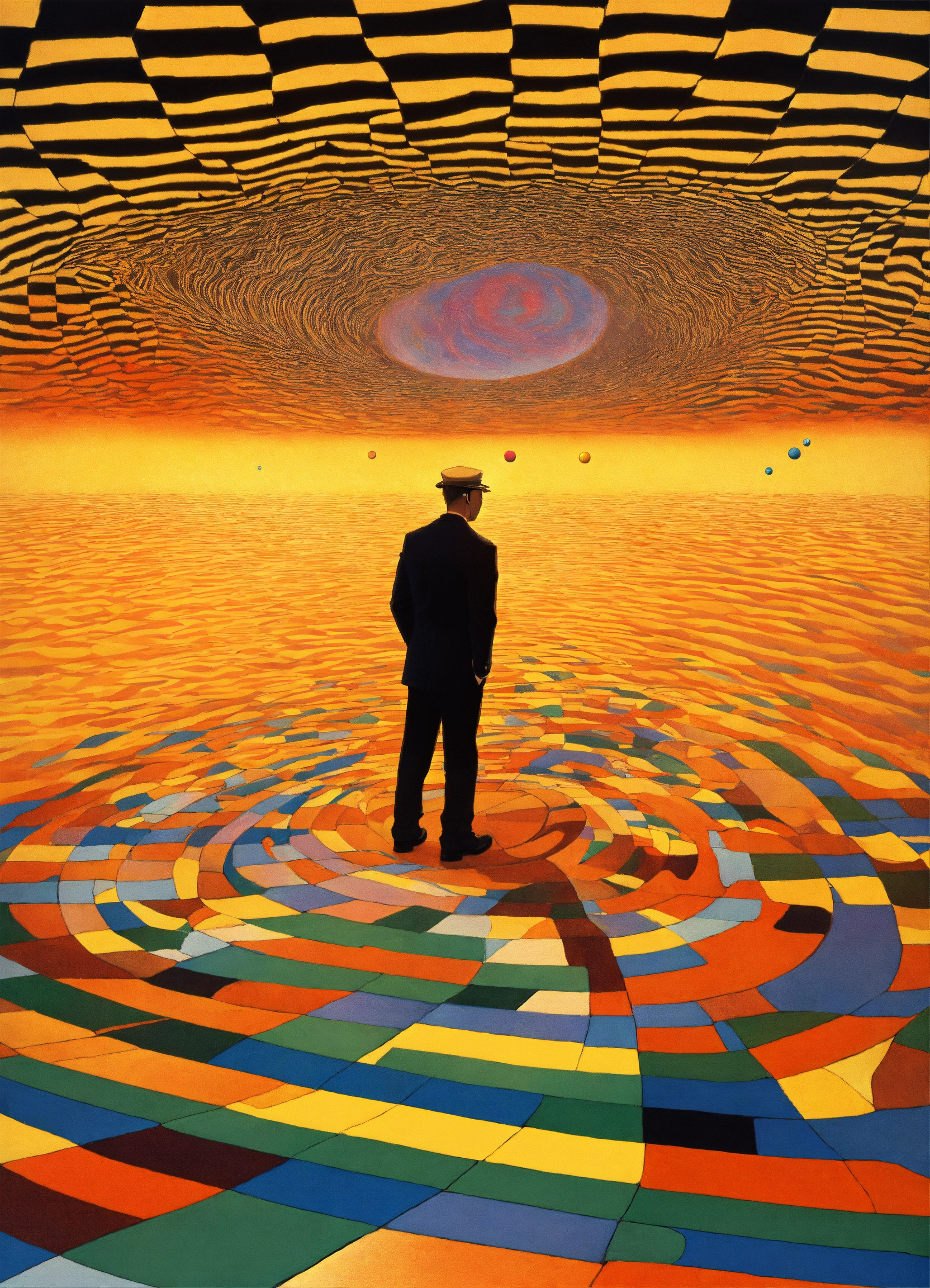 Man starring into space, earth merging into cosmos, rainbow psychedelic, the four corners of the world, black and. flooring by mc escher