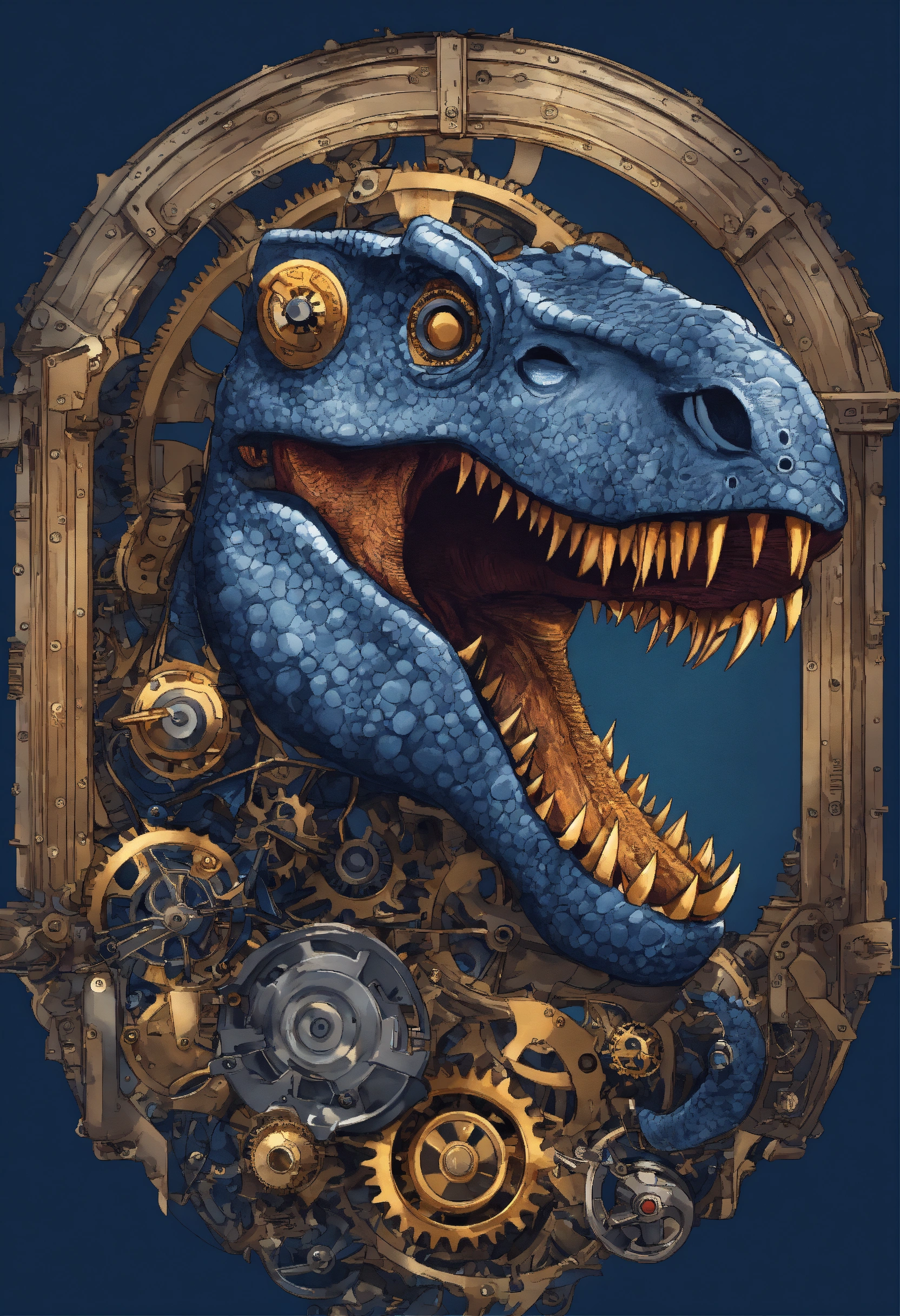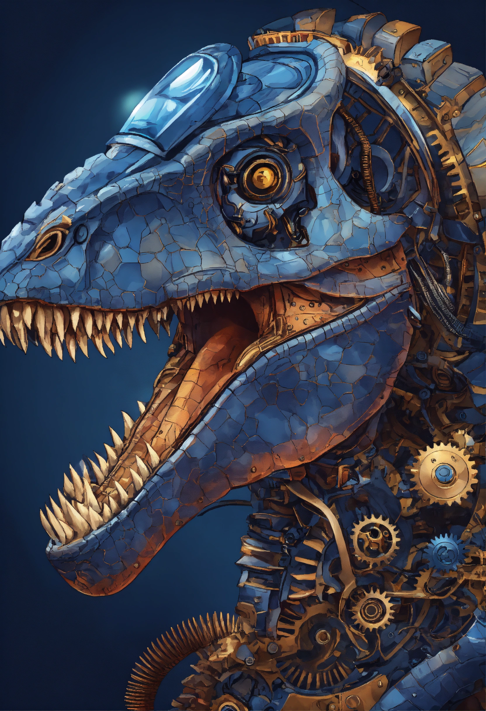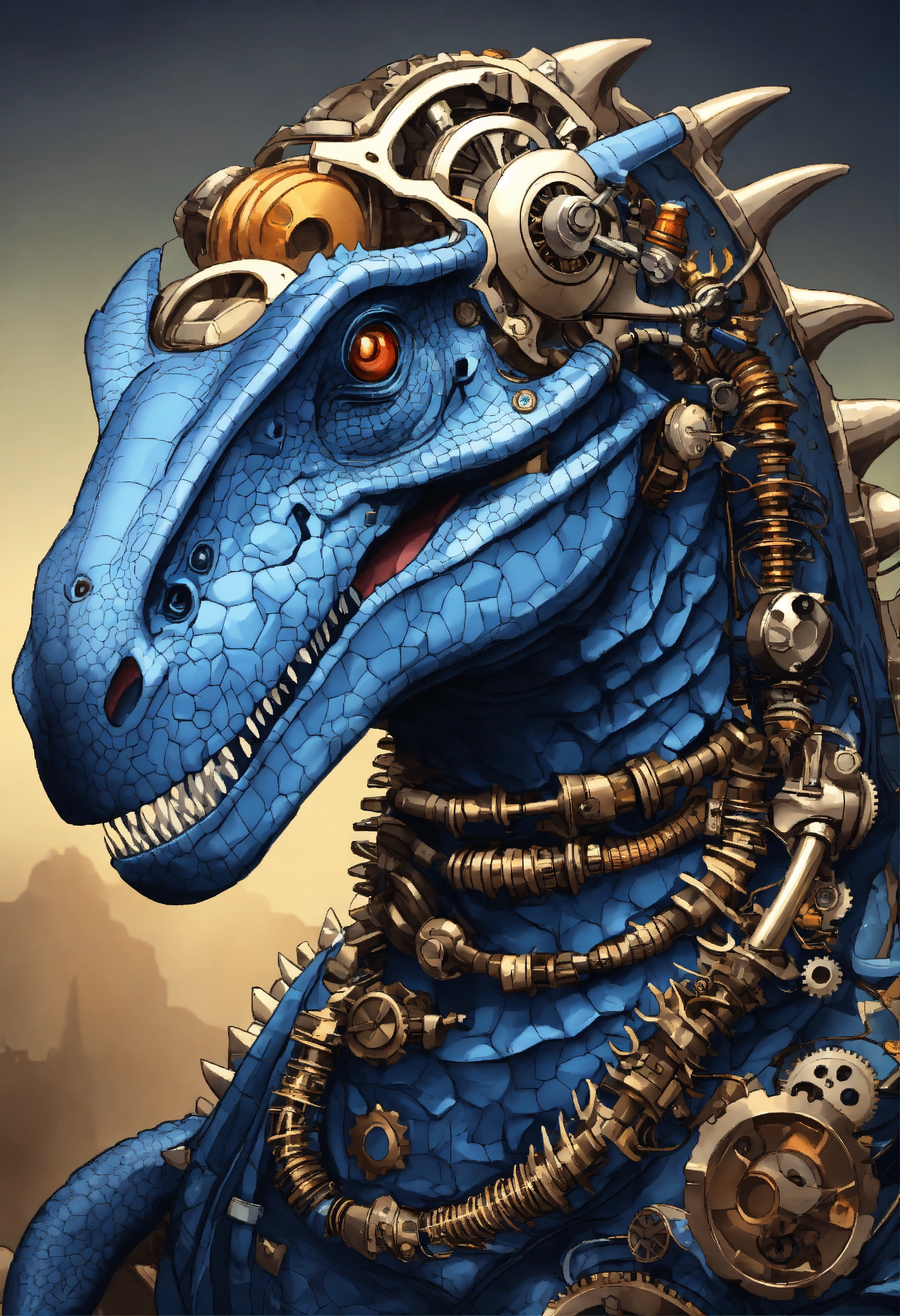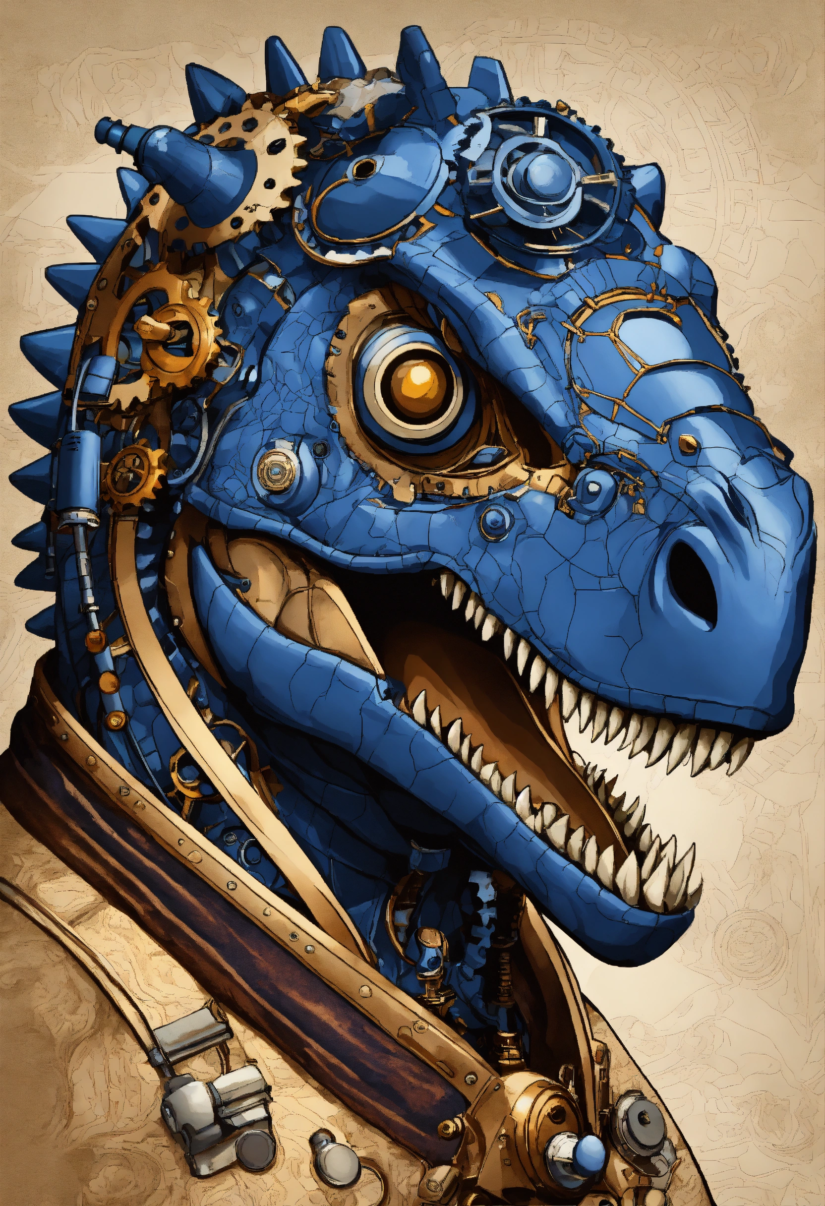 Portrait of a dinosaur, steampunk, indigo blue, colorful, illustration, highly detailed, simple, smooth, and clean vector, no jagged lines, vector art, smooth, made all with grey colored gears inspired by future technology