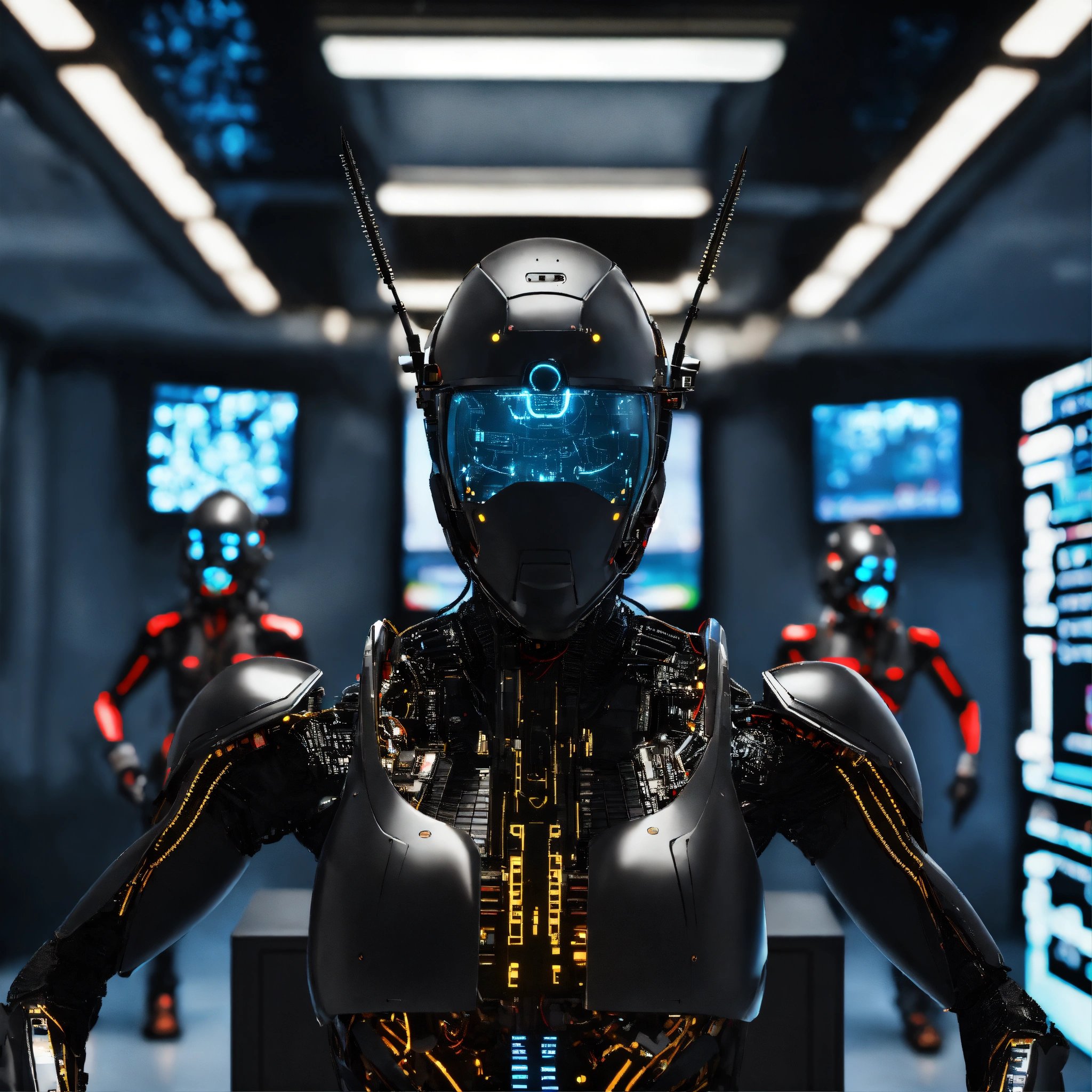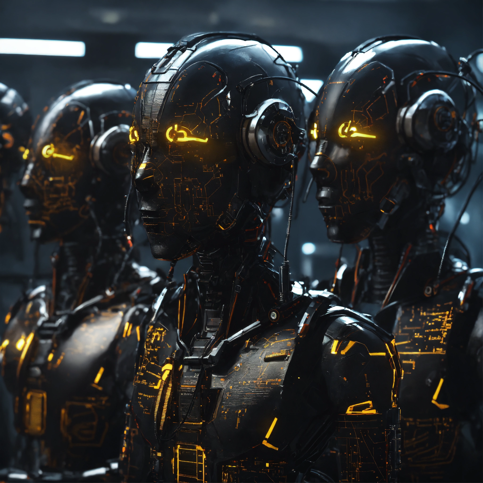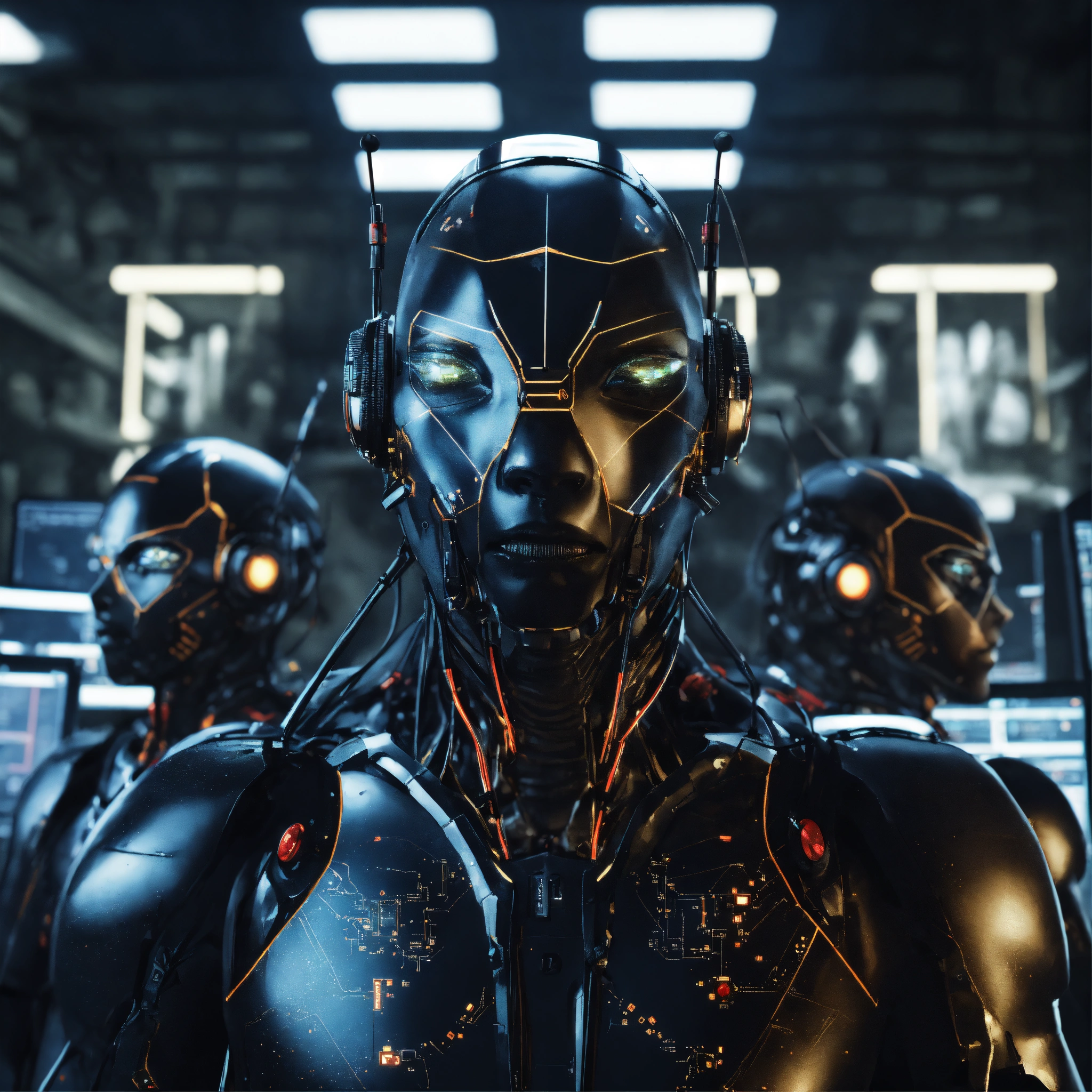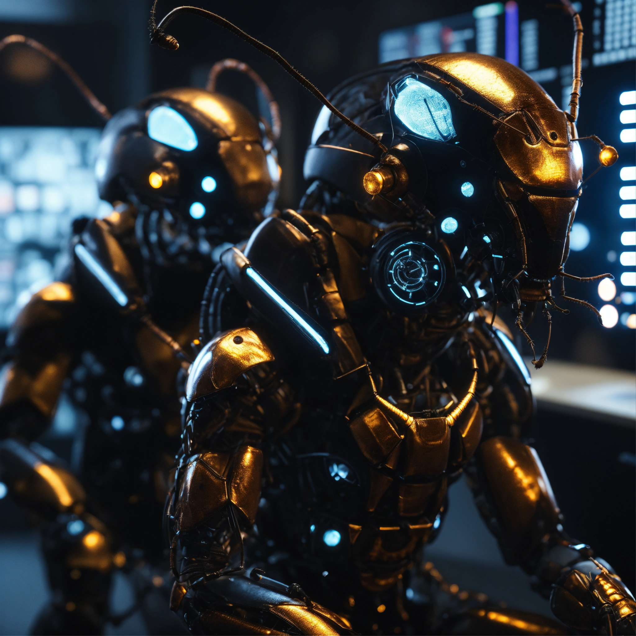 Group of 3 black cockroach faced humanoids with detailed circuit markings, morphing into a human face, in a hi tech control room, realistic, 8k, unreal engine