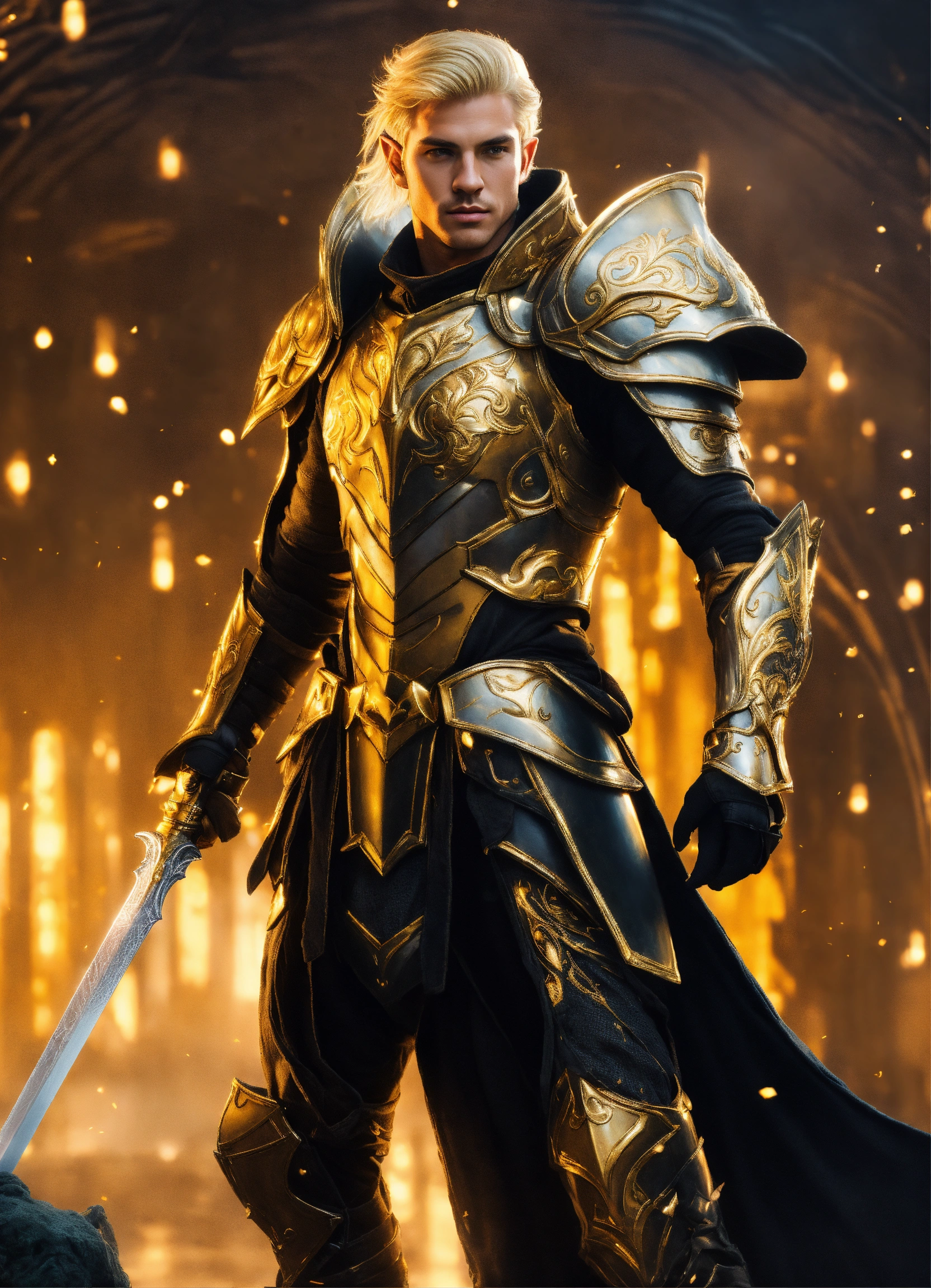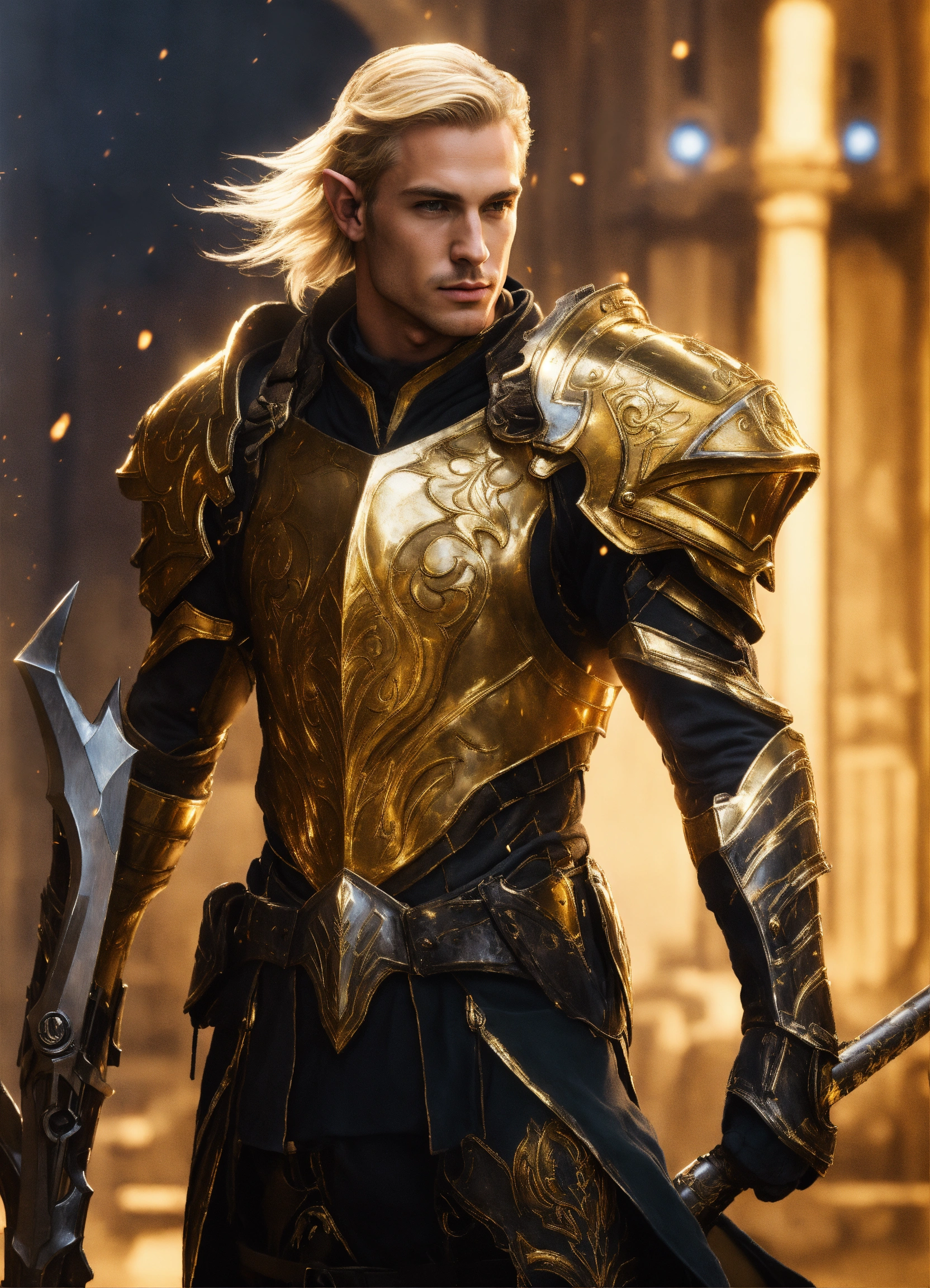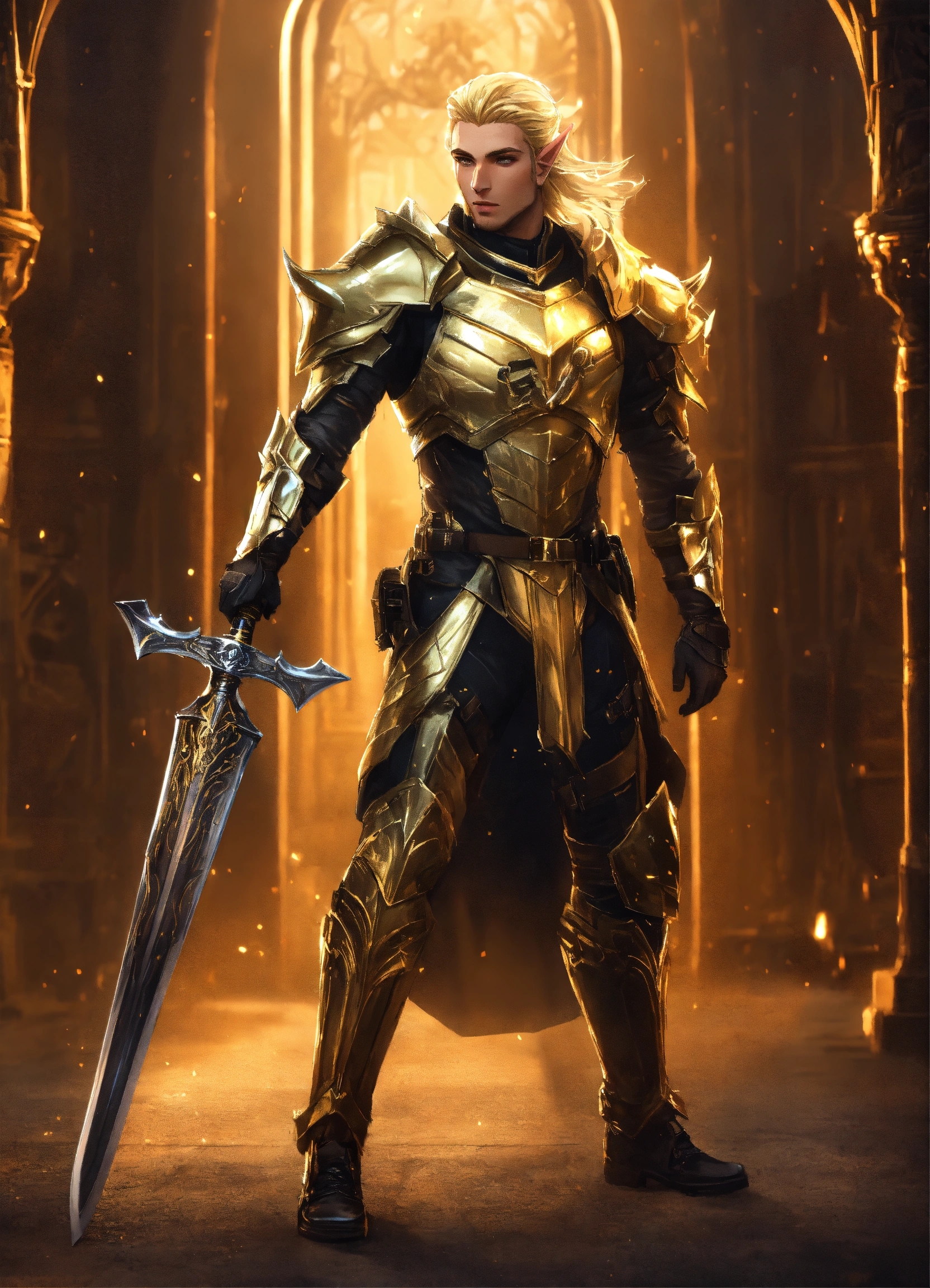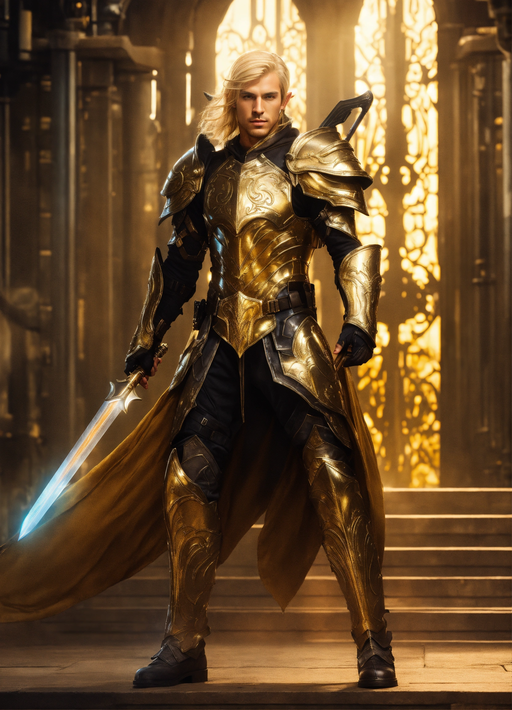 Full body of a handsome male high elf, blonde hair, muscular, sci fi soldier wearing heavy sci fi elven armor, black and gold armor and helmet, visor, boots, male, holding a sword, full body, hd