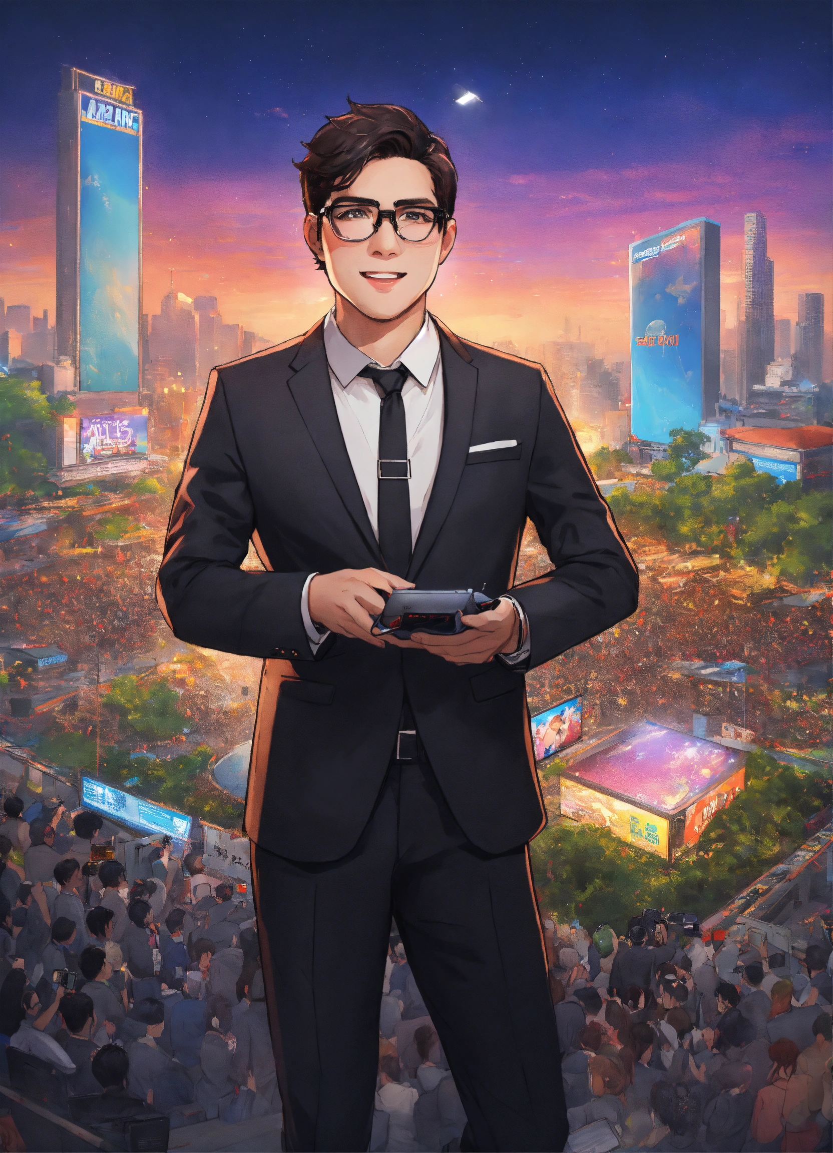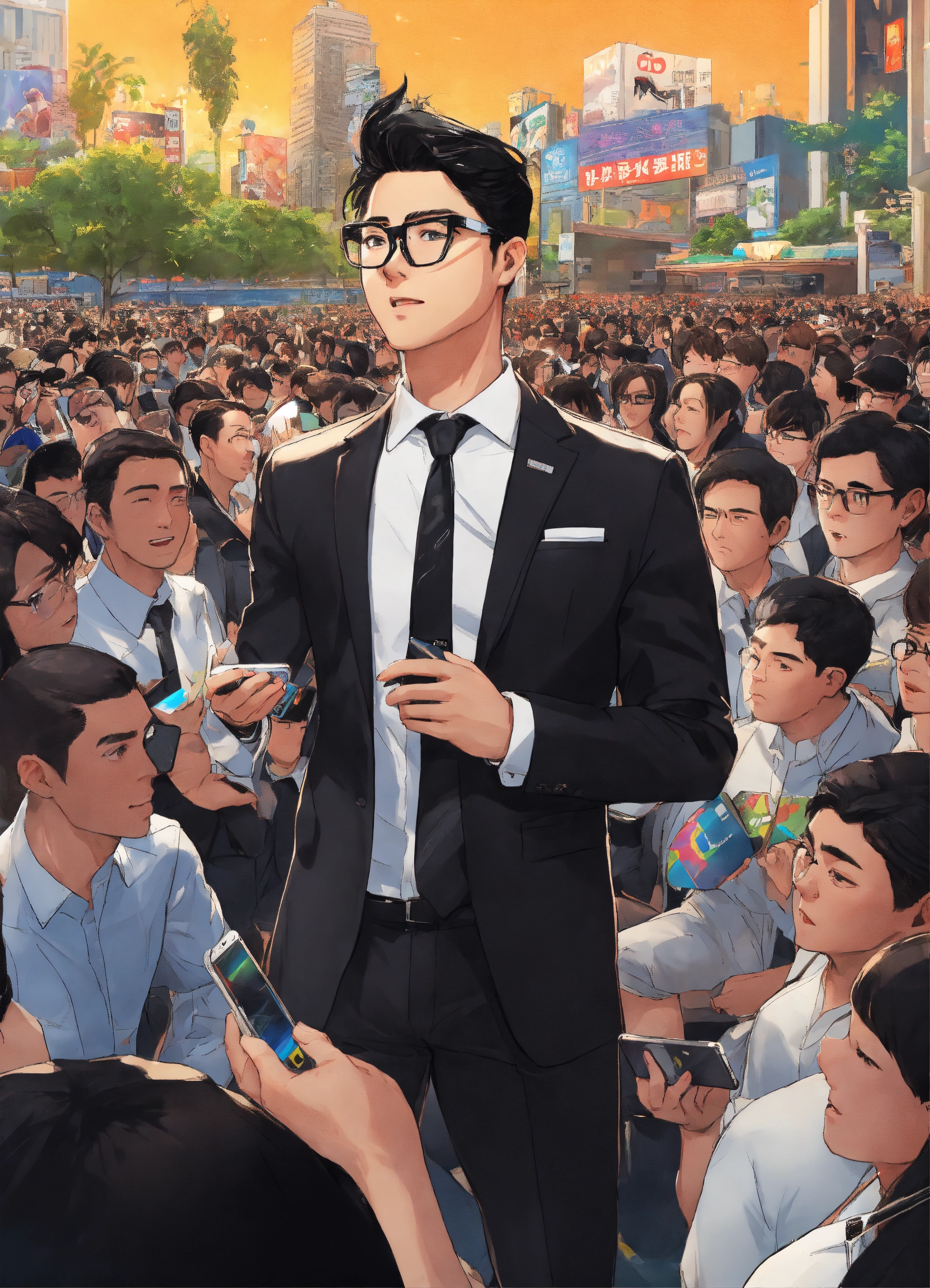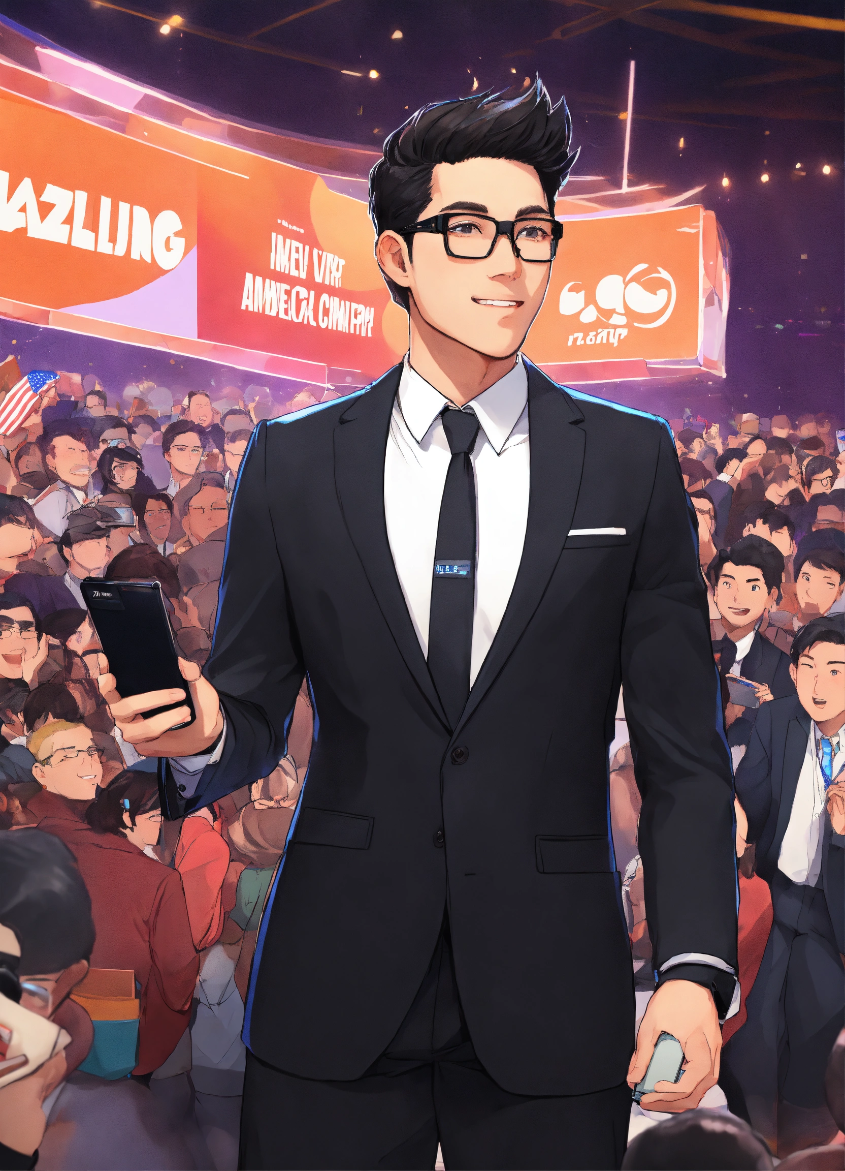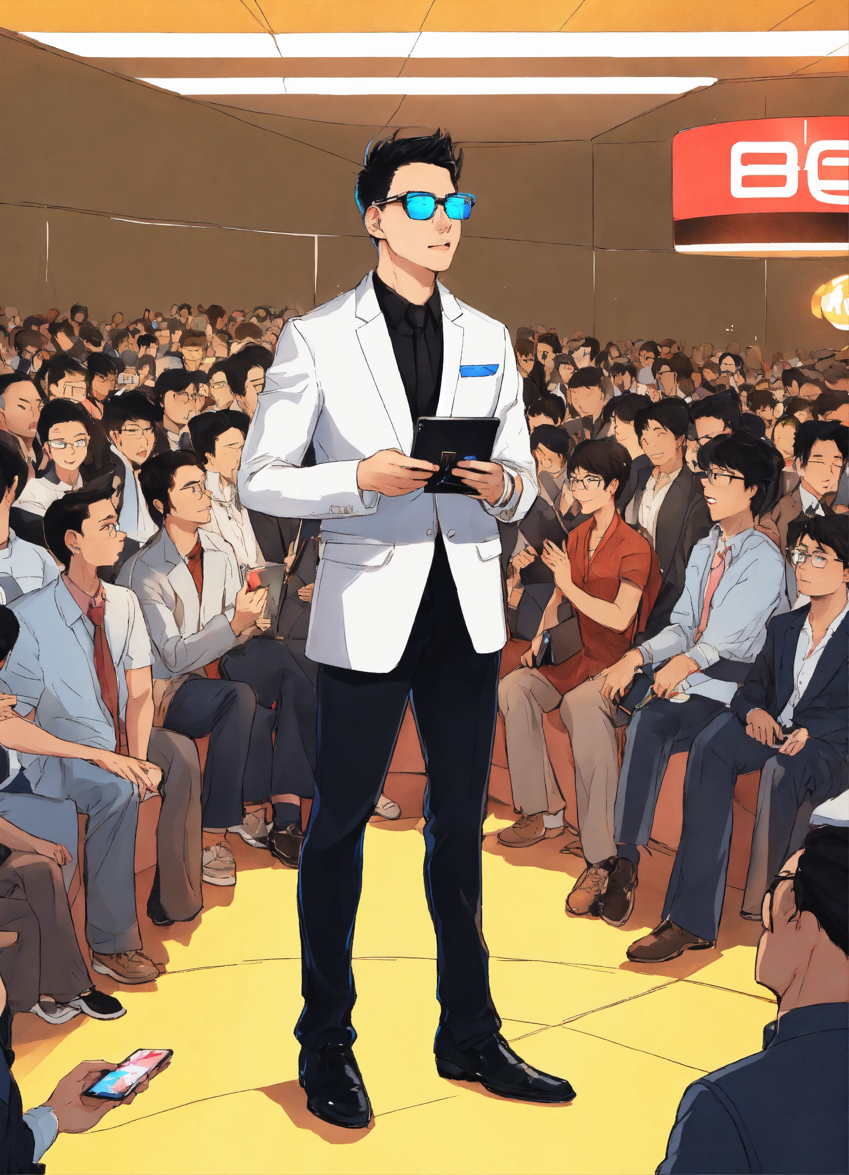 Wearing black suit white shirt black thai with smart glasses, comic trip character 30 years old american white male on a big stage reveiling his newfound technology, a small chip. he's holding it in his hand showing the news station and a diverse crowd what his company has just created.