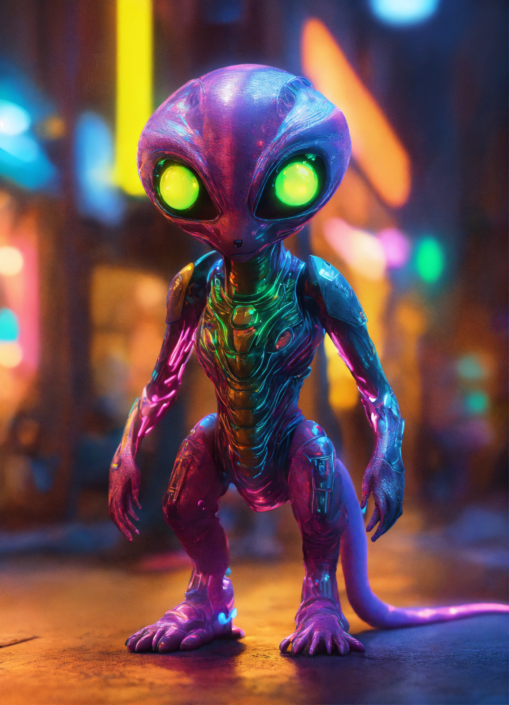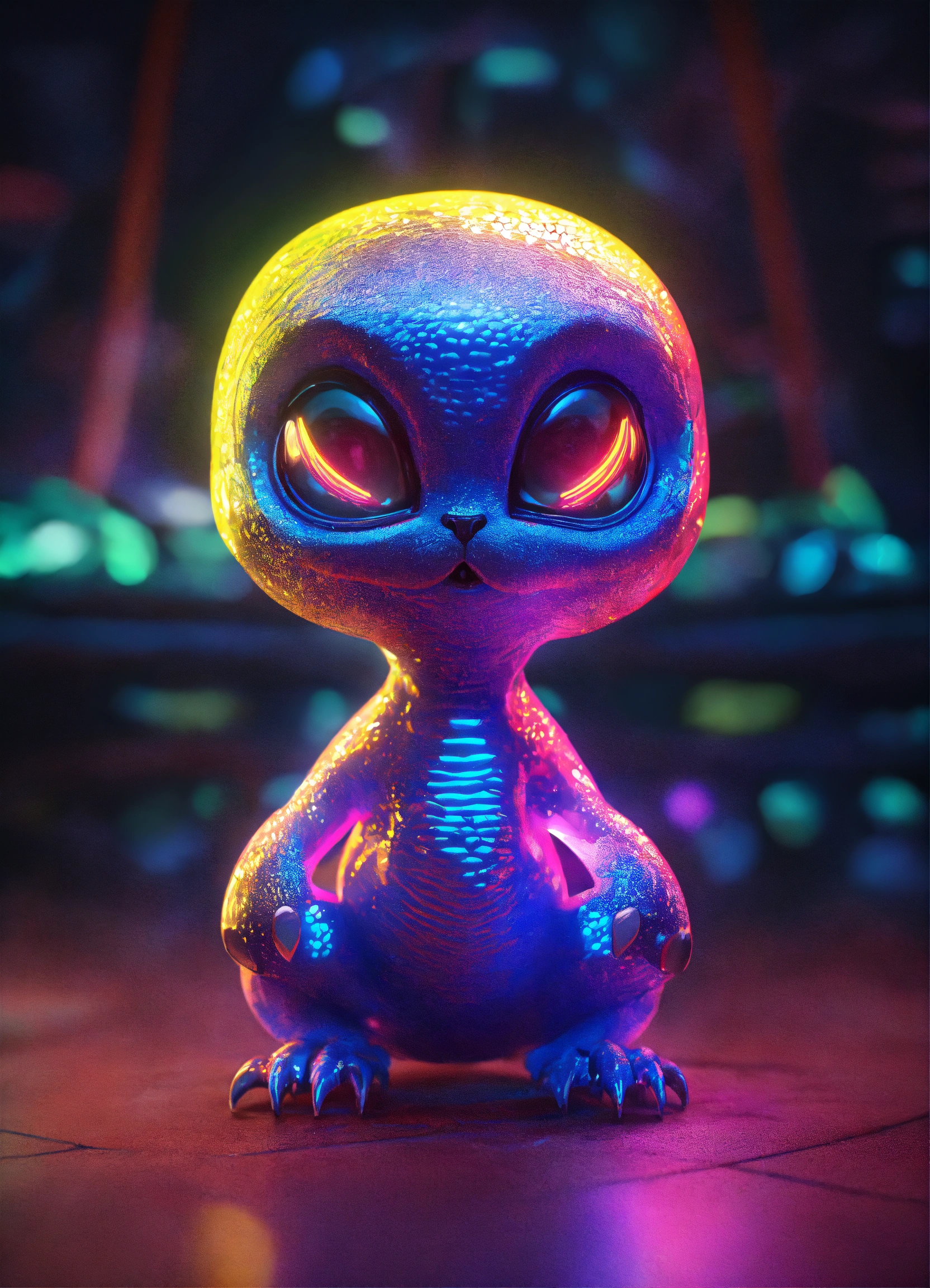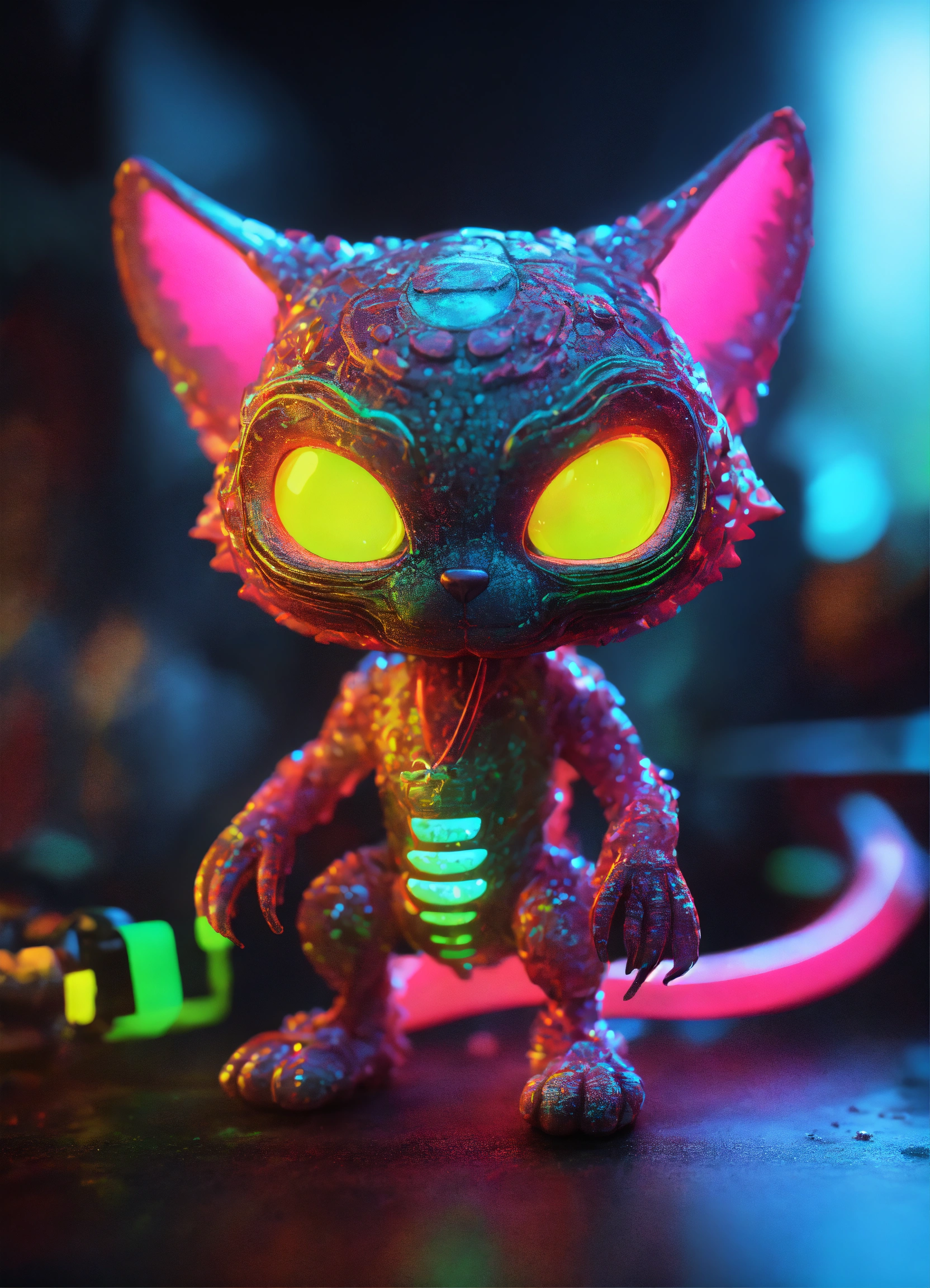 Gelly cute adorable alien monster, full-body, neon glow colours, highly intricate details, 3d, cgi, realistic light, trending on cgsociety, glowing eyes, facing camera, neon details, ultra realistic details, portrait, sci fi atmosphere, global illumination, shadows, octane render, 8 k, ultra sharp, cat attributes, friendly, glass like, creature