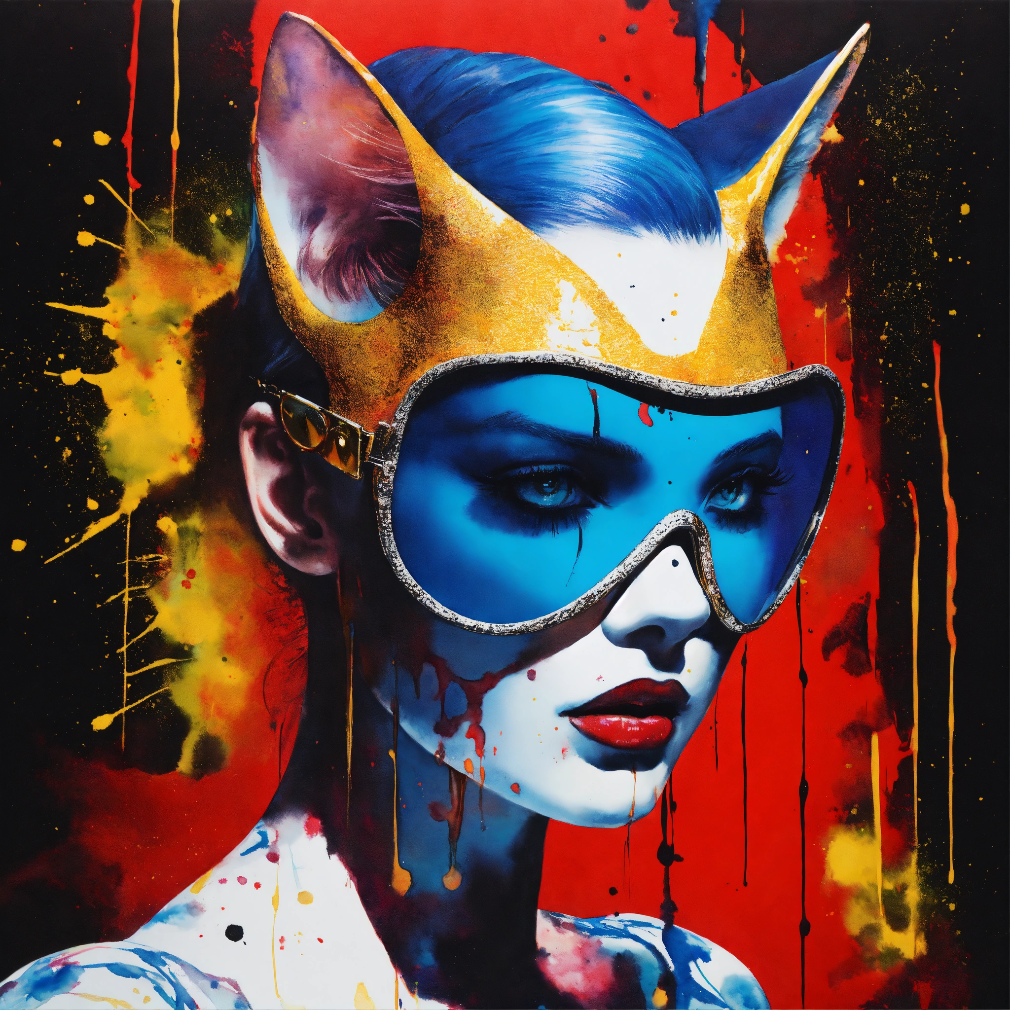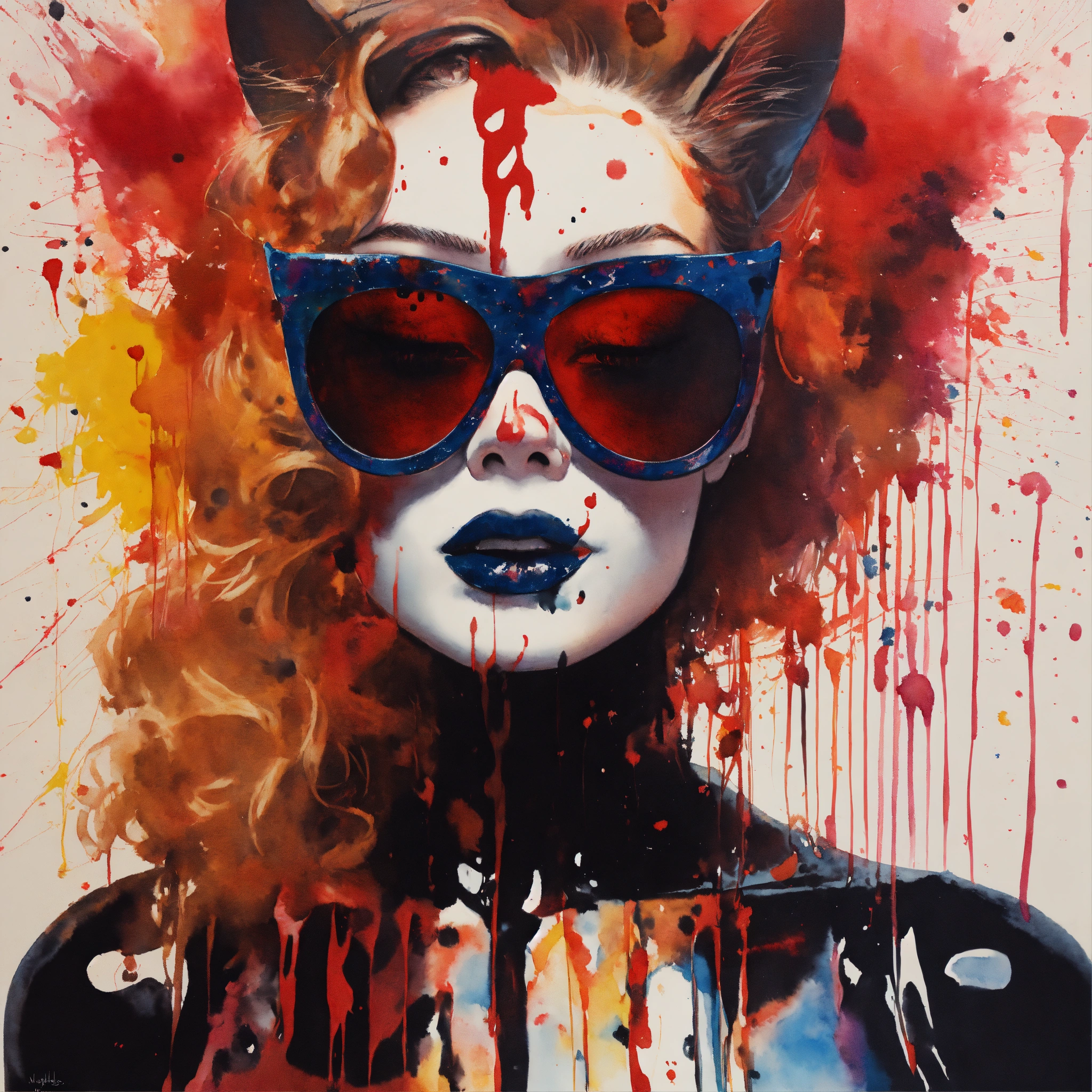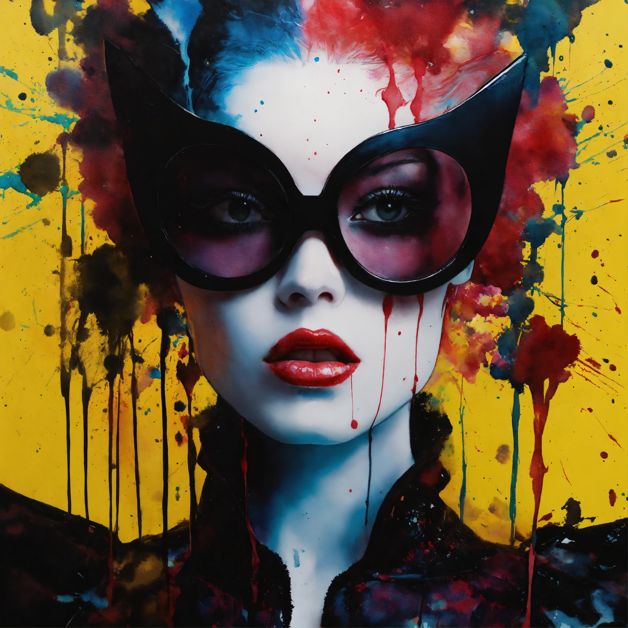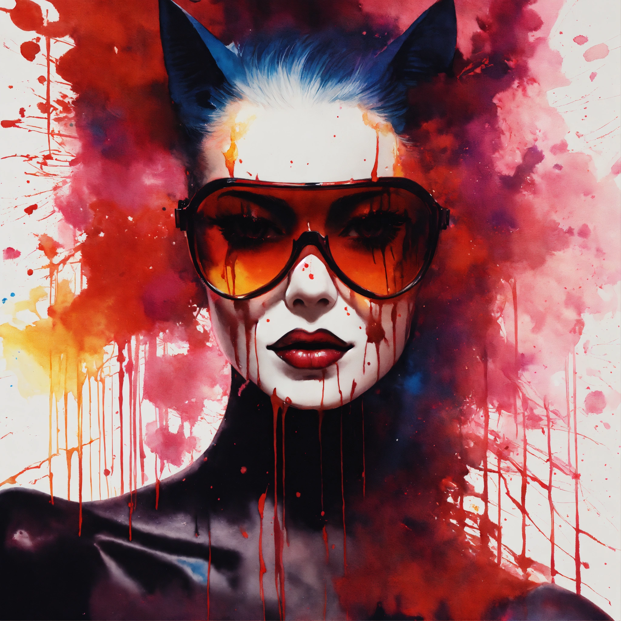 Bright watercolor brush strokes front portrait photography, a woman's face in an euro american cat woman mask with sunglasses, emerges from black ink splatters, an attractive plexiglass body, 80 degree view, art by sergio lopez, natalie shau, james jean and salvador dali