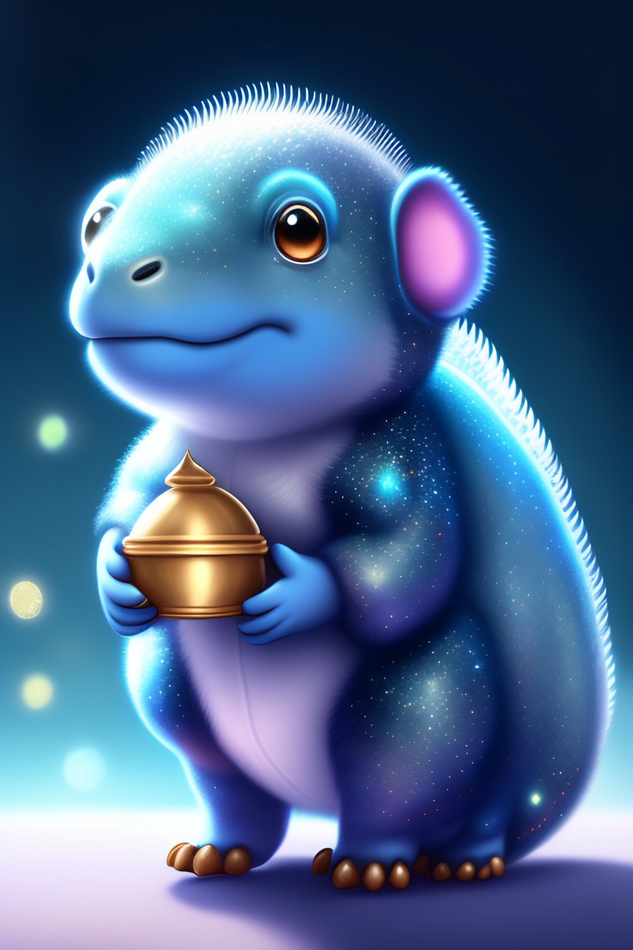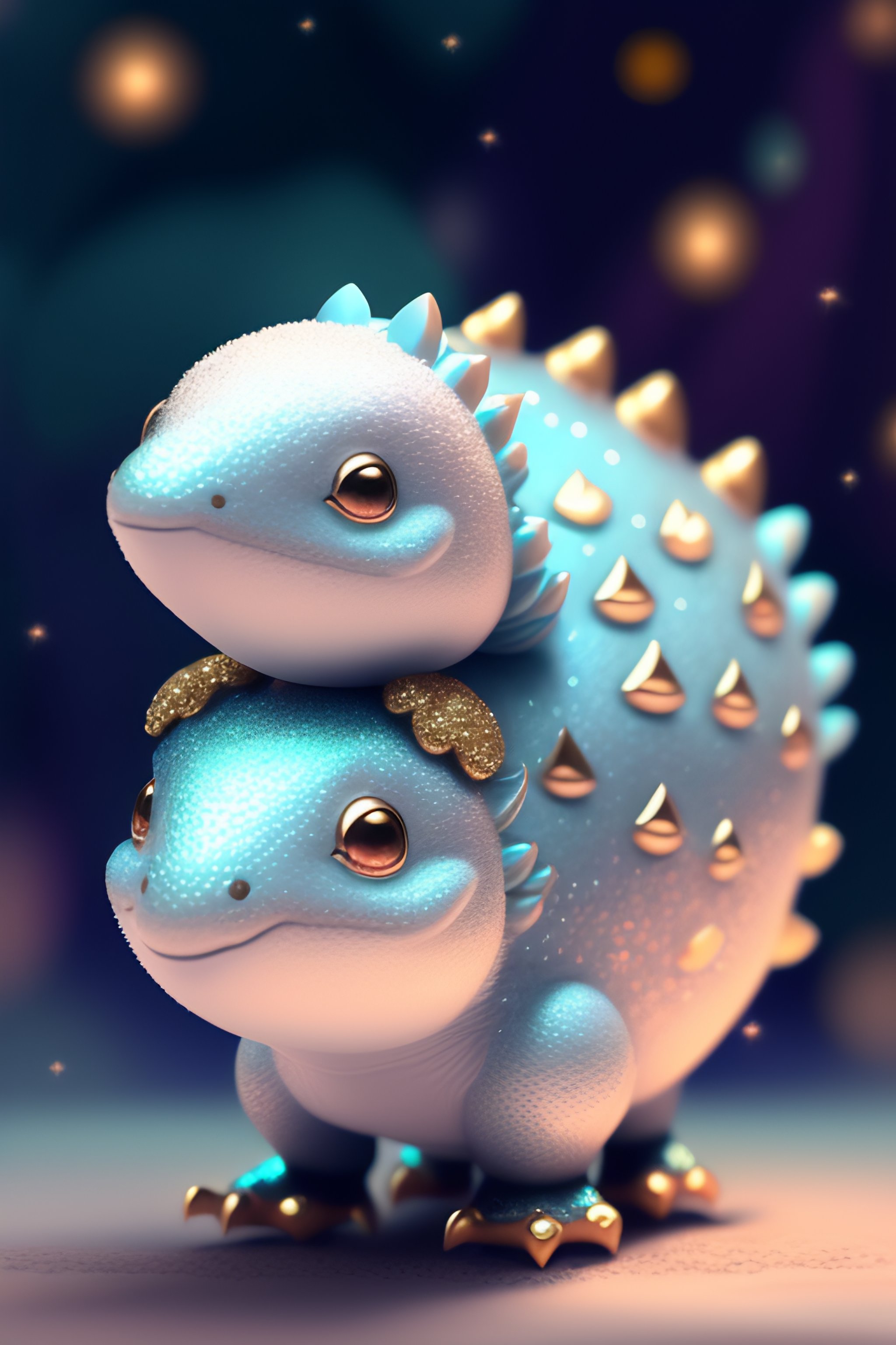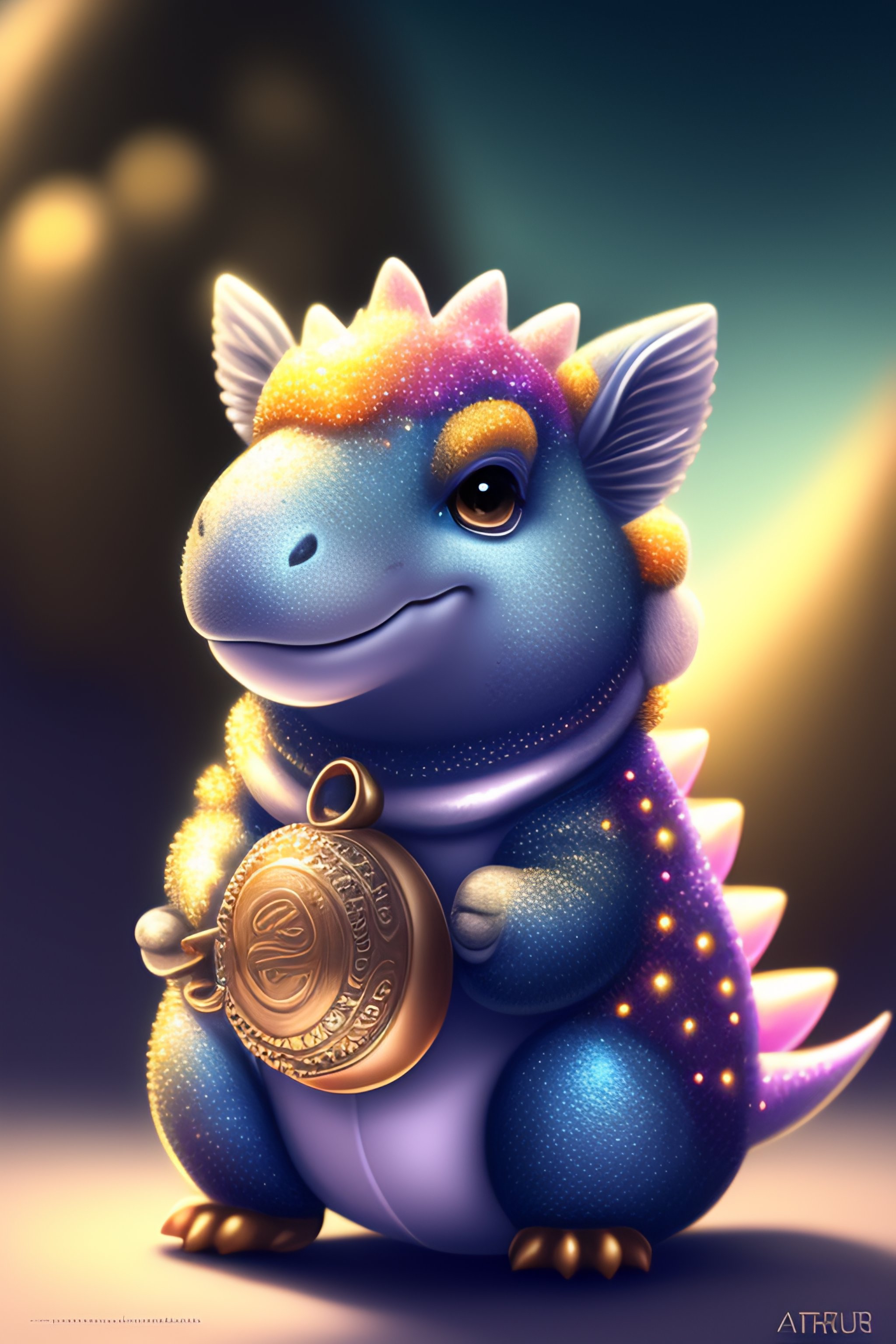 Cute and adorable cartoon fluffy dinosaur, silver, glitter, treasure, dreamlike, surrealism, super cute, trending on artstation