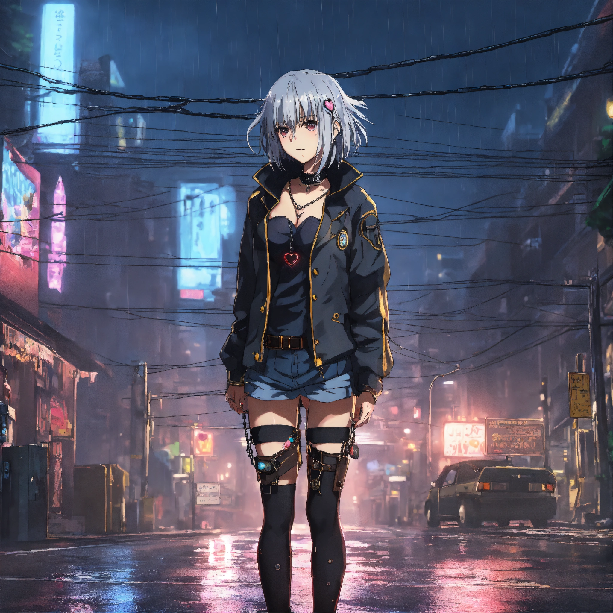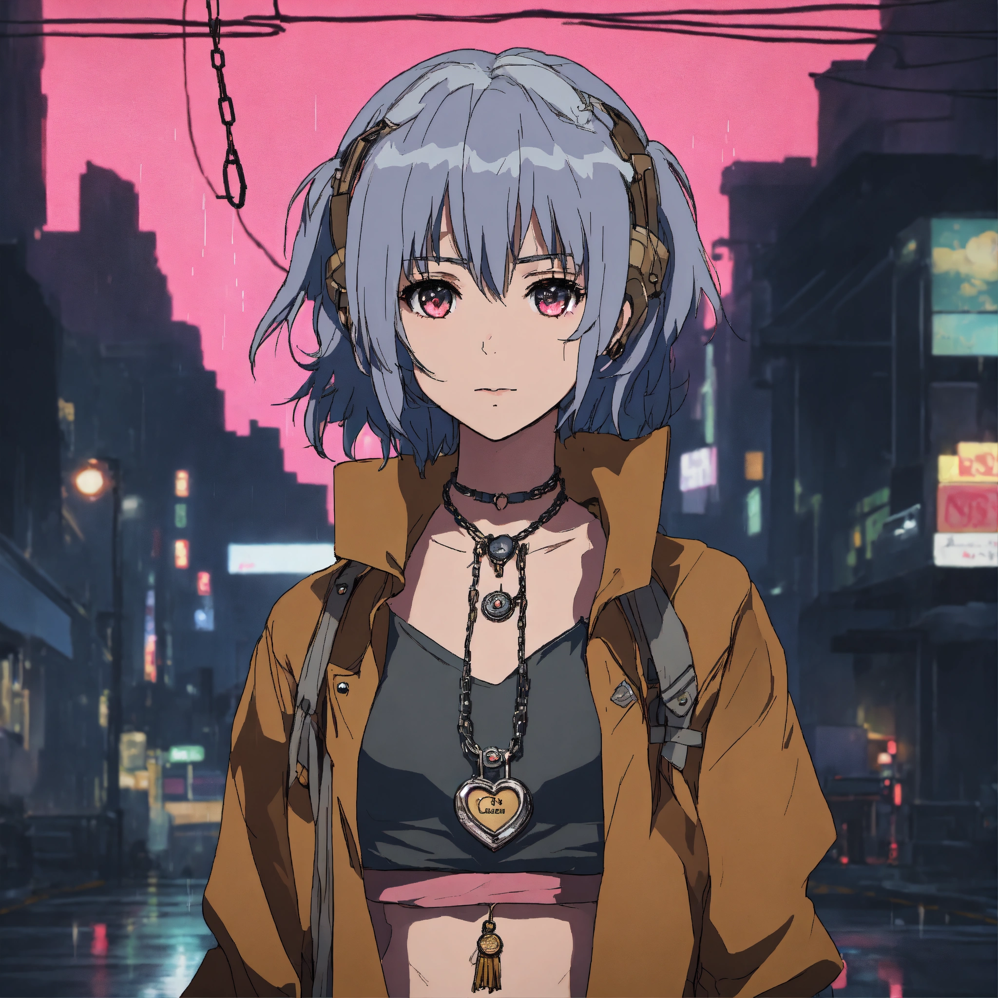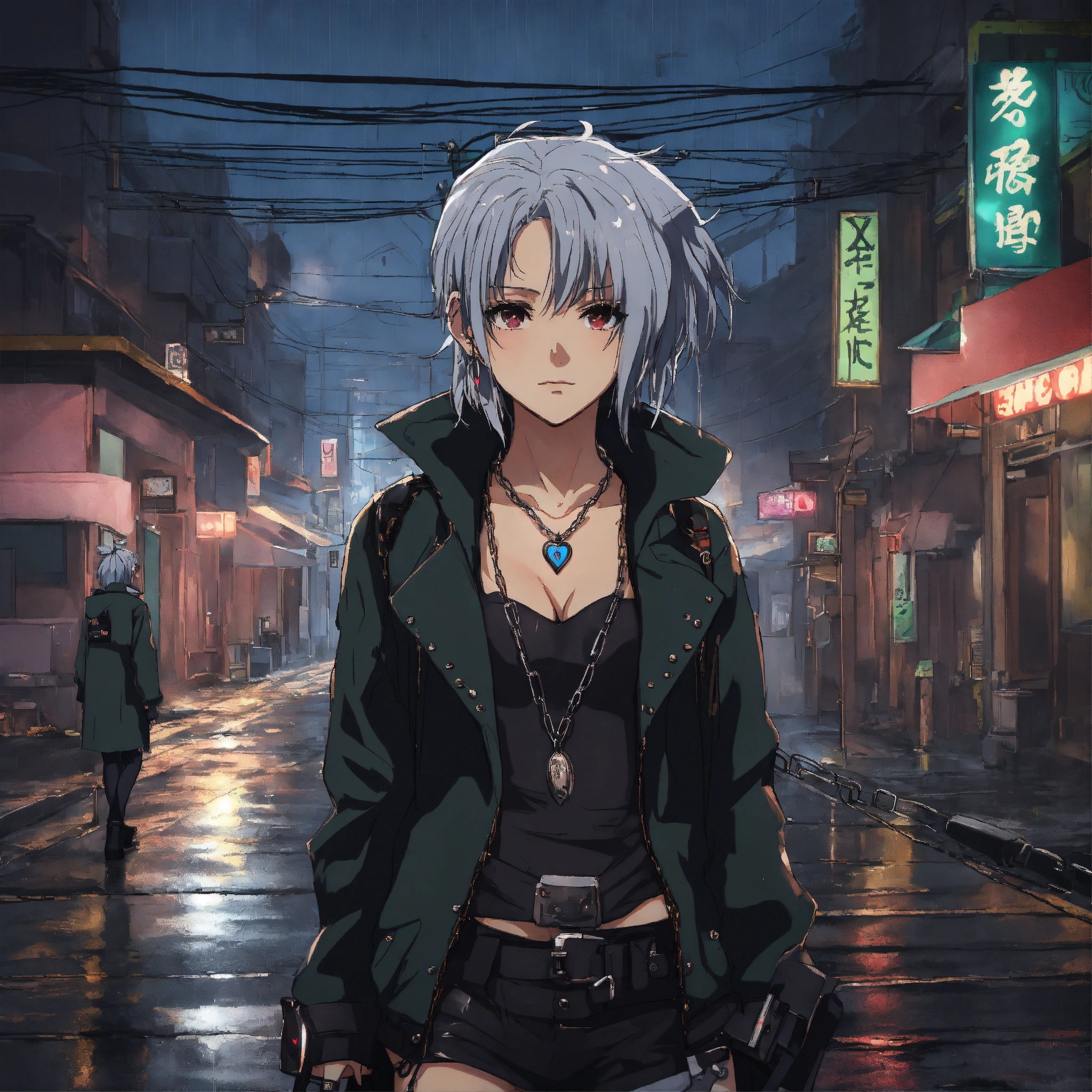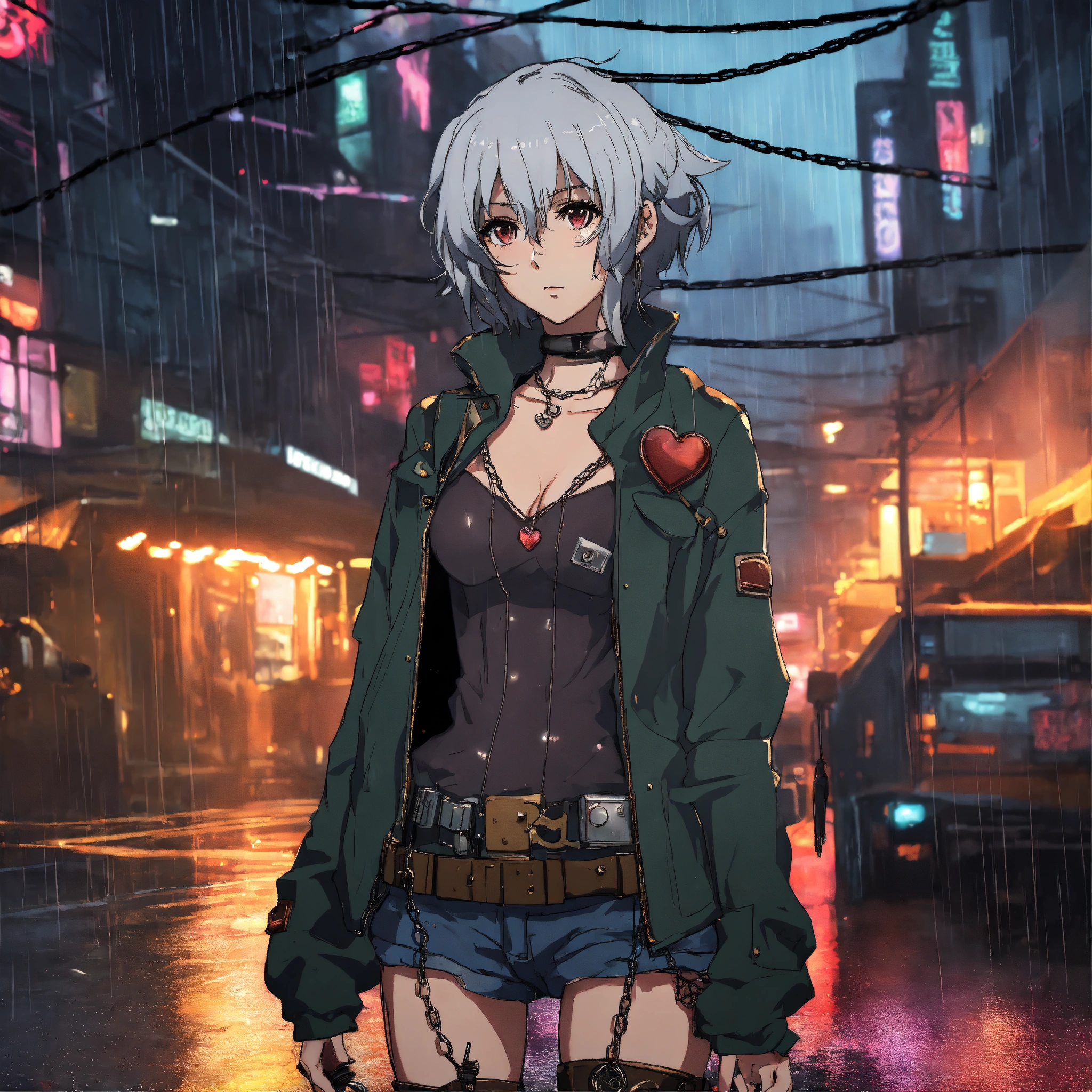 Cyberpunk city heart broken steampunk girl with silver hair standing in the middle of the street while it is a rainy dark night anime style studio ghibli, looking away from the camera emo girl wearing chains and showing skin the girl is wearing a heart necklace anime style