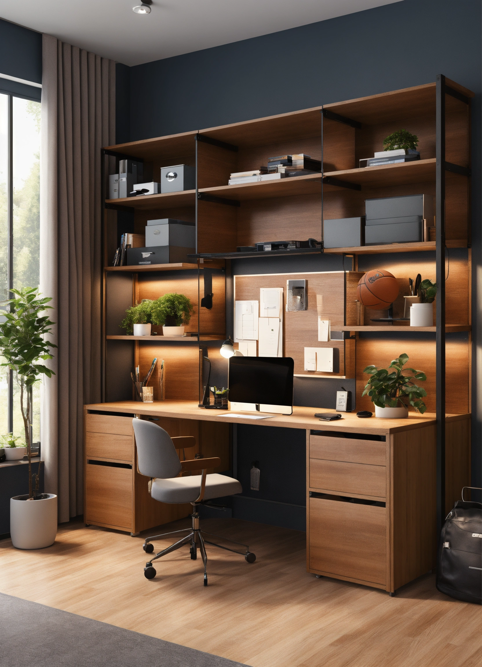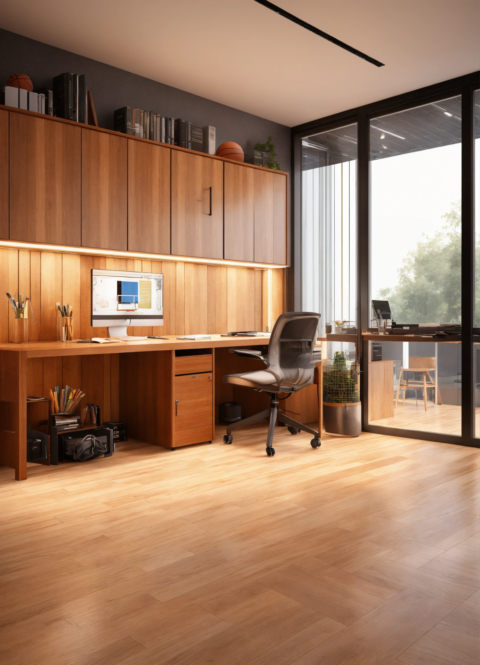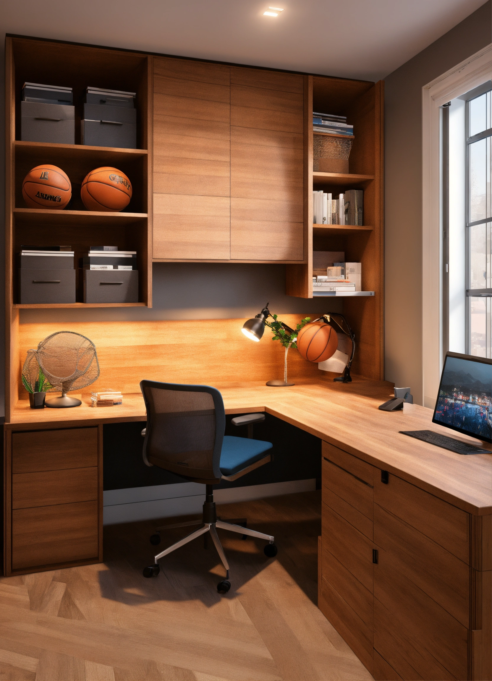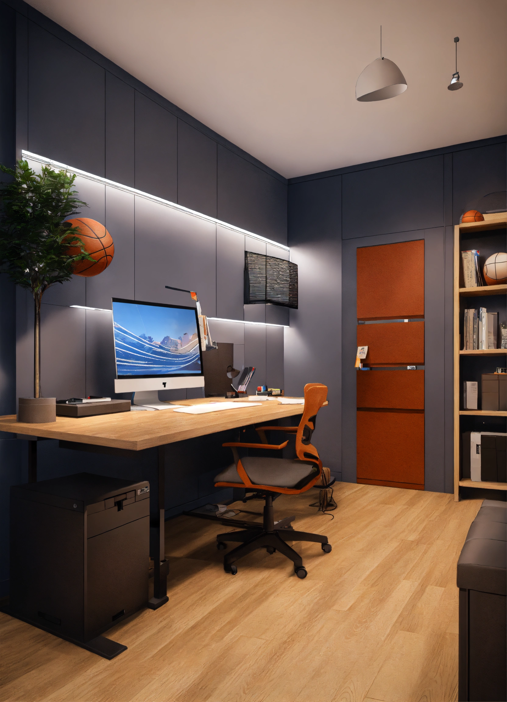 A realistic picture of a modern workspace for a basketball manager, the workspace without windows, at a glance you see a desk behind it a closed storage cabinet, a parquet floor and acoustic lighting.