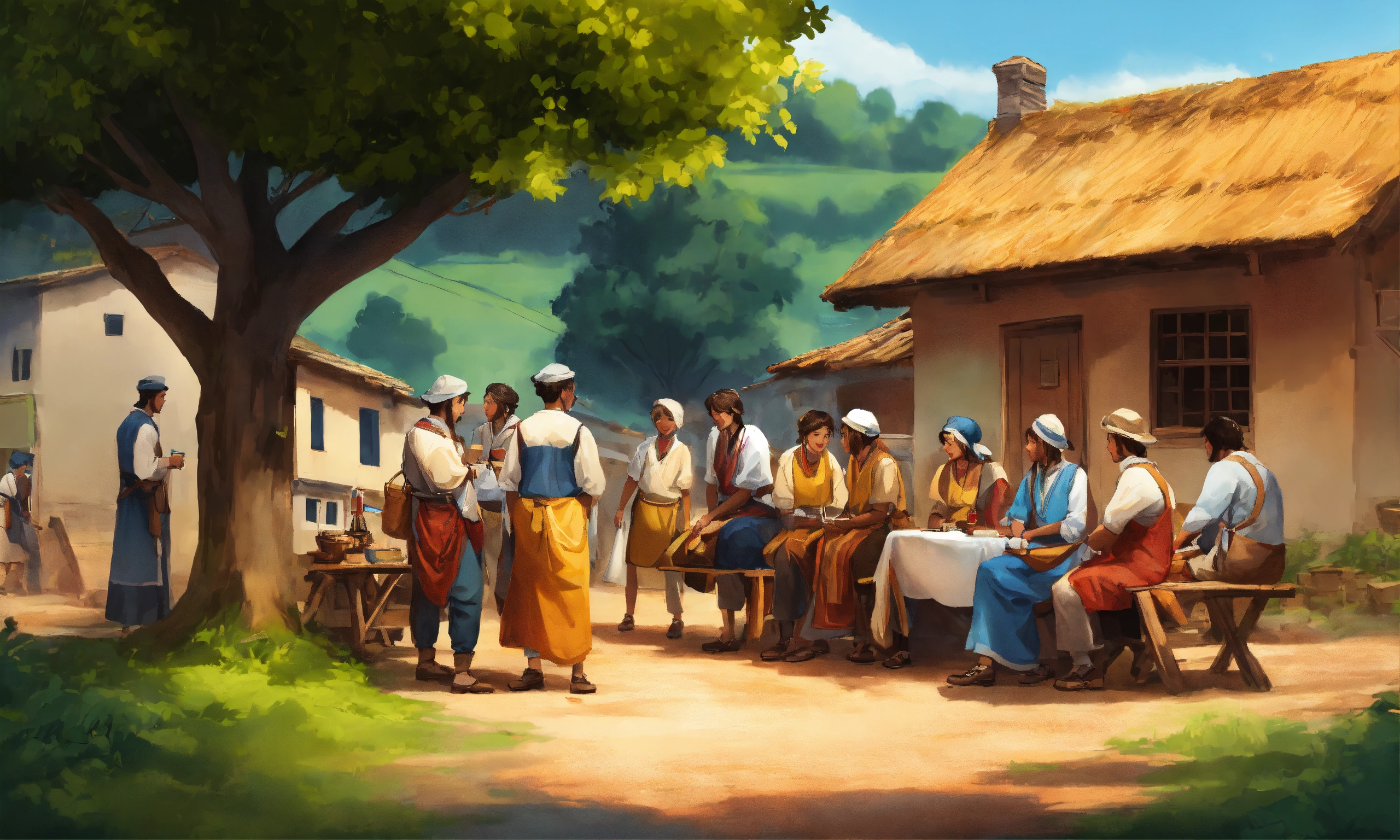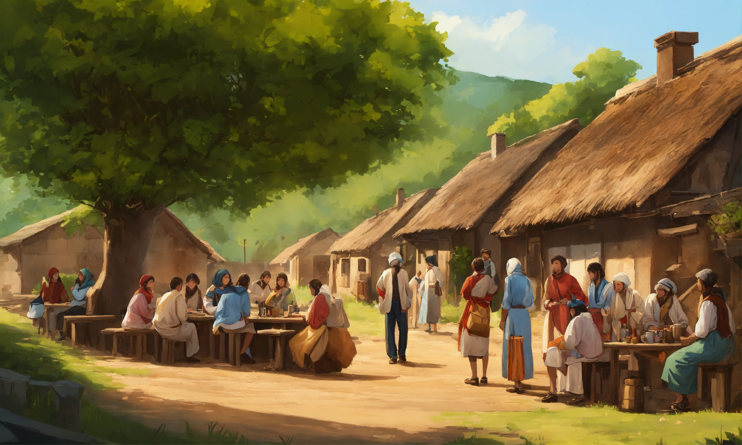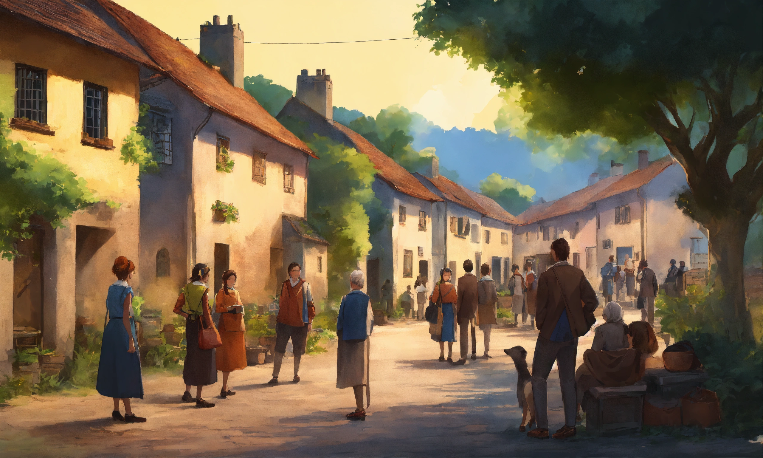 Very high detailed 2d illustration of group of people in the village talking to each other