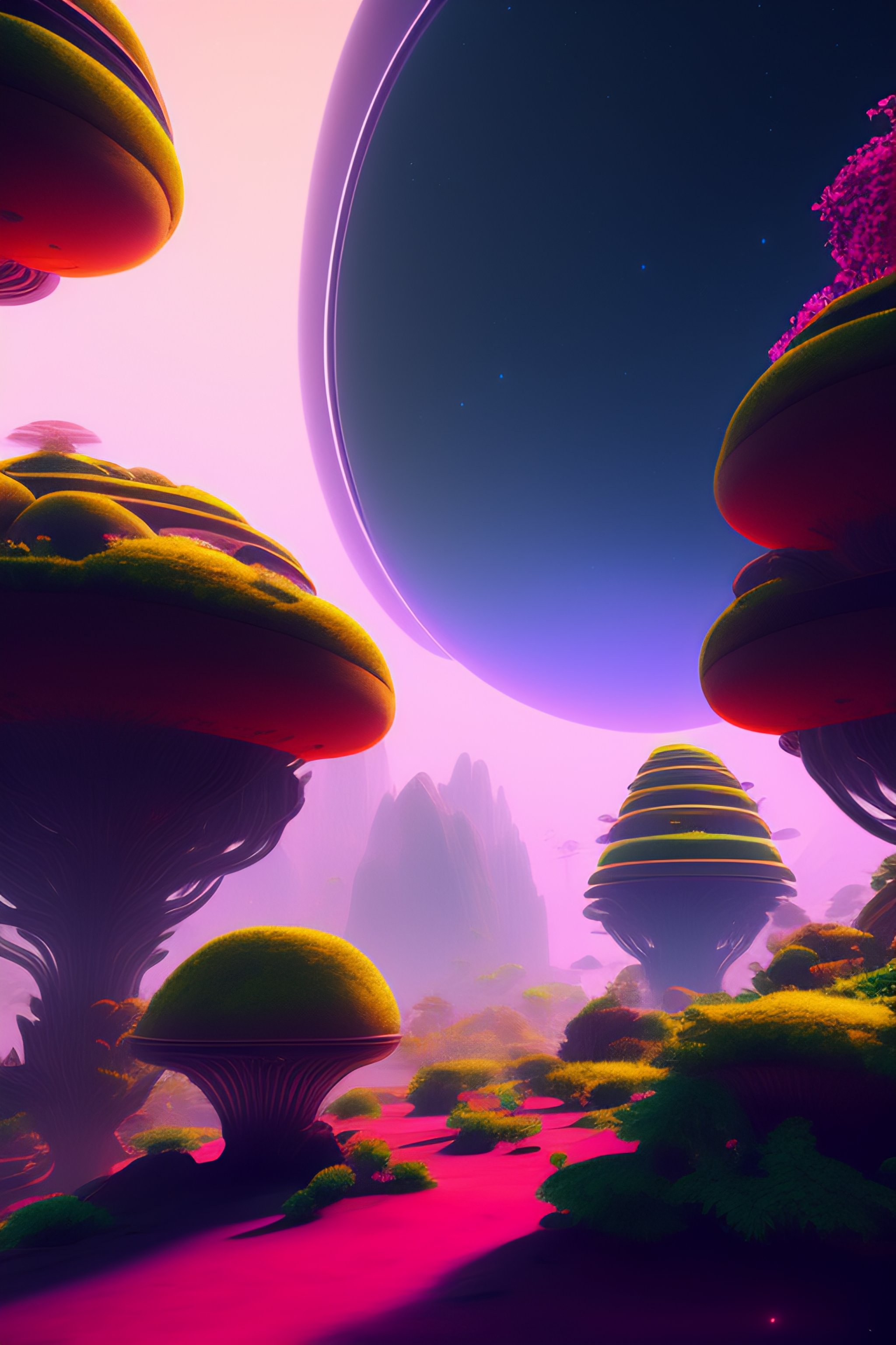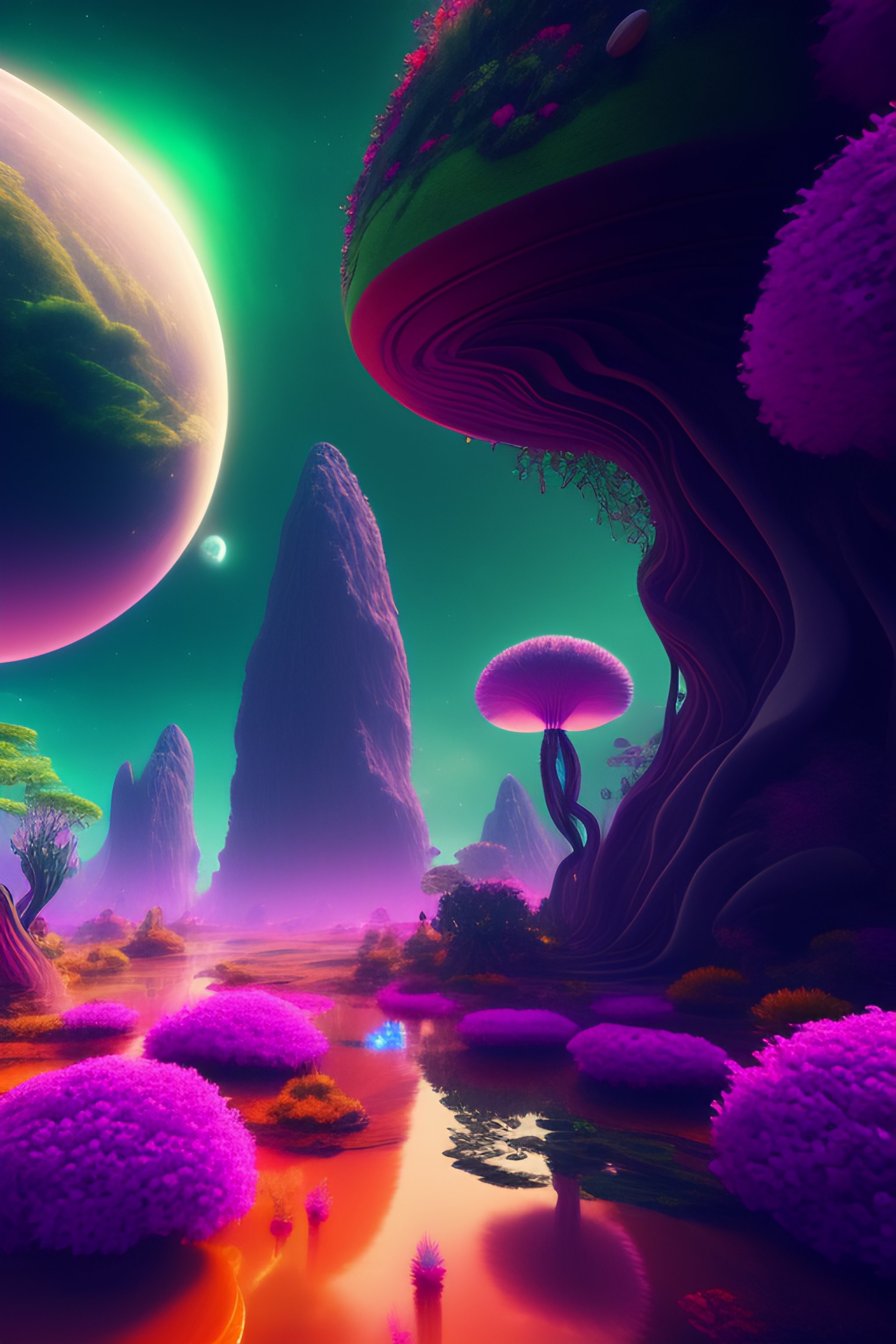 An eerie surreal alien planet, lots of alien plant life, trees, jungle, lots of colors, flowers and fruits, lots of details, colorful, fotorealistic, 8k, cinematic