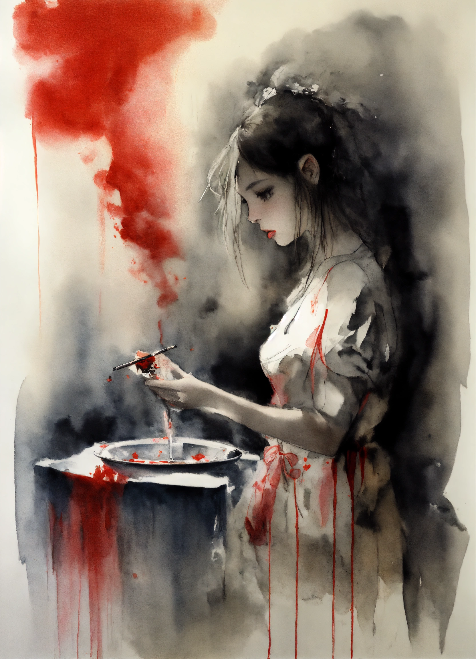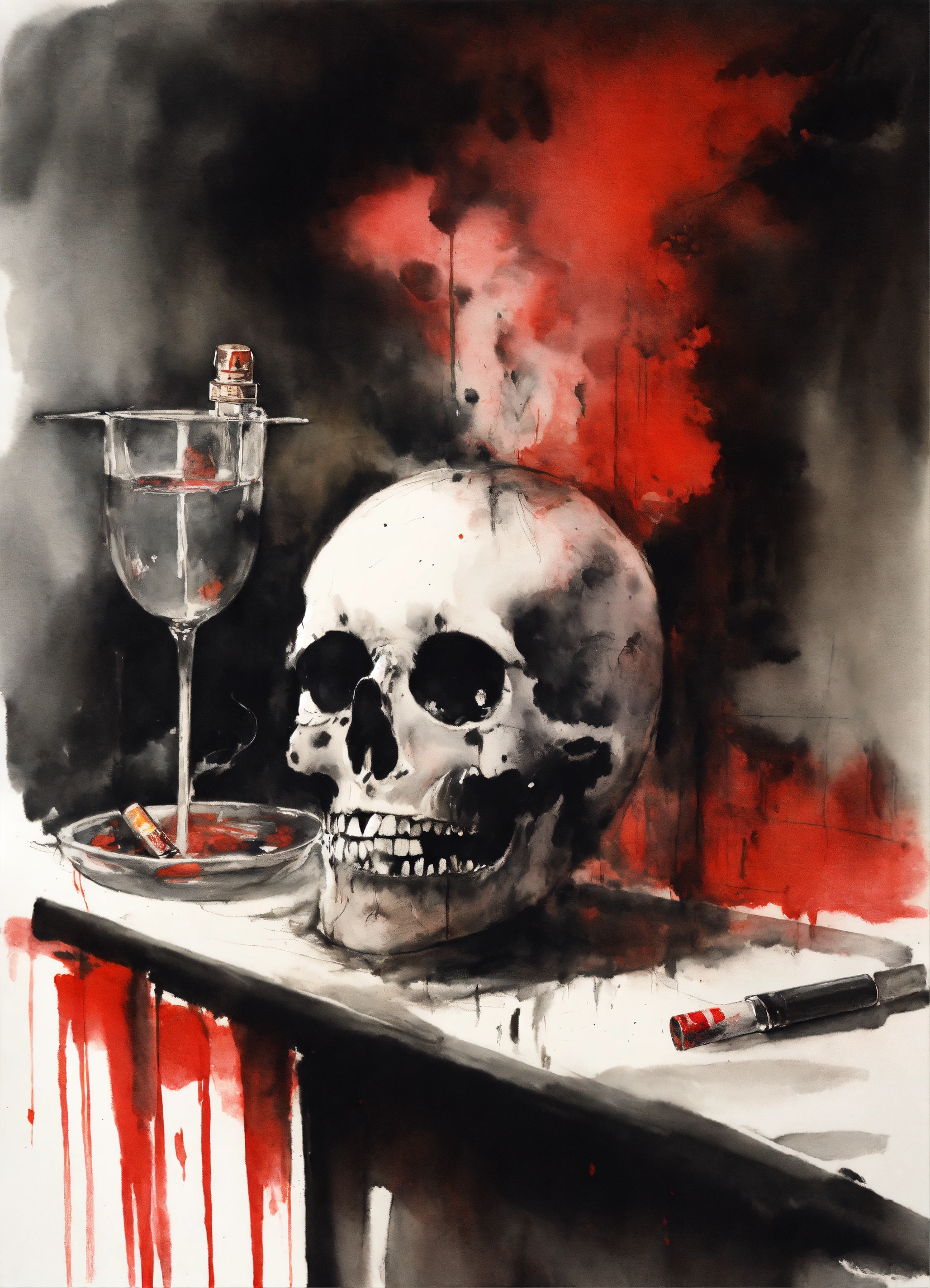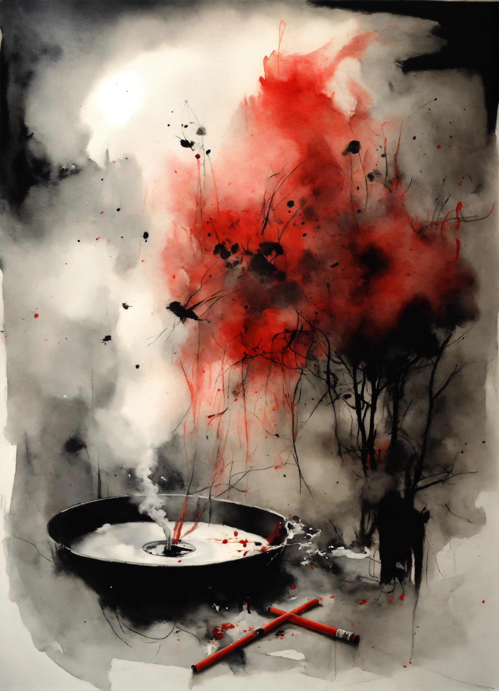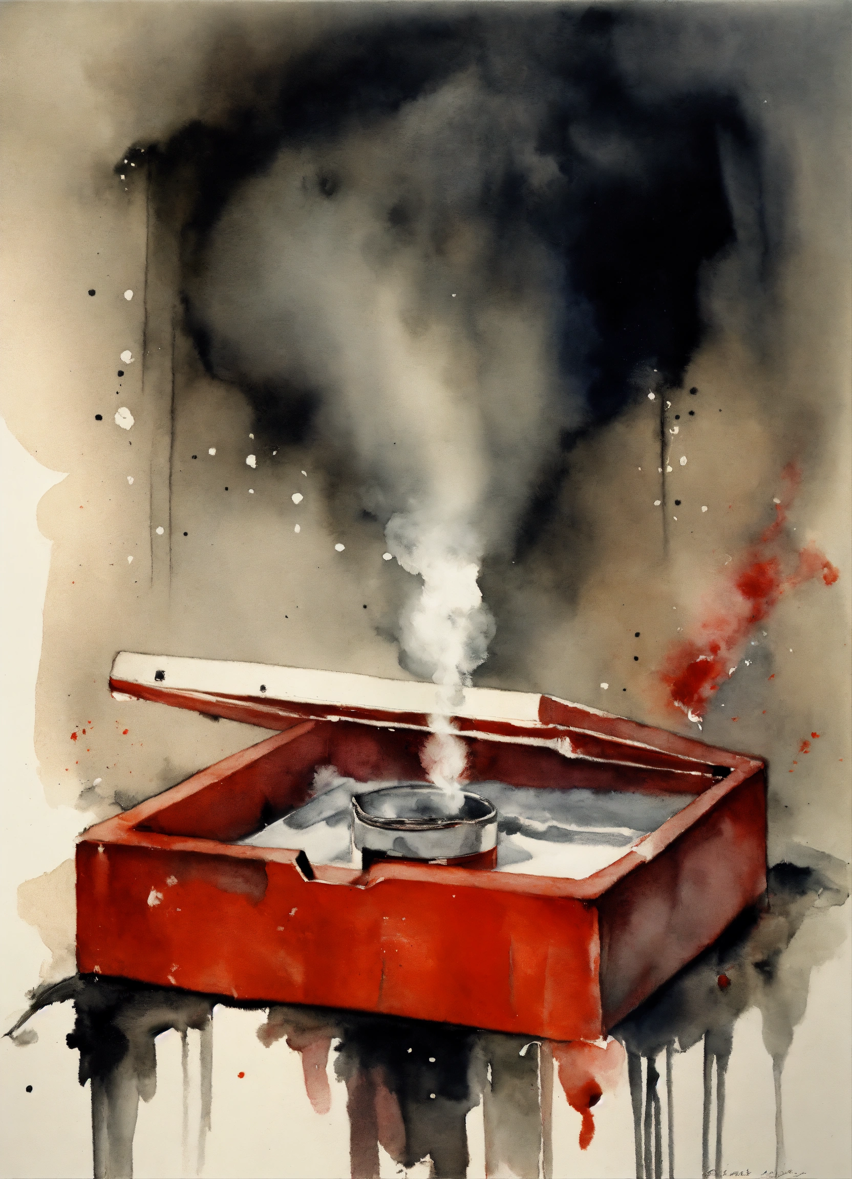 Stephen gammell style, dessin, aquarelle, aquarelles, noir et blanc et rouge, de marais, de sombres créatures, dégoulinant, a cigarette in an ashtray which lets out whitish smoke