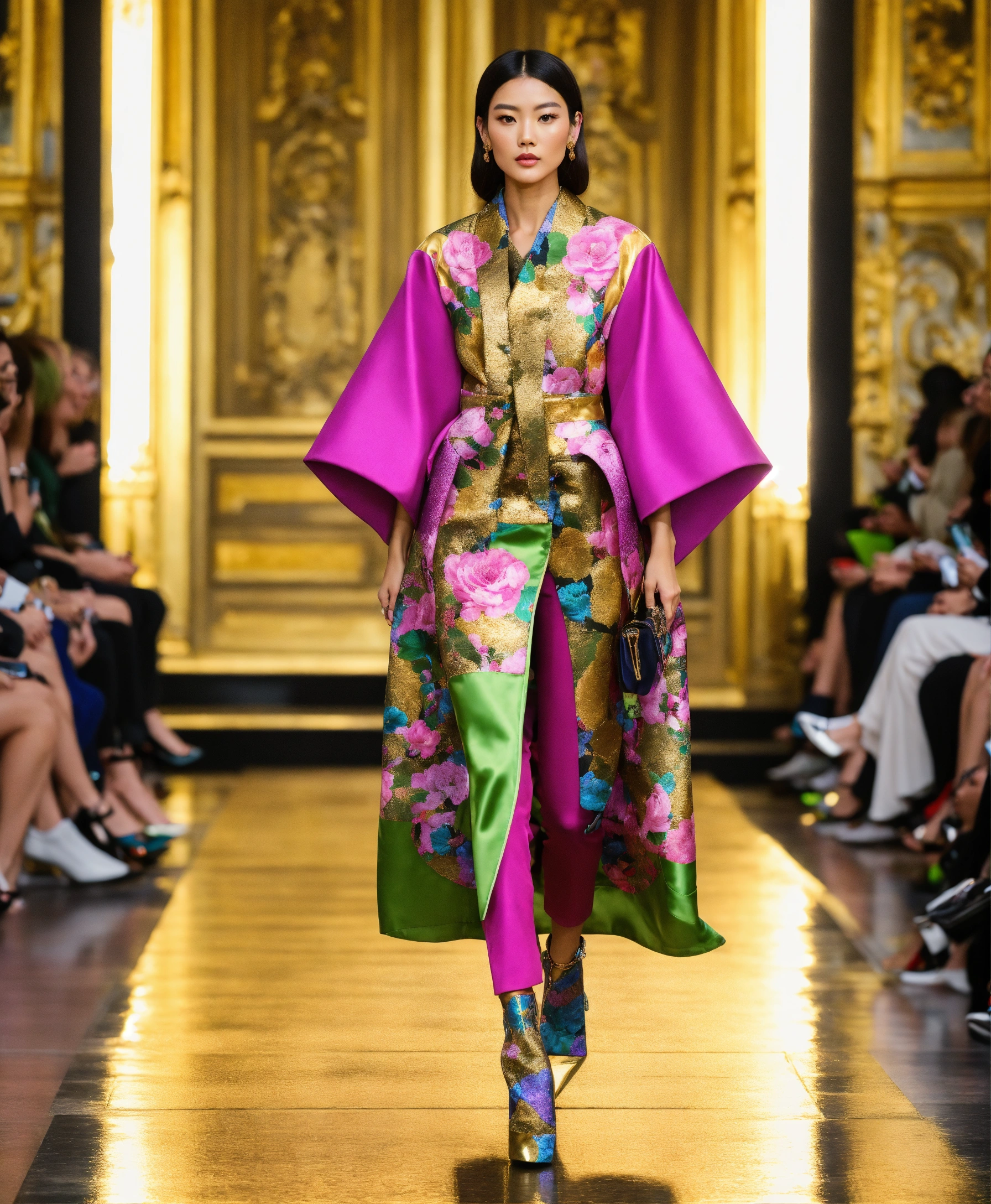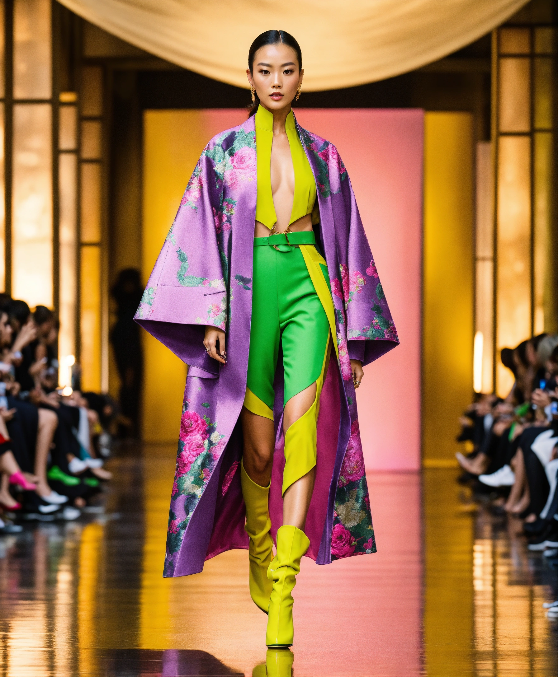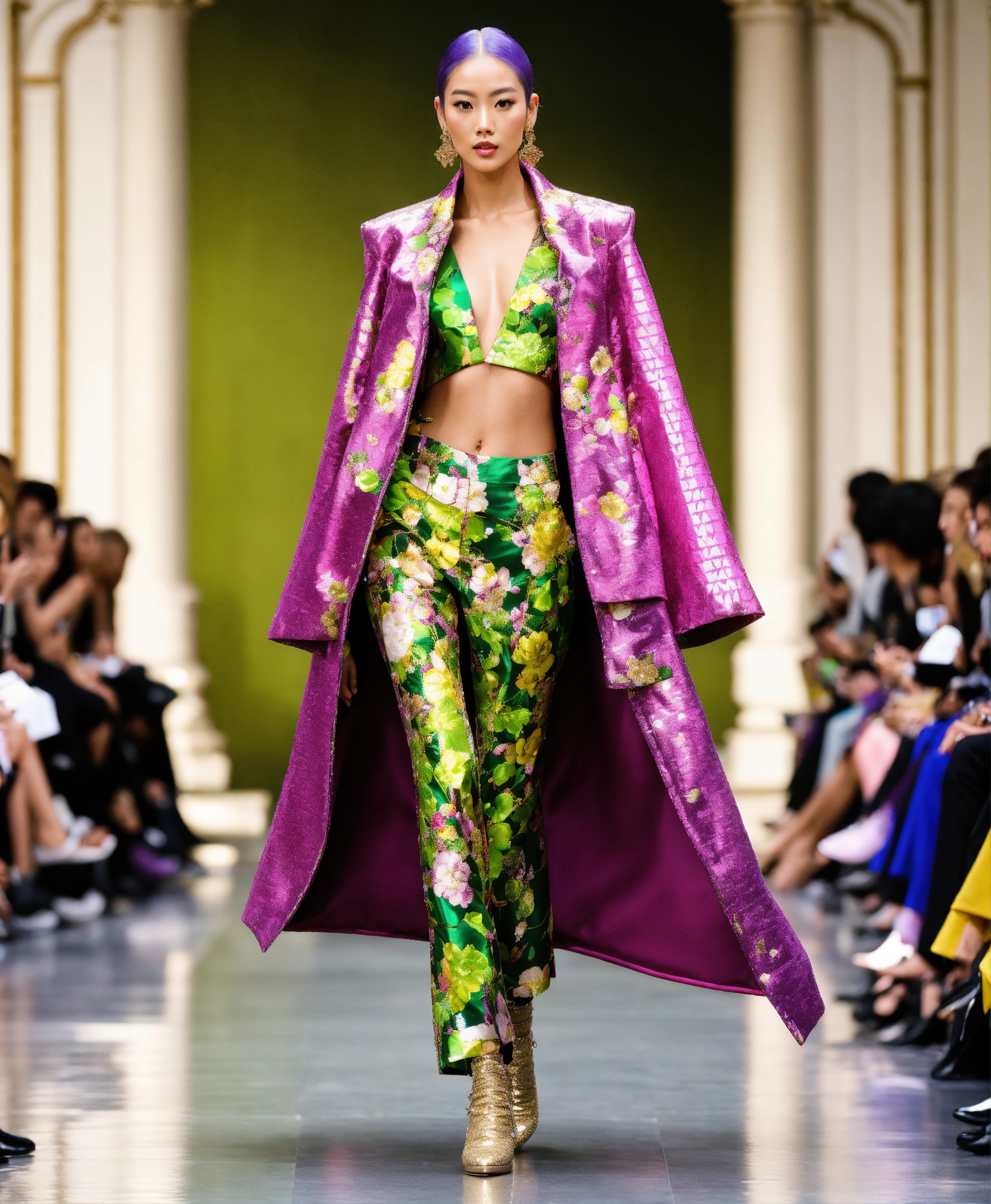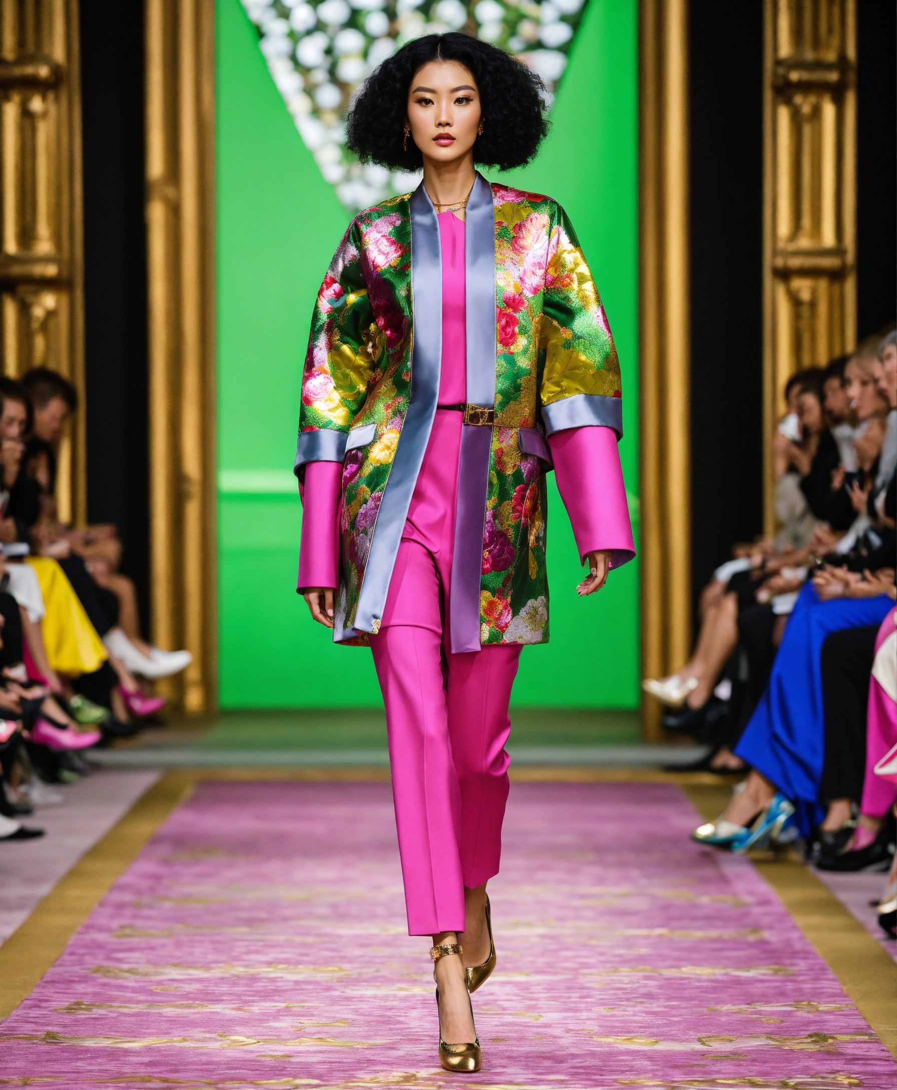Ultra realistic full body photo of a stylish japanese model walking the runway modeling summer designer novelty interesting complex unusual street sporty classy modern dolman sleeve outfit brave, paris versailles details cutouts and and gold geometric pattern floral structured tailored jacket pink gold green lilac peridot silver magenta lime fuchsia yellow blue black gray copper mauve bronze haute couture ultimate elegance beautiful luxurious awesome wealthy resplendent magnificent sublime 12k