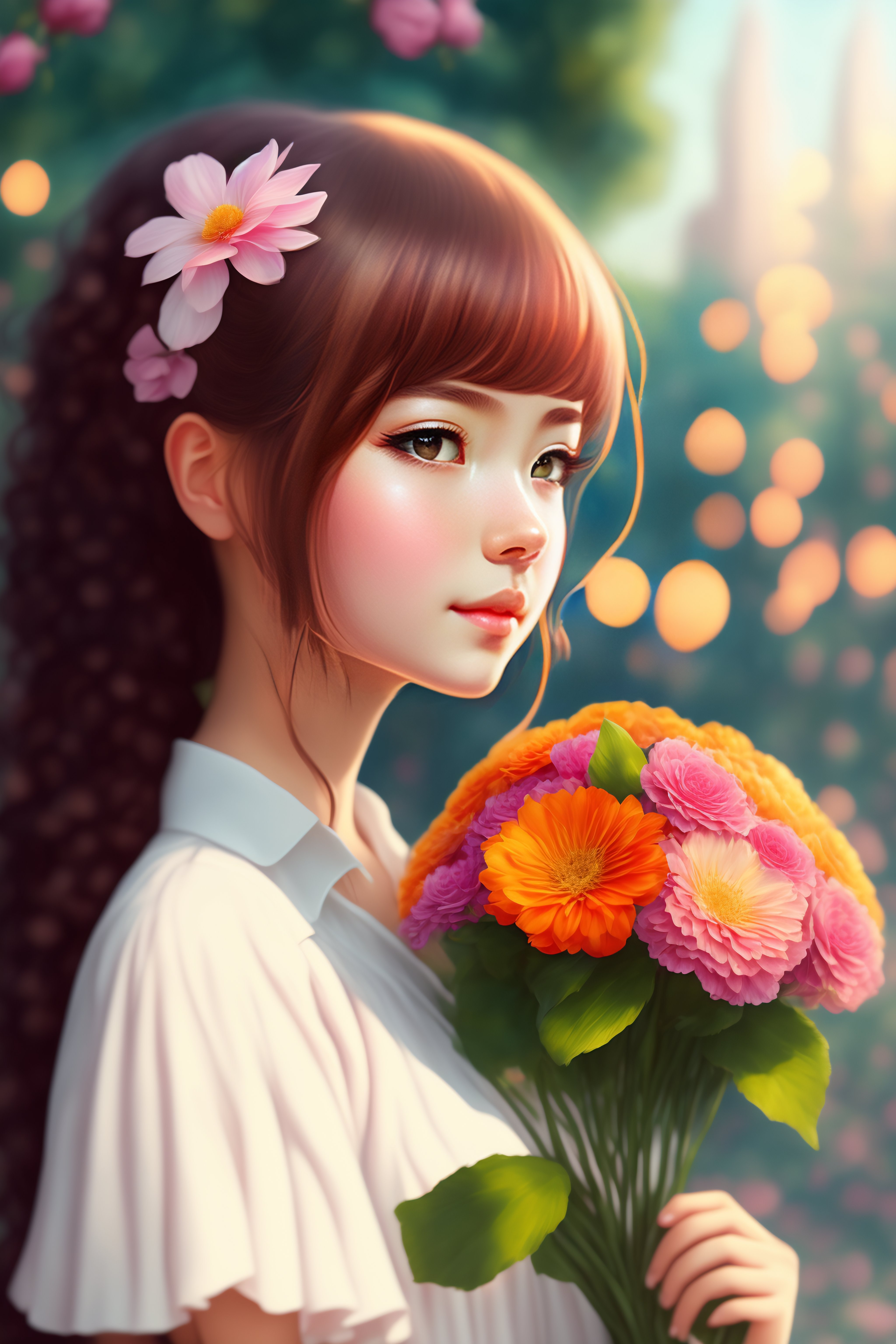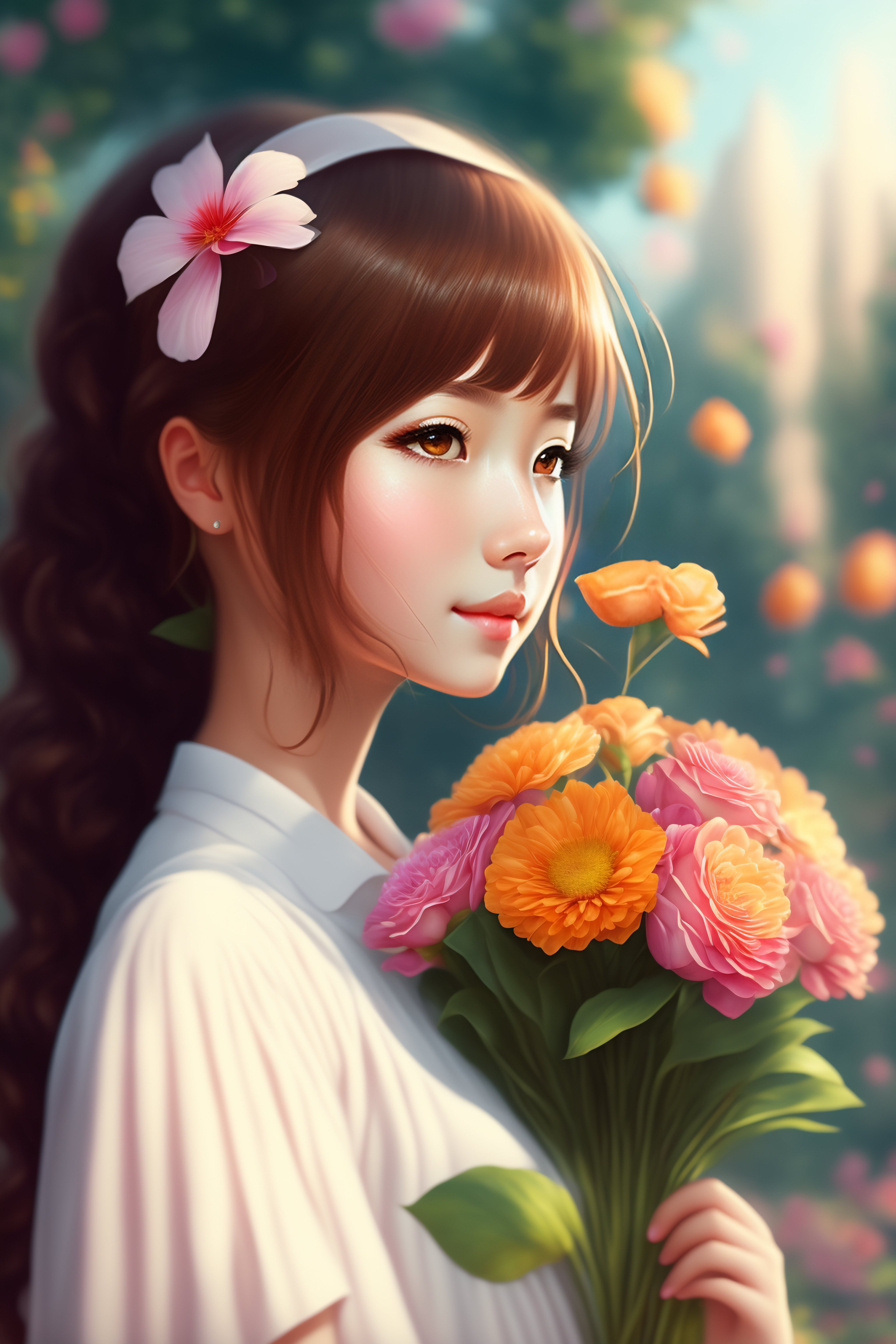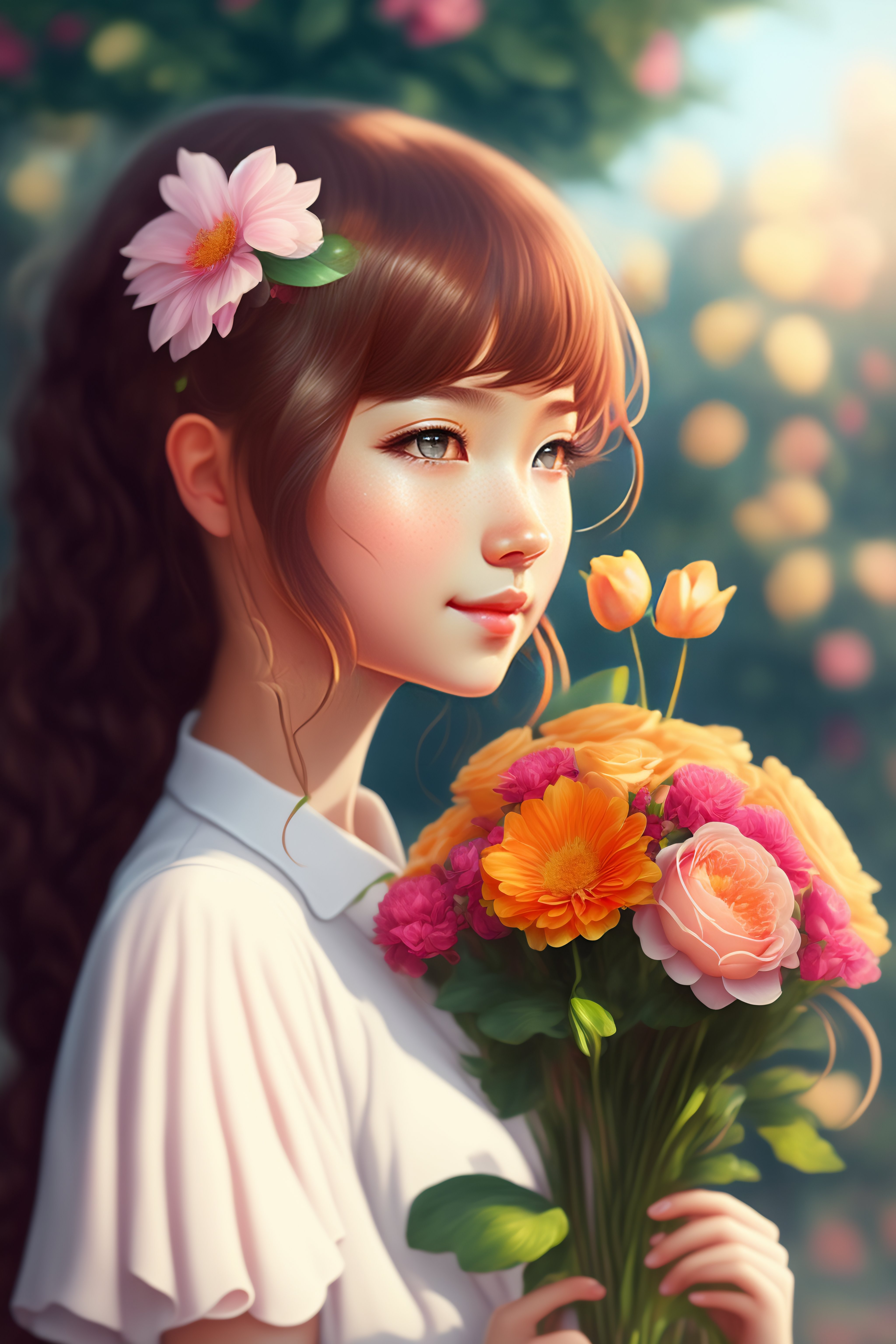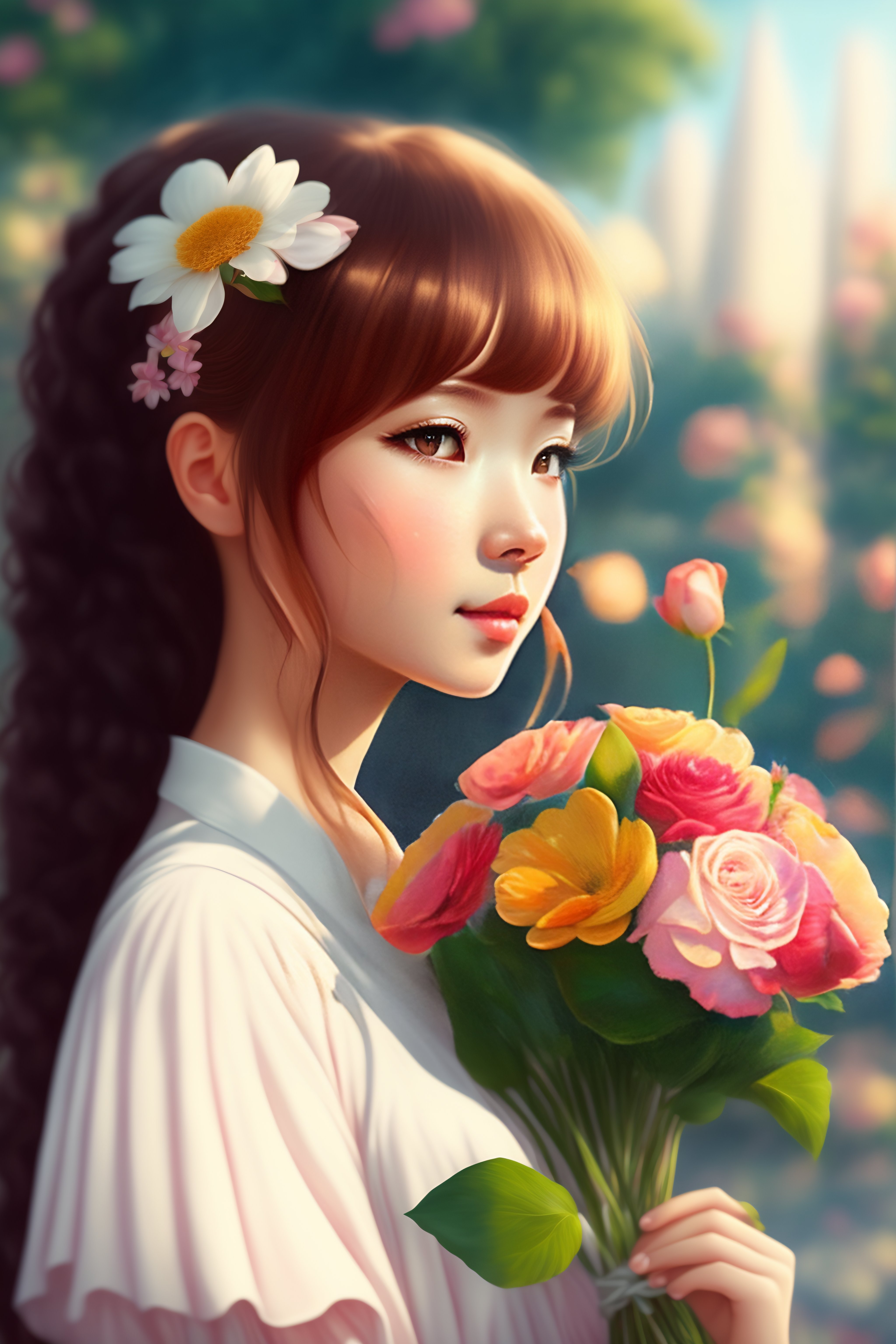 Girl holding a flower bouquet anime