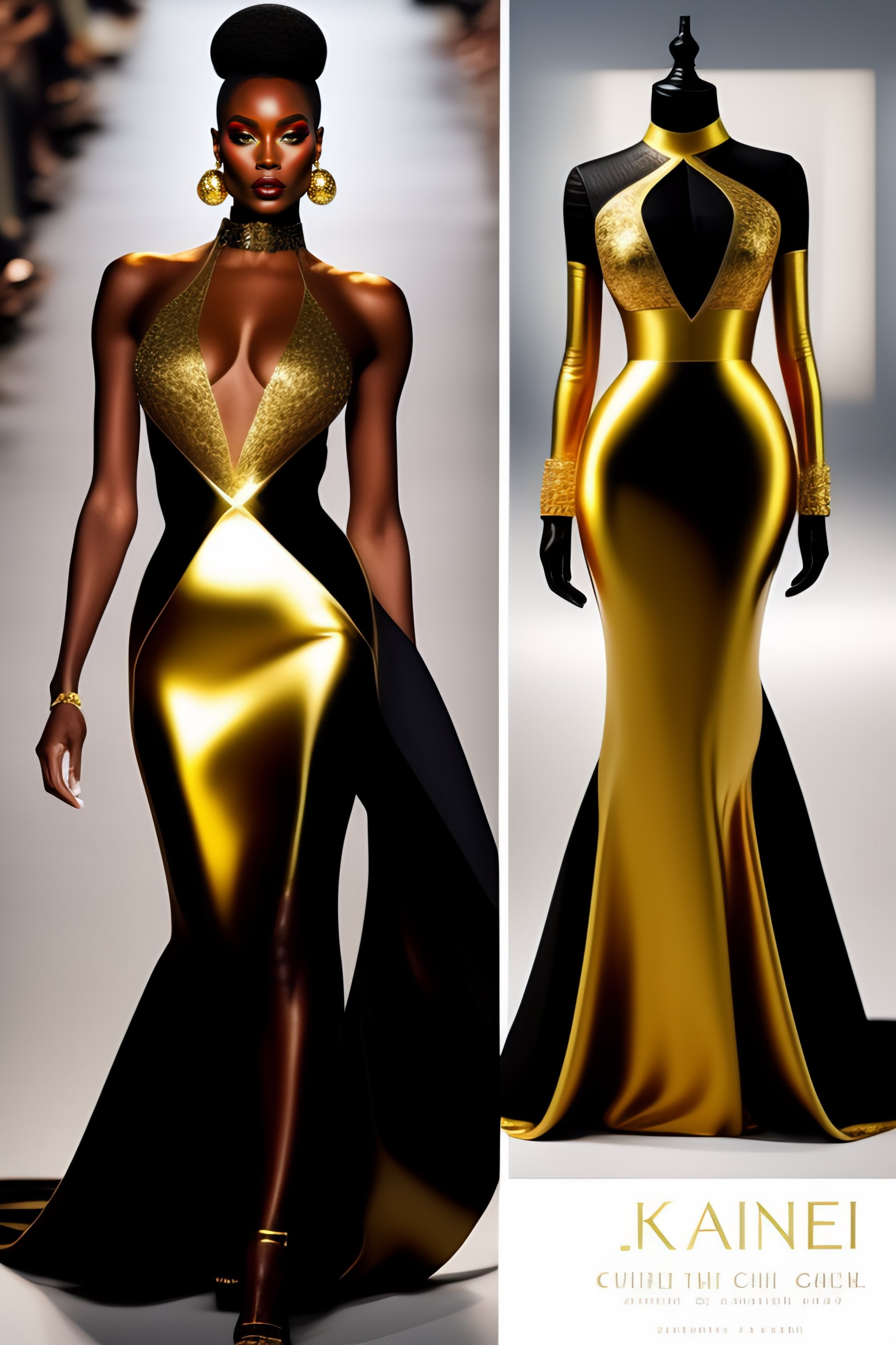 Create a futuristic elegant and haute couture evening dress for women that has black color, gold color having the face of a mannequin in gold color other version of this