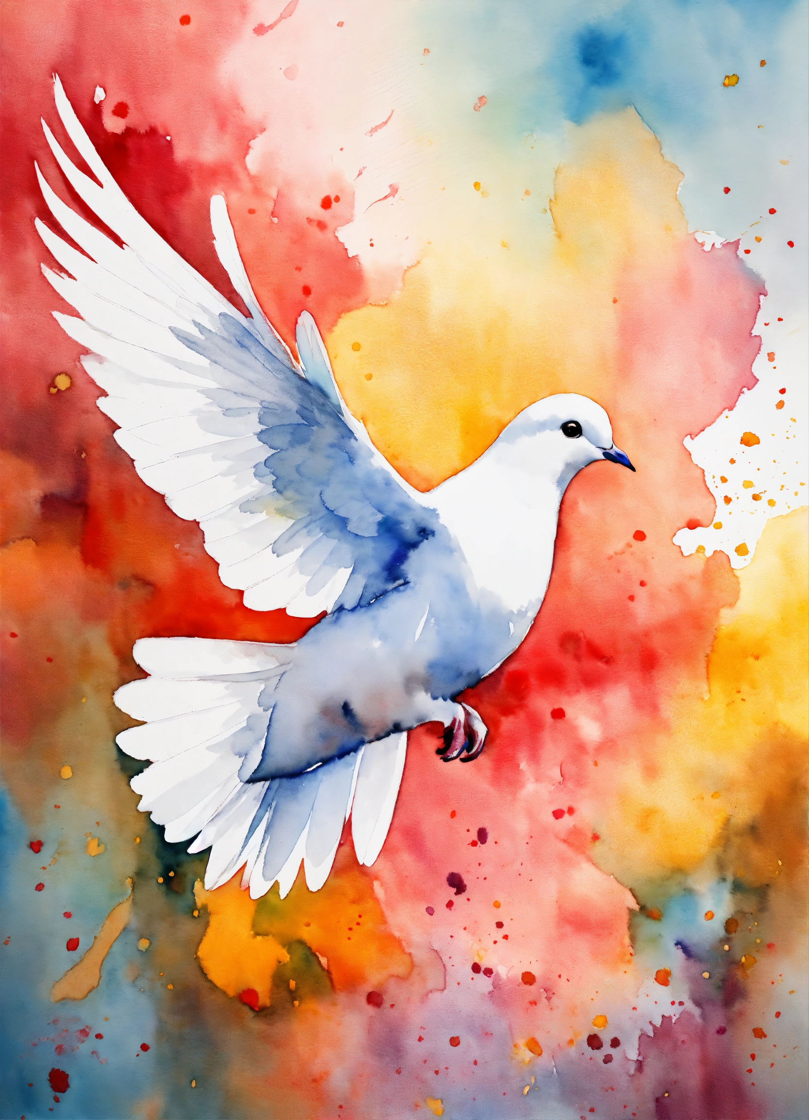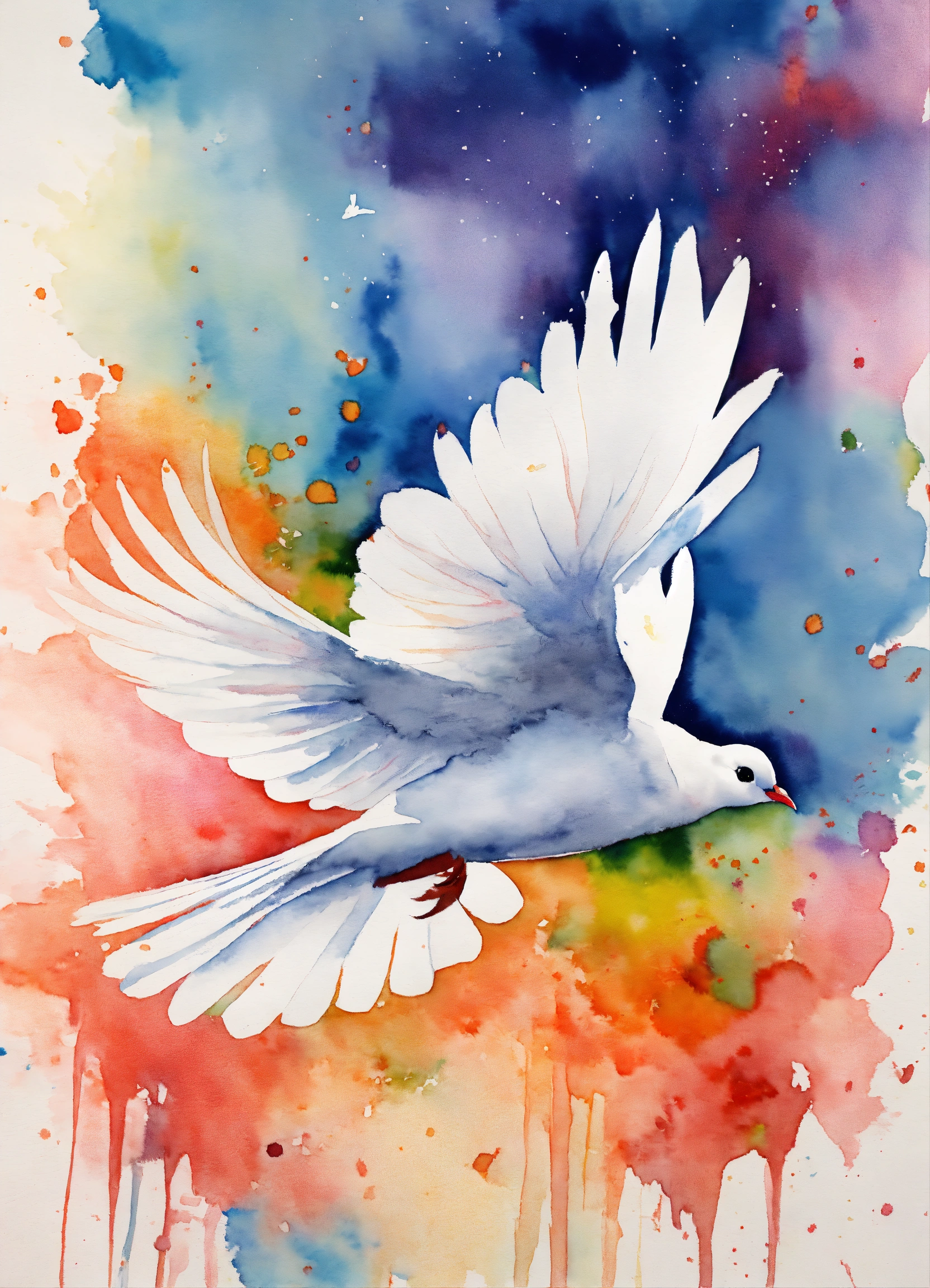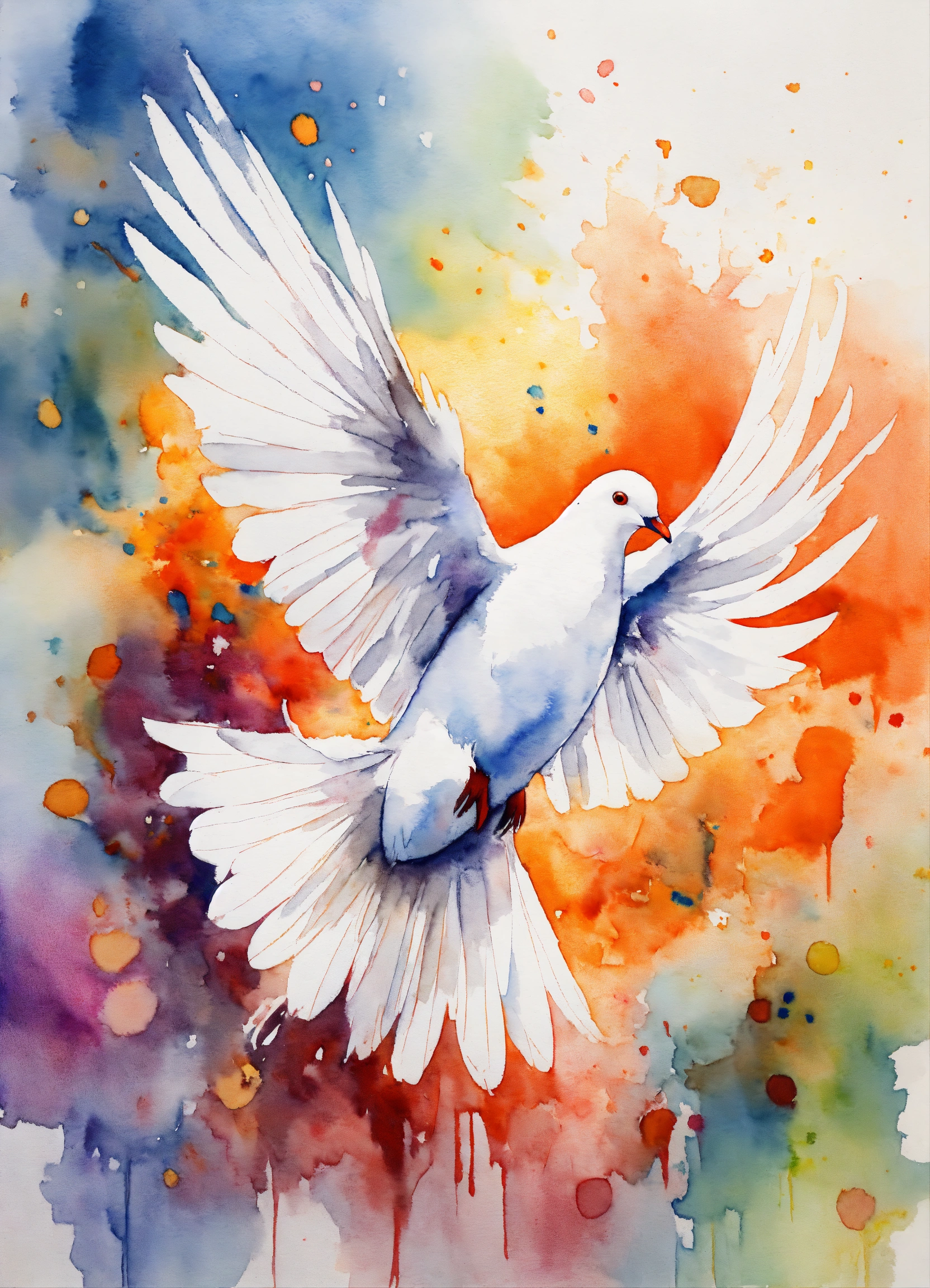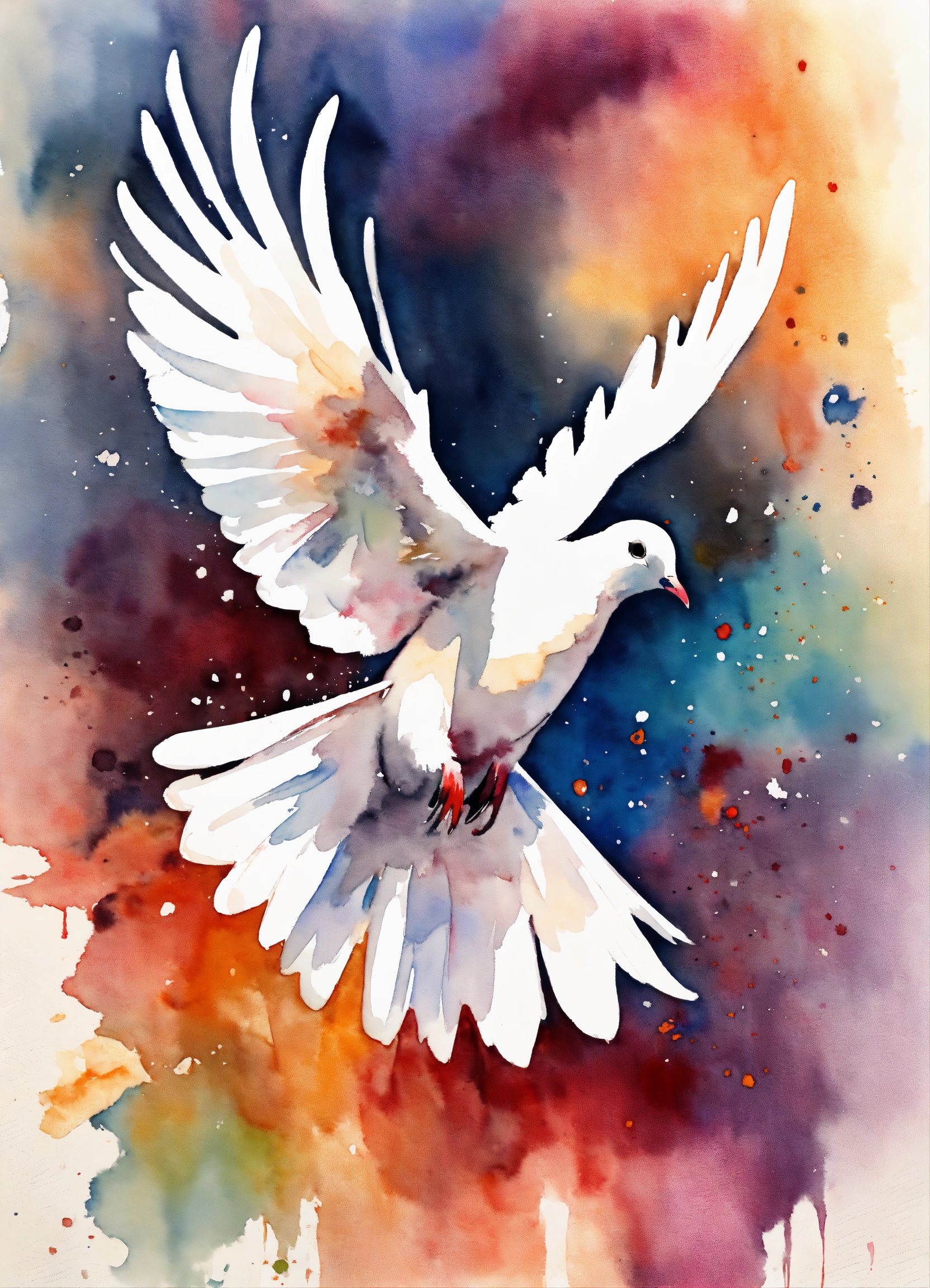 Beautiful watercolor splotches behind a watercolor painted white dove flying