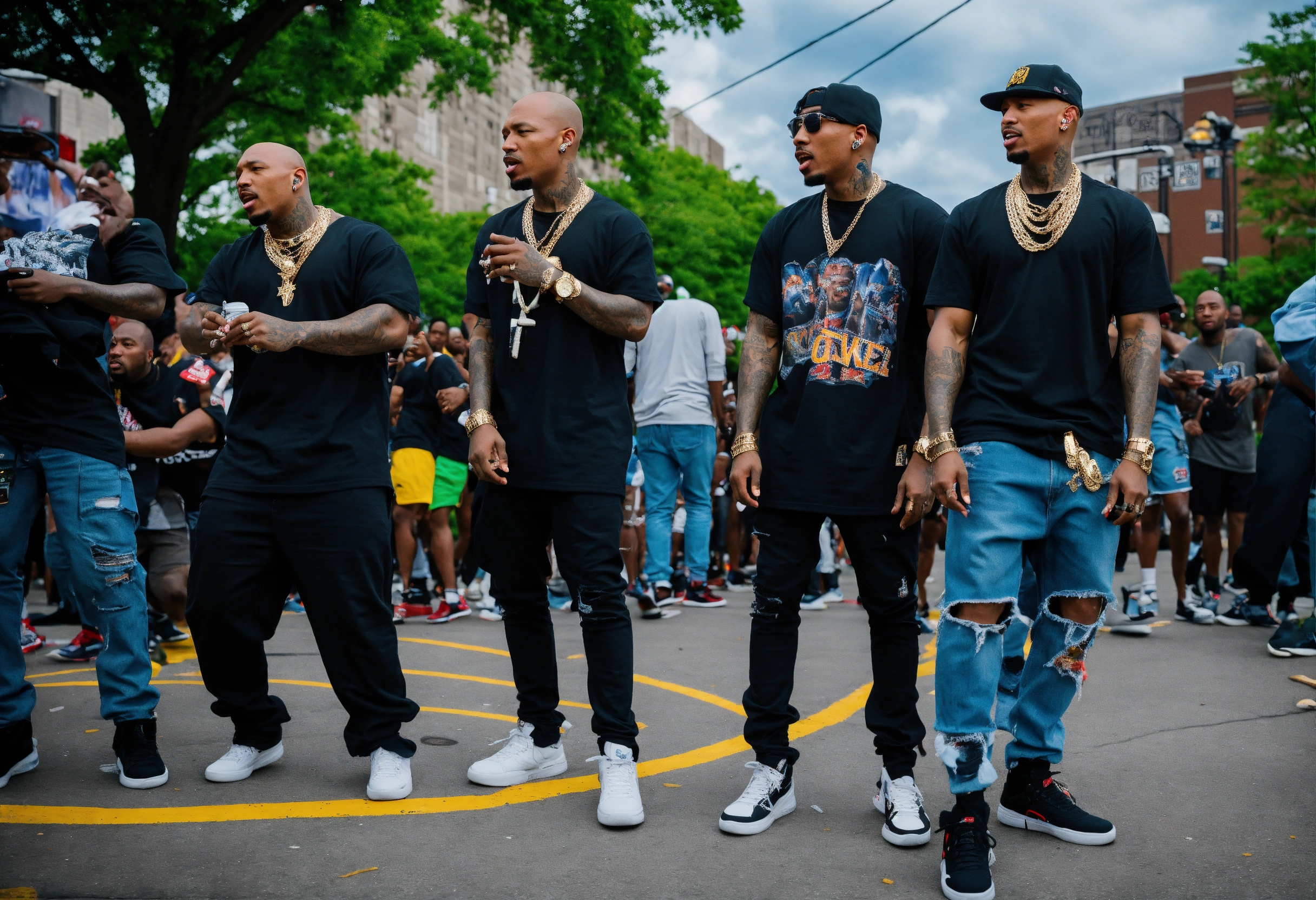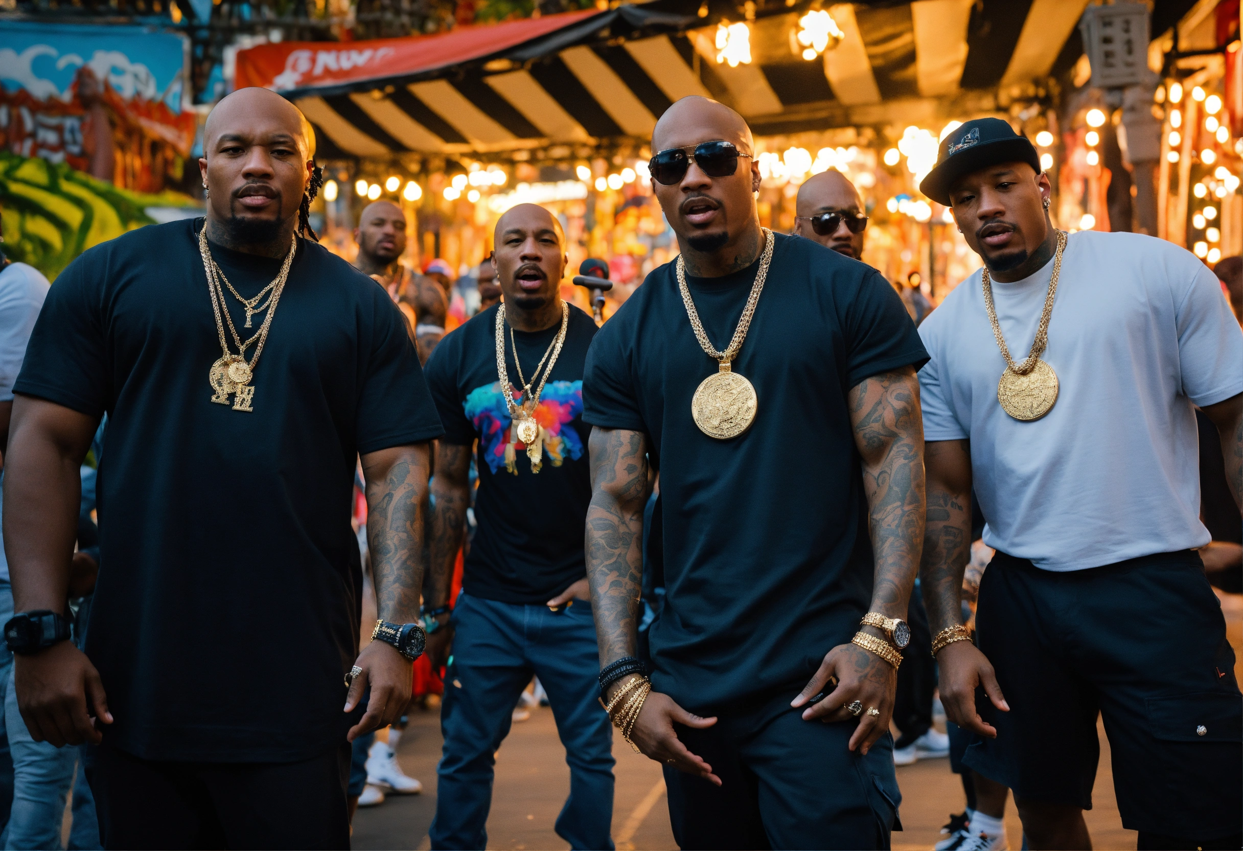 Full body shot black baldheaded guys rap group "onyx", fredro starr, sticky fingaz, sonny seeza, and big ds, rapping on stage on top of coliseum mall jamacia ave. south jamaica, queens, new york people walking in the background talking, epic details 8k, super high quality, tattoo, gold neckless, canon eos 5d, burst out screaming, background.
