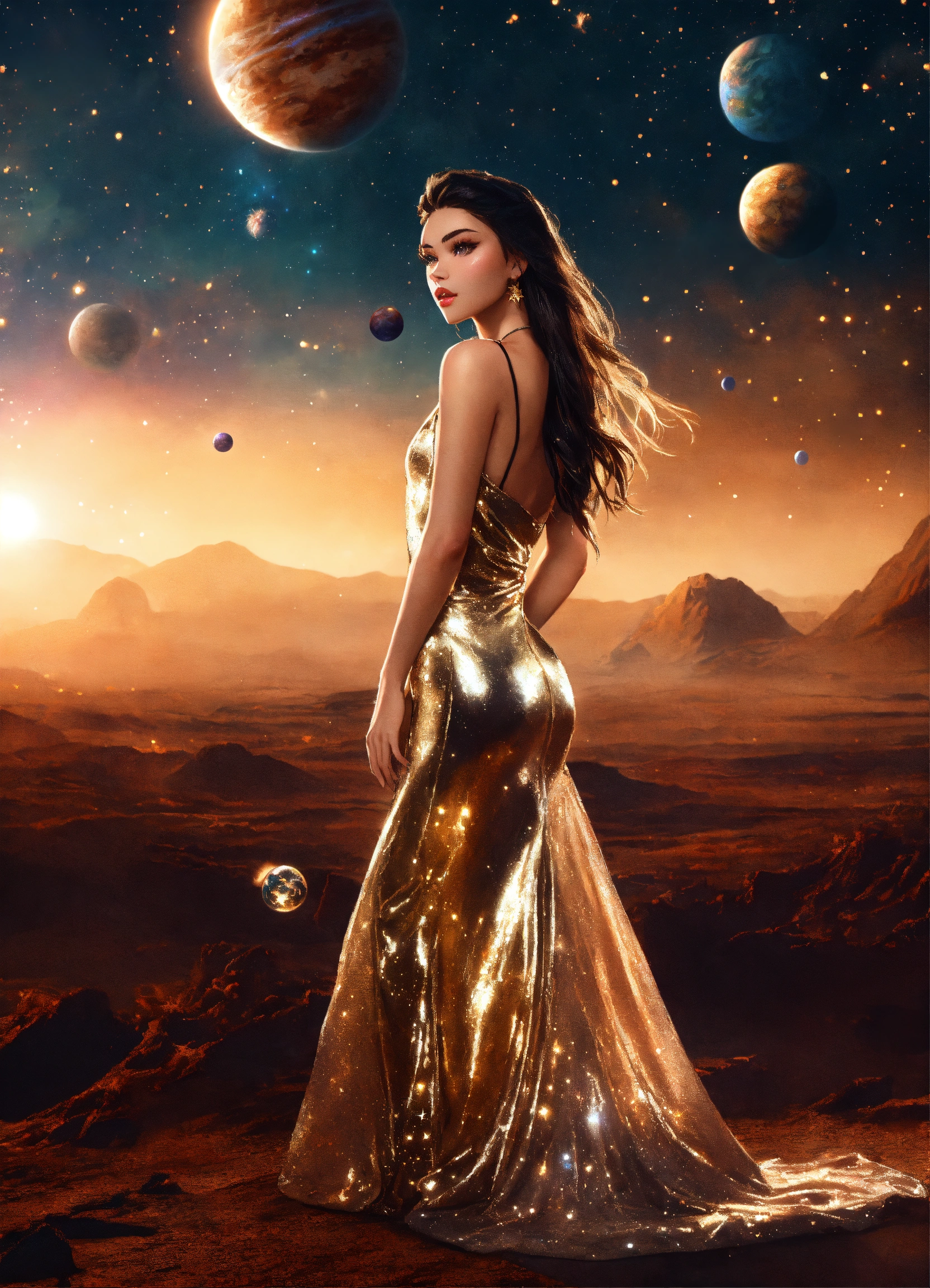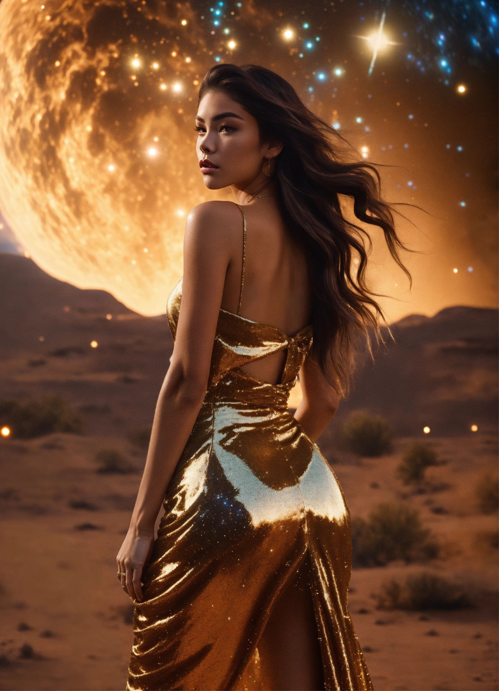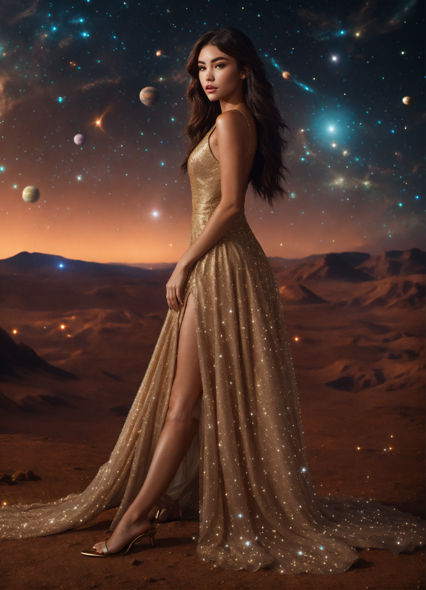 Madison beer in a beige sparkling cocktail dress, black, on an isolated planet, back turned. stars raining down, a majestic lion with golden mane watching her. galaxy filled with planets, realistic. full body. 4k real photoshoot.