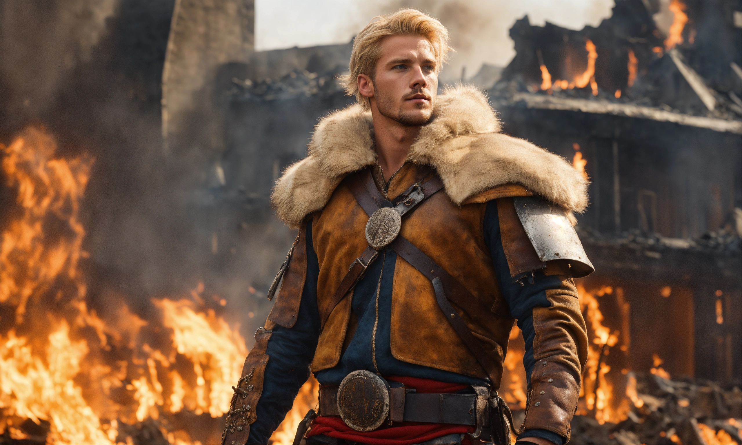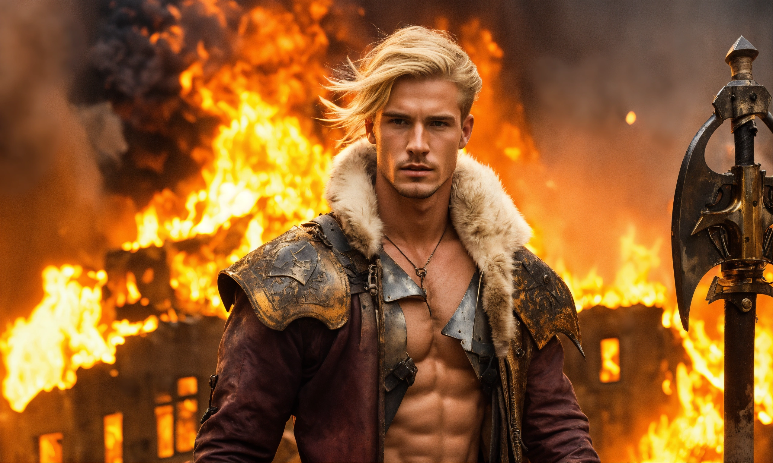Blond male in metall armer and fur standig on burning clif with blody axe before chest, before burning buildings