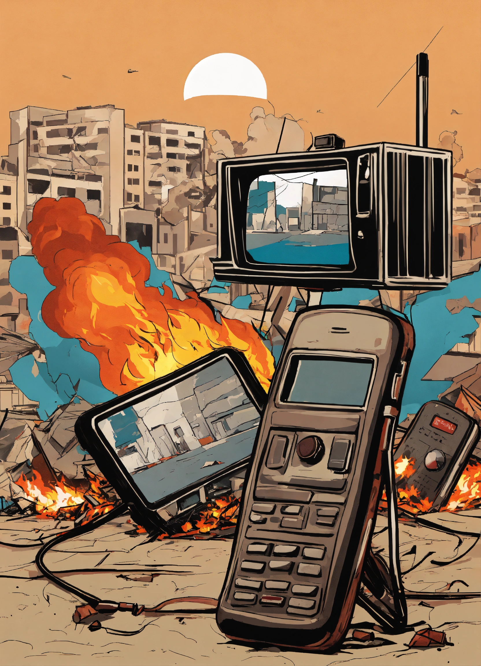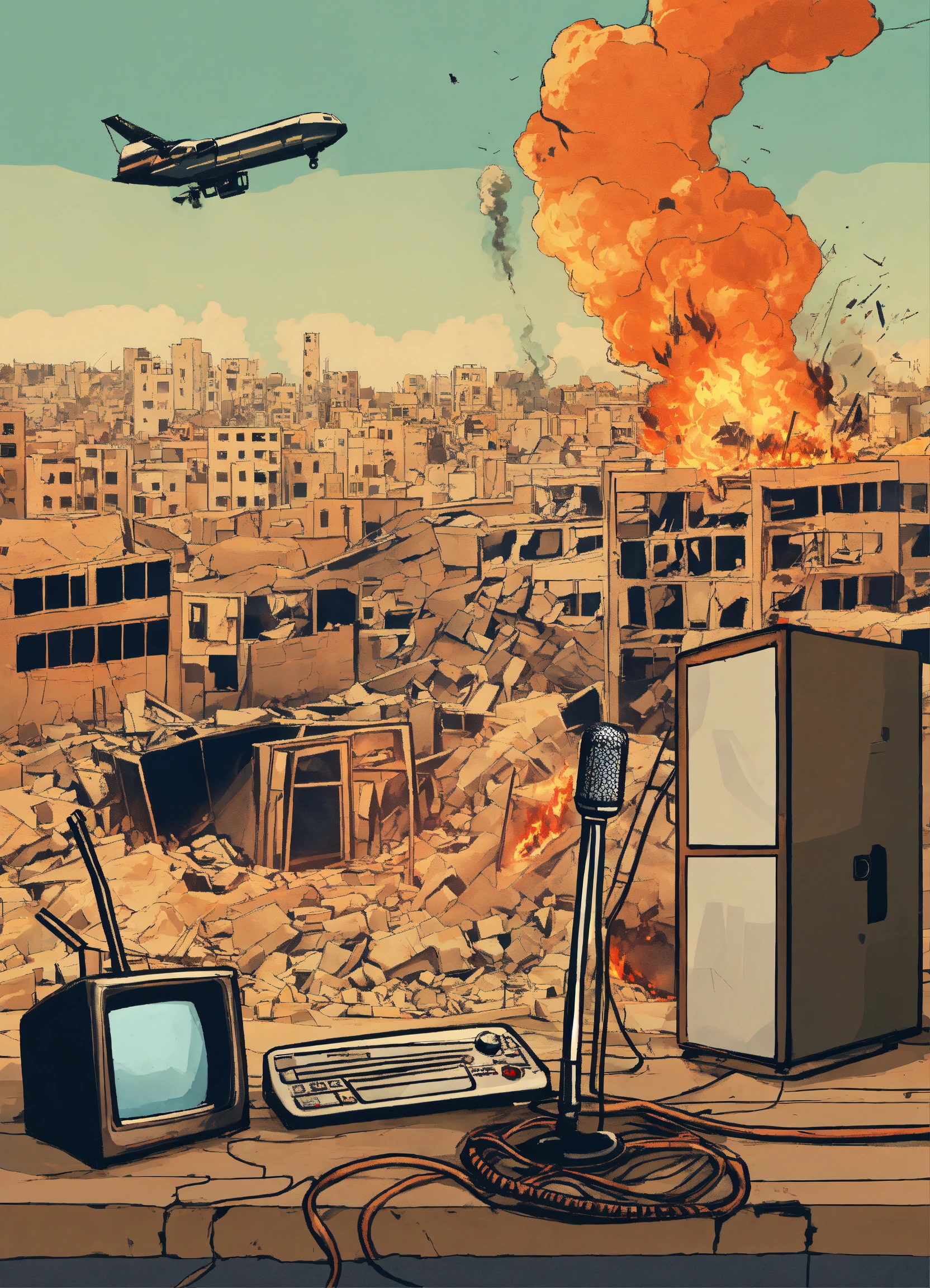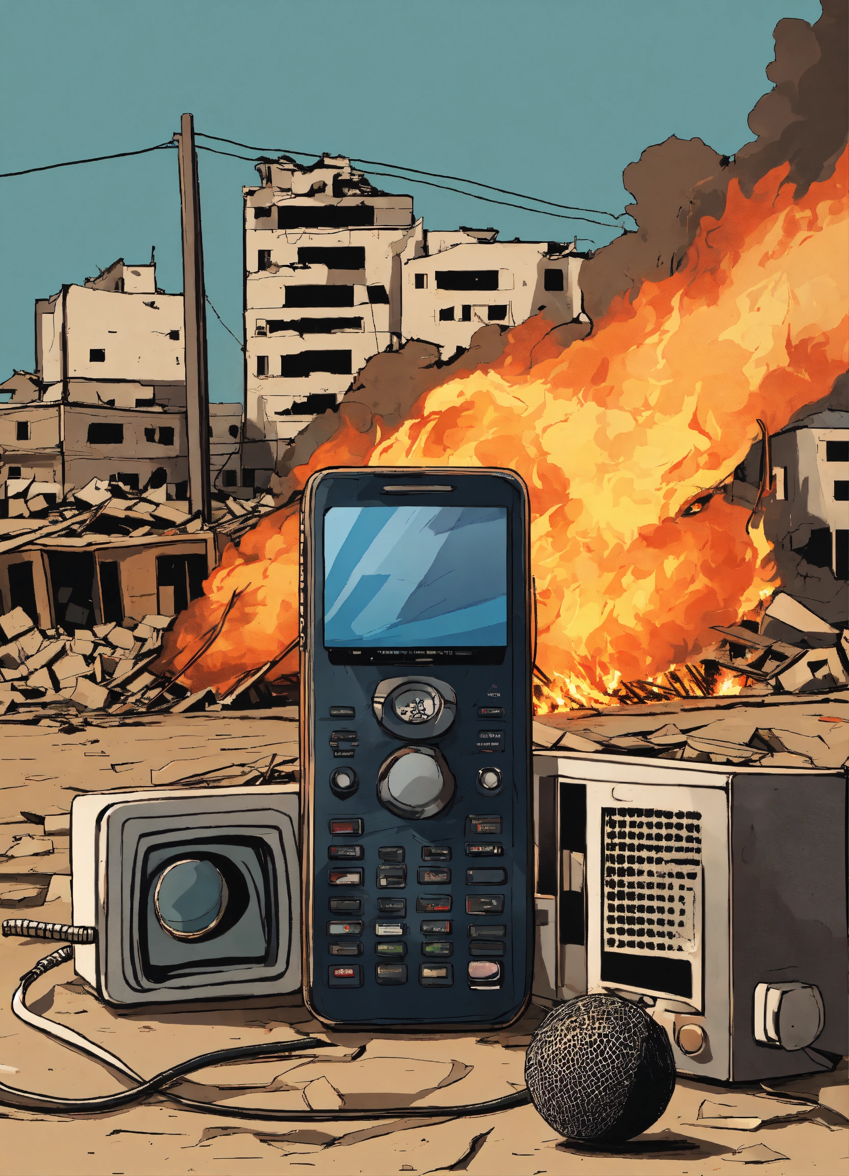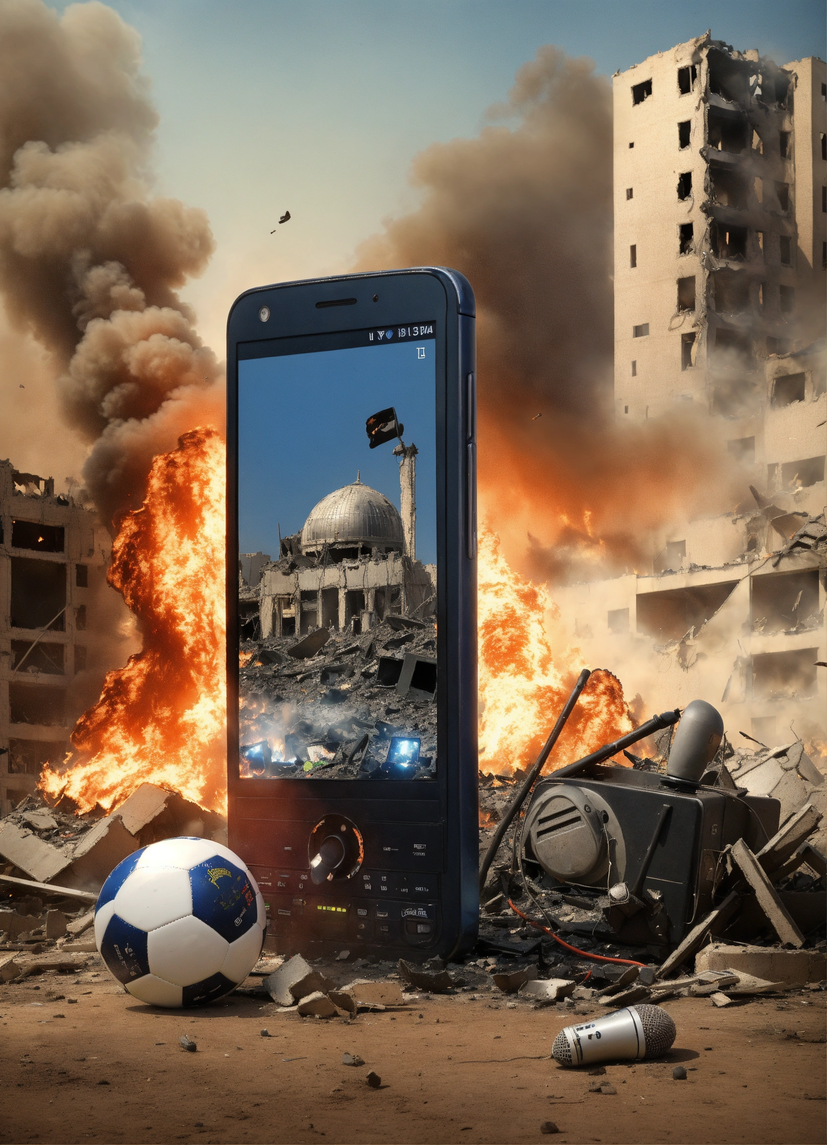 "a design that represents a silent mobile phone next to a microphone, a football, and a television, with collapsed and burning buildings in the background as a result of the israeli aerial bombardment of gaza."