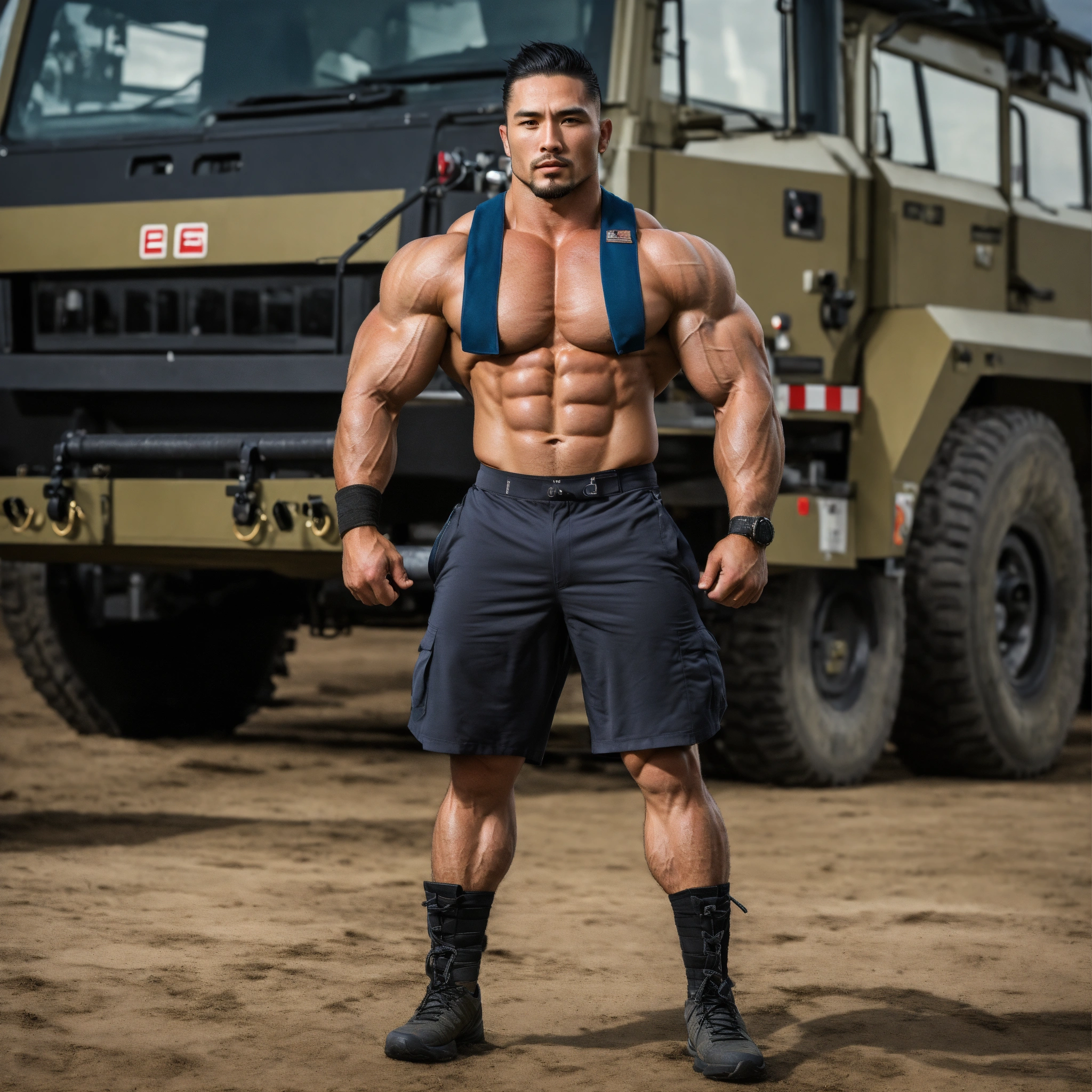 30-year-old man with big muscles, big bodybuilder, body like a wrestler, in the military, hanzo hasashi