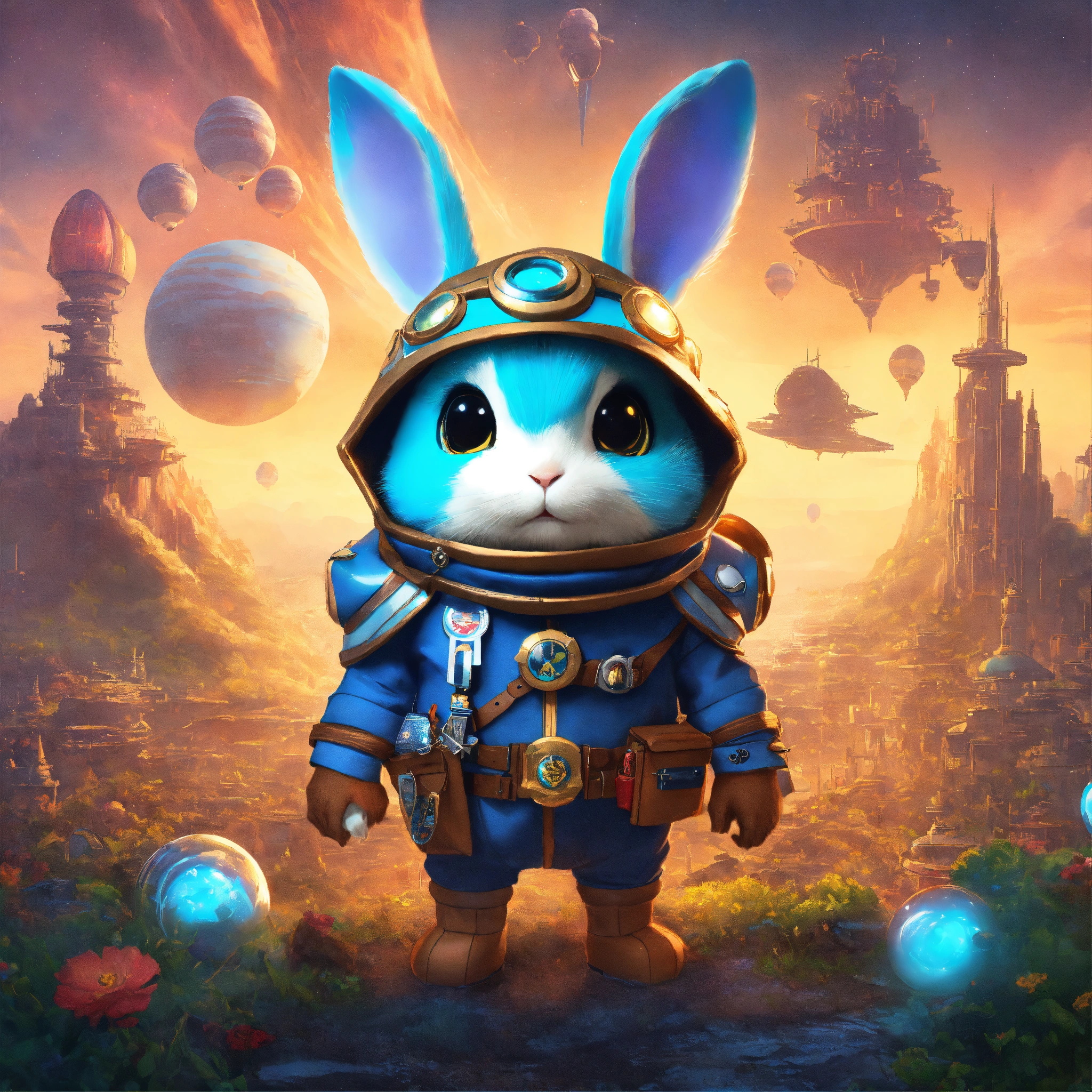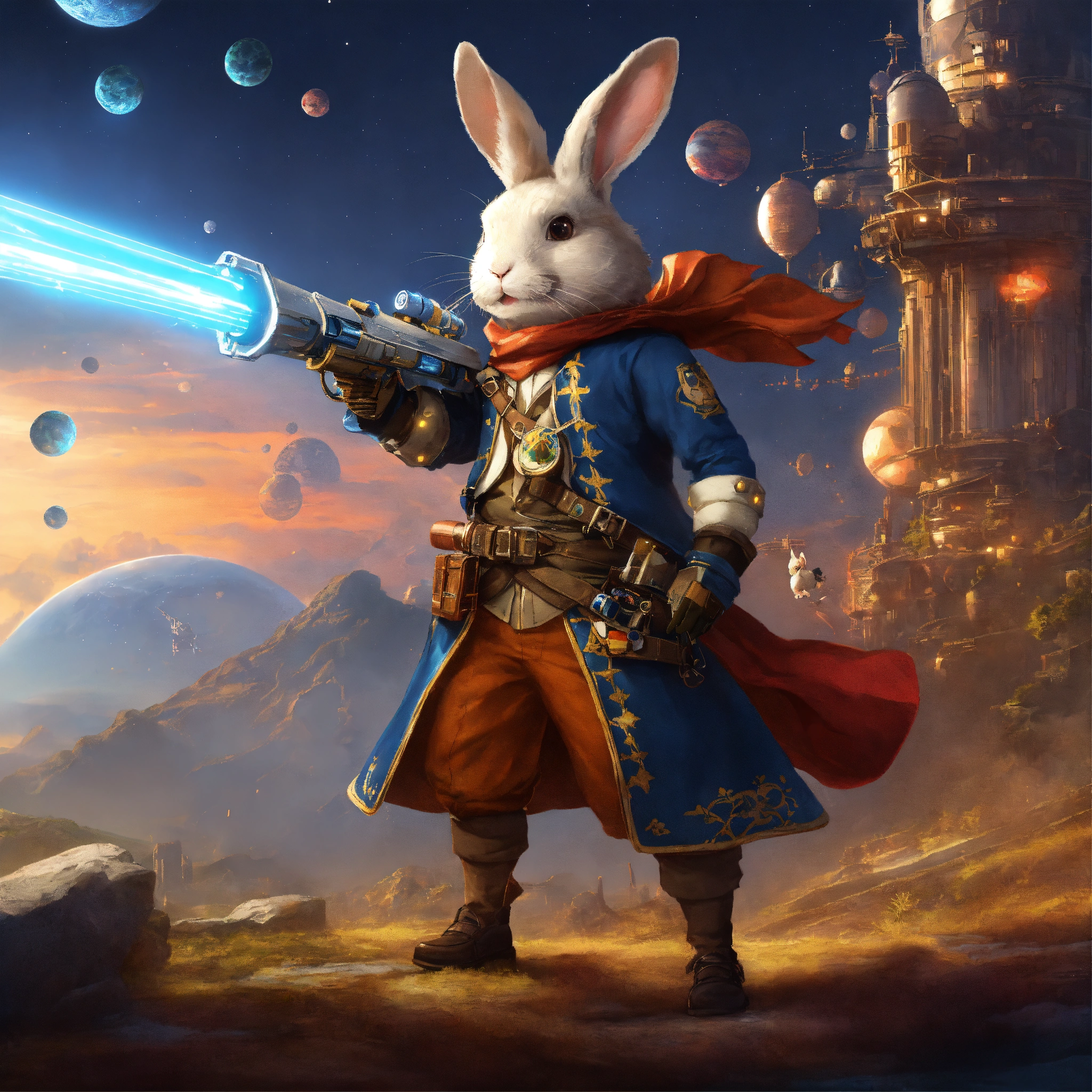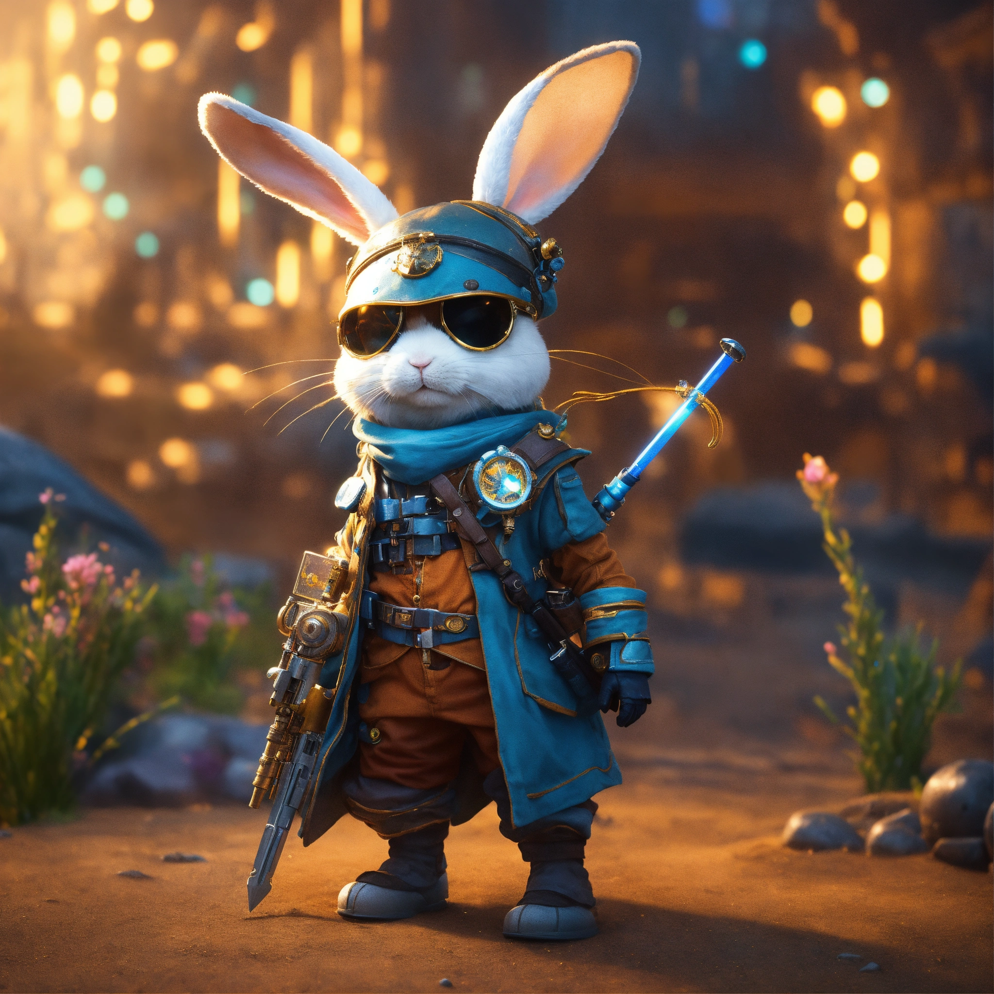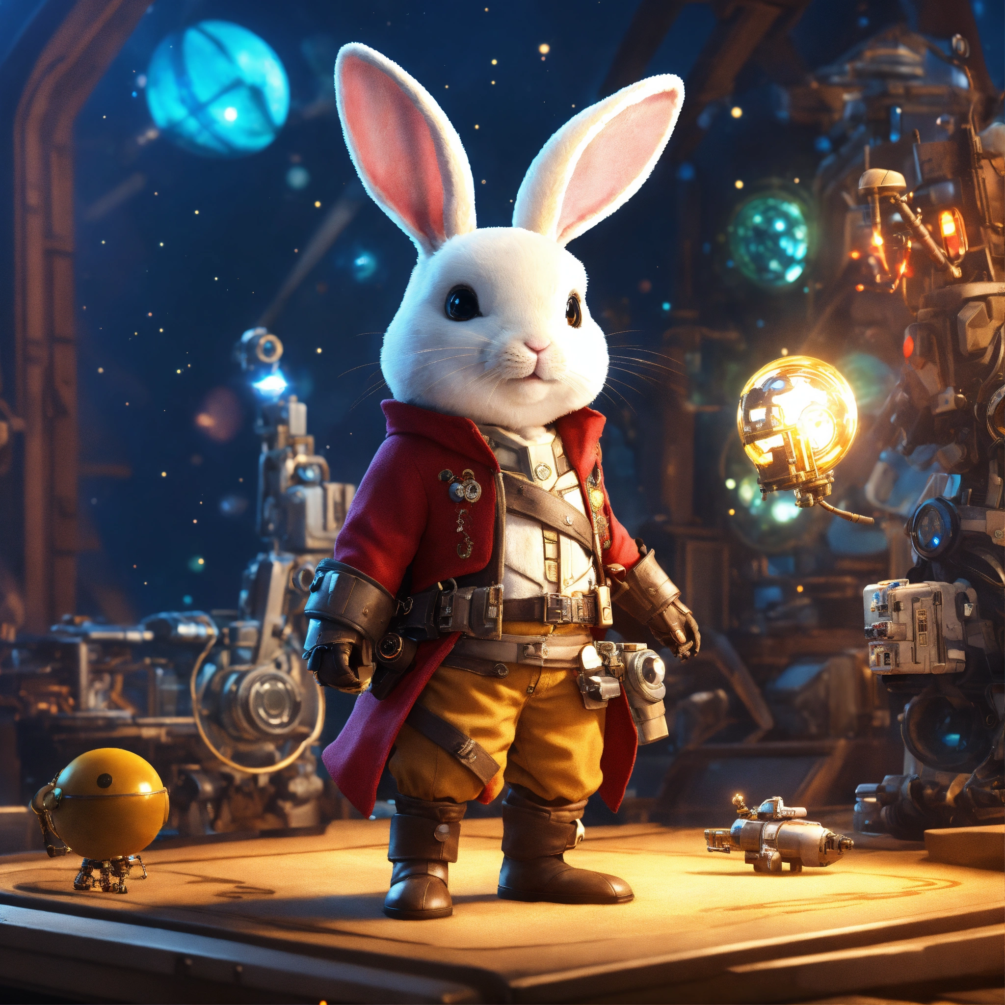 Imagine a charming rabbit character, influenced by the magic of the one piece universe, navigating a futuristic realm. create an individual with a cute and oversized head, exuding an endearing personality that captures the hearts of all who encounter them. this character should possess a dynamic and memorable presence, with their own motivations and aspirations. perhaps they are a spacefaring explorer in pursuit of interstellar wonders or a plucky rebel fighting for freedom in a world controlled by megacorporations. outfit this character with distinctive gear, combining traditional pirate elements like a tiny saber or a playful pistol, with futuristic gadgets like a cybernetic earpiece or holographic accessories. the aim is to craft a character that effortlessly marries the enchantment of one piece with a futuristic setting, preserving the whimsical essence of the original universe while adding a dash of futurism.
