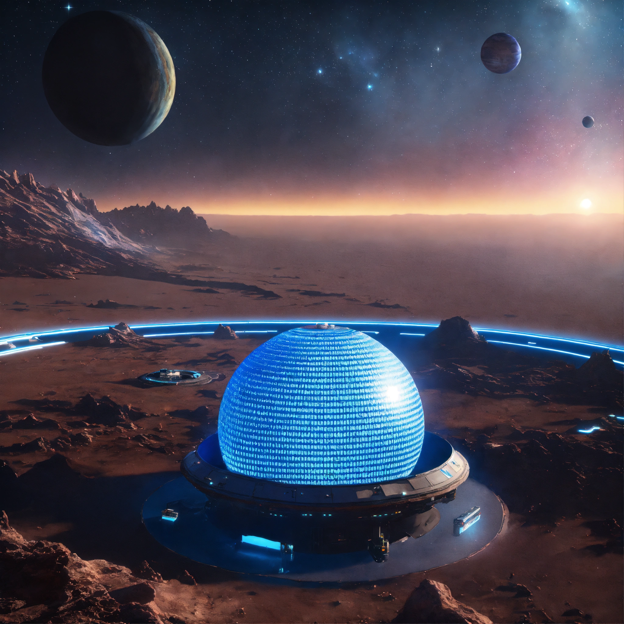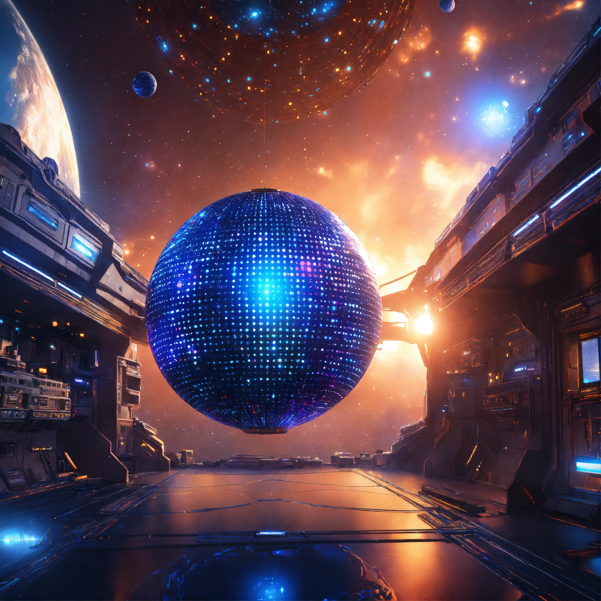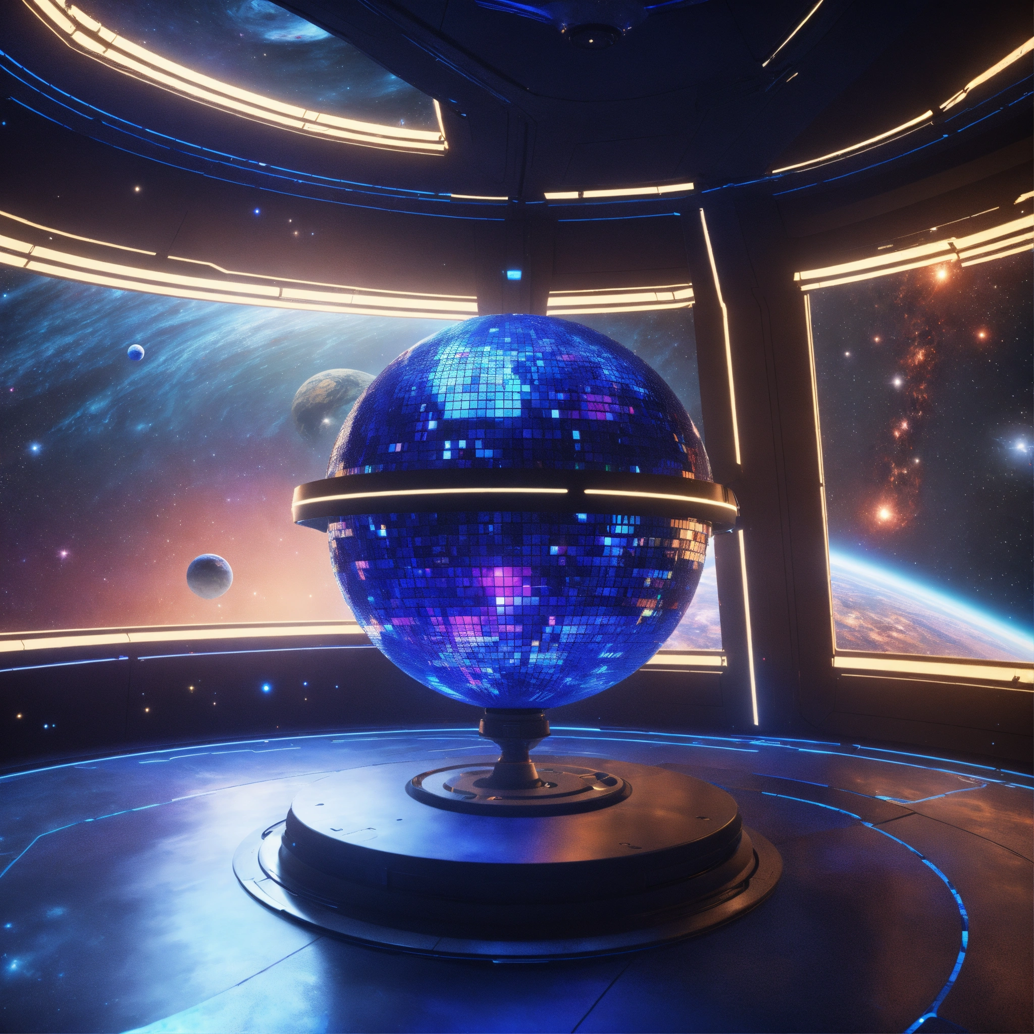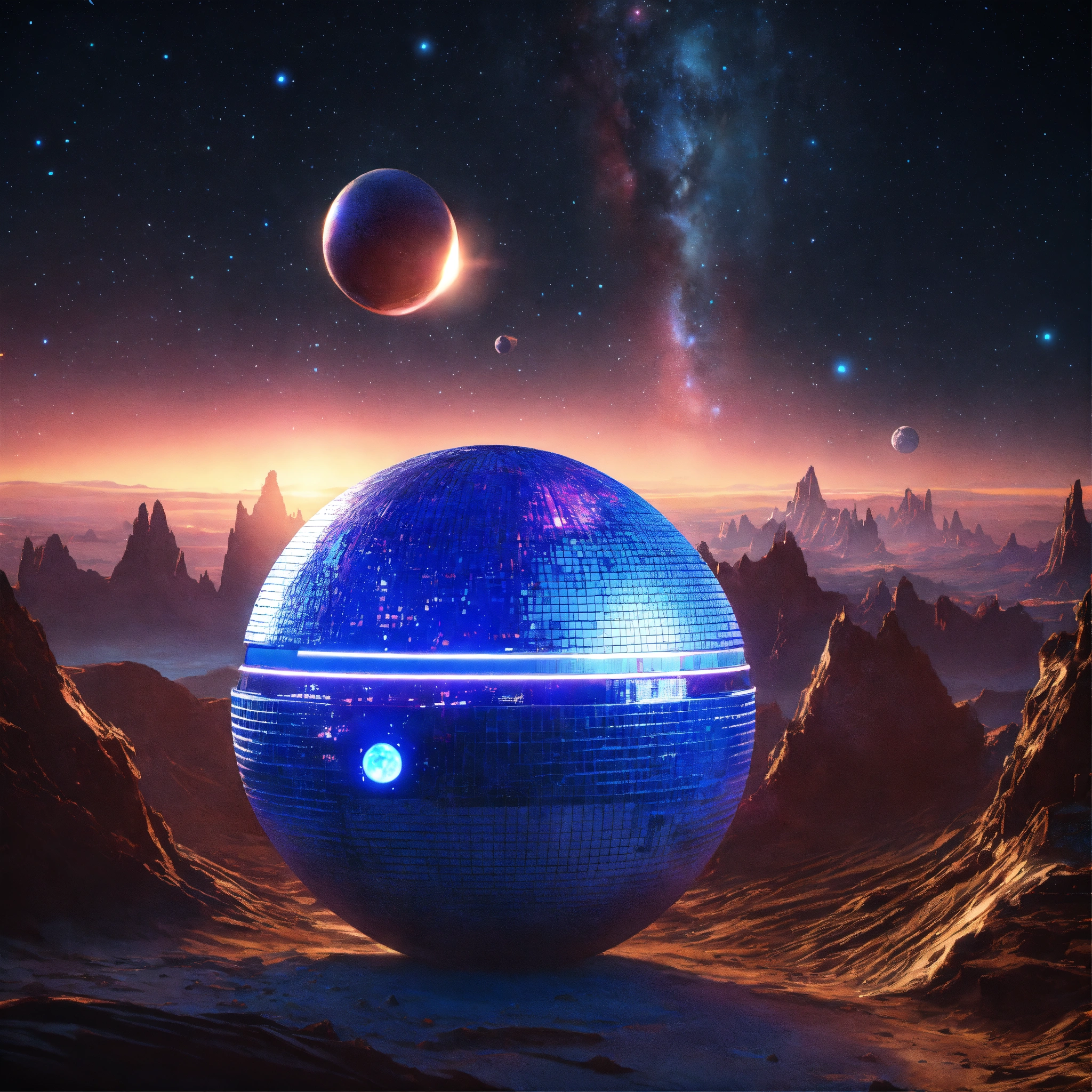Artificial planet that looks like a blue disco ball in space at the outer rim of the galaxy, lots of windows and docking bays, 8k, realistic, unreal engine