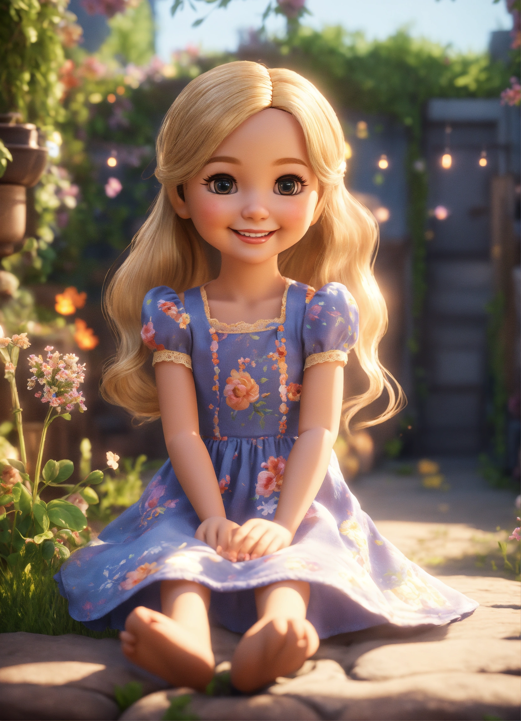 Cute adorable doll style tiny girl smiling greeting me, long blond hair, she wears a summer dress, unreal engine, she is seated, outdoor garden lighting, art station, detailed digital painting, cinematic, character design by pixar, unreal 5, daz, hyper realistic.