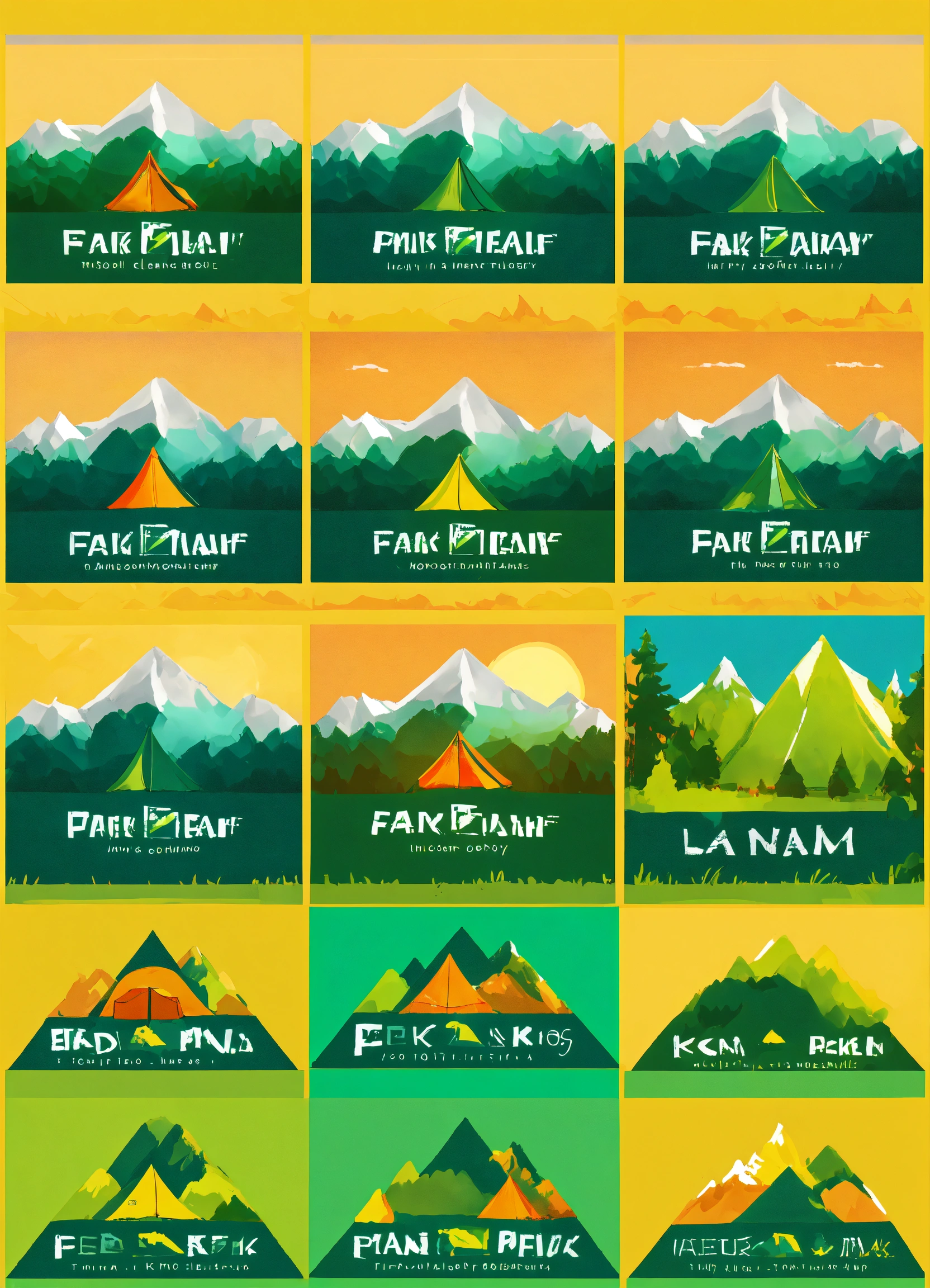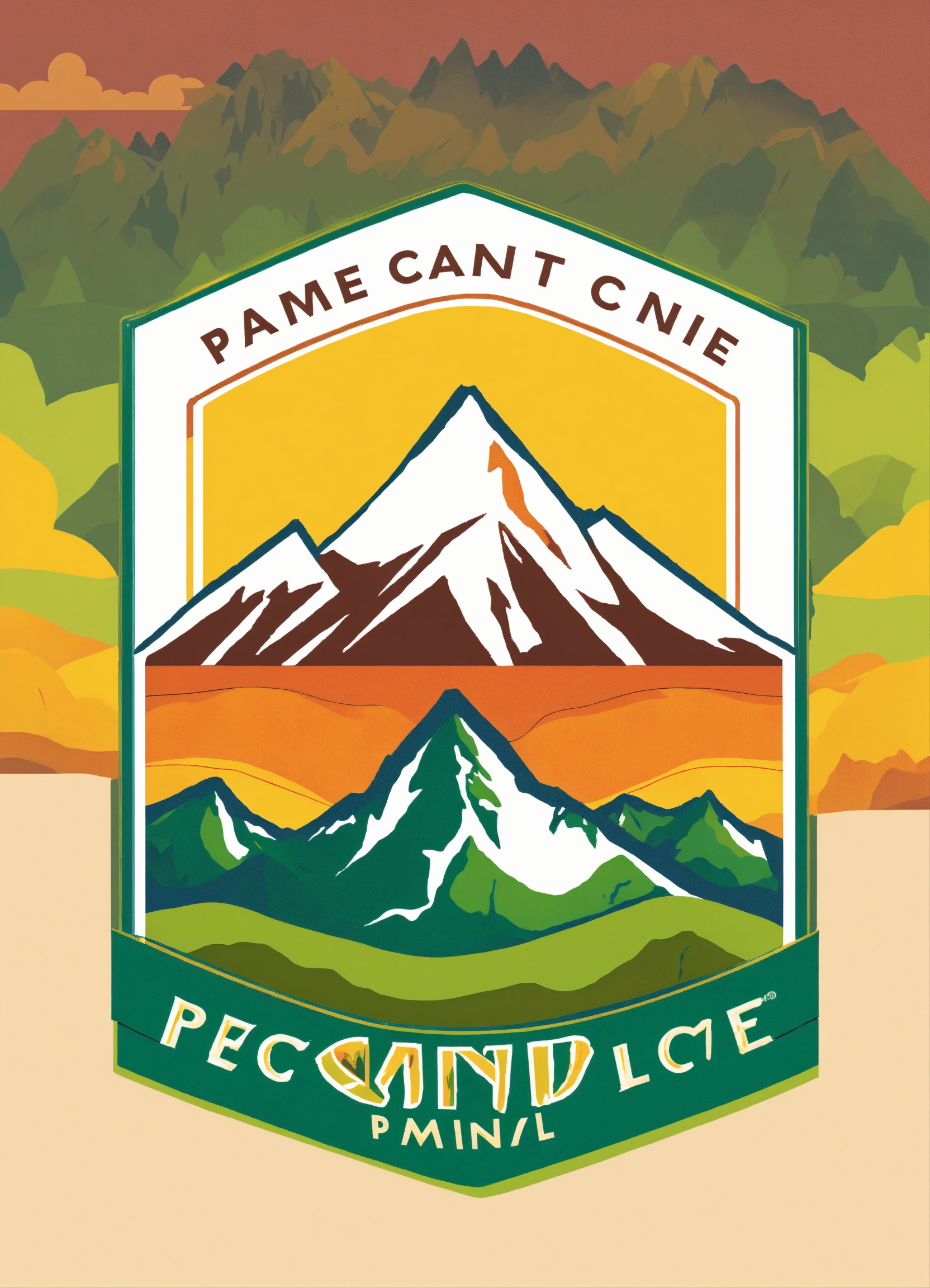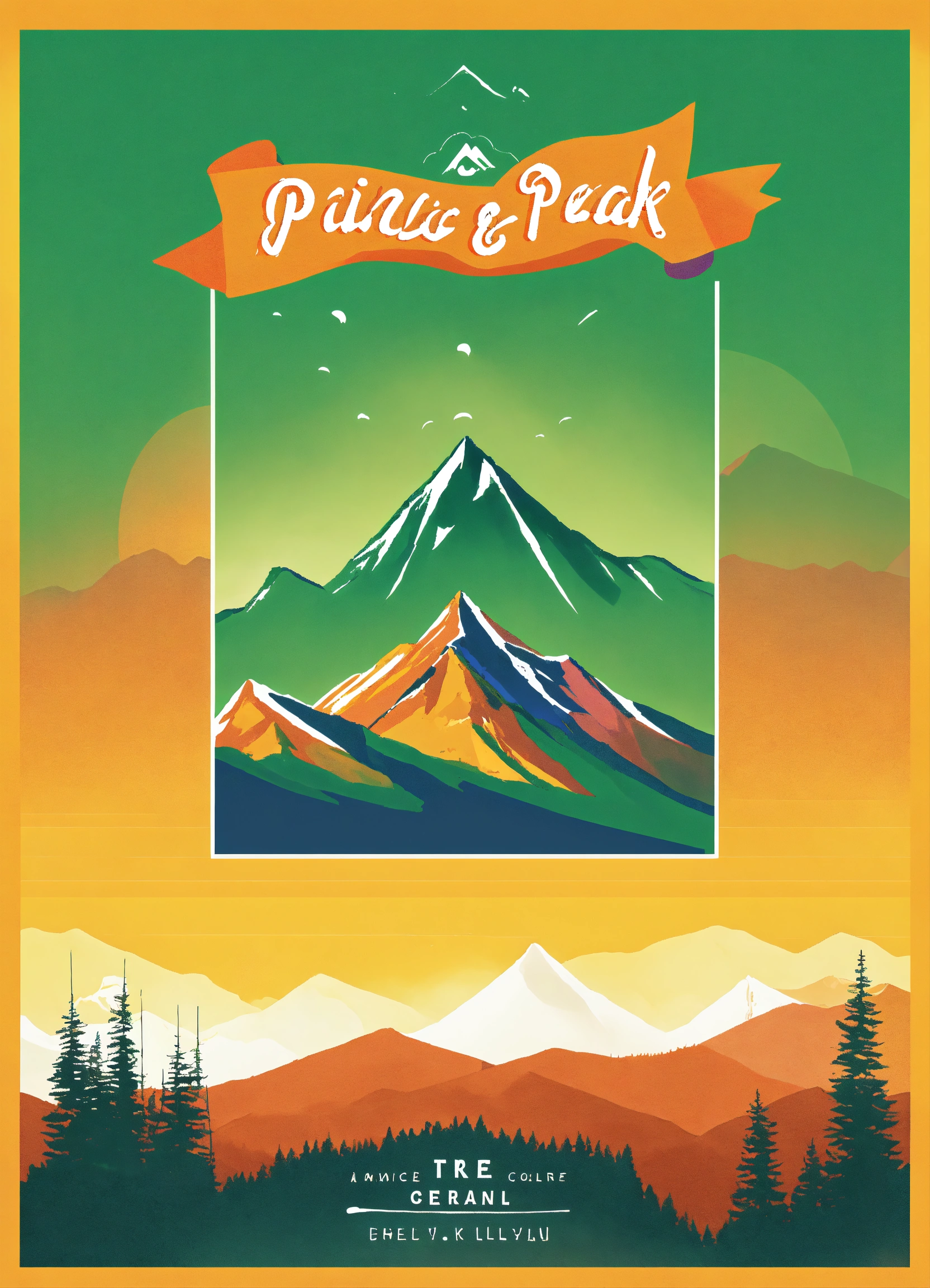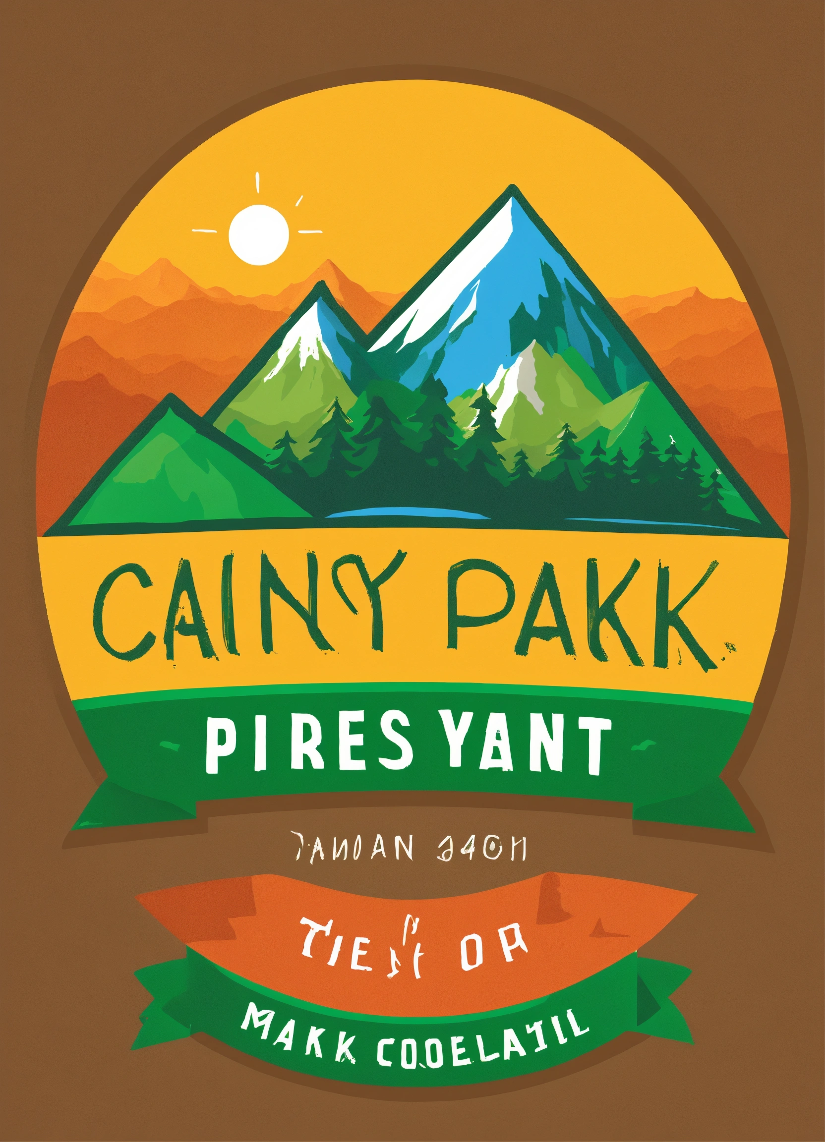 Create me a logo for my company picnic peak. the logo should be simple and easy to remember. the overall image should be smooth, pleasing to the eye, have a clean 4k look, with a blurred background. images of a mountain and a tent displayed below. make it memorable. bright colors. yellow. green. orange.