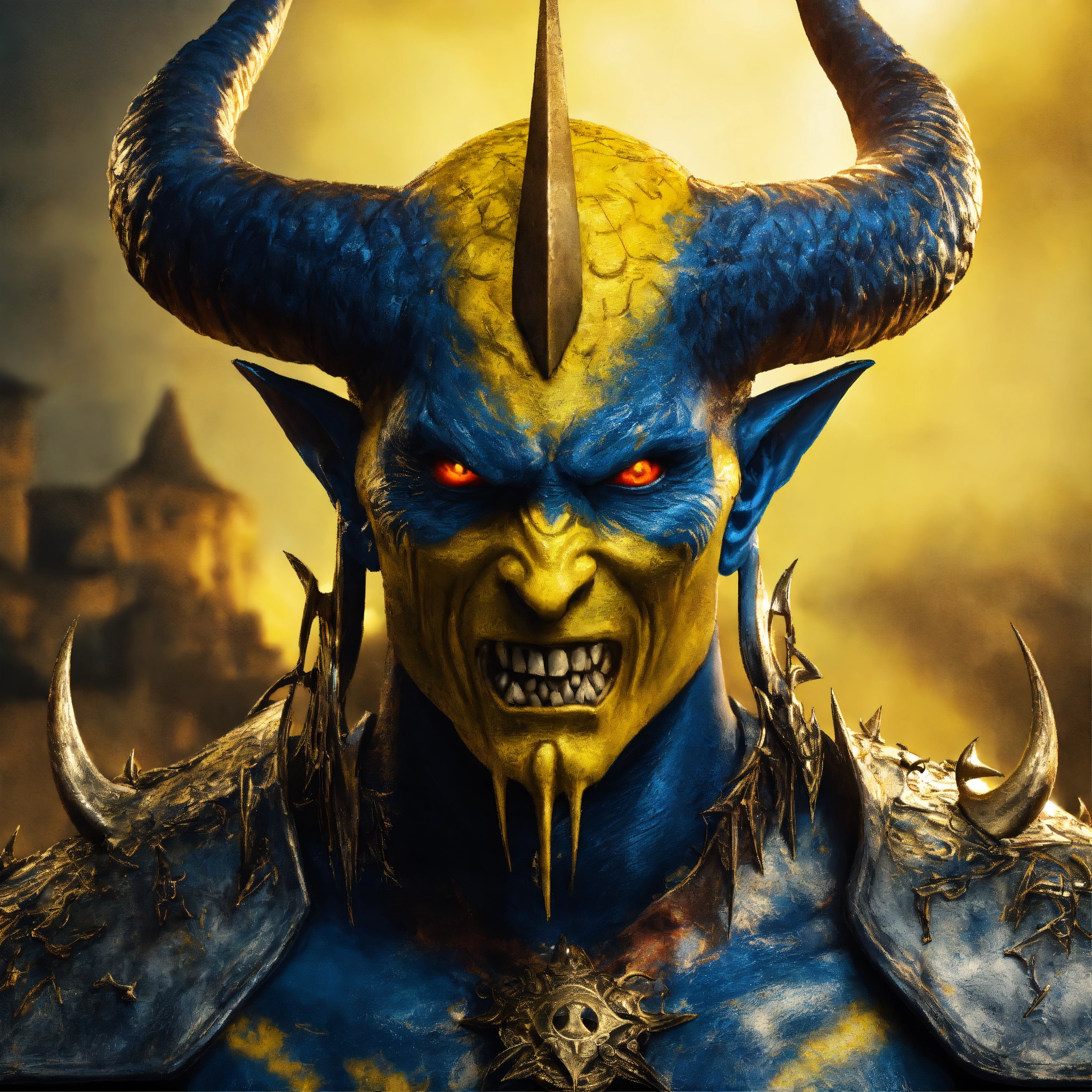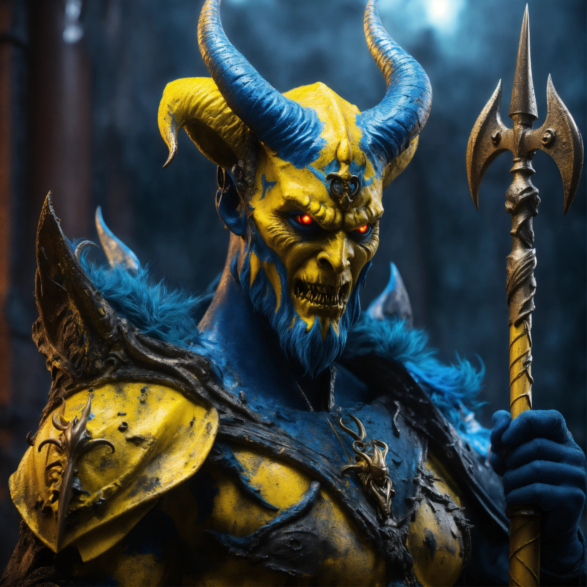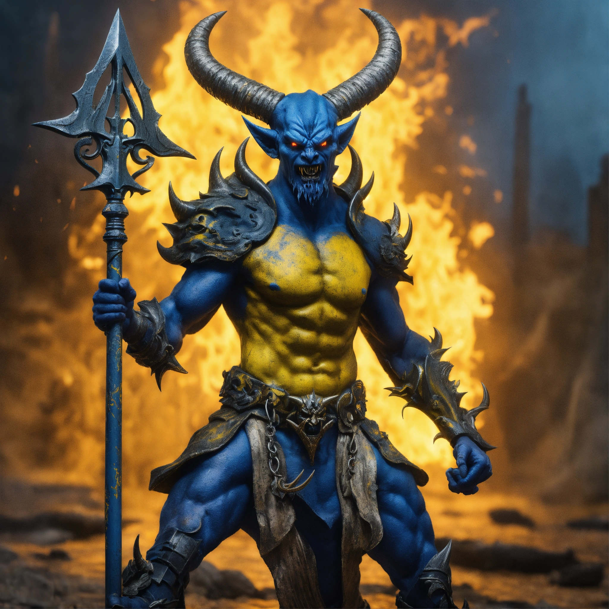 Evil demonic yellow and blue devil, holding a trident, ominous and eerie, highly detailed and realistic, inspired by apollyon and lucifer, evil demonic satanic horned demon, 3 pronged pitch fork trident