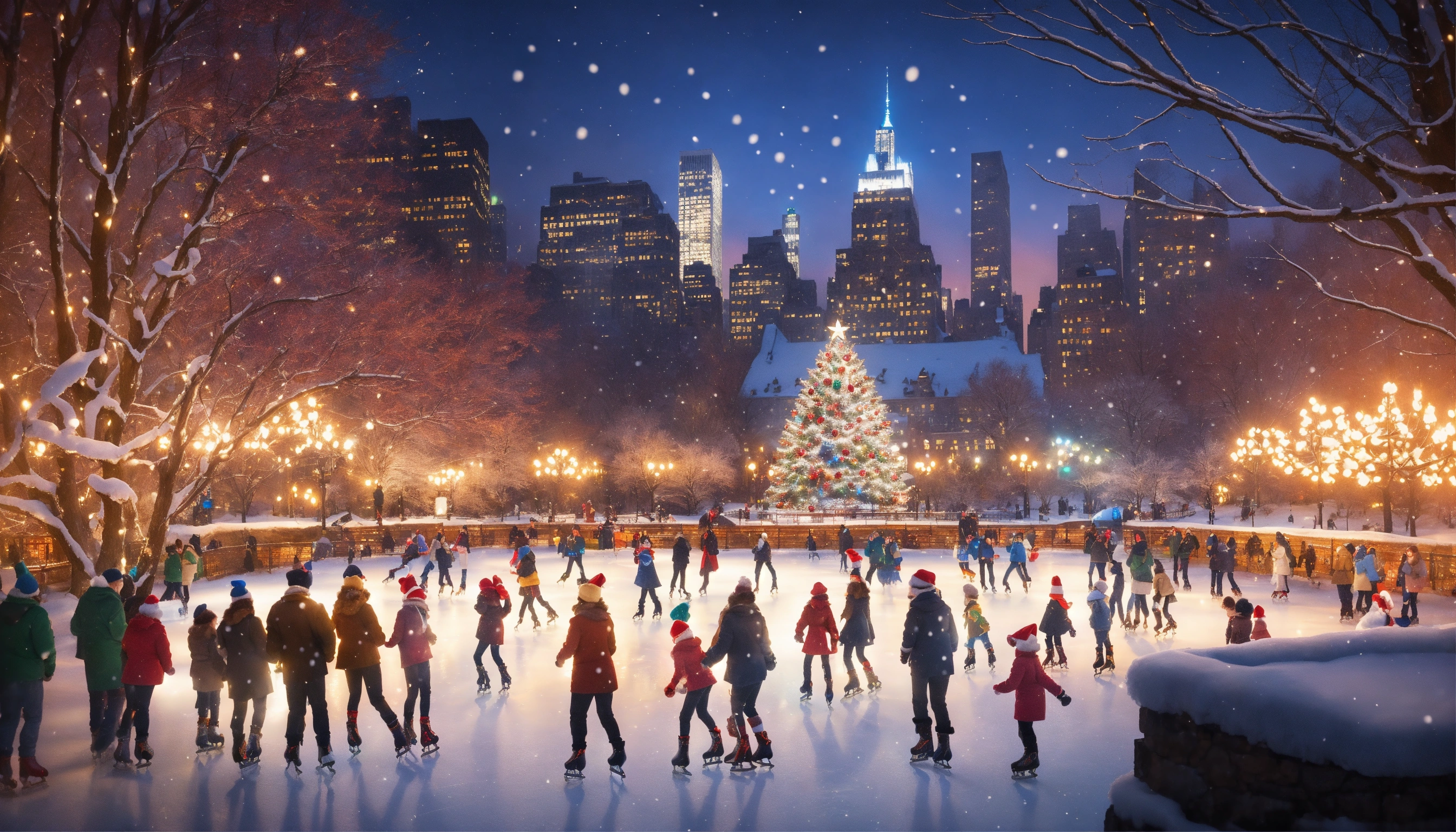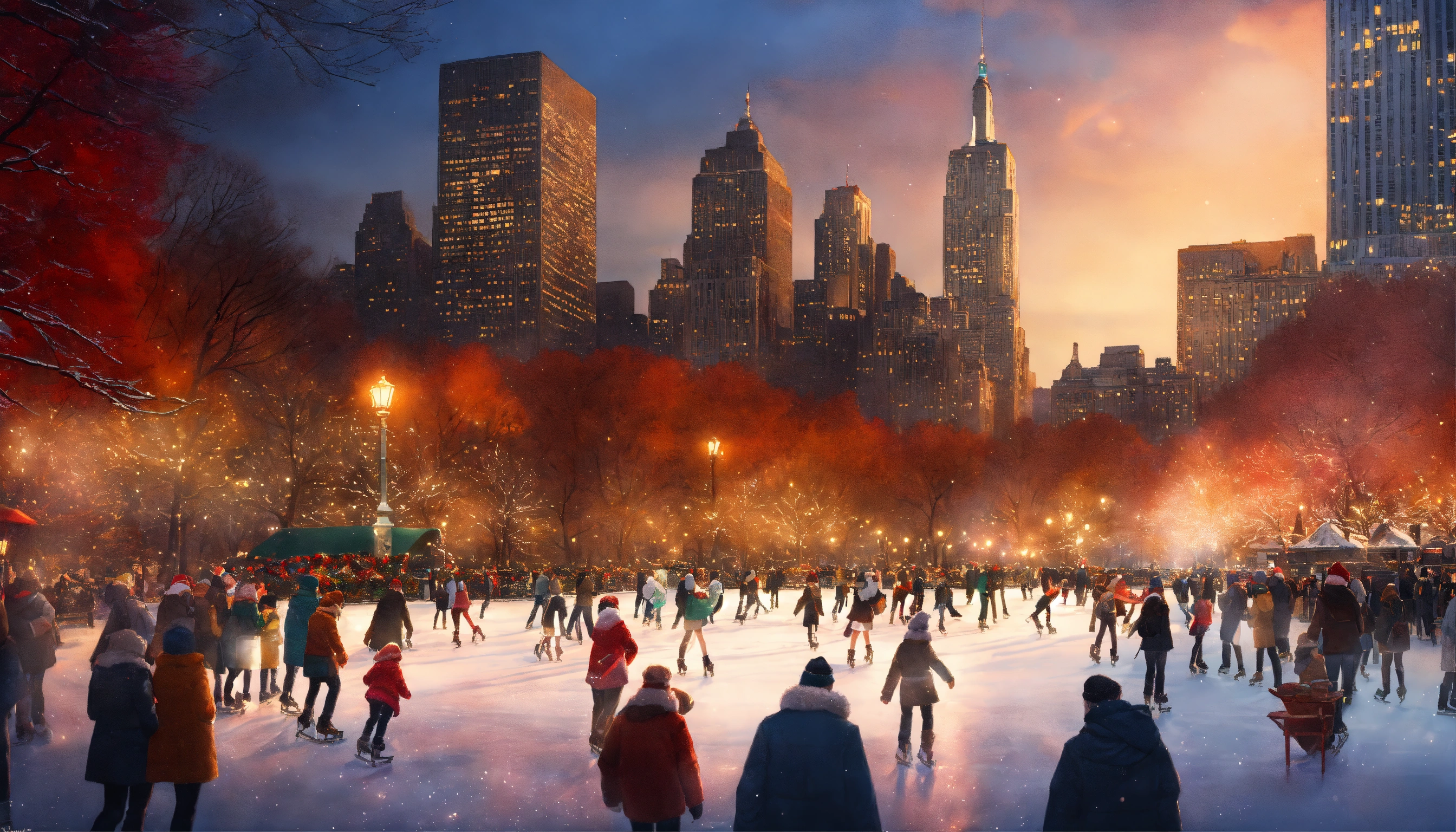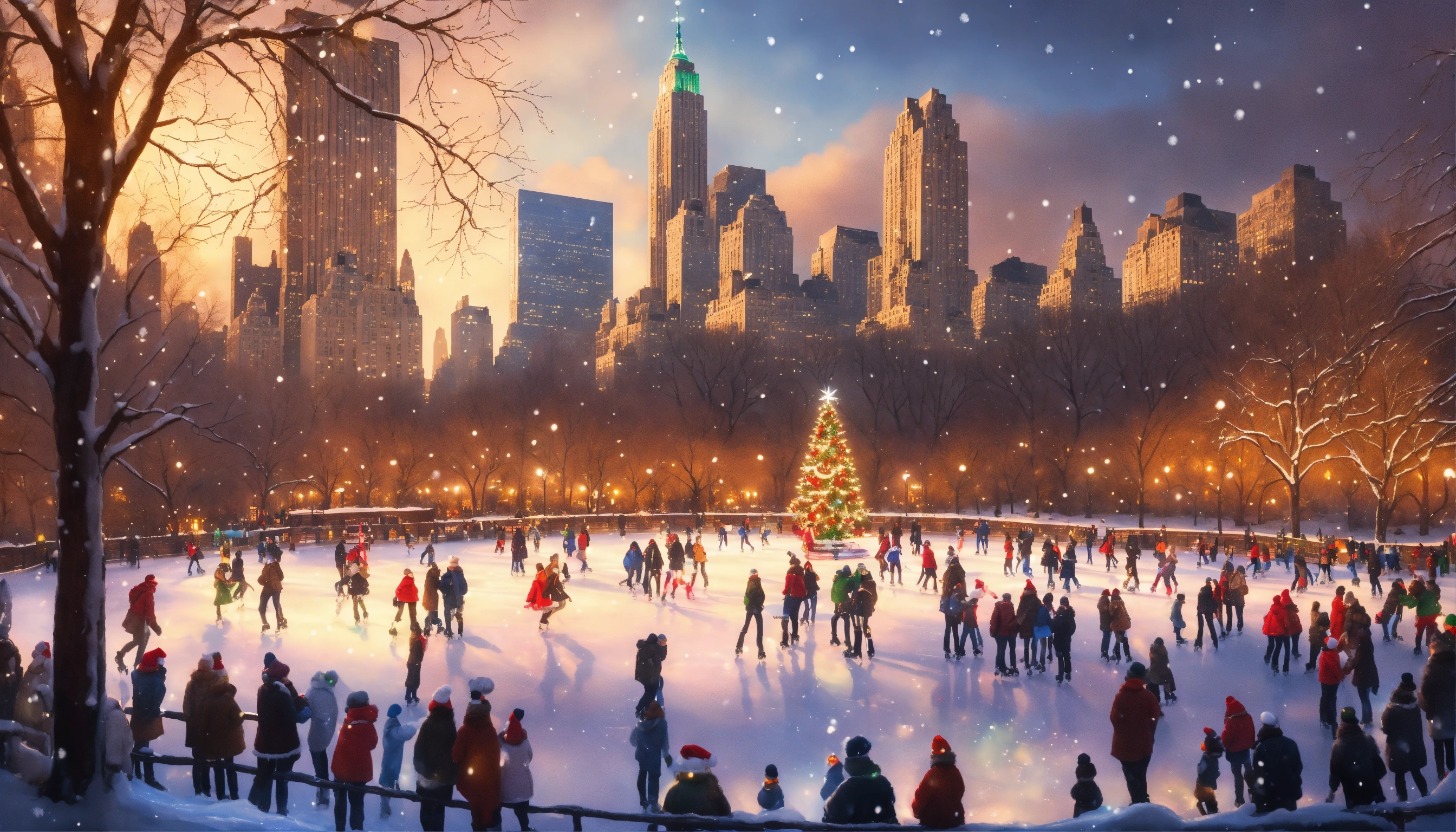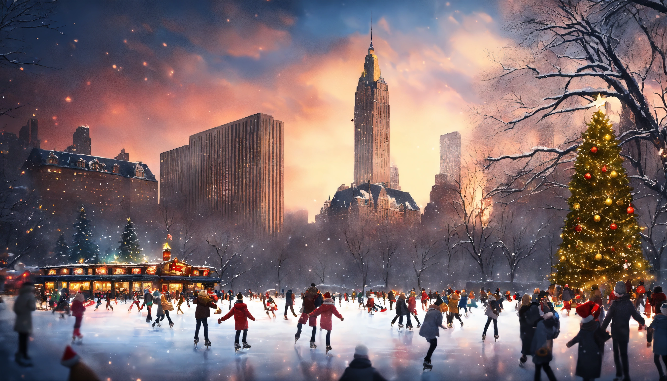 Epic shot of a ice skating in new york in central park, ultra cozy, full of details, digital painting, little photorealistic, sharp focus, new york 50s, magical place with christmas atmosphere, christmas tree, ultra detailed and cozy winter wonderland, luminous. ultra cozy and inviting place, wish to be there. very detailed, arty, should rank high on youtube for a dream trip.