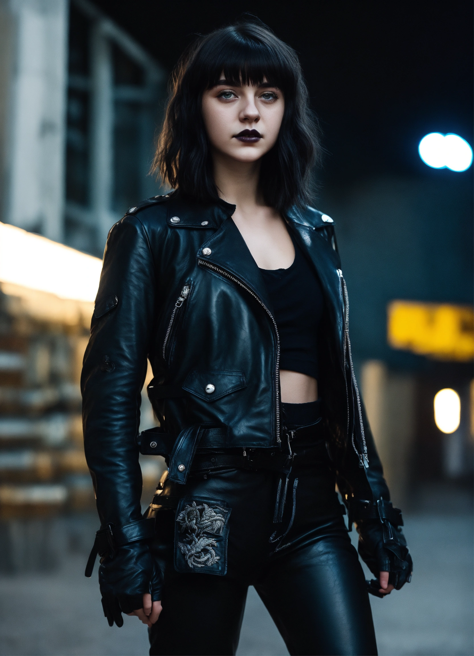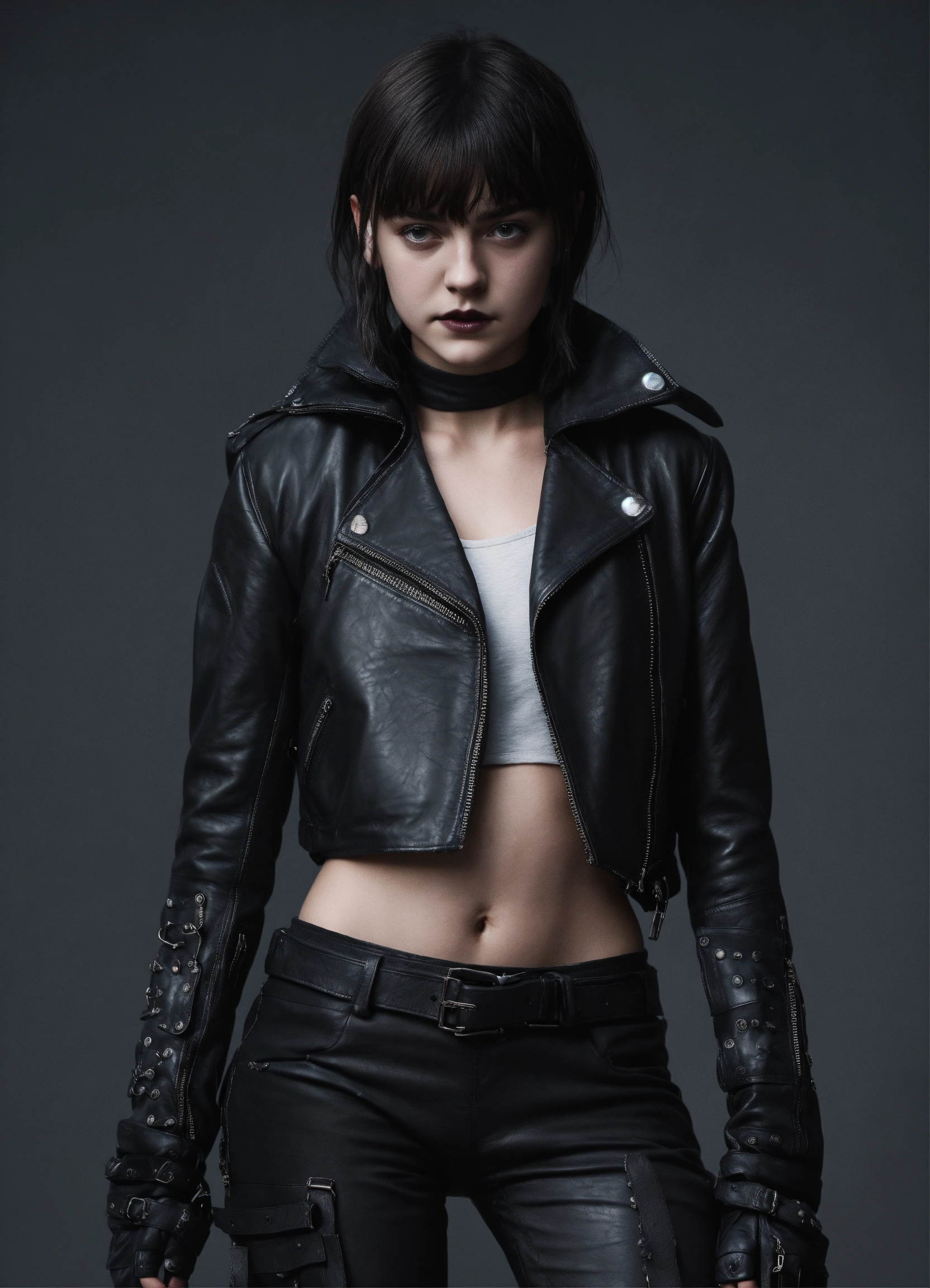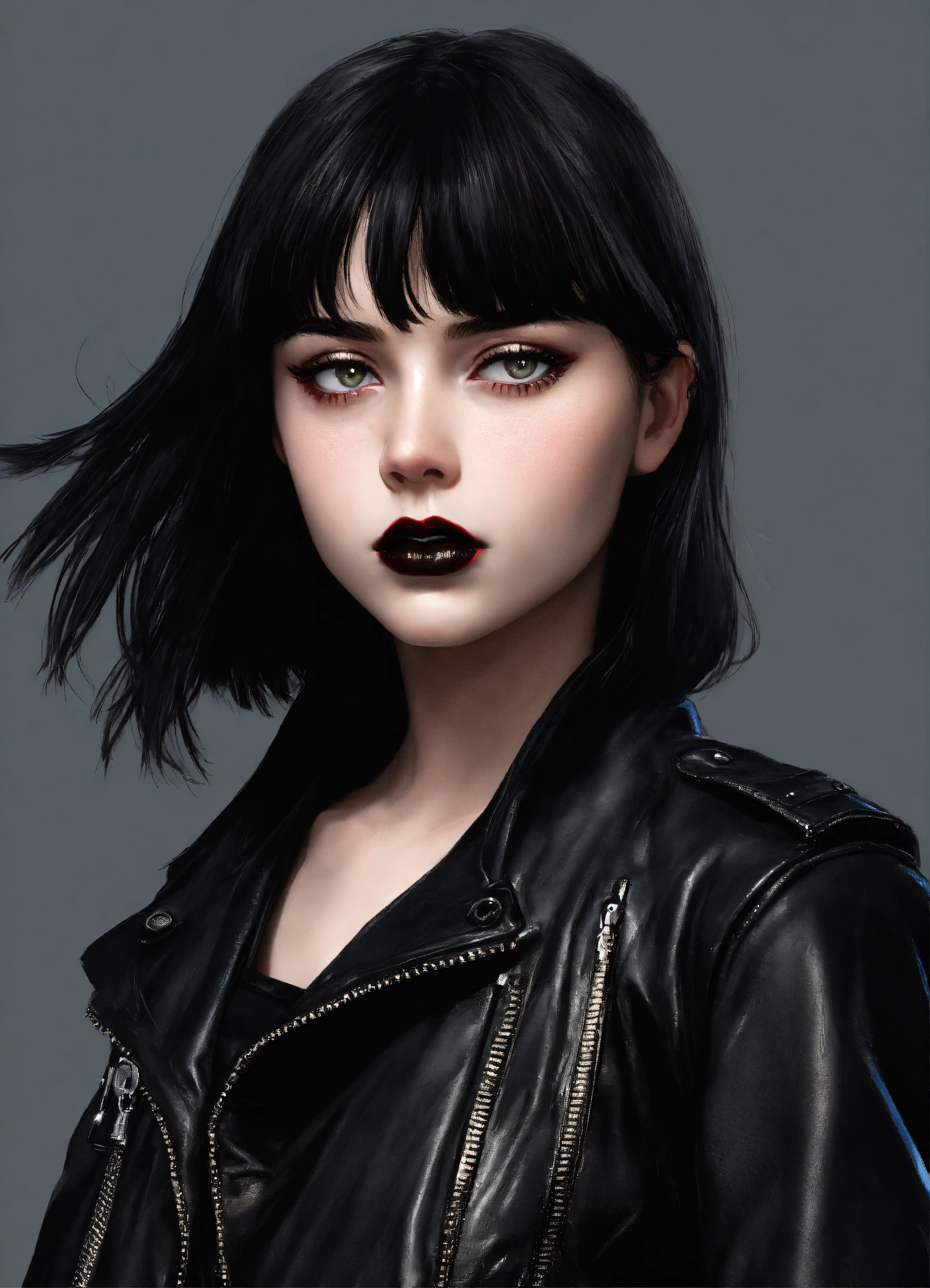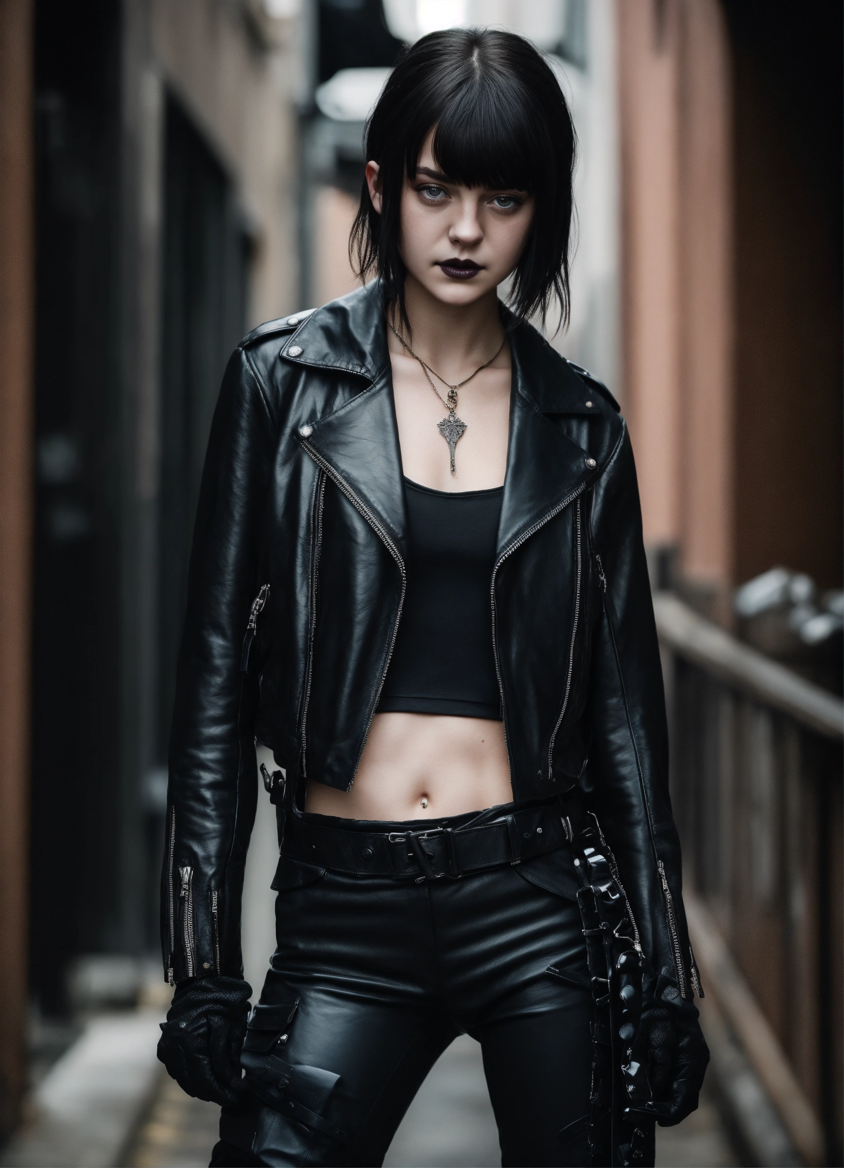 E-girl, age 20 fully body, black hair, bangs hairstyle, black leather jacket, top, pants and gloves, pale skin, high detail, highly detailed, blank background, black lipstick, walking looks like a real life version of arya stark