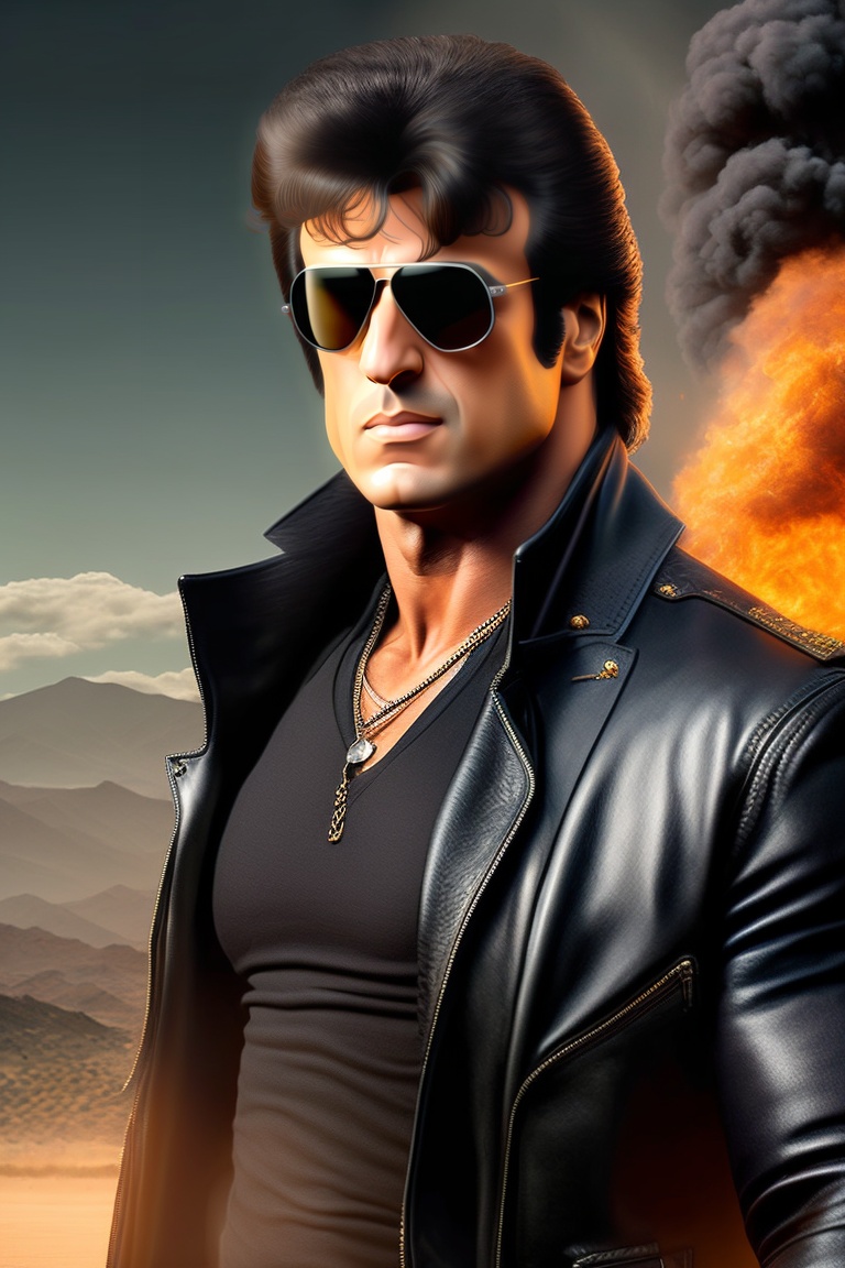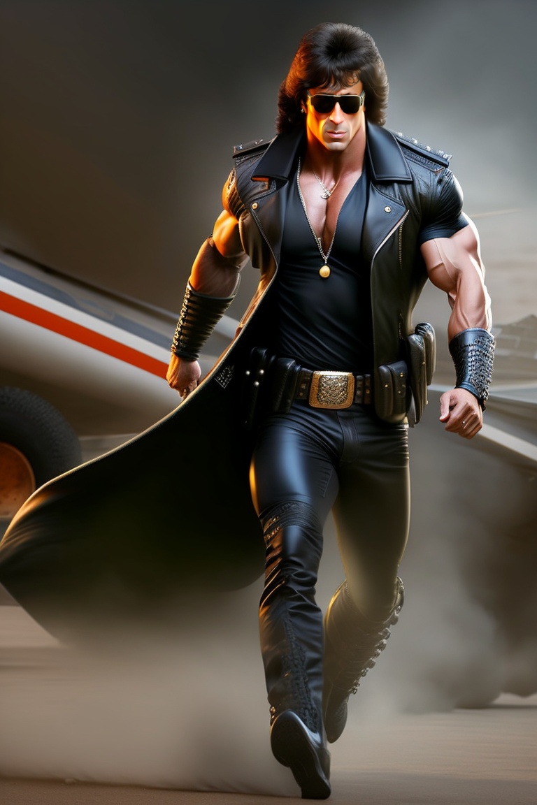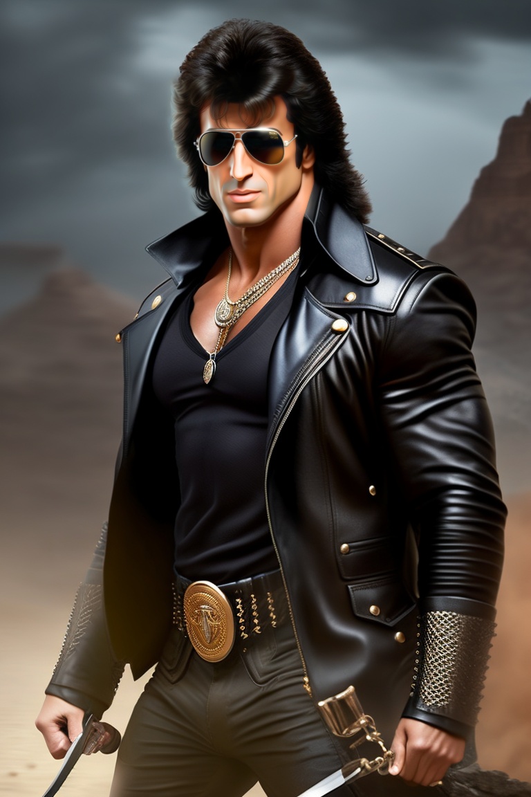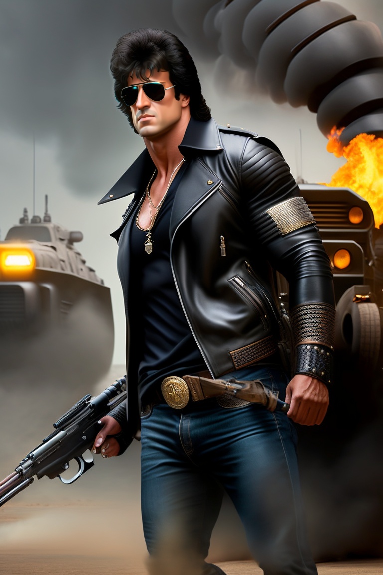 Young sylvester stallone as rambo, average hair, black coat and black shirt, chains, sunglasses, full body, black jeans pants, with big gun, in action, 3d, mad max.