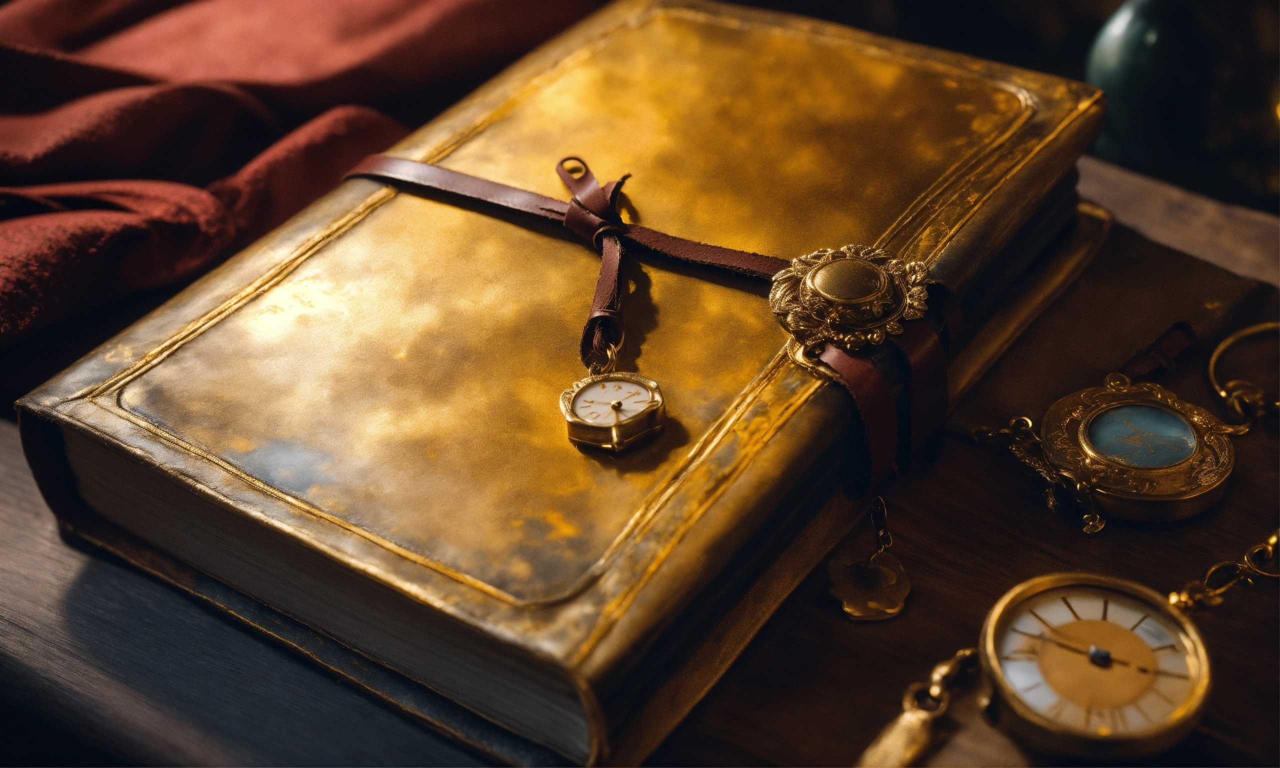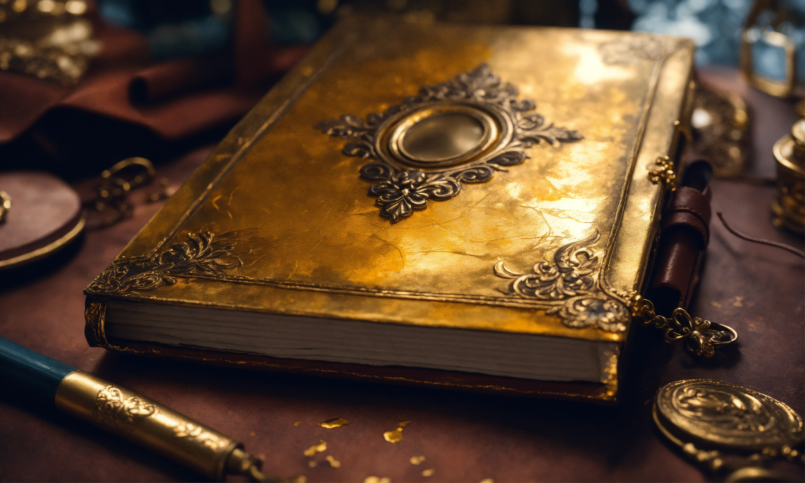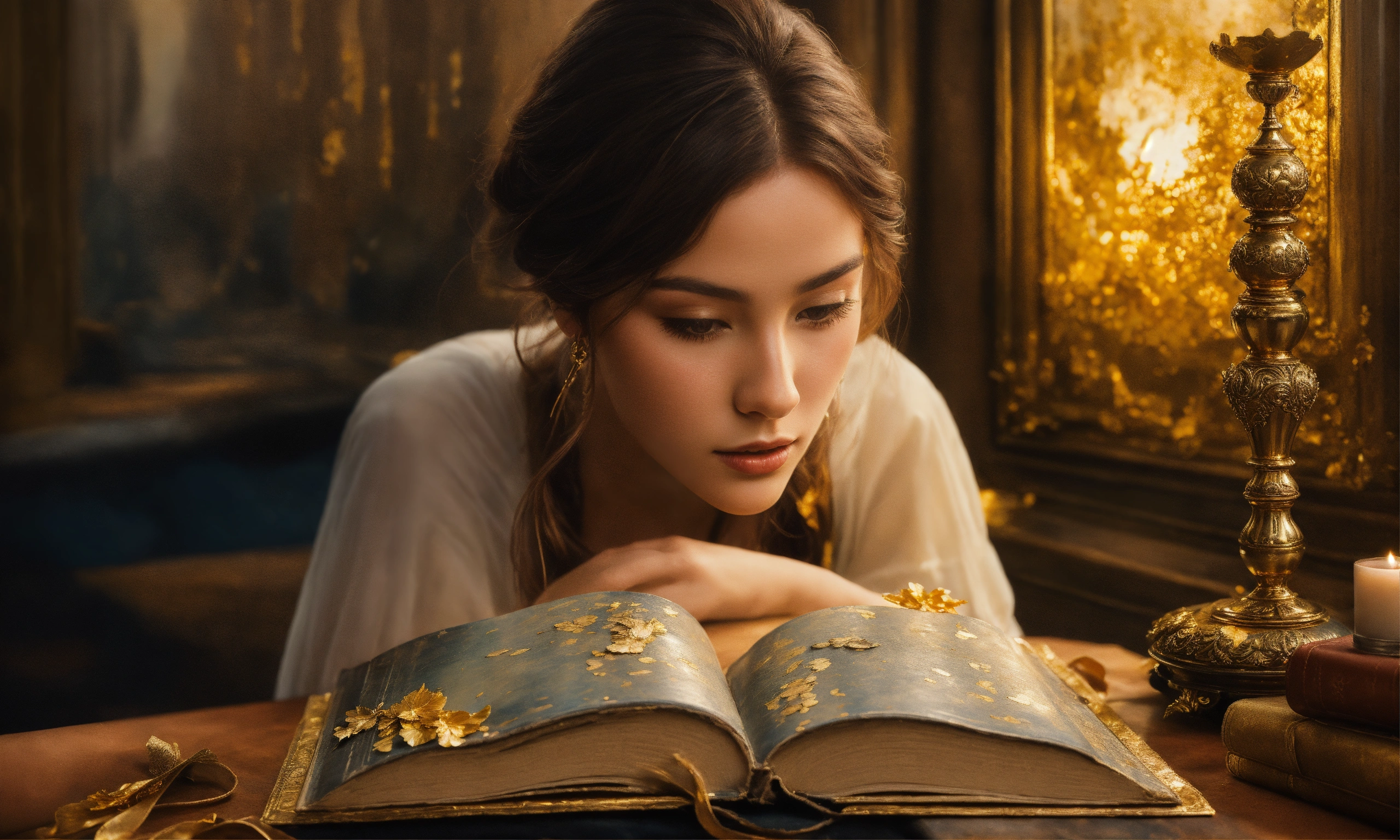 A young beautiful lady looks close-up of the diary's cover, highlighting the aged leather, faded gold leaf accents, and the hint of secrets hidden within. stunning 8k matte oil painting