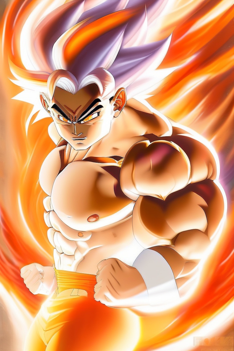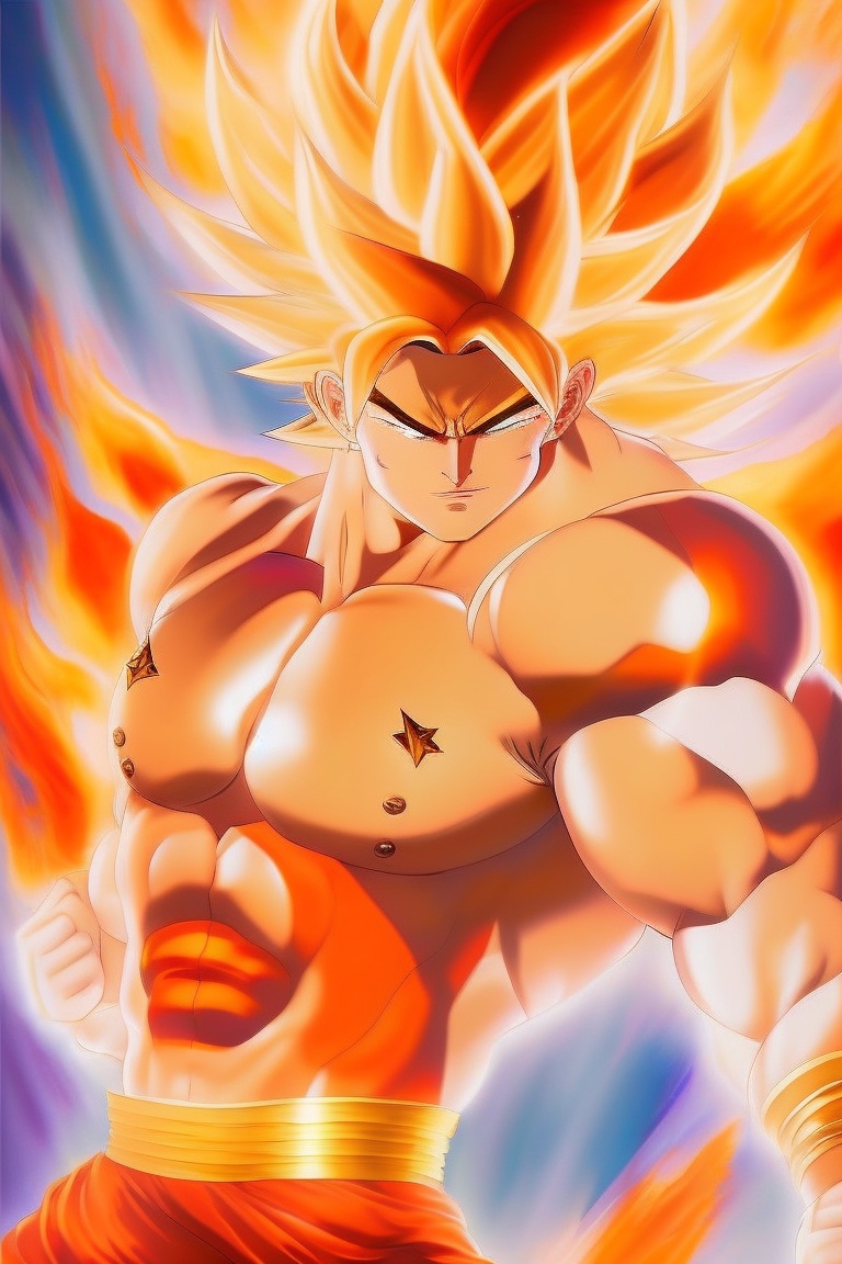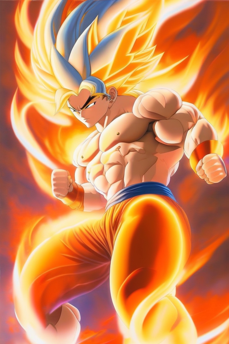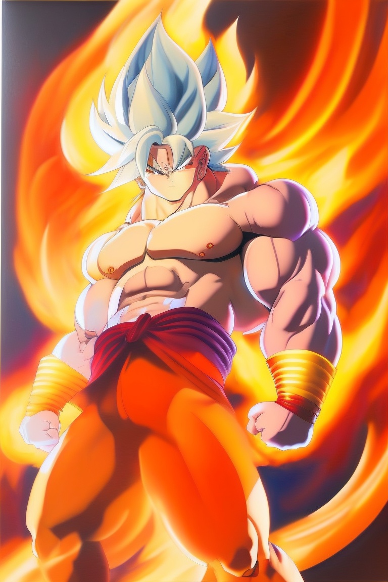 The character depicted in this pose is son goku from the dragon ball z anime series. he is shown with his muscles flexed, emphasizing his incredible strength and power as a super saiyan warrior. the pose is dynamic and full of energy, with goku's body twisted and coiled as if he is ready to unleash a devastating attack. the flames that surround him add to the intensity of the image, as if goku is channeling his energy into a fiery blast. the colors of the flames should be bright and vibrant, with shades of orange, red, and yellow that evoke the heat and power of the flames. overall, this artwork captures the essence of son goku as a powerful and legendary warrior. the pose, muscles, and flames all work together to create a visually stunning image that conveys his strength, determination, and fearlessness in battle. this artwork would be a great addition to any collection for those who love dragon ball z, anime, and action.
